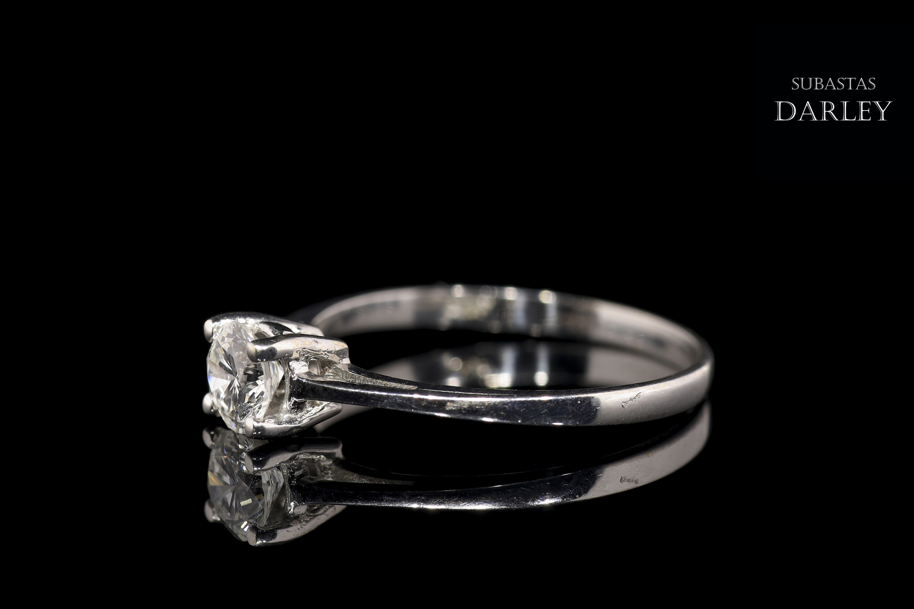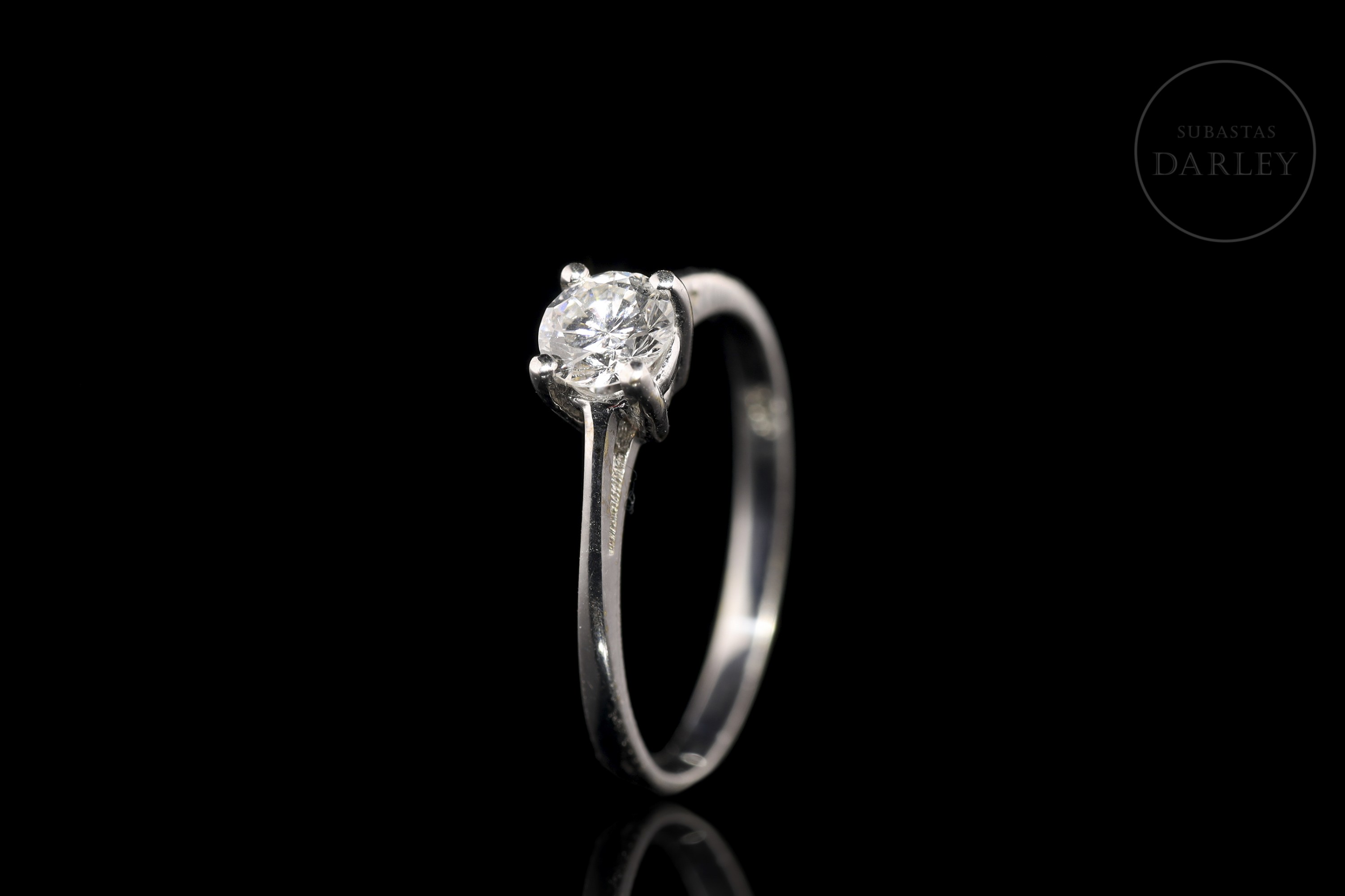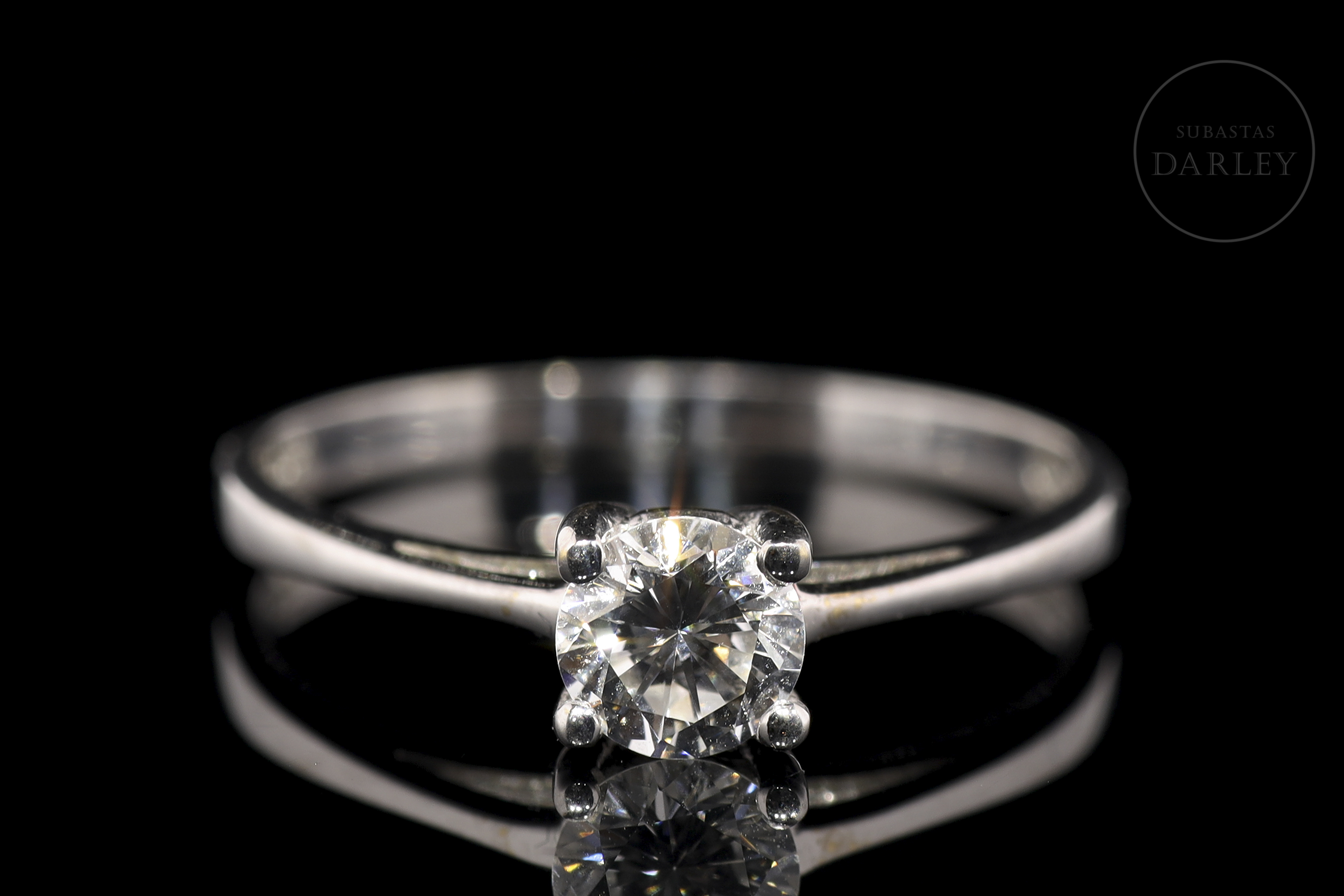18kt white gold solitaire model with a central diamond set in four claws. The diamond is brilliant-cut and weighs approximately 0.40 ct. The arm of the ring is more stylized at the top.