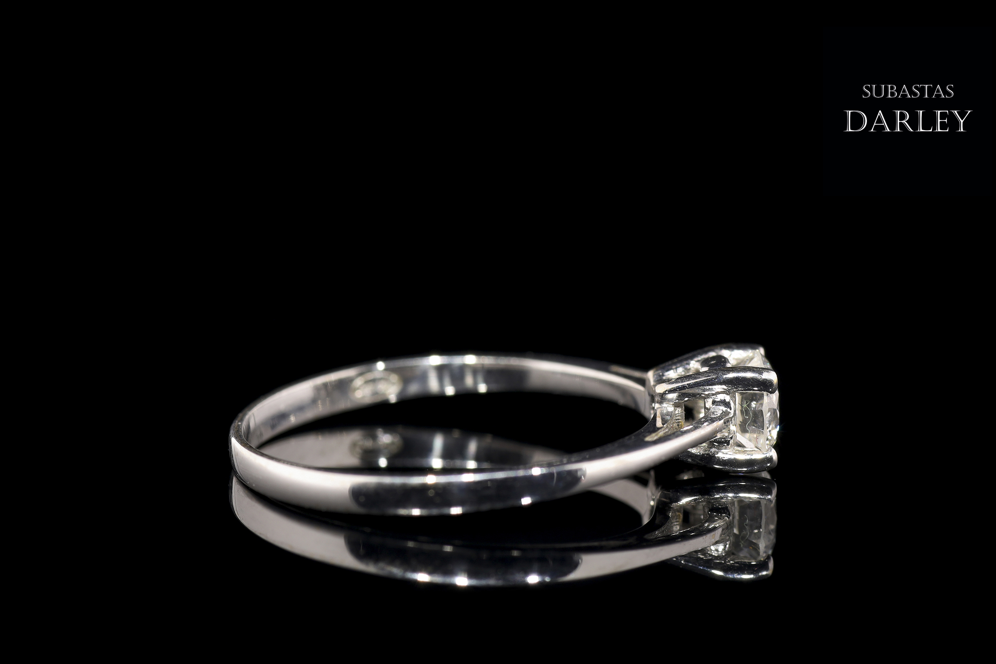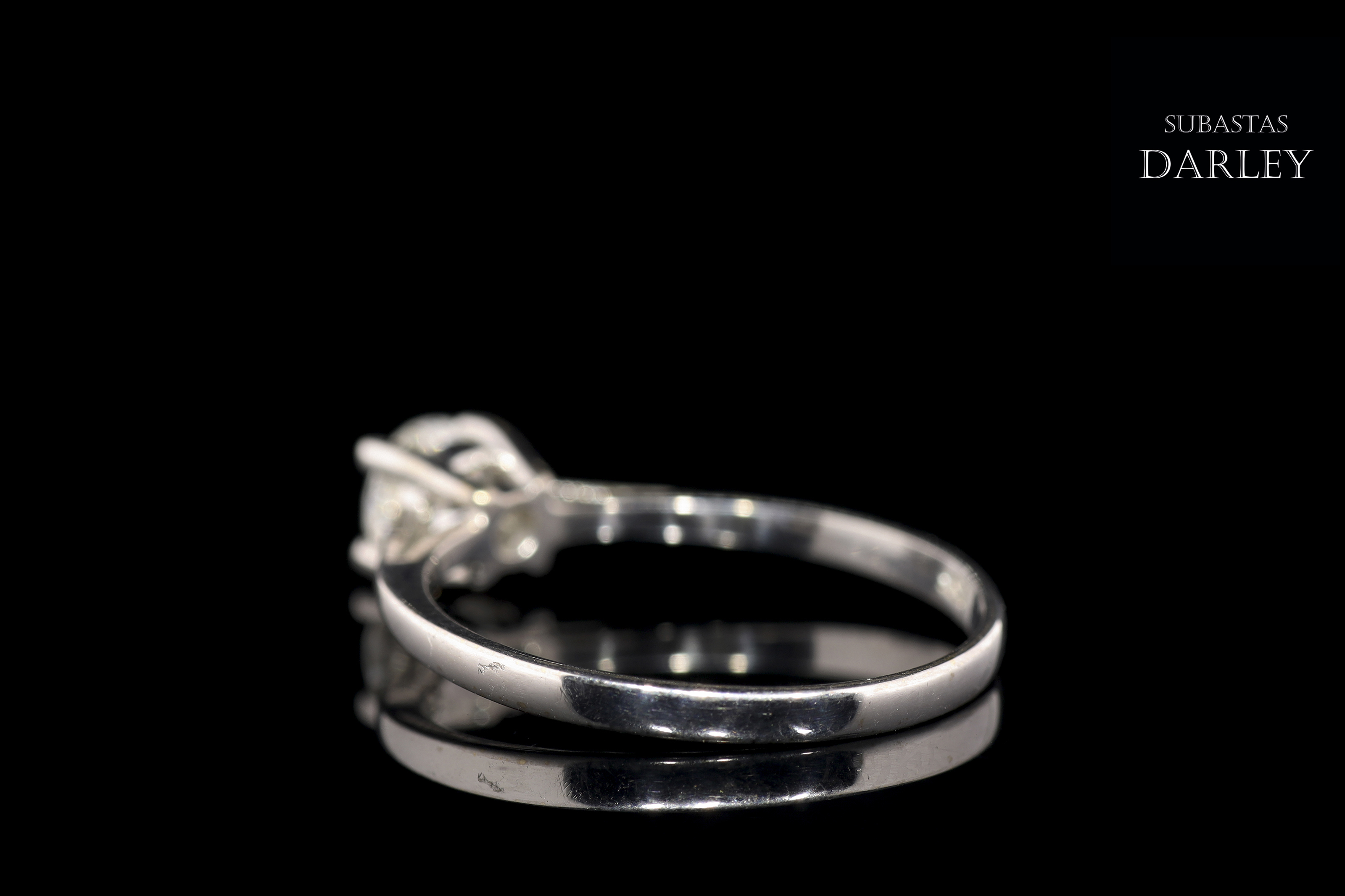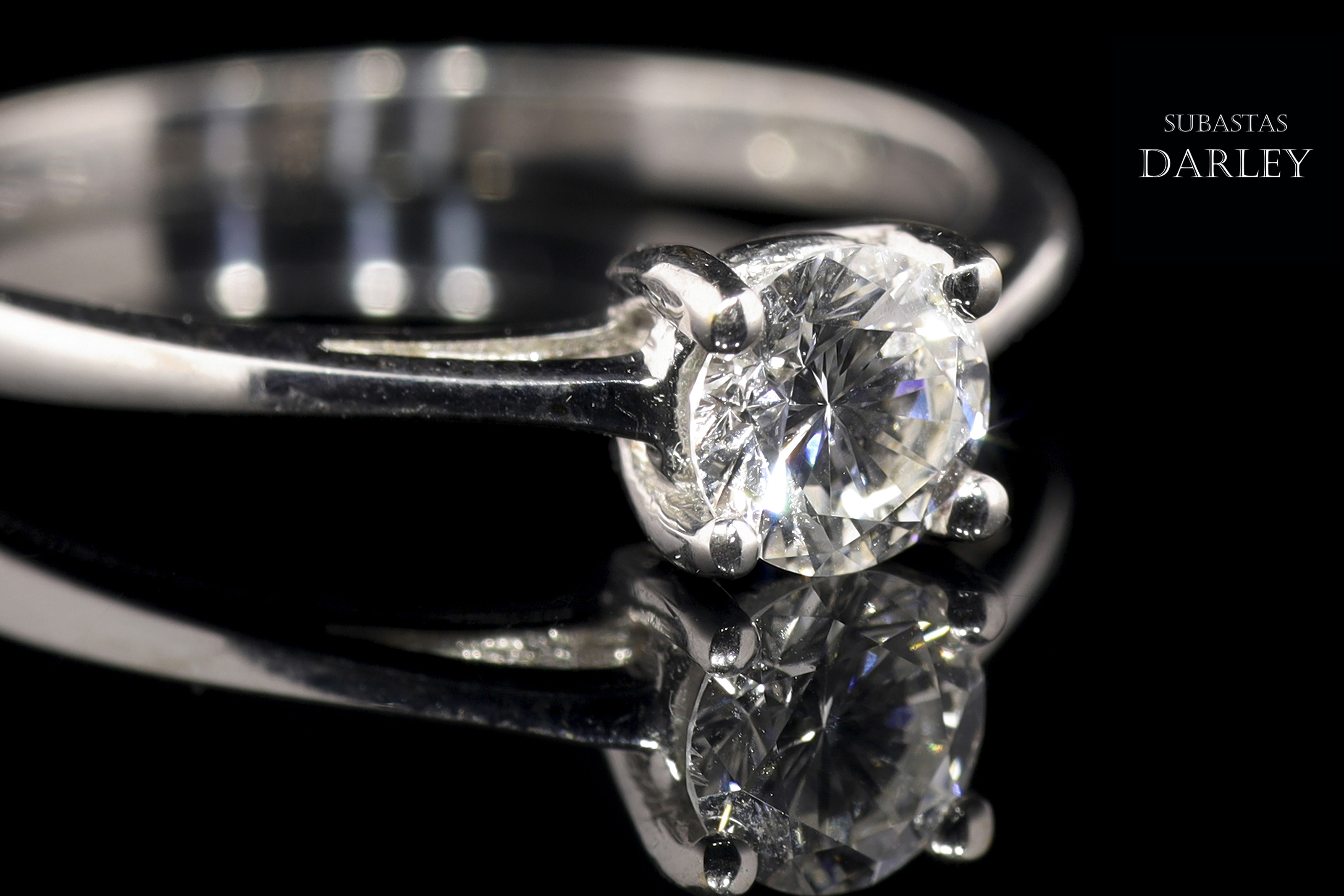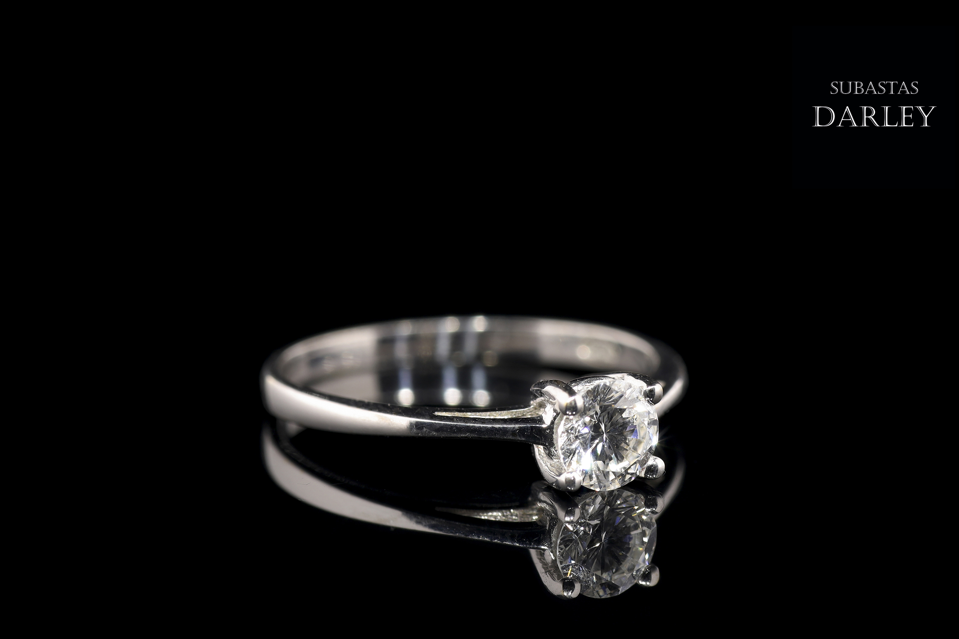18kt white gold solitaire model with a central diamond set in four claws. The diamond is brilliant-cut and weighs approximately 0.40 ct. The arm of the ring is more stylized at the top.
