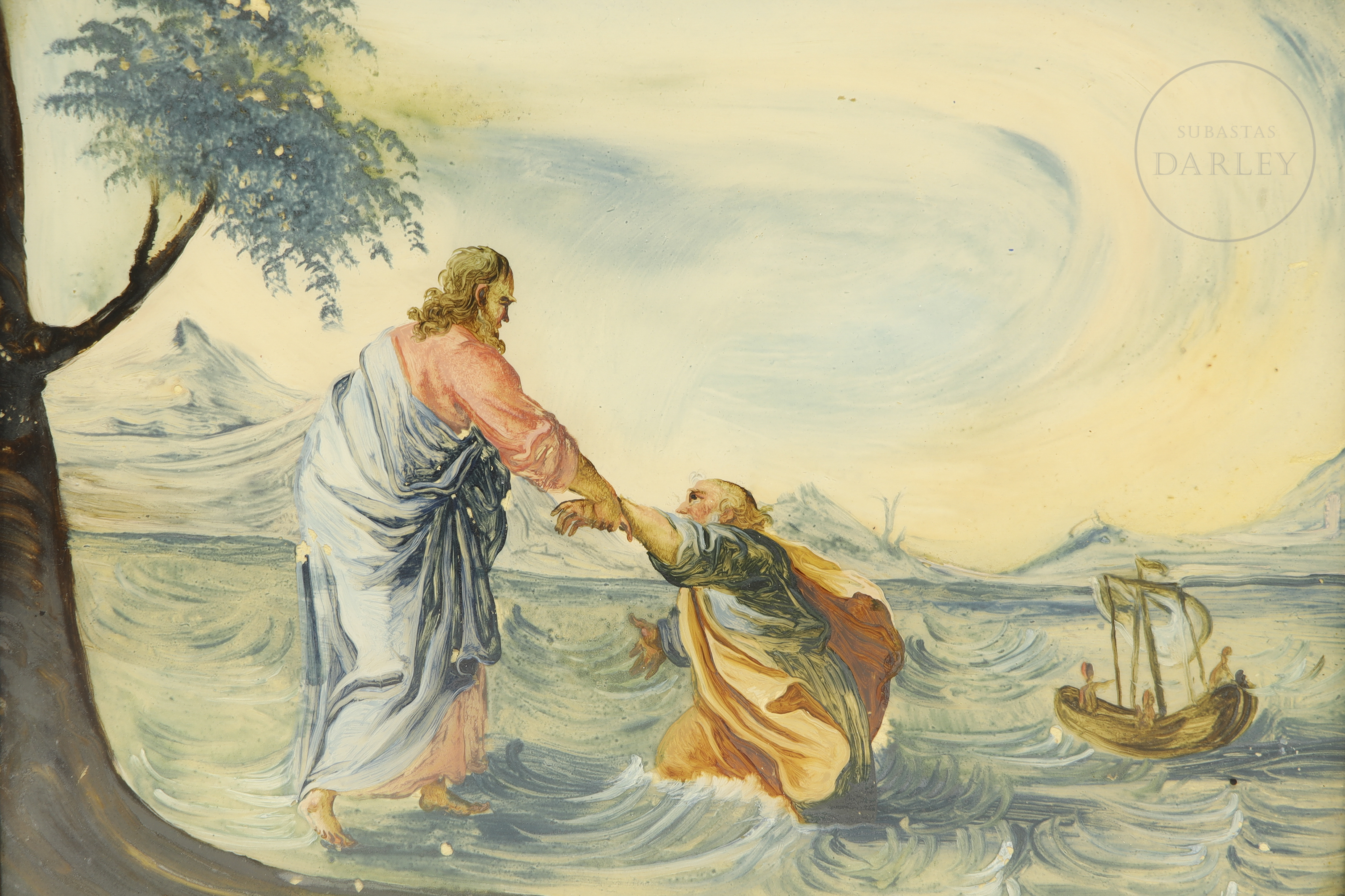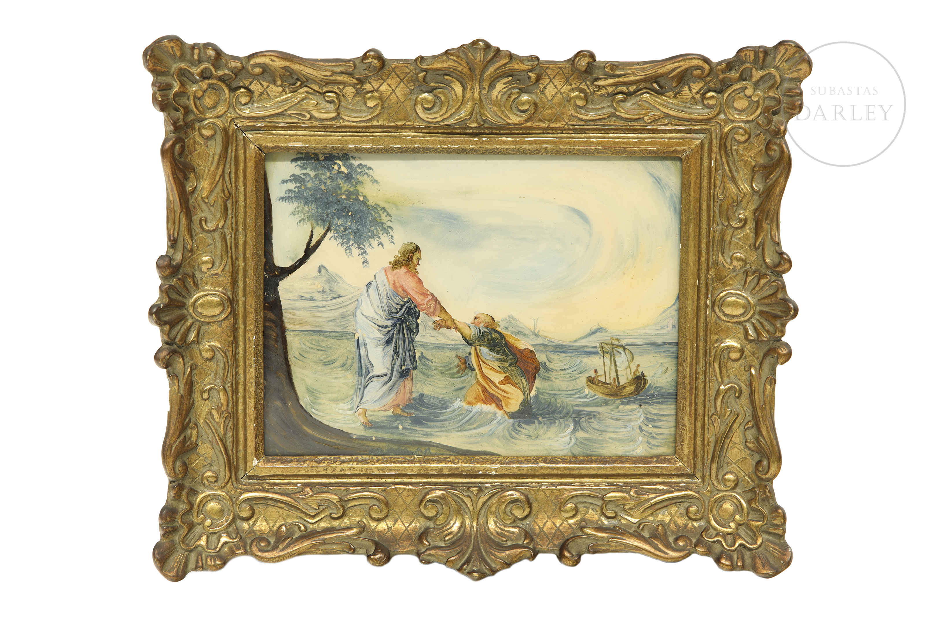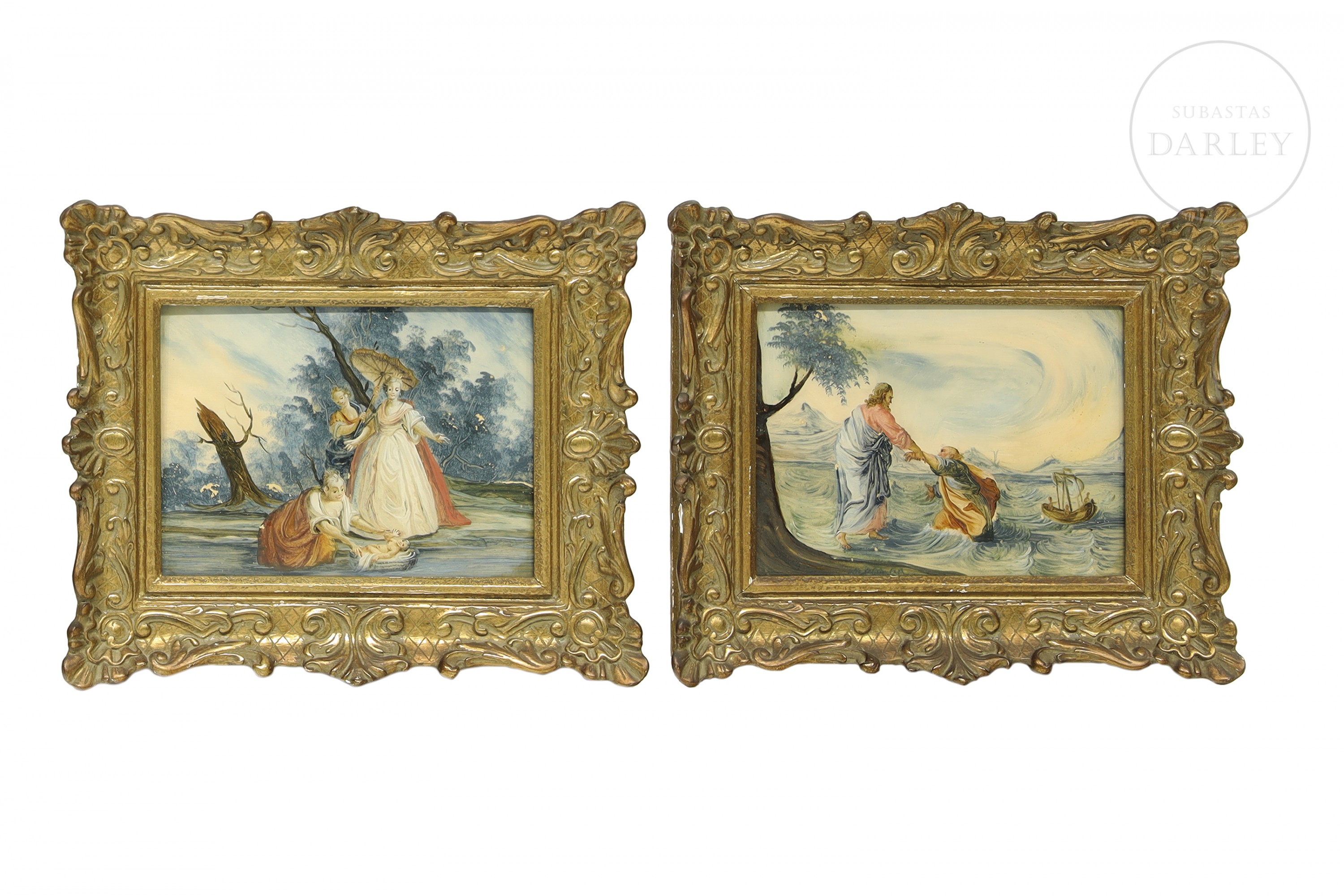 Set of two religious scenes painted in oil under glass or crystal. They represent the following scenes: "Jesus and St. Peter" and "Moses saved from the waters of the Nile". No signature is visible. It shows wear due to age. With frame.