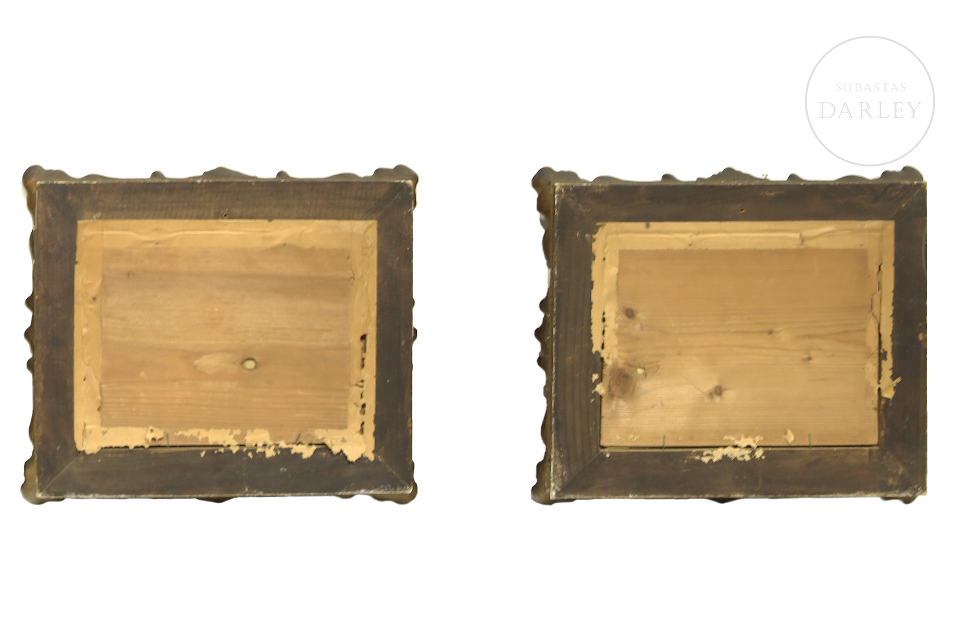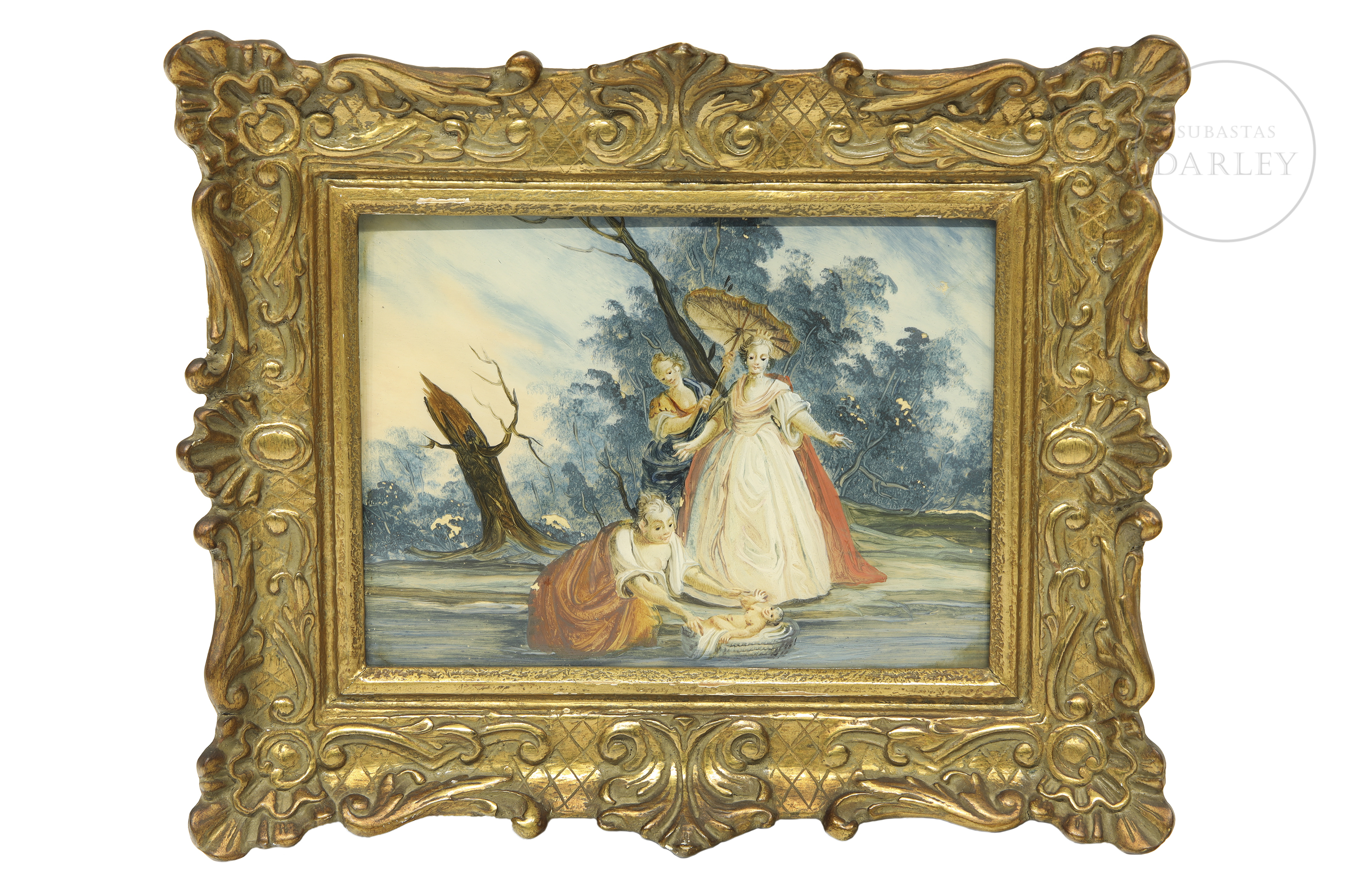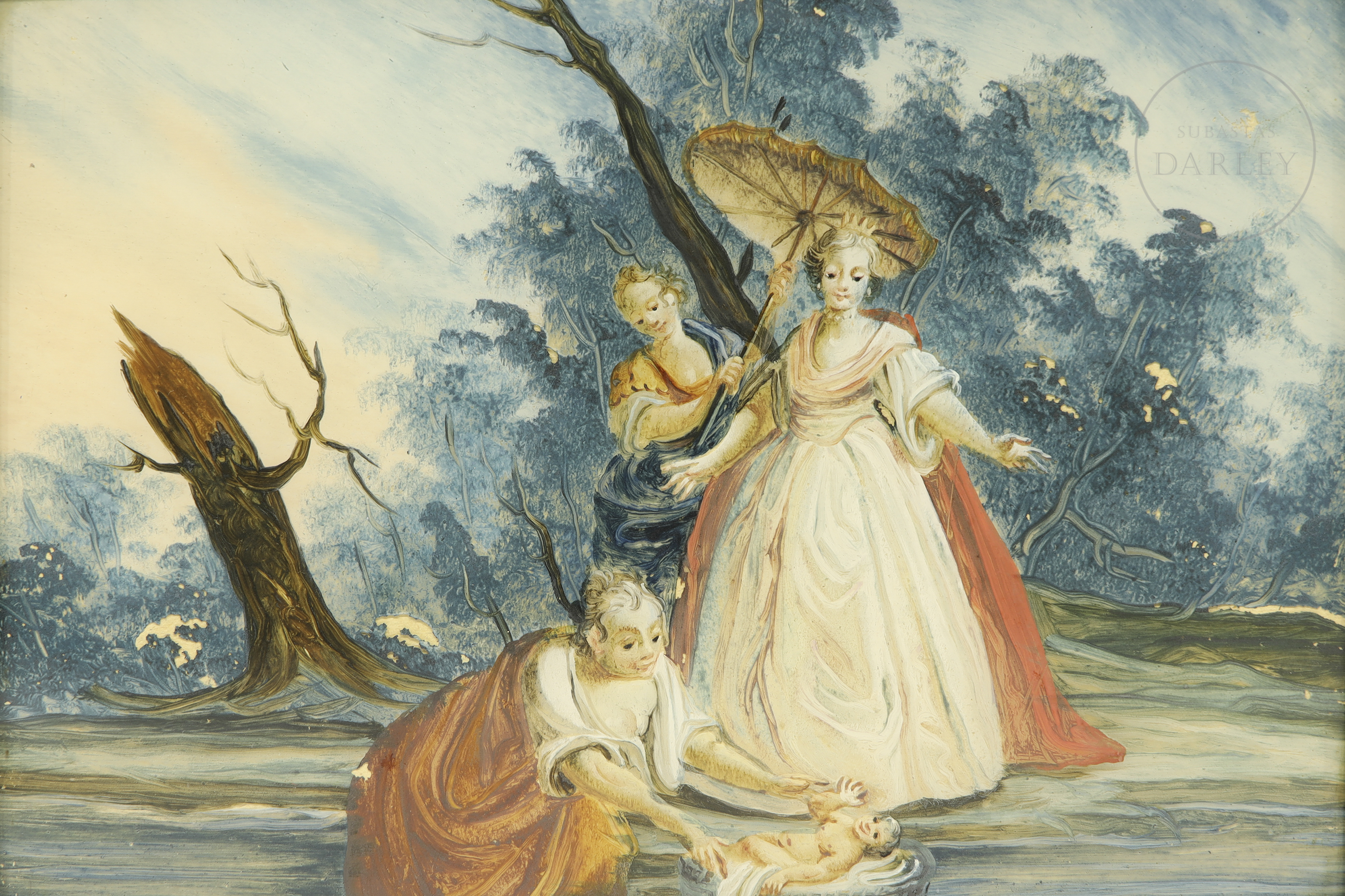 Set of two religious scenes painted in oil under glass or crystal. They represent the following scenes: "Jesus and St. Peter" and "Moses saved from the waters of the Nile". No signature is visible. It shows wear due to age. With frame.
