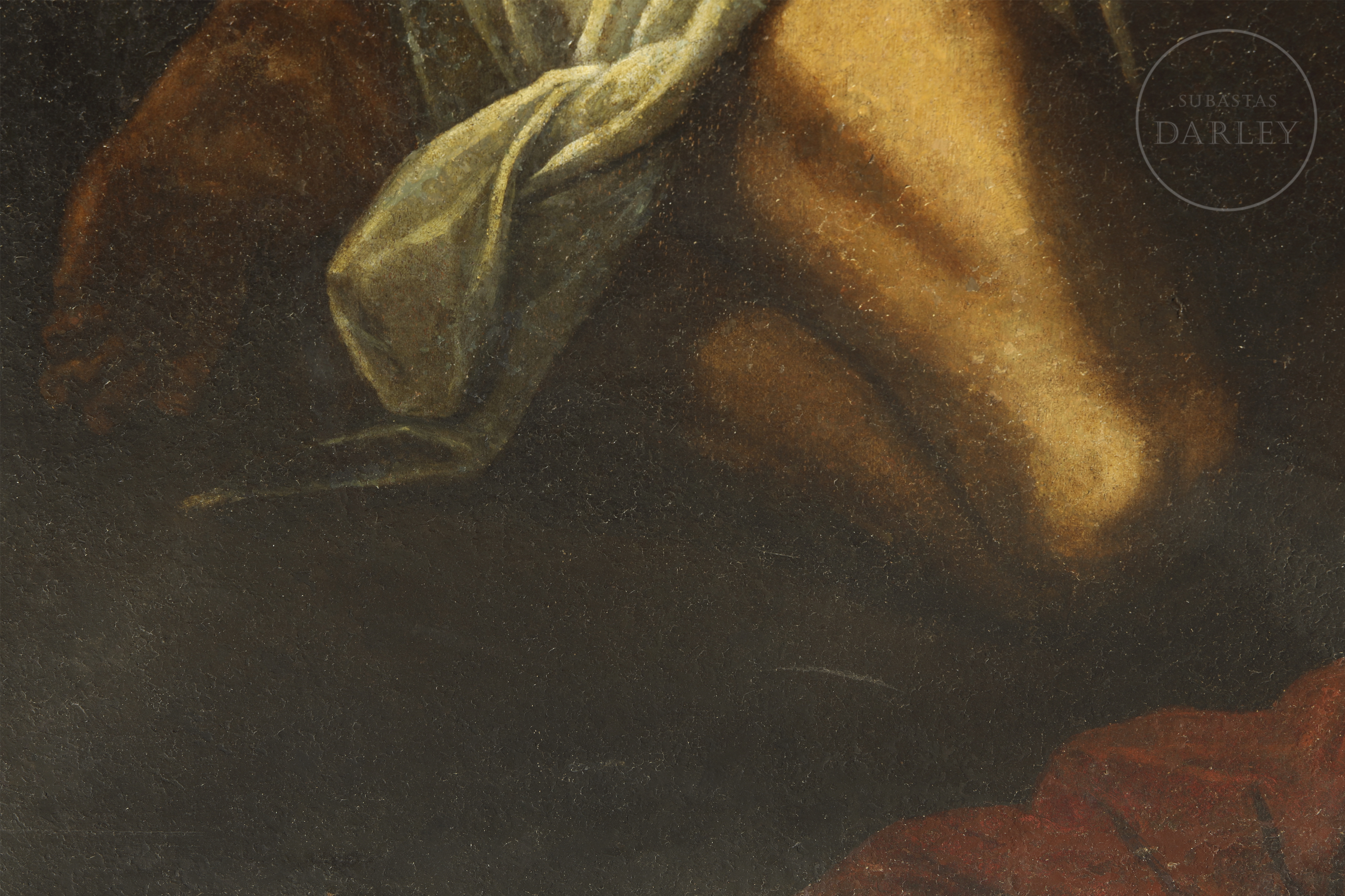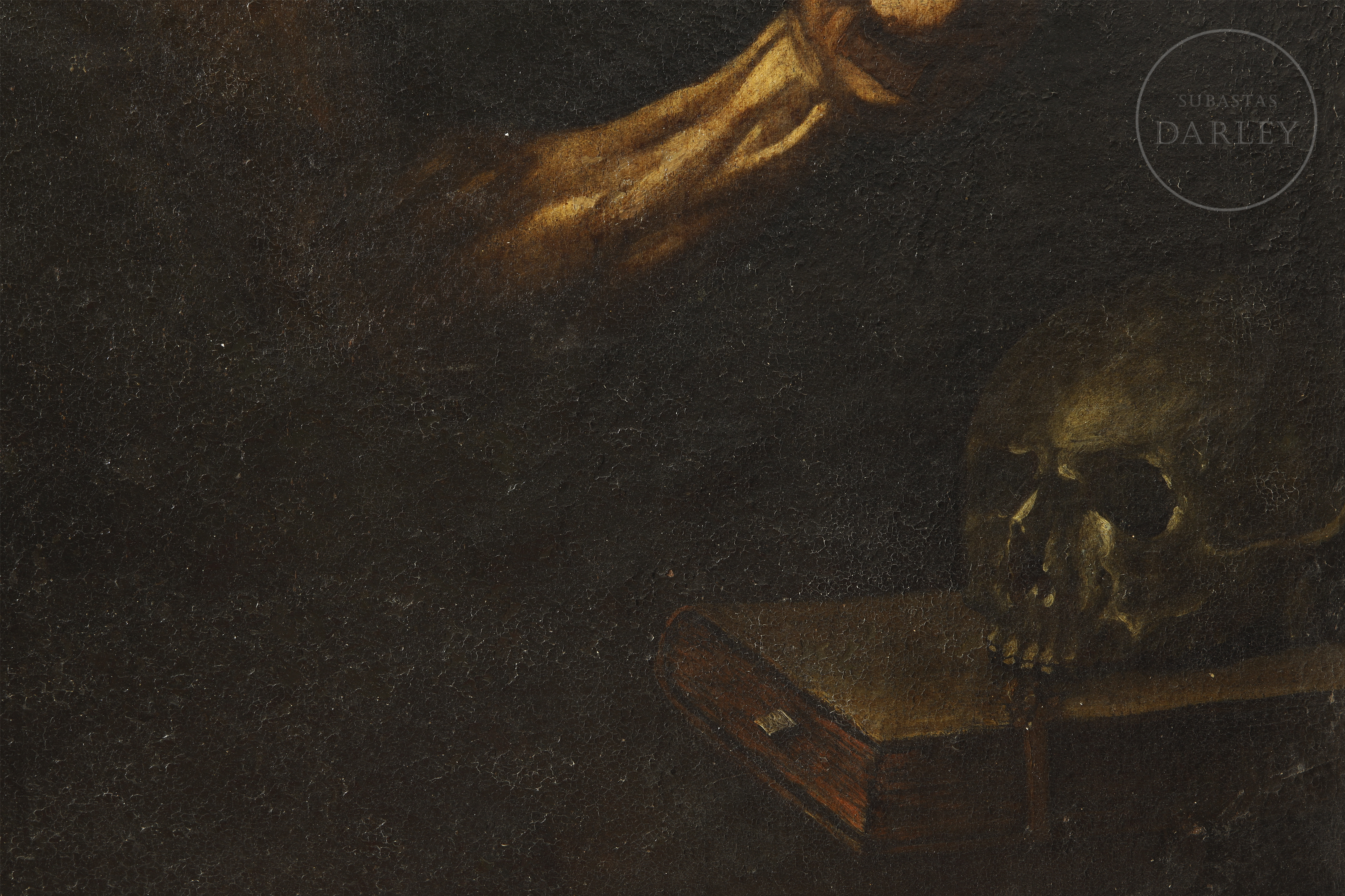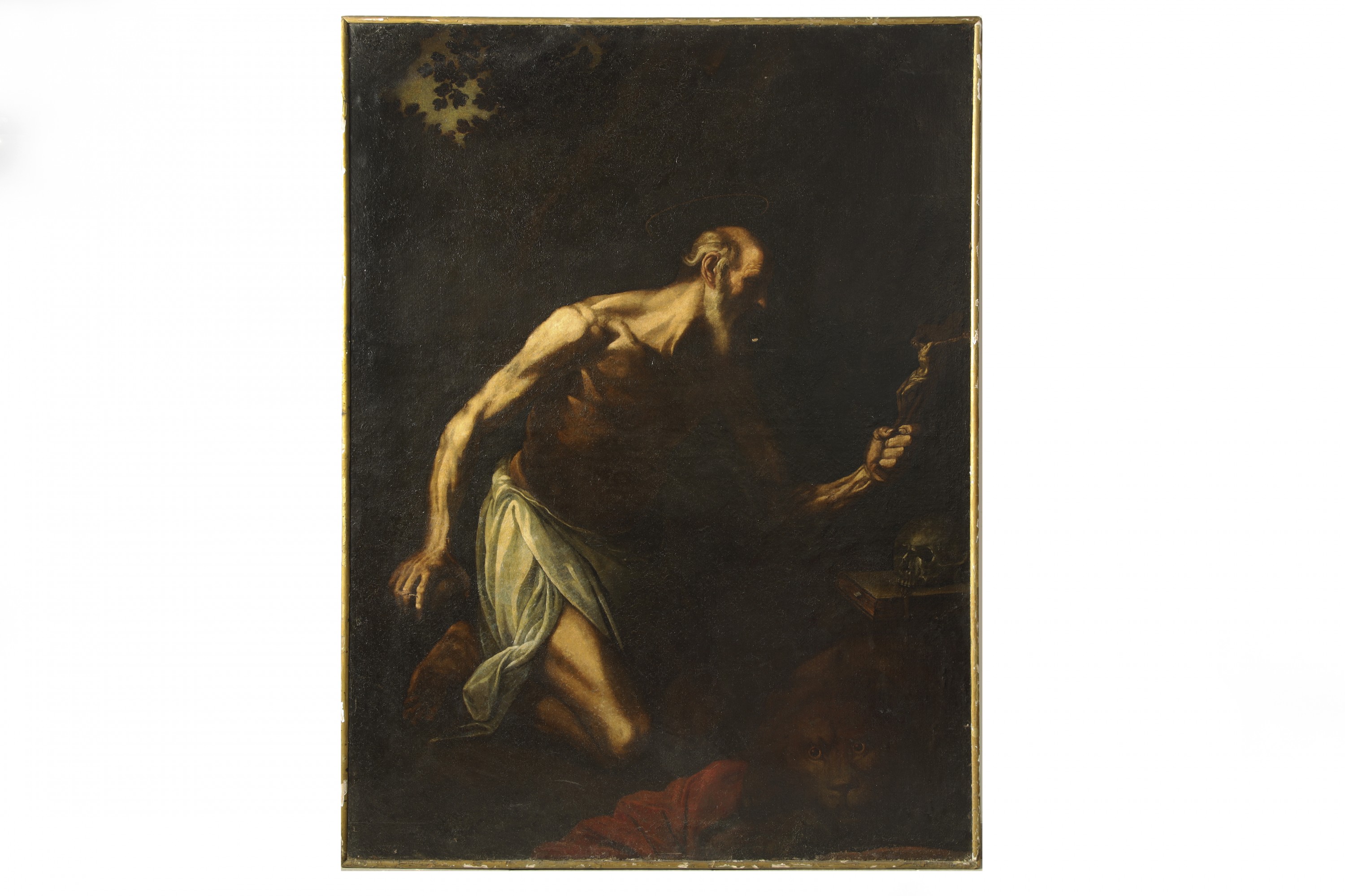 Oil on canvas. The work shows St. Jerome penitent, half kneeling, following one of the iconographic types of the conventional cultural tradition.