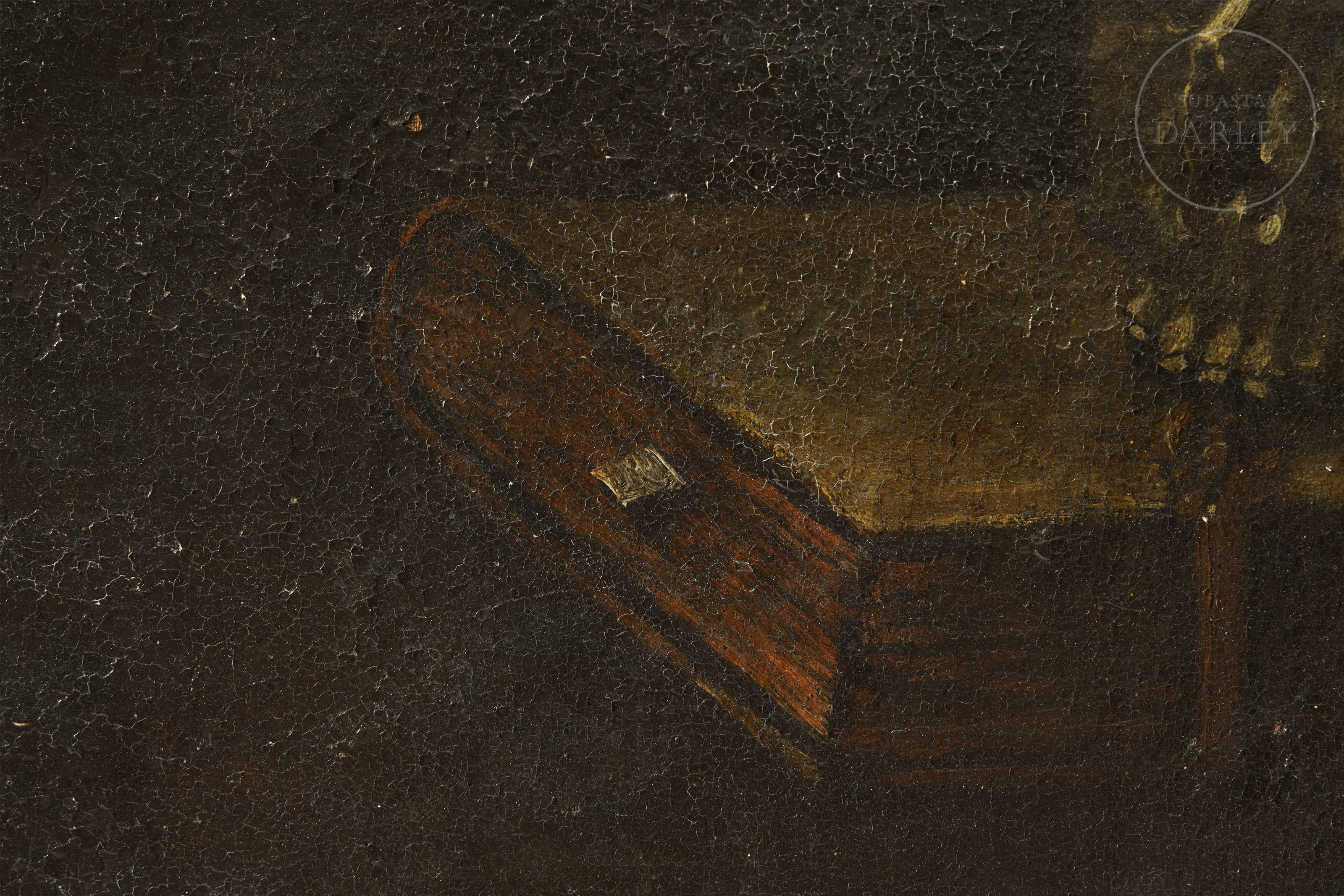 In his left hand he holds a small carving of Christ on the Cross, while in his right hand he holds a stone. Next to him appear his most distinctive attributes: the skull, the book and the lion, usual attributes of the saint and symbols of penitence and the transience of life.