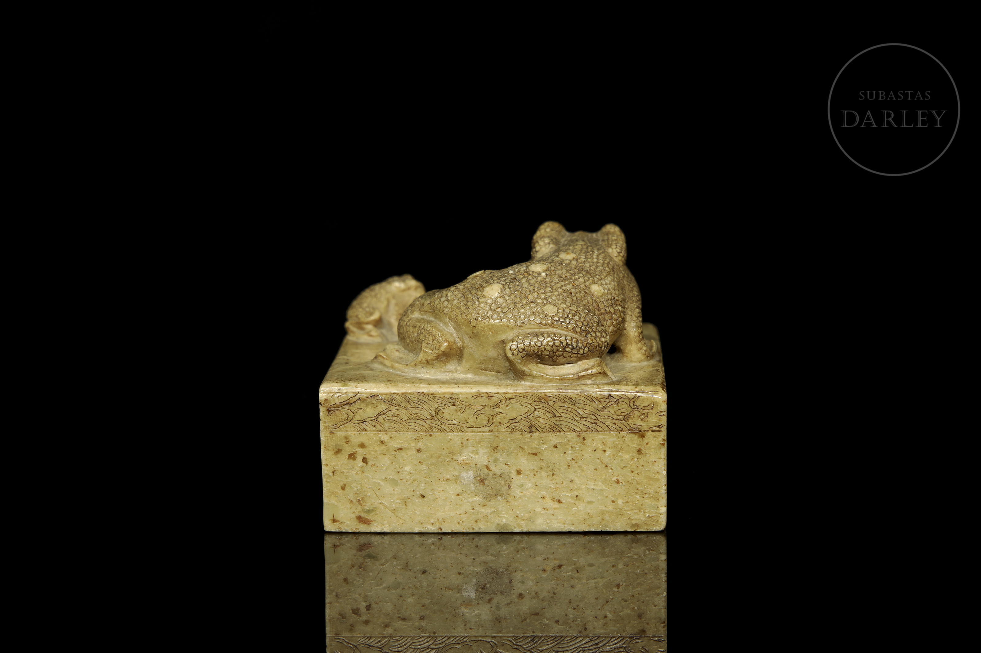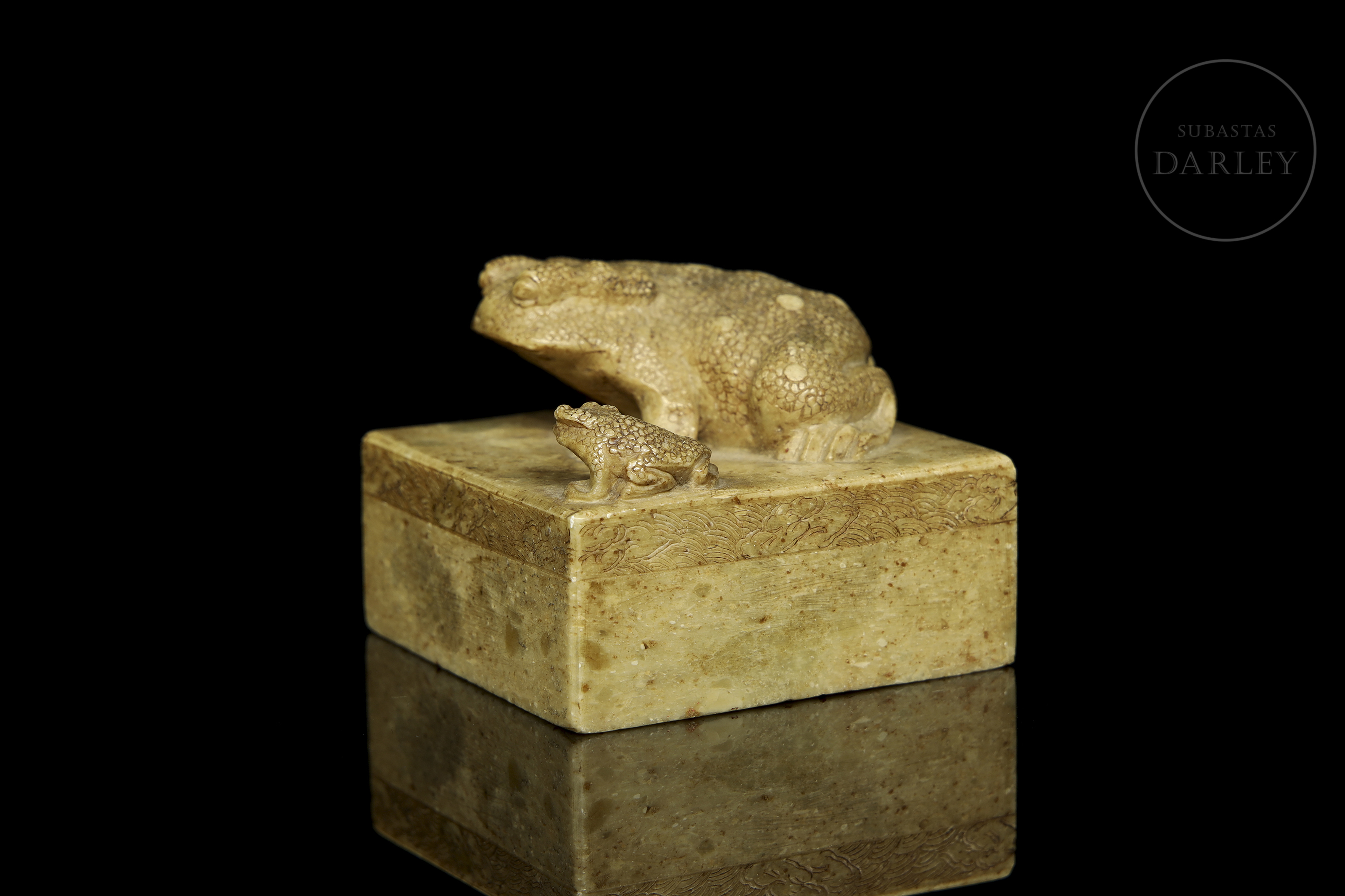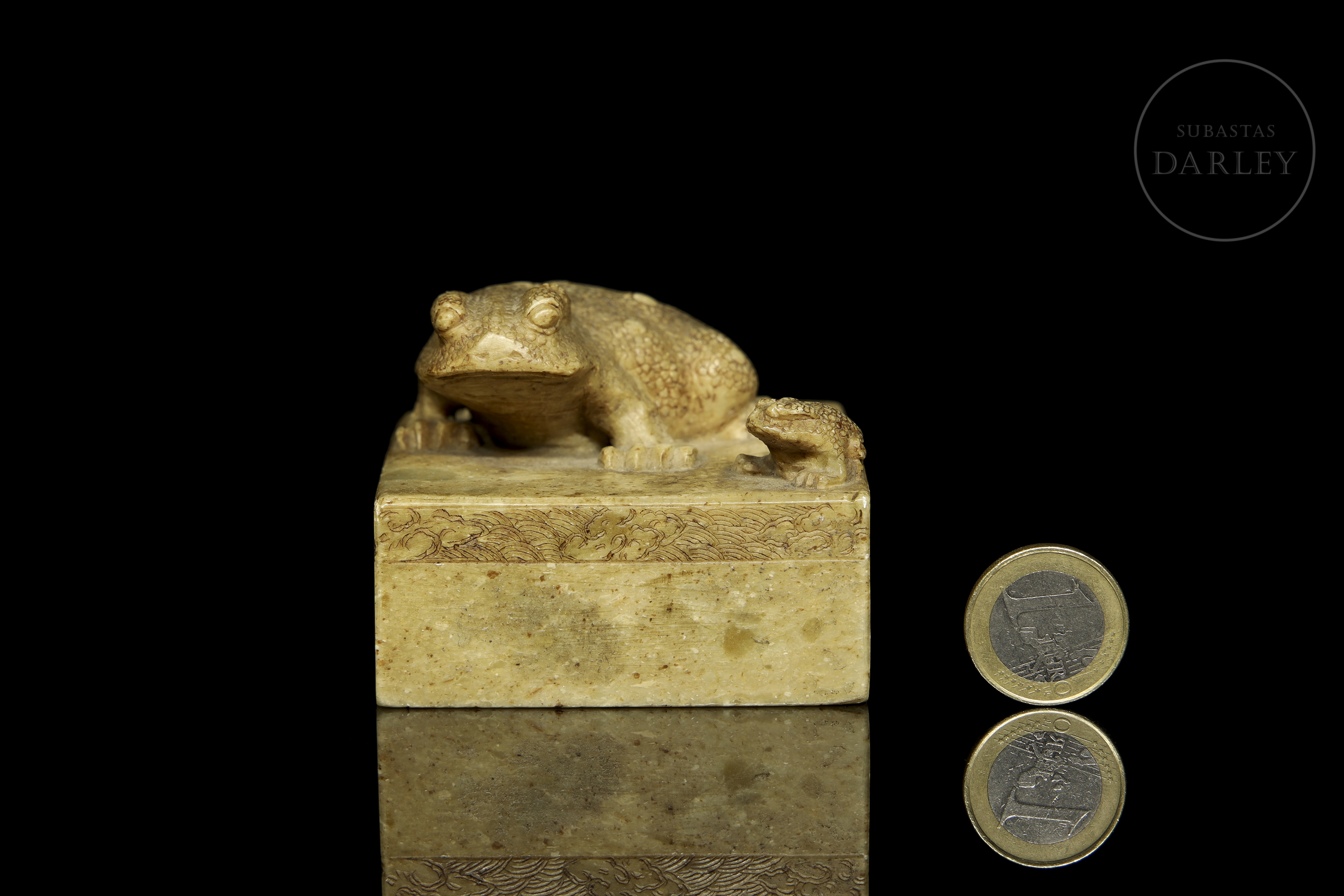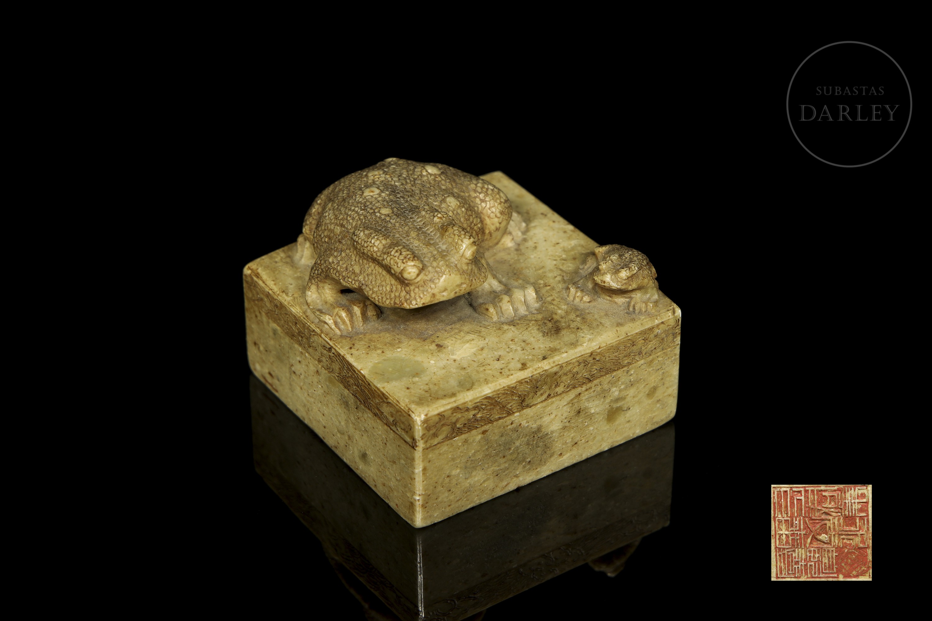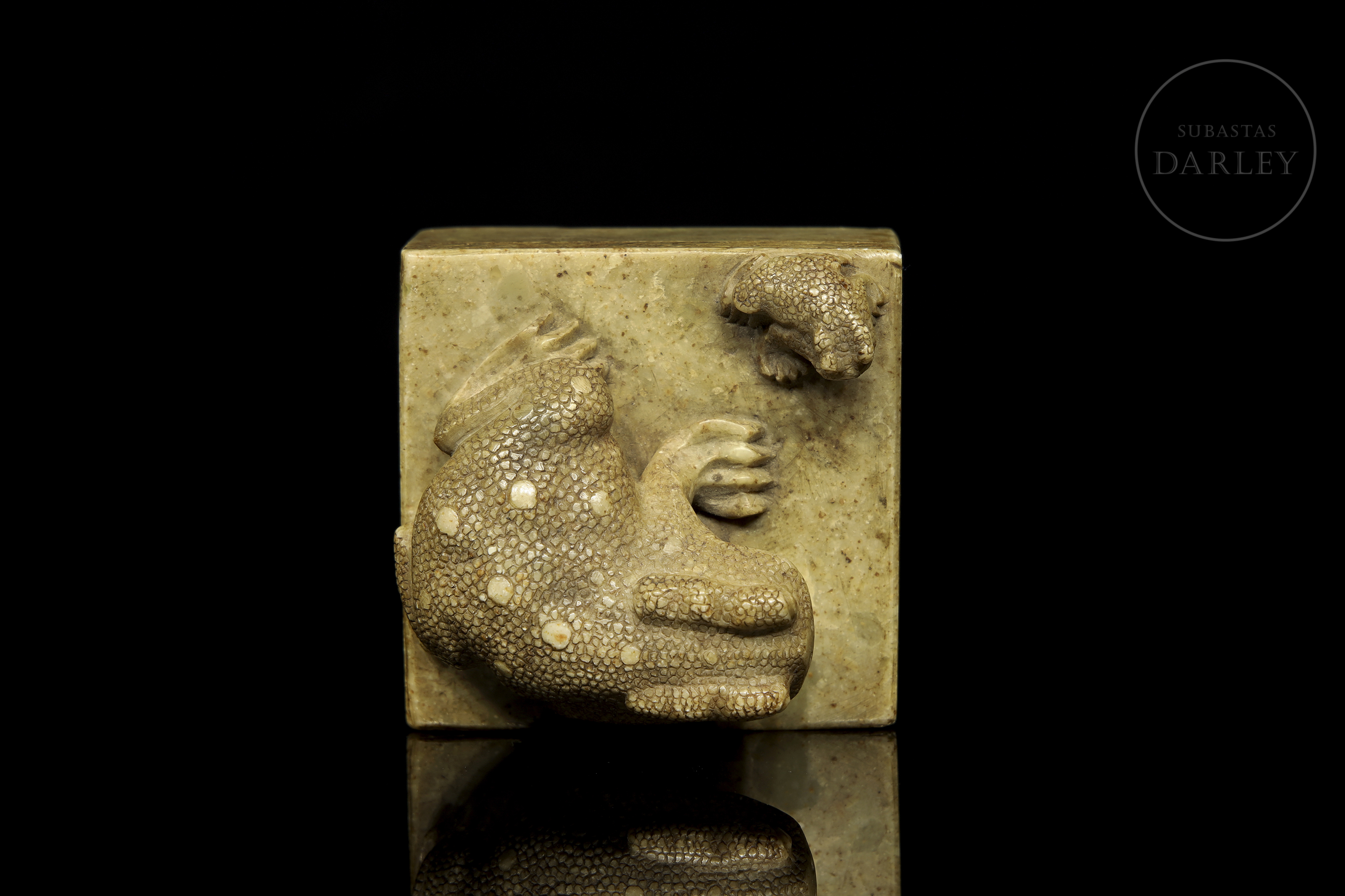 Carved hard stone seal, brownish in color with greenish undertones. It has a wide square base, decorated with a border of waves and incised clouds. In the upper part there are two toads, a large one and a small one next to the corner. Both, meticulously carved, are shown crouching, with their front legs extended and looking straight ahead. The body, covered with incised details, faithfully represents the natural texture of the amphibian.