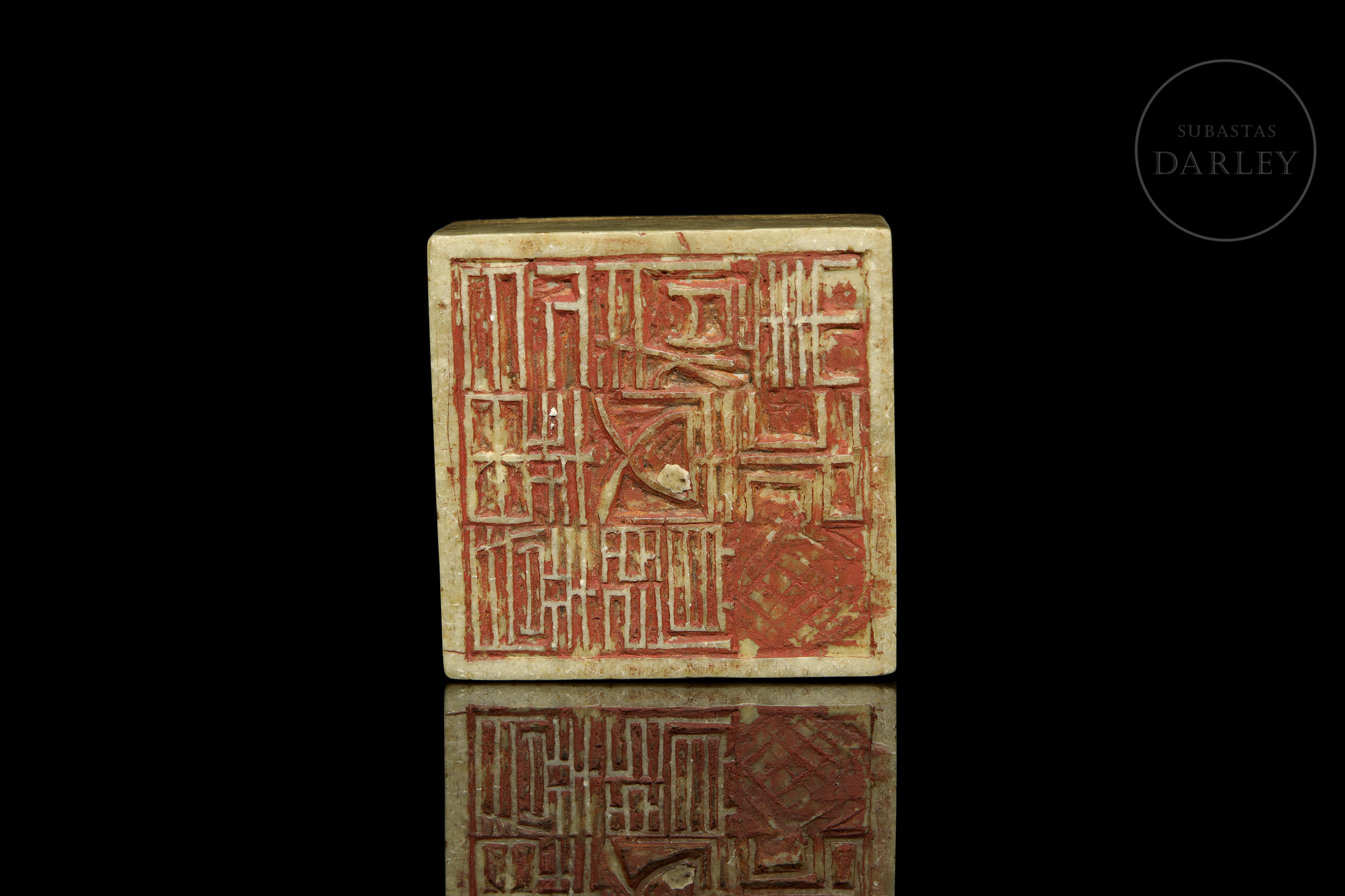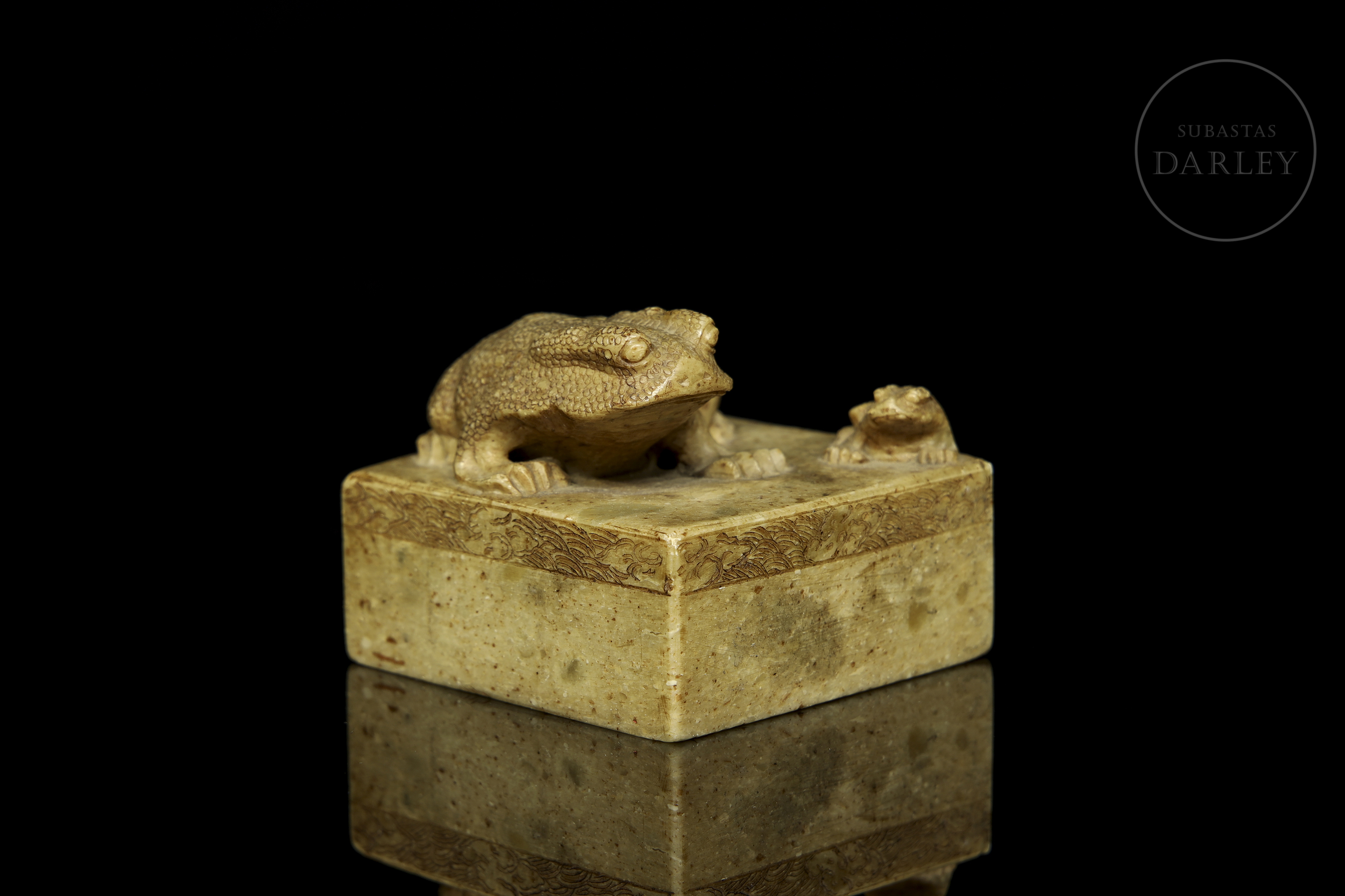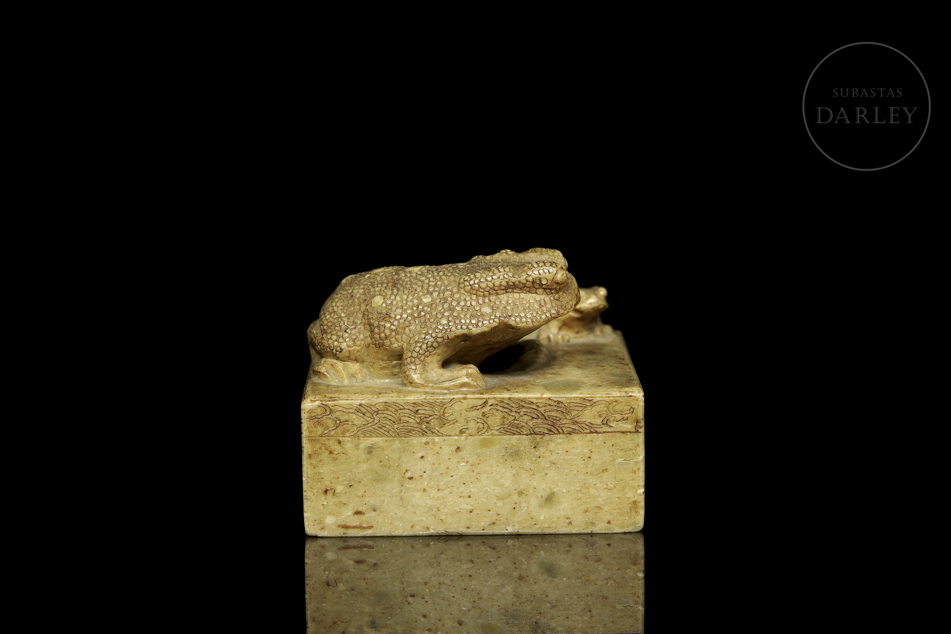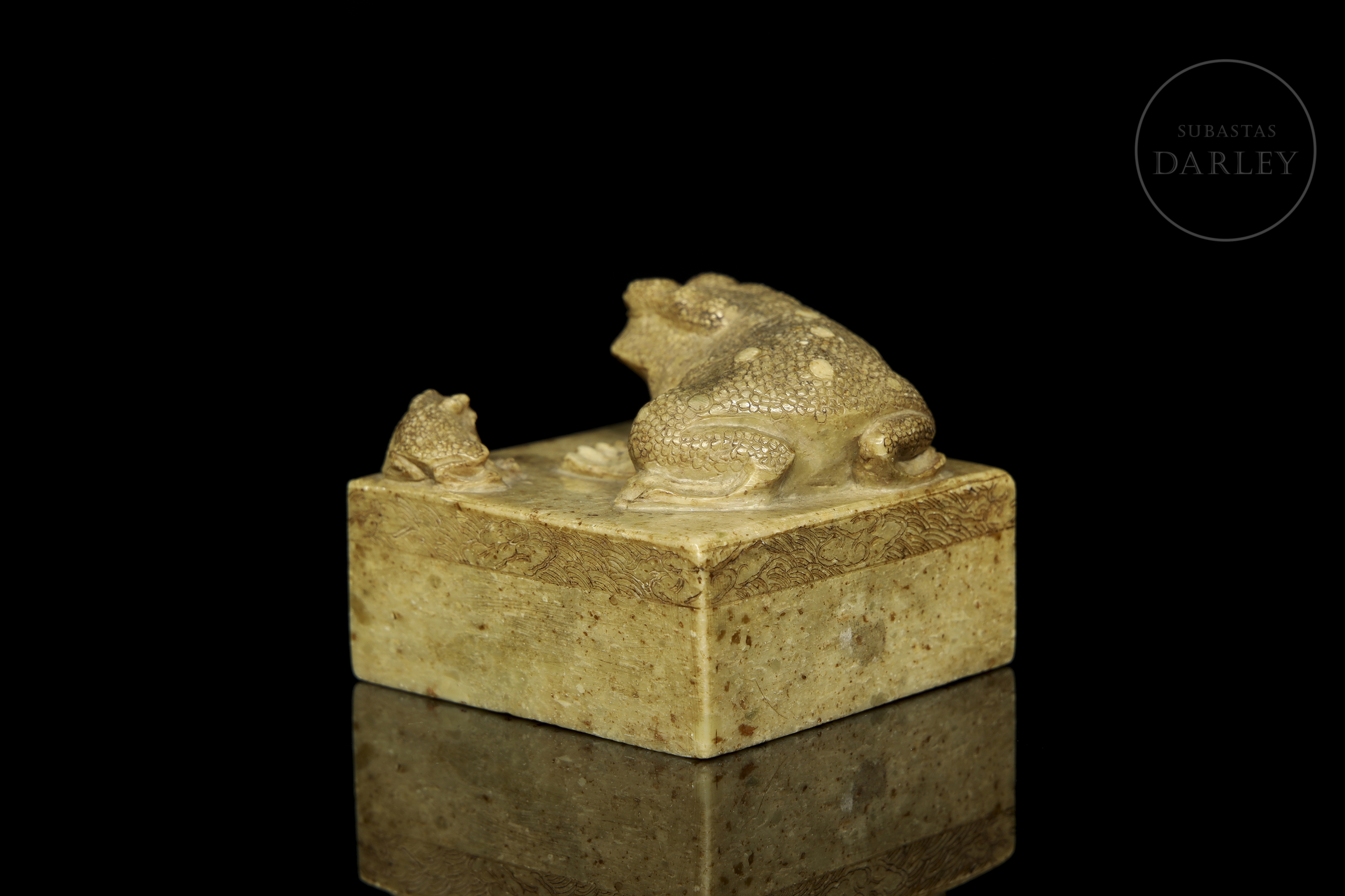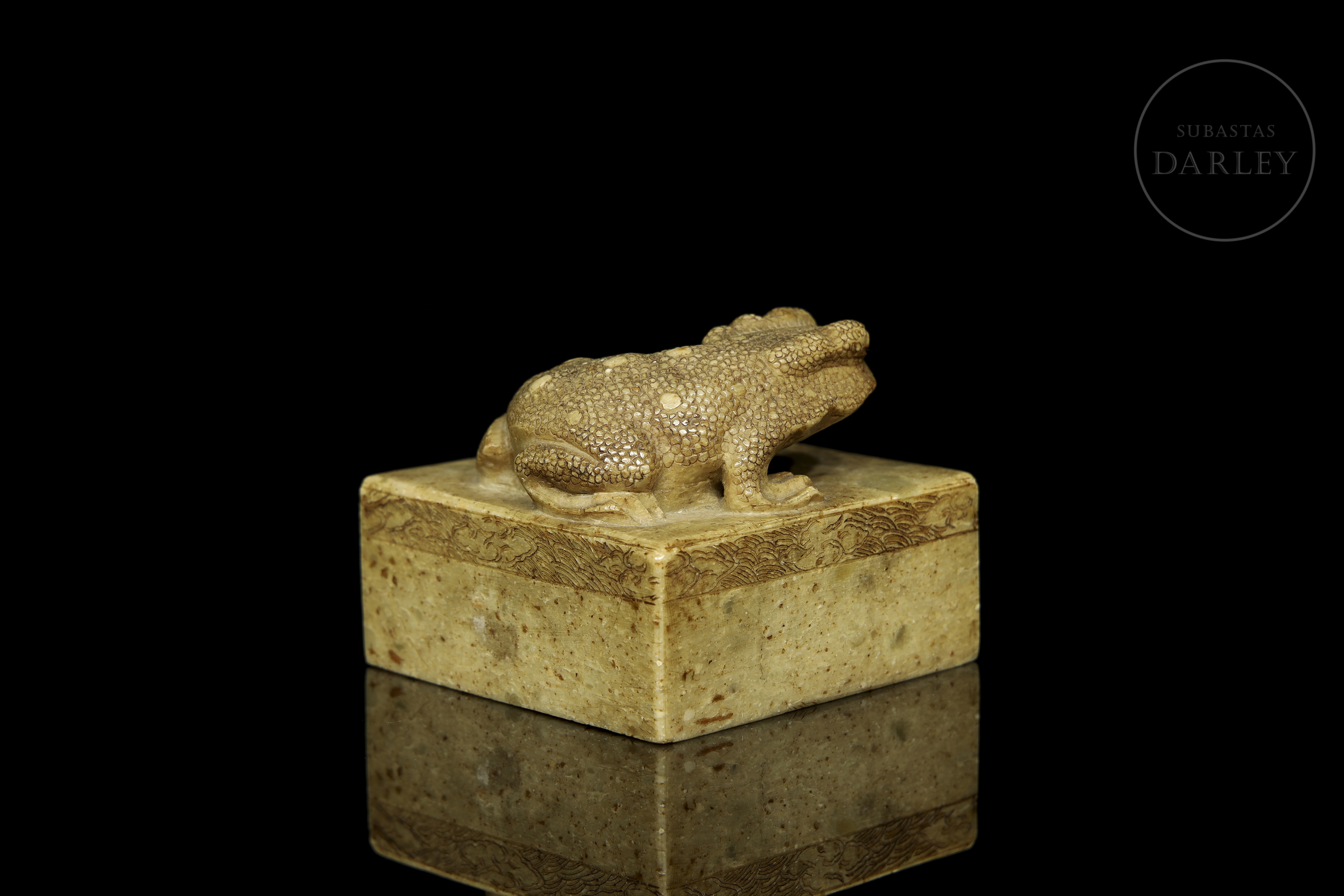 Carved hard stone seal, brownish in color with greenish undertones. It has a wide square base, decorated with a border of waves and incised clouds. In the upper part there are two toads, a large one and a small one next to the corner. Both, meticulously carved, are shown crouching, with their front legs extended and looking straight ahead. The body, covered with incised details, faithfully represents the natural texture of the amphibian.