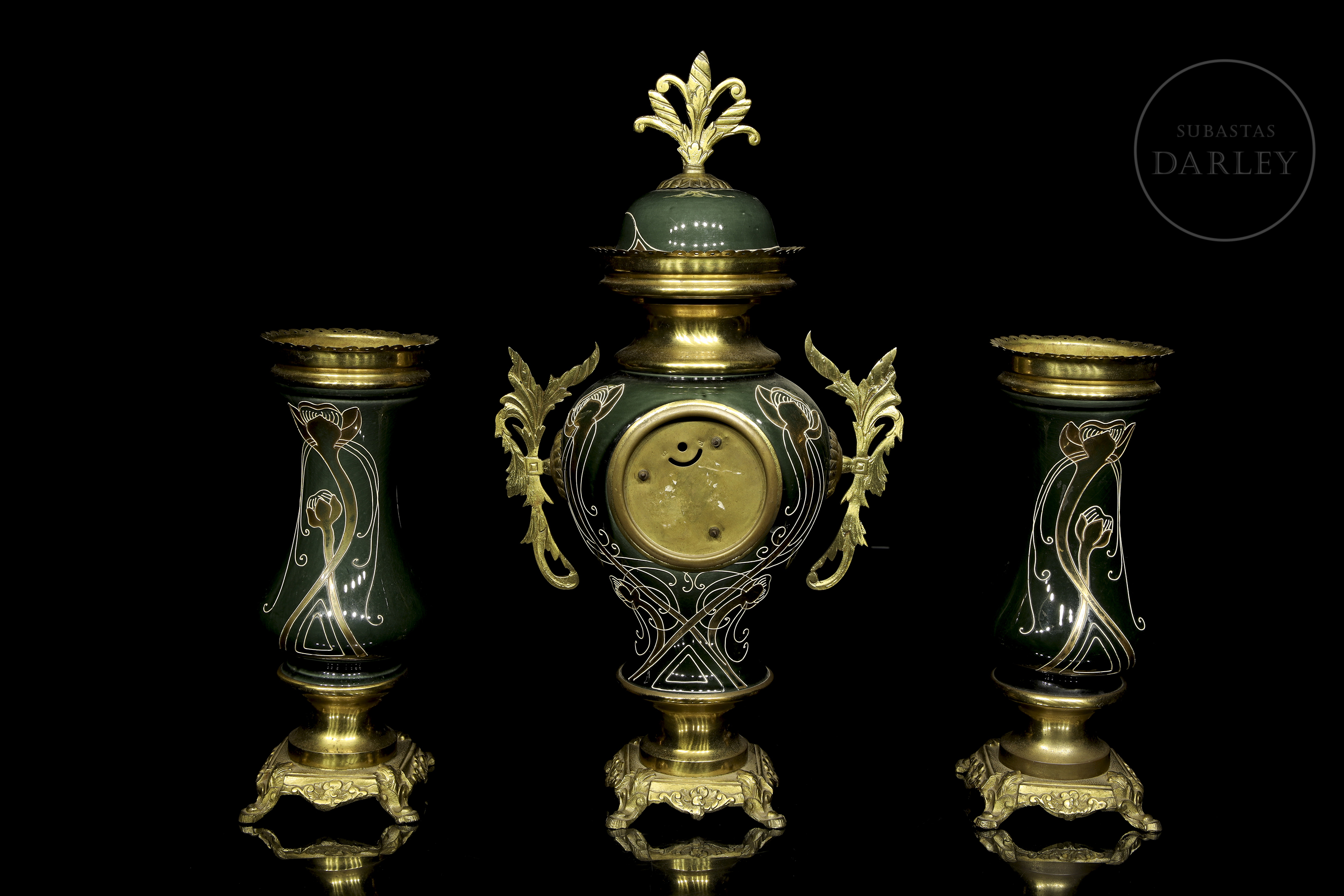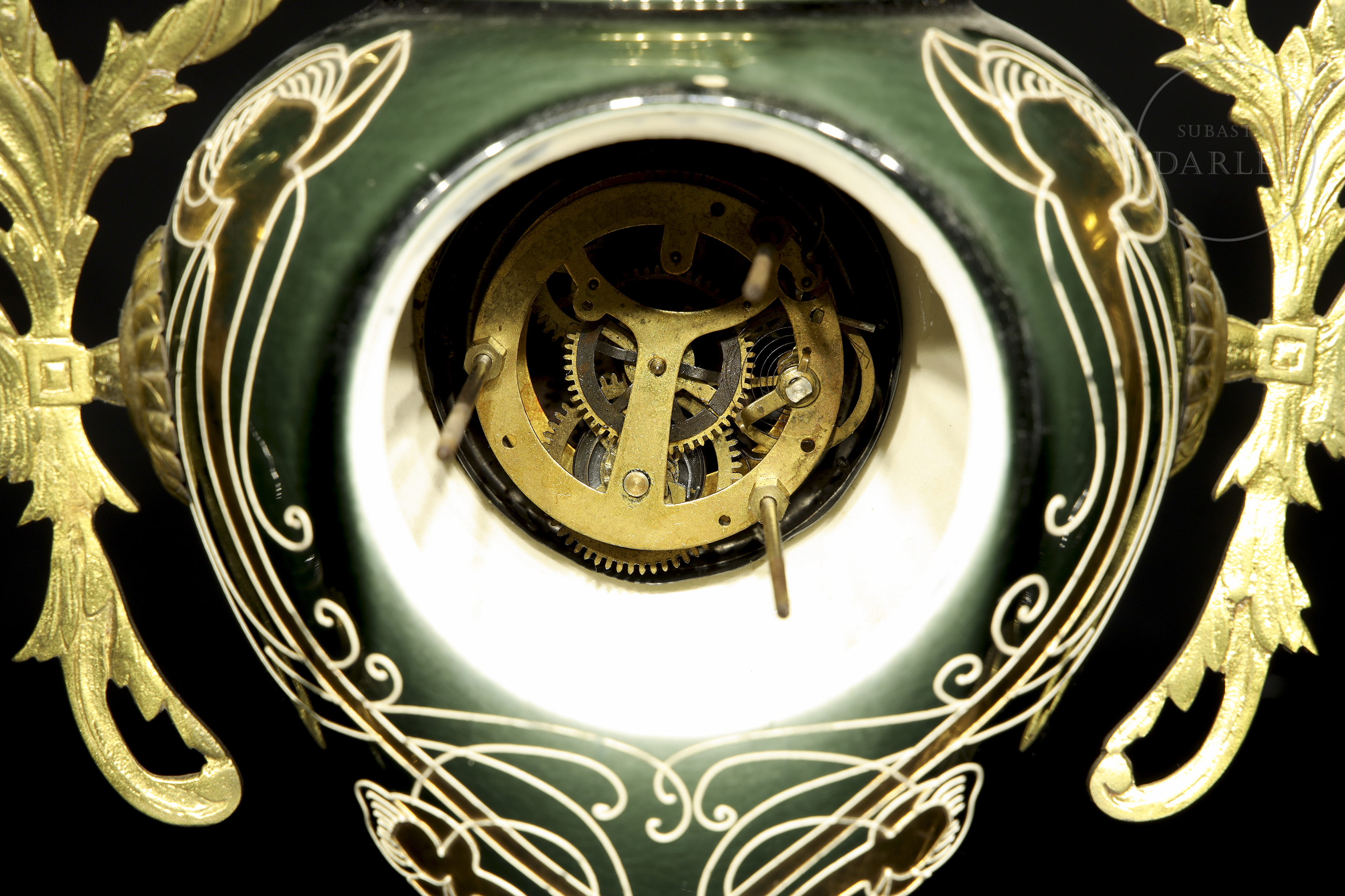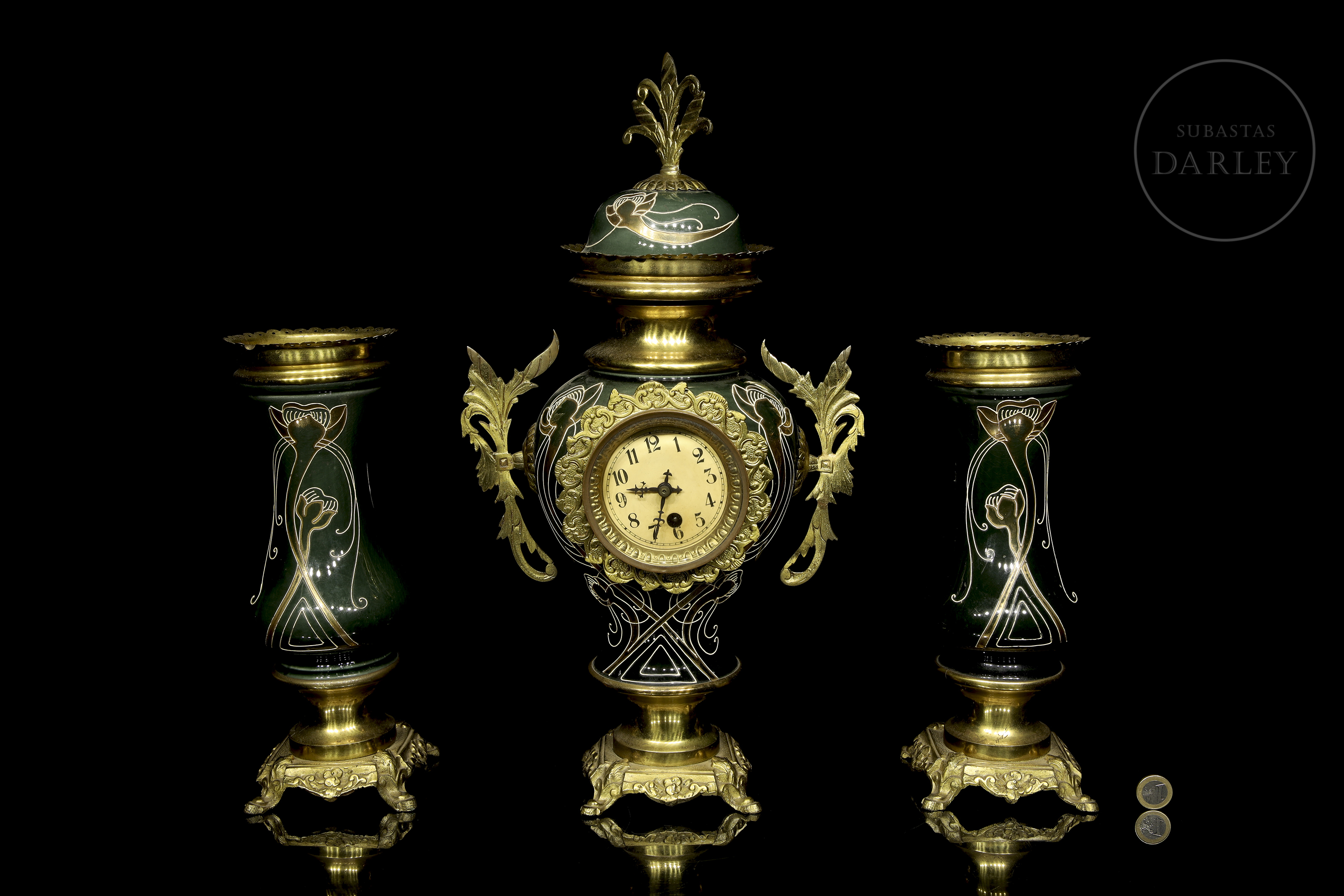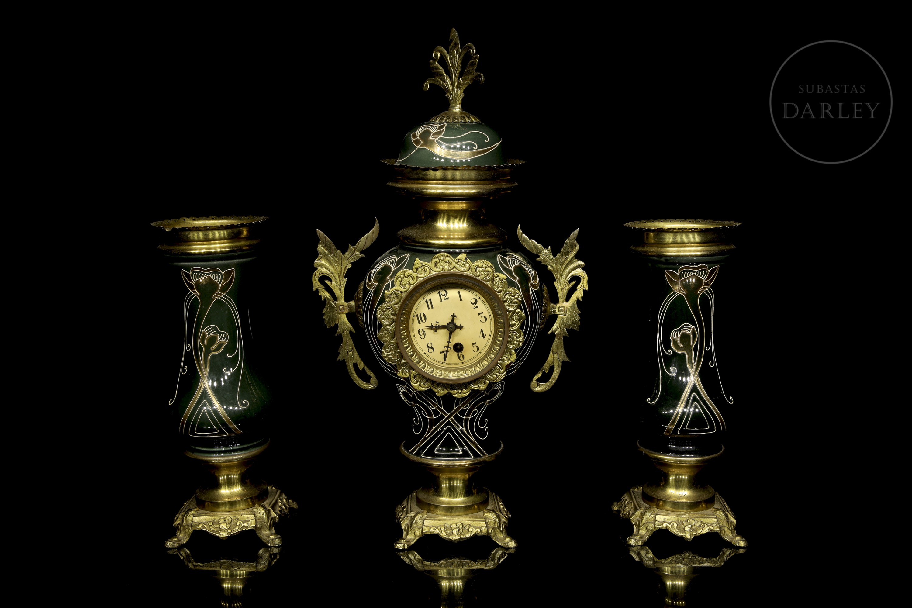 Table clock with two modernist style vases. Made of enamelled porcelain with handmade floral decorations and golden metal details.