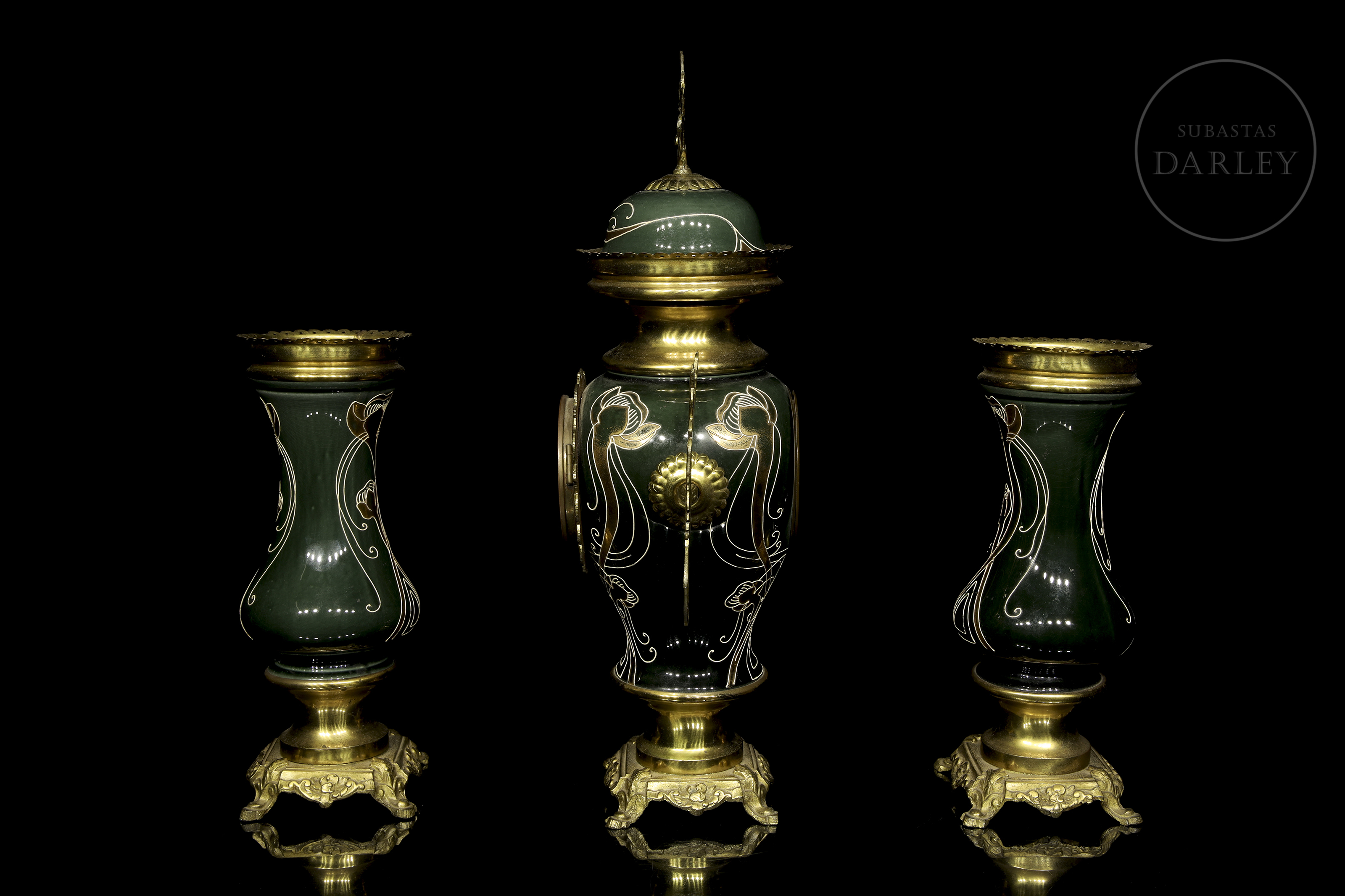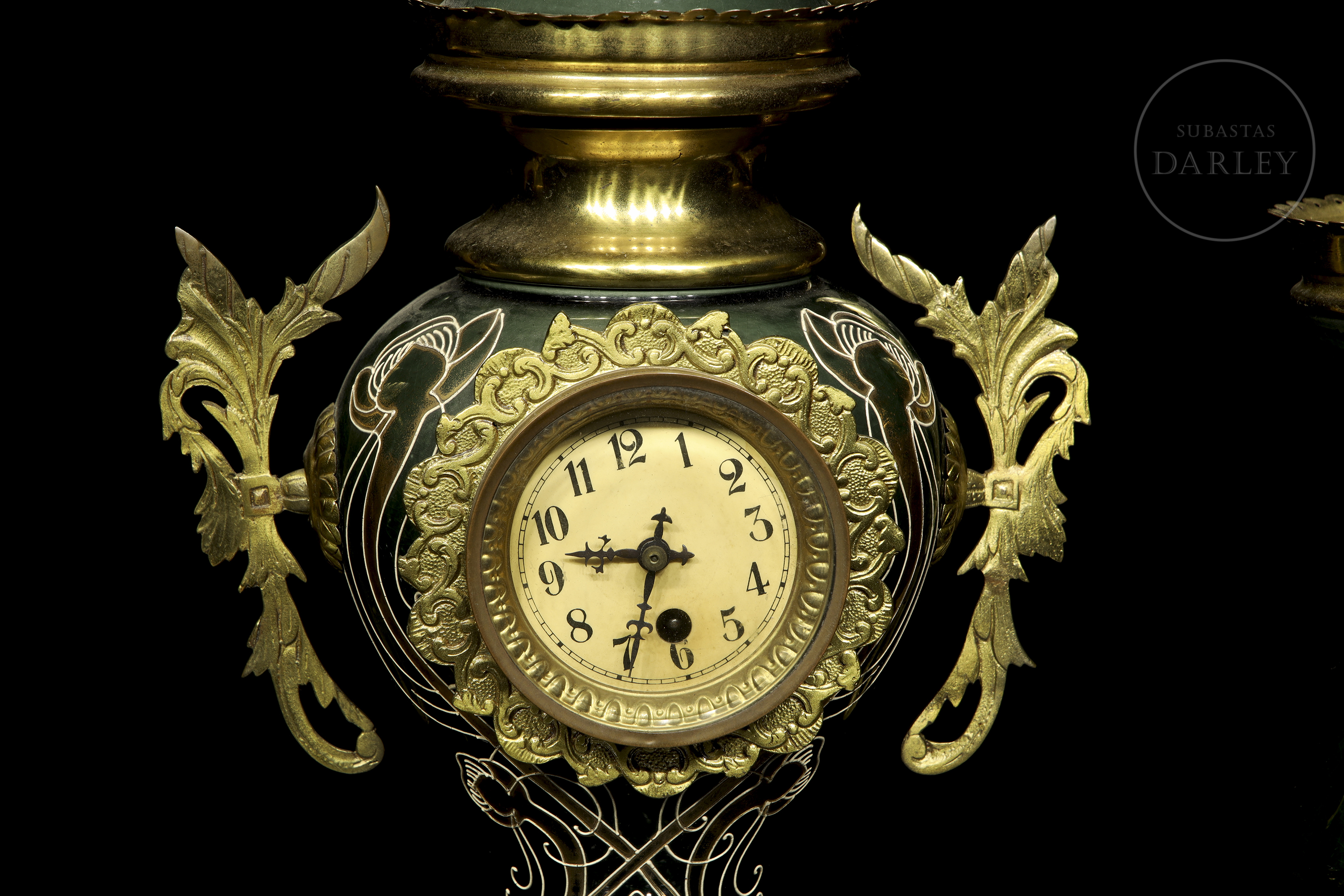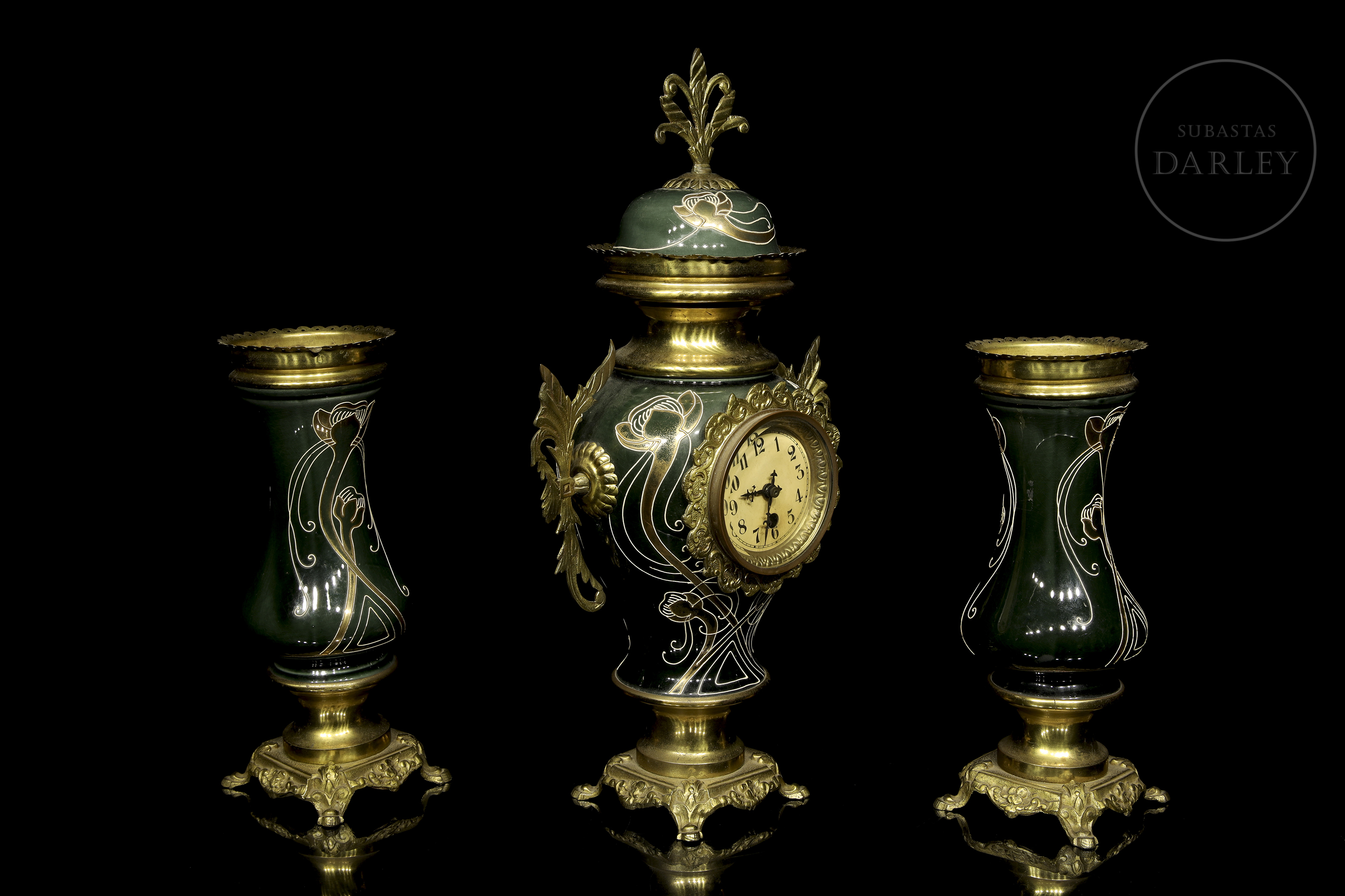 Table clock with two modernist style vases. Made of enamelled porcelain with handmade floral decorations and golden metal details.