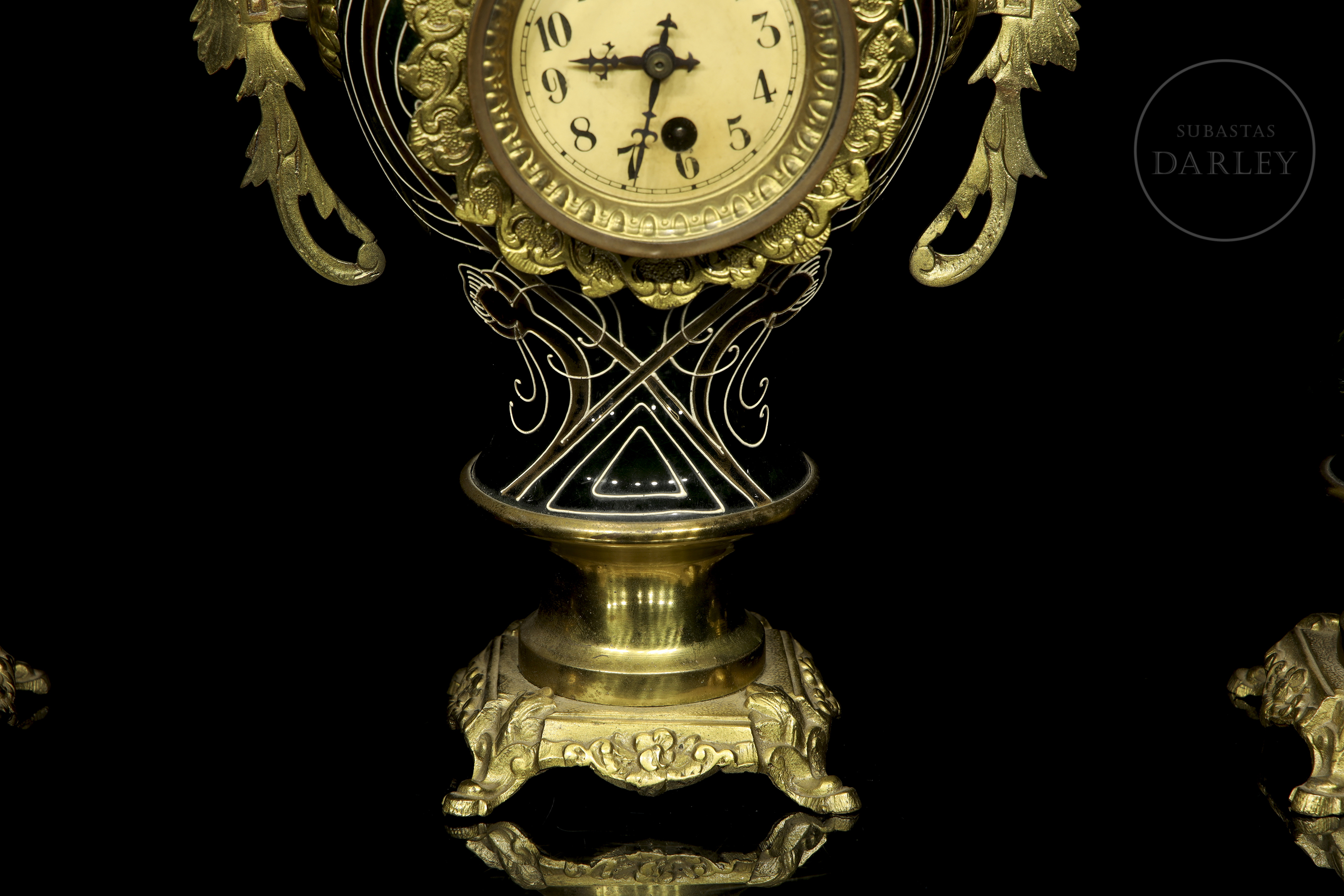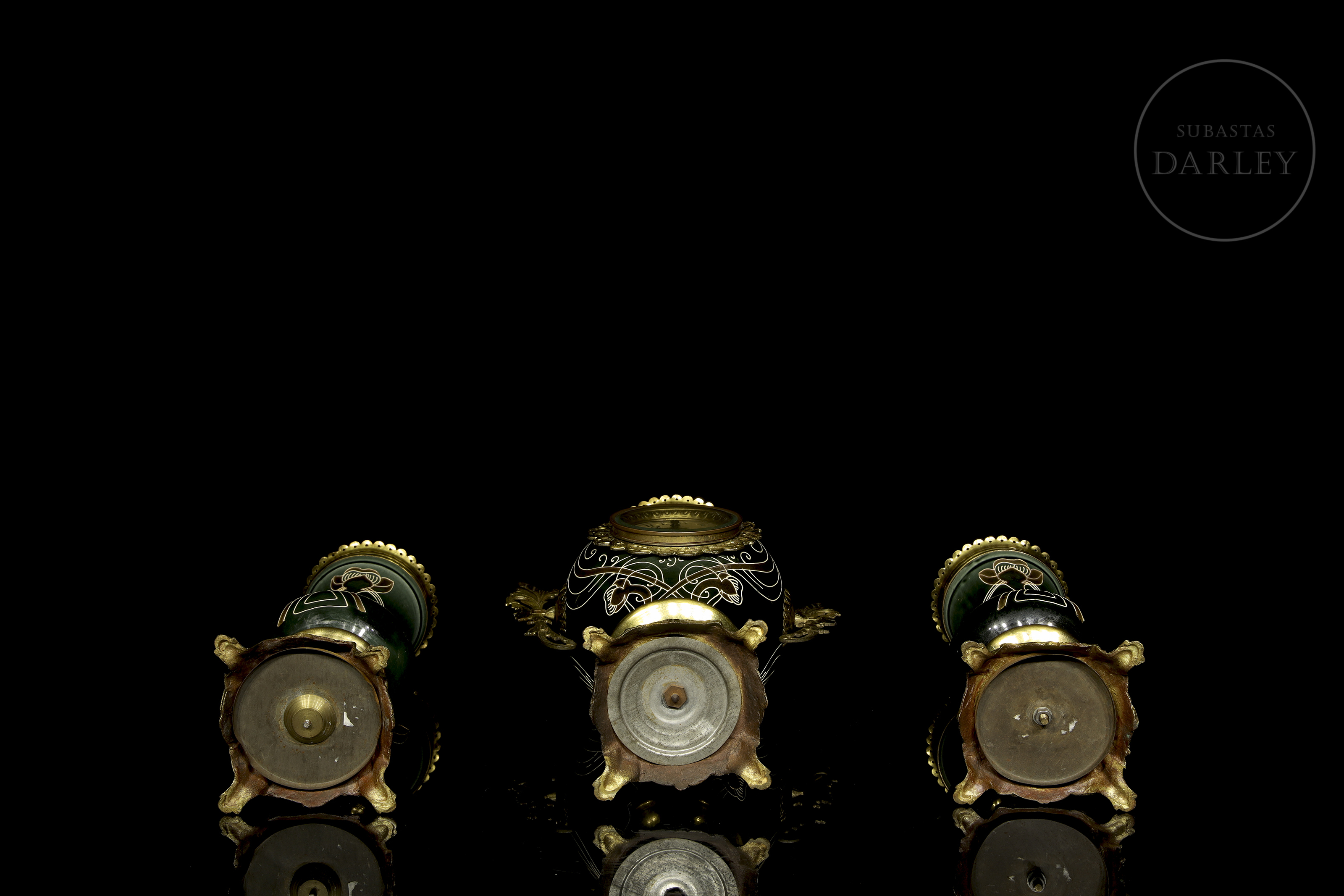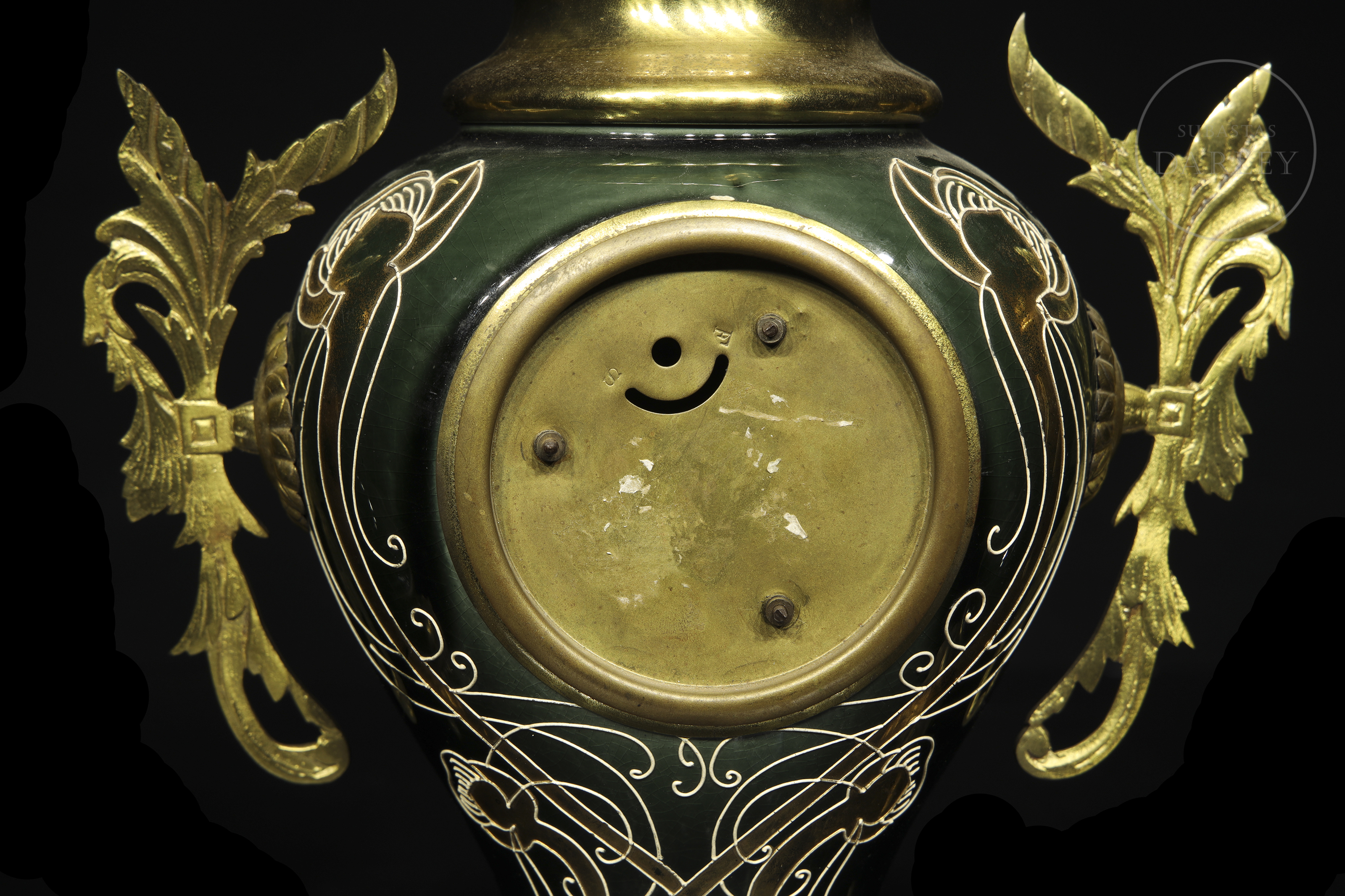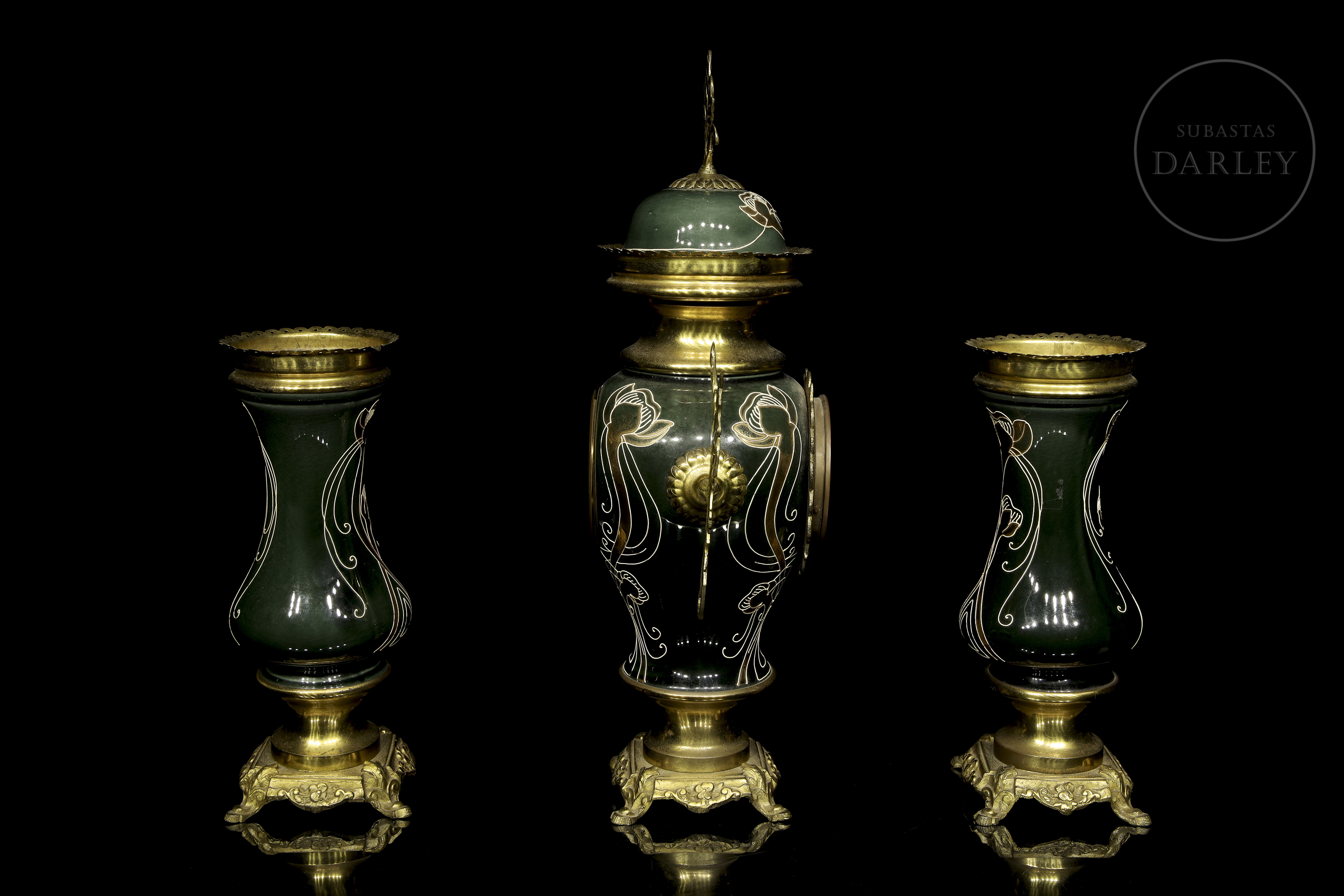 Table clock with two modernist style vases. Made of enamelled porcelain with handmade floral decorations and golden metal details.