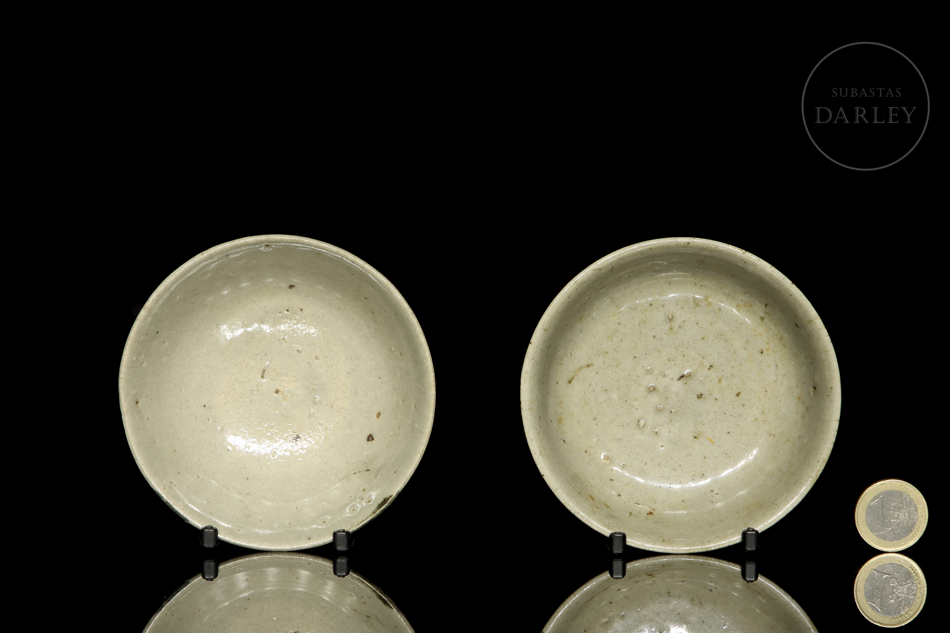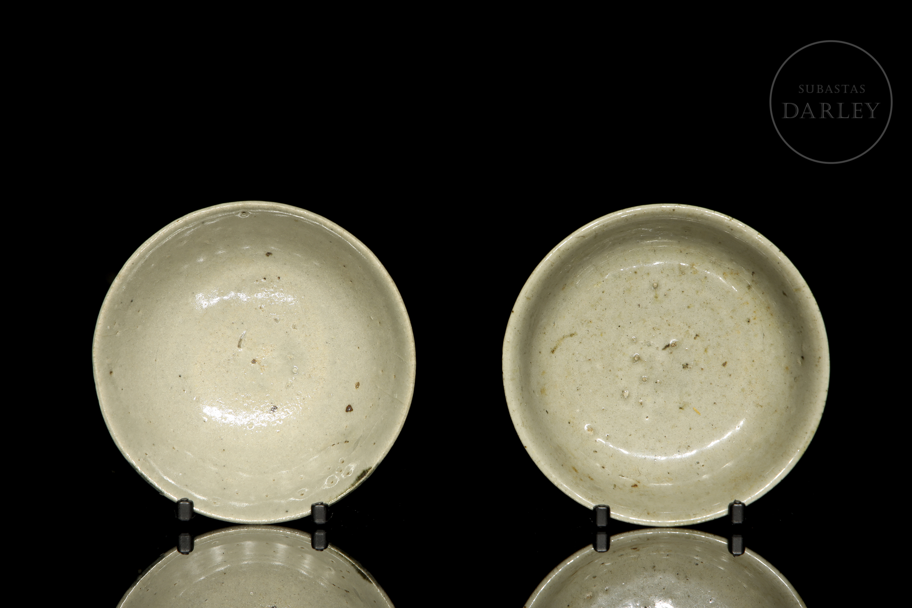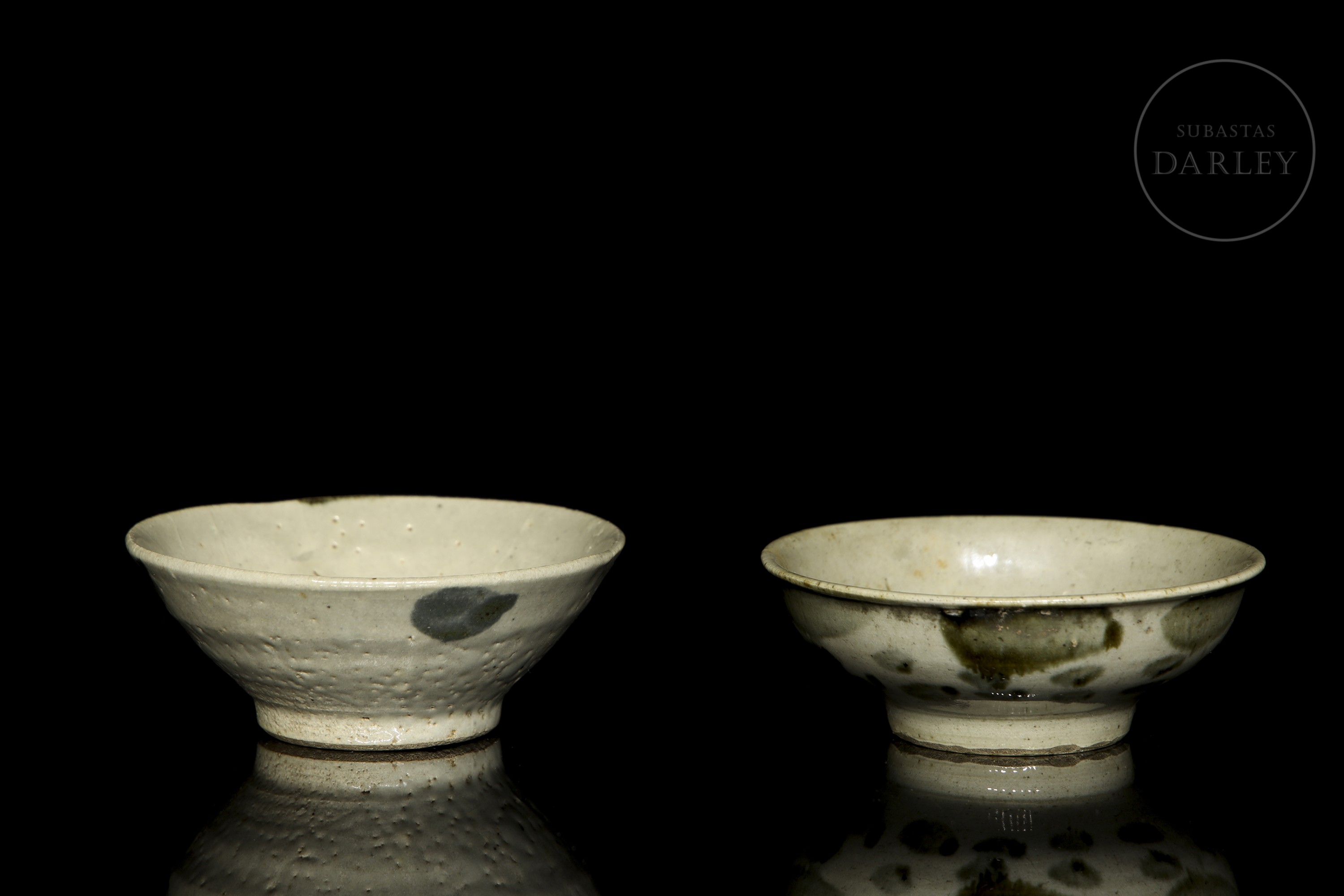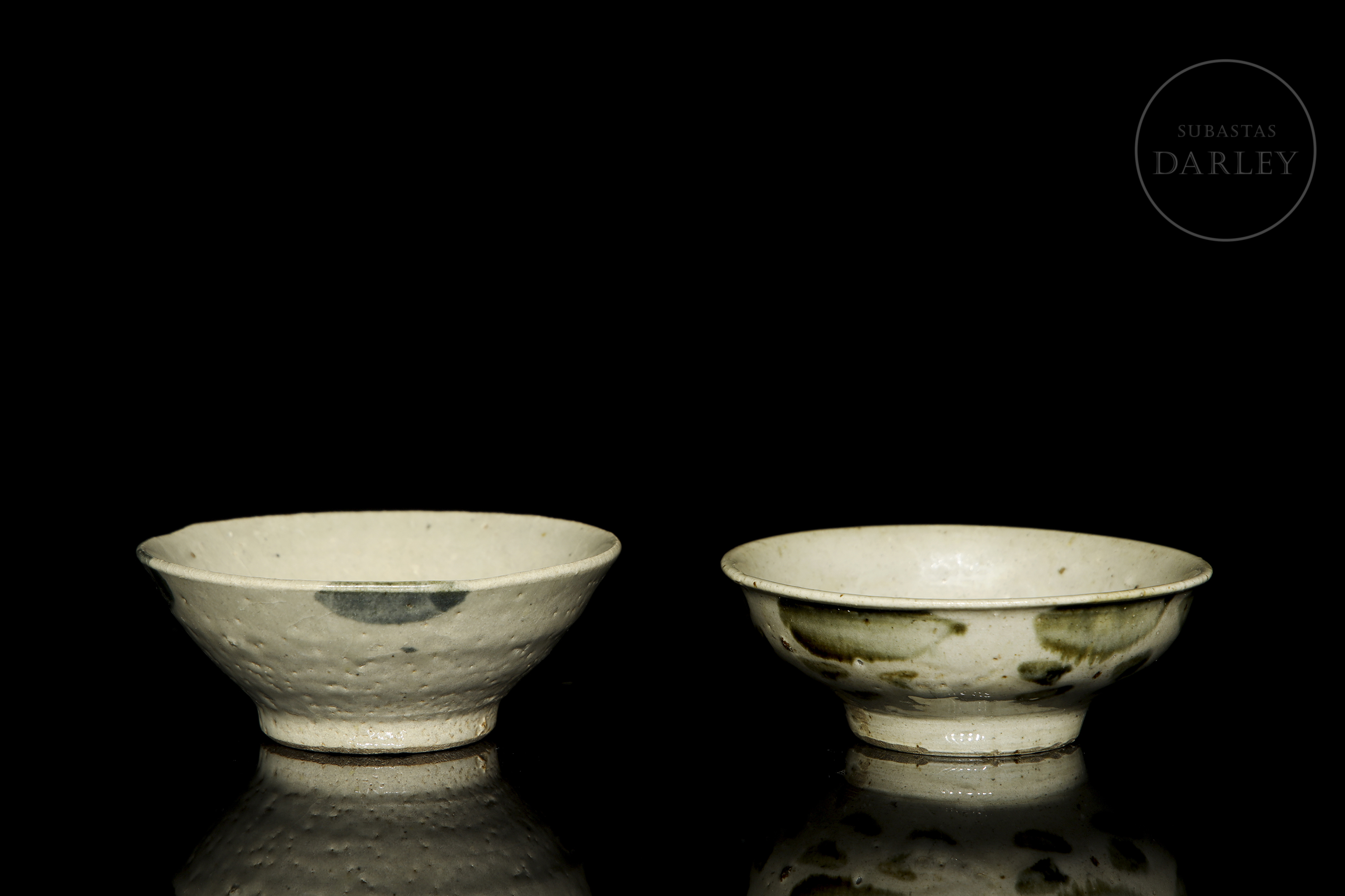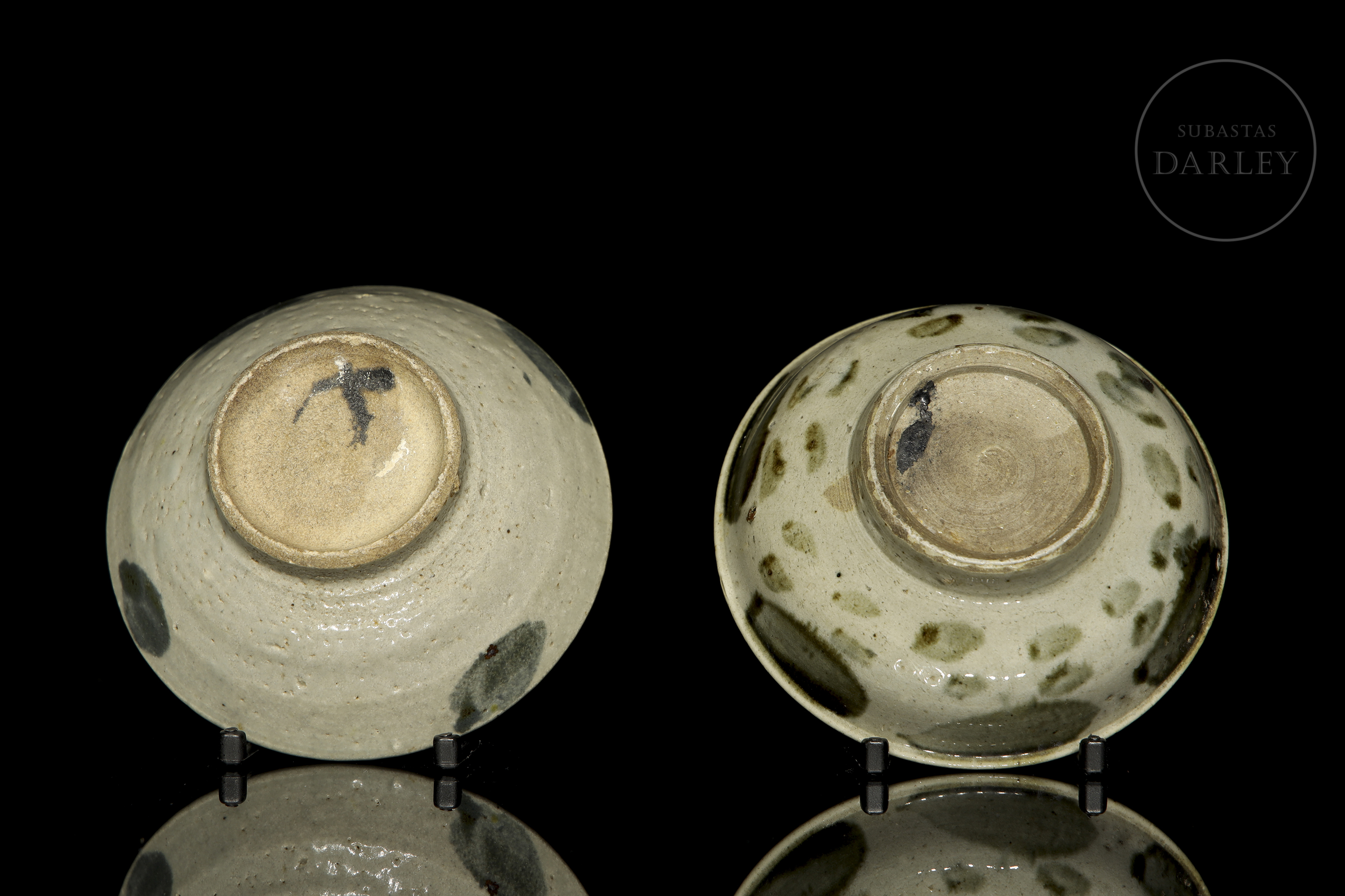 Glazed ceramics with underglaze decoration in white, olive green and blue. They are adorned with irregular coloured spots that form a composition. The base shows the unglazed ceramic. Qing dynasty (1644-1912).