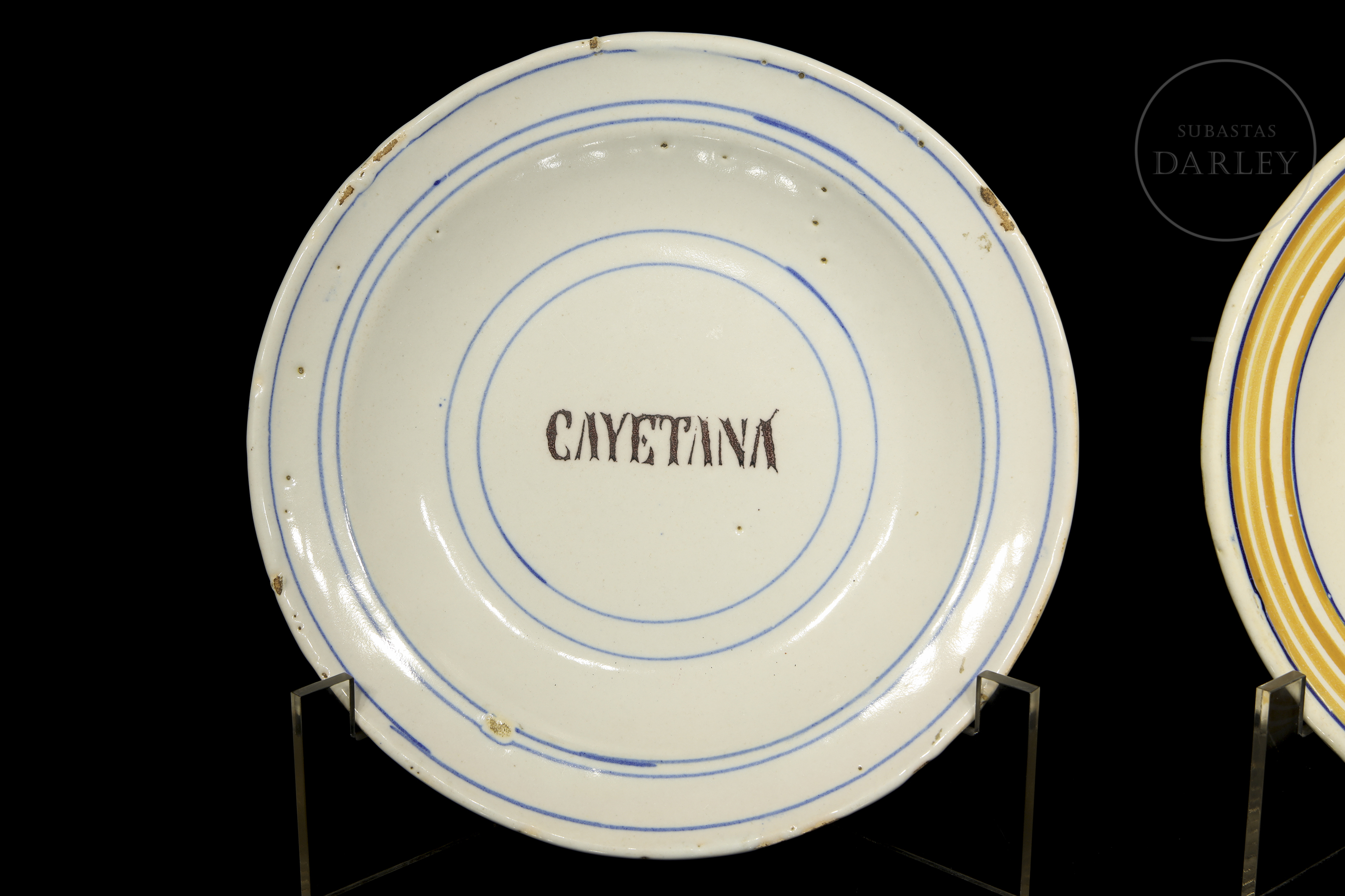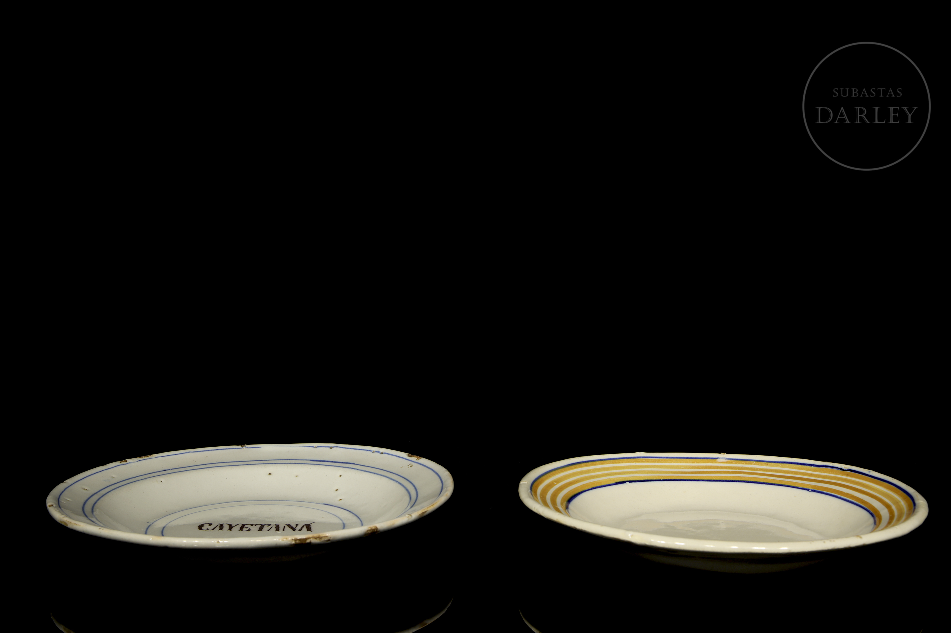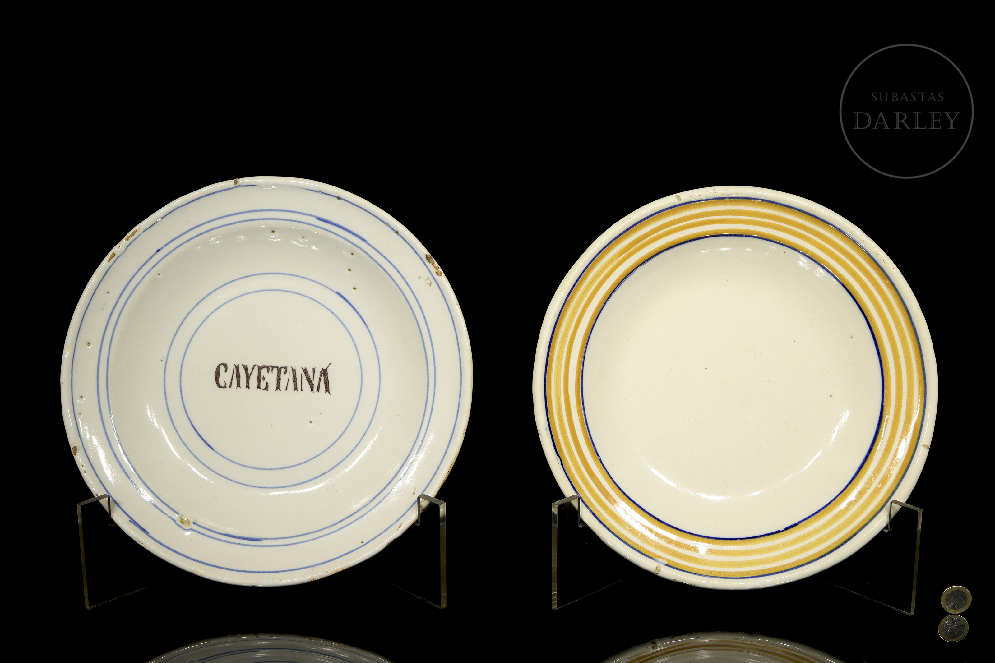 Glazed ceramic with coloured borders, one of them marked 'Cayetana'. One with a mark on the base.