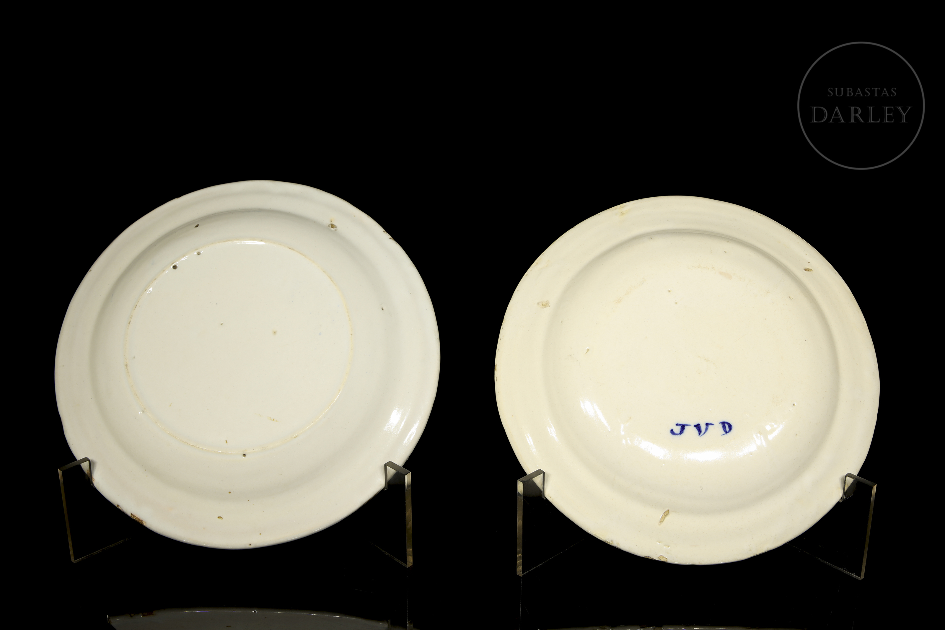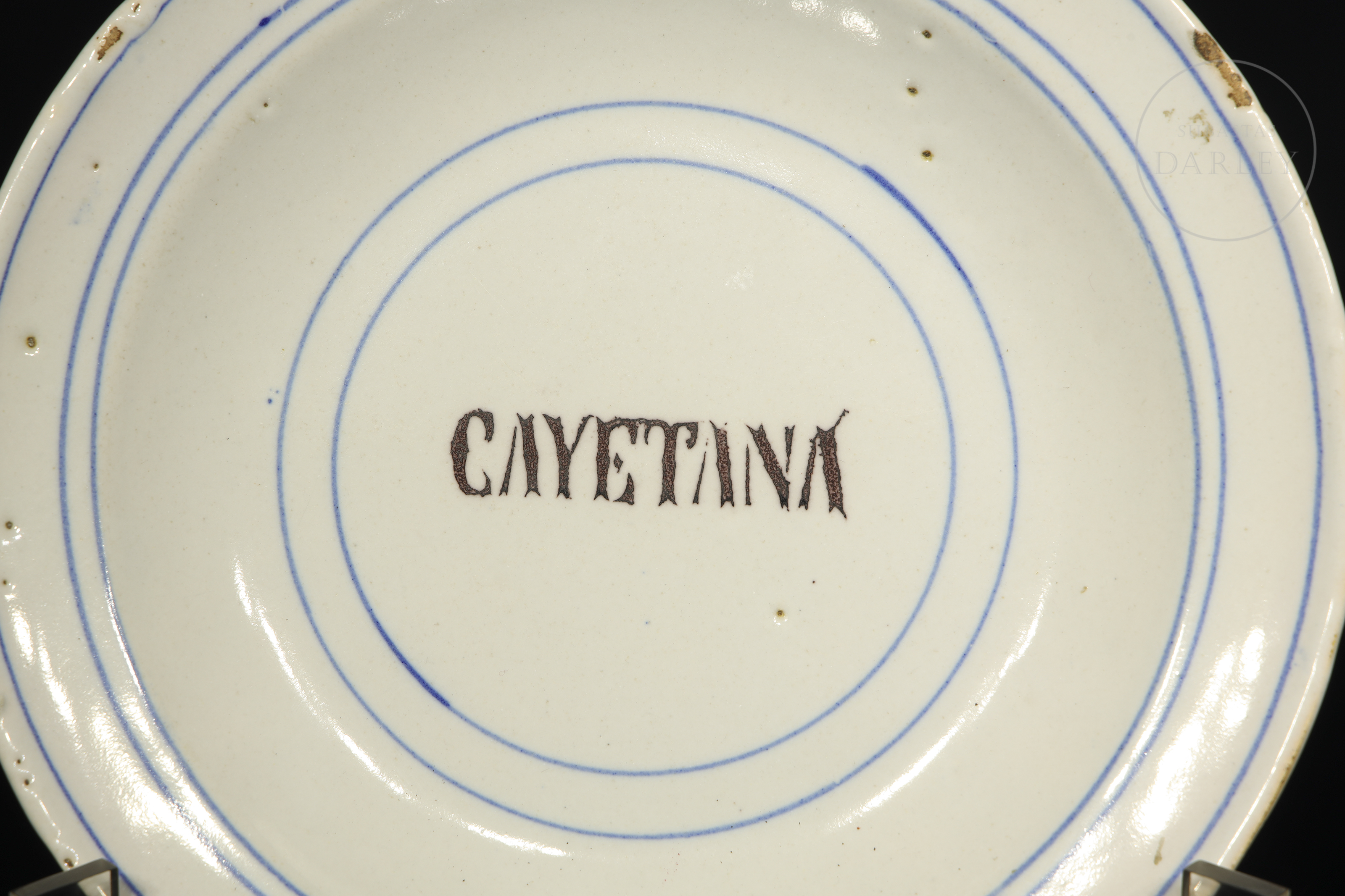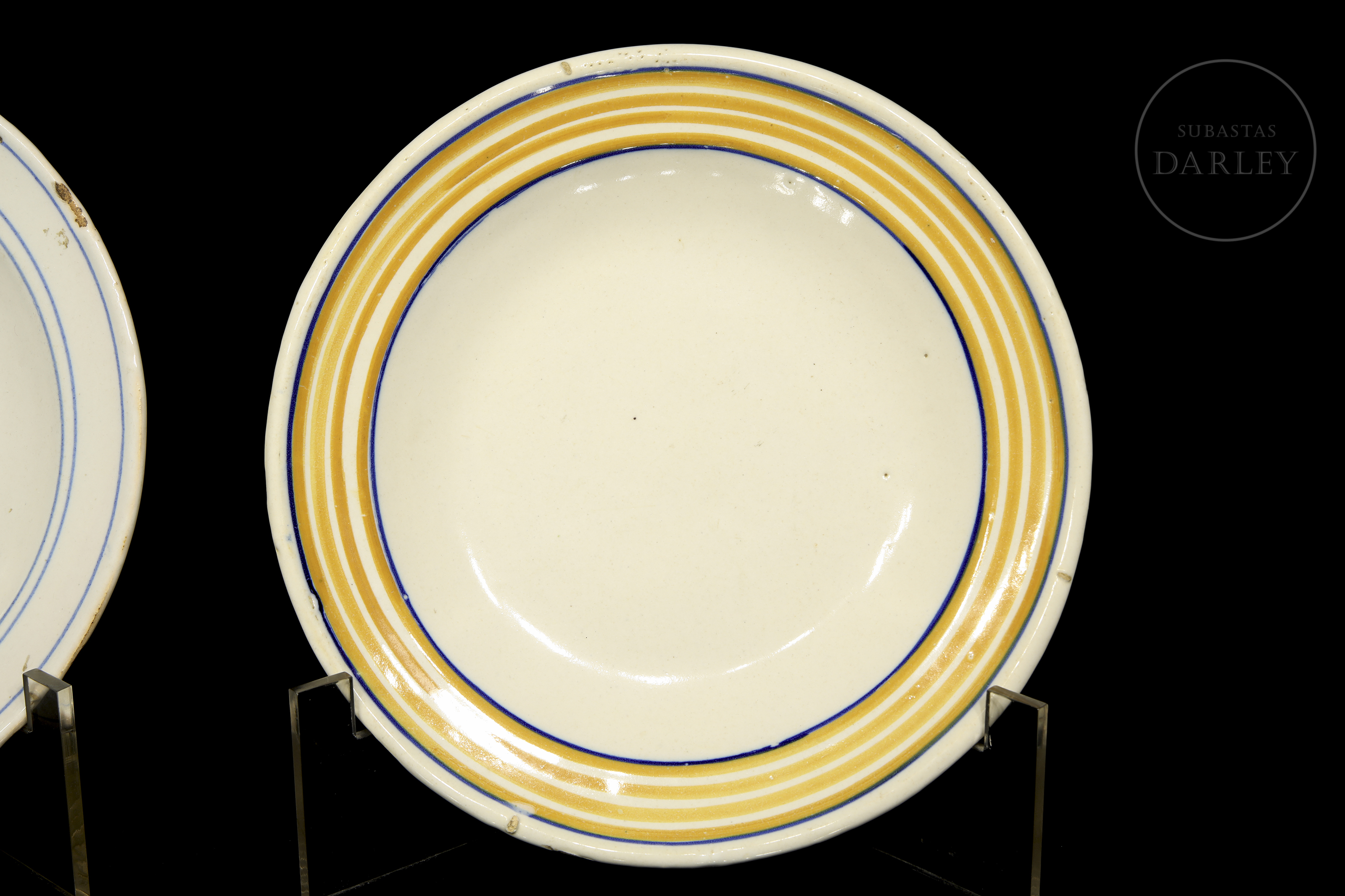 Glazed ceramic with coloured borders, one of them marked 'Cayetana'. One with a mark on the base.