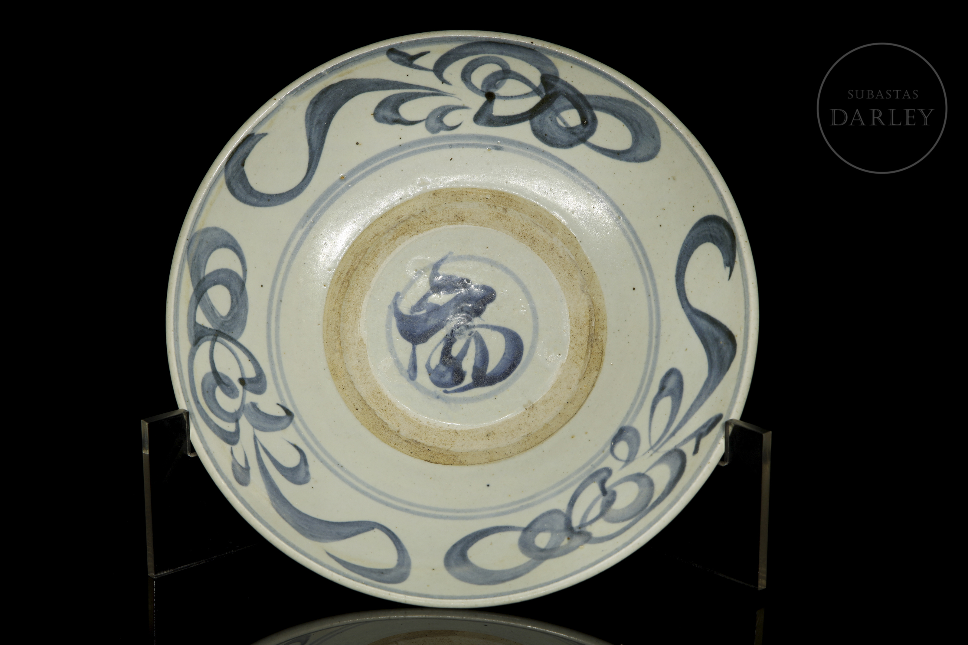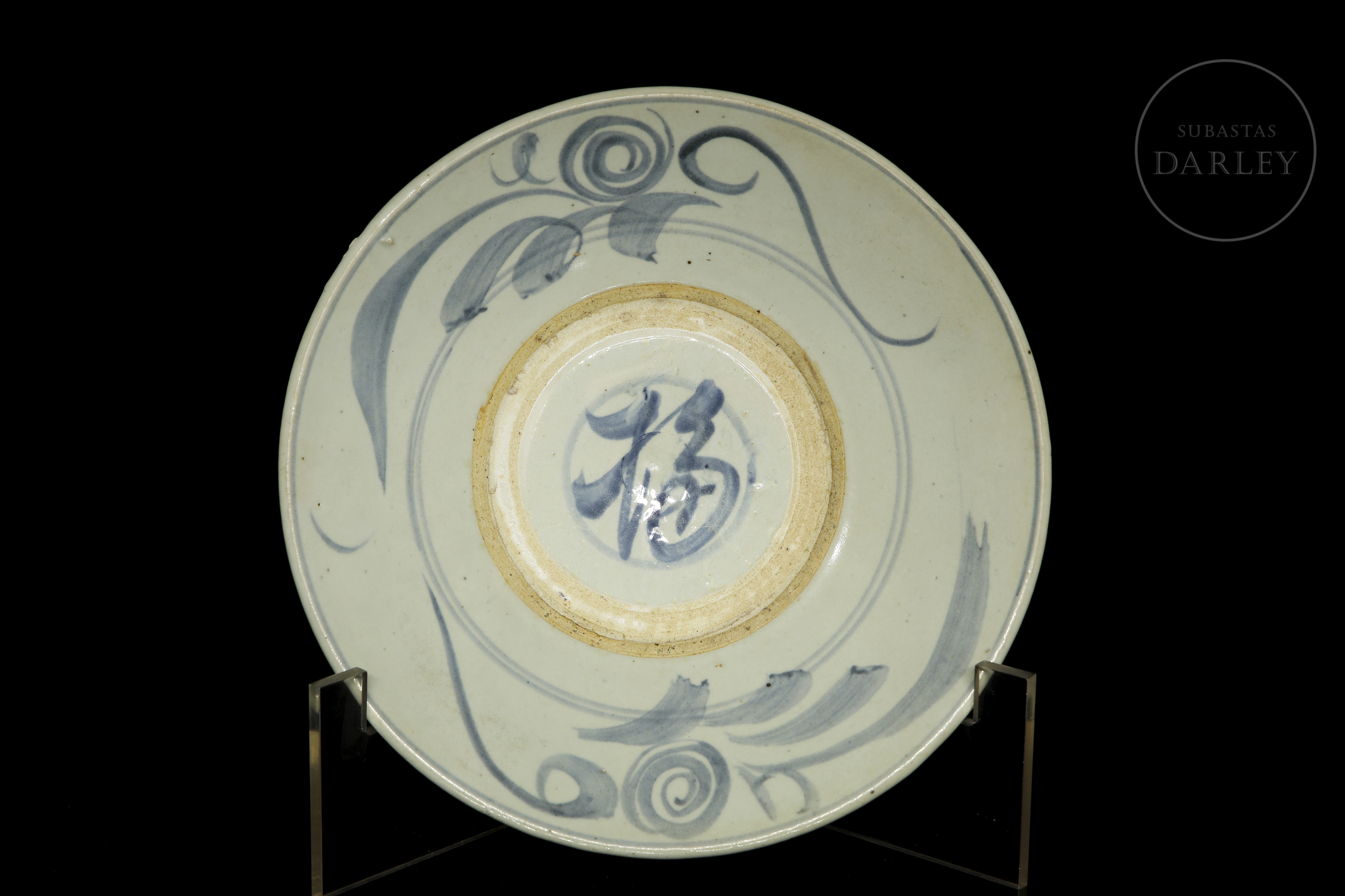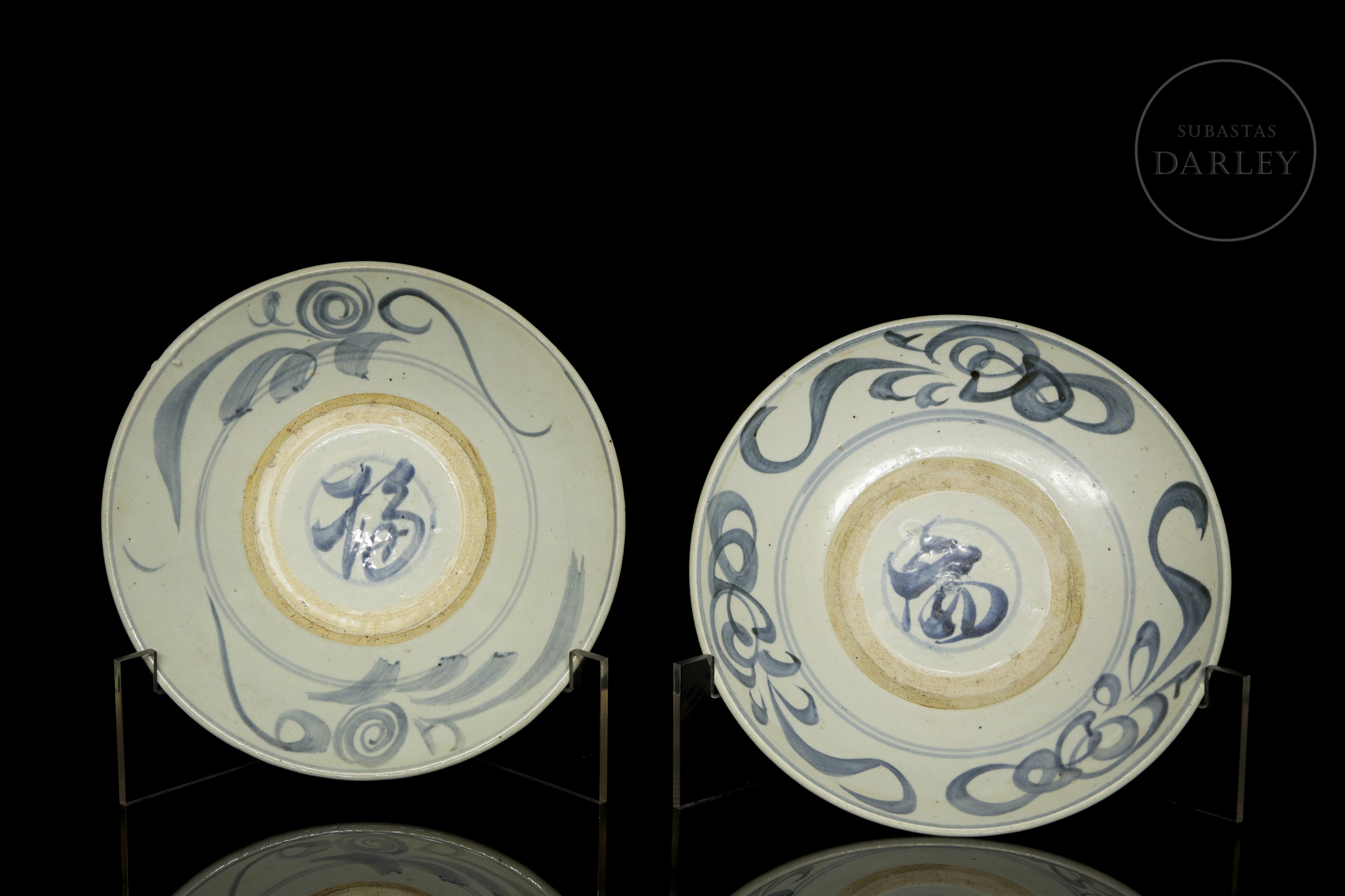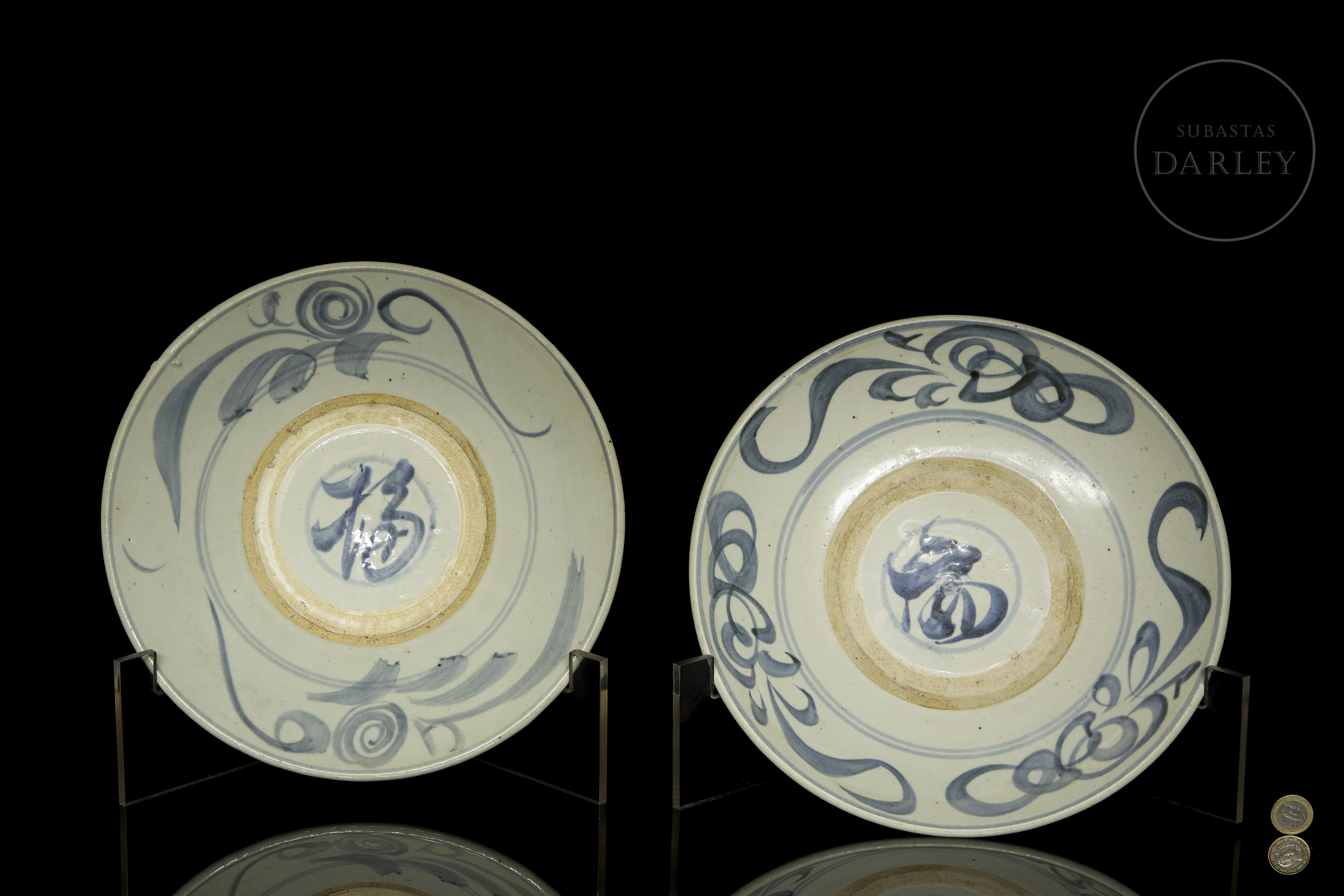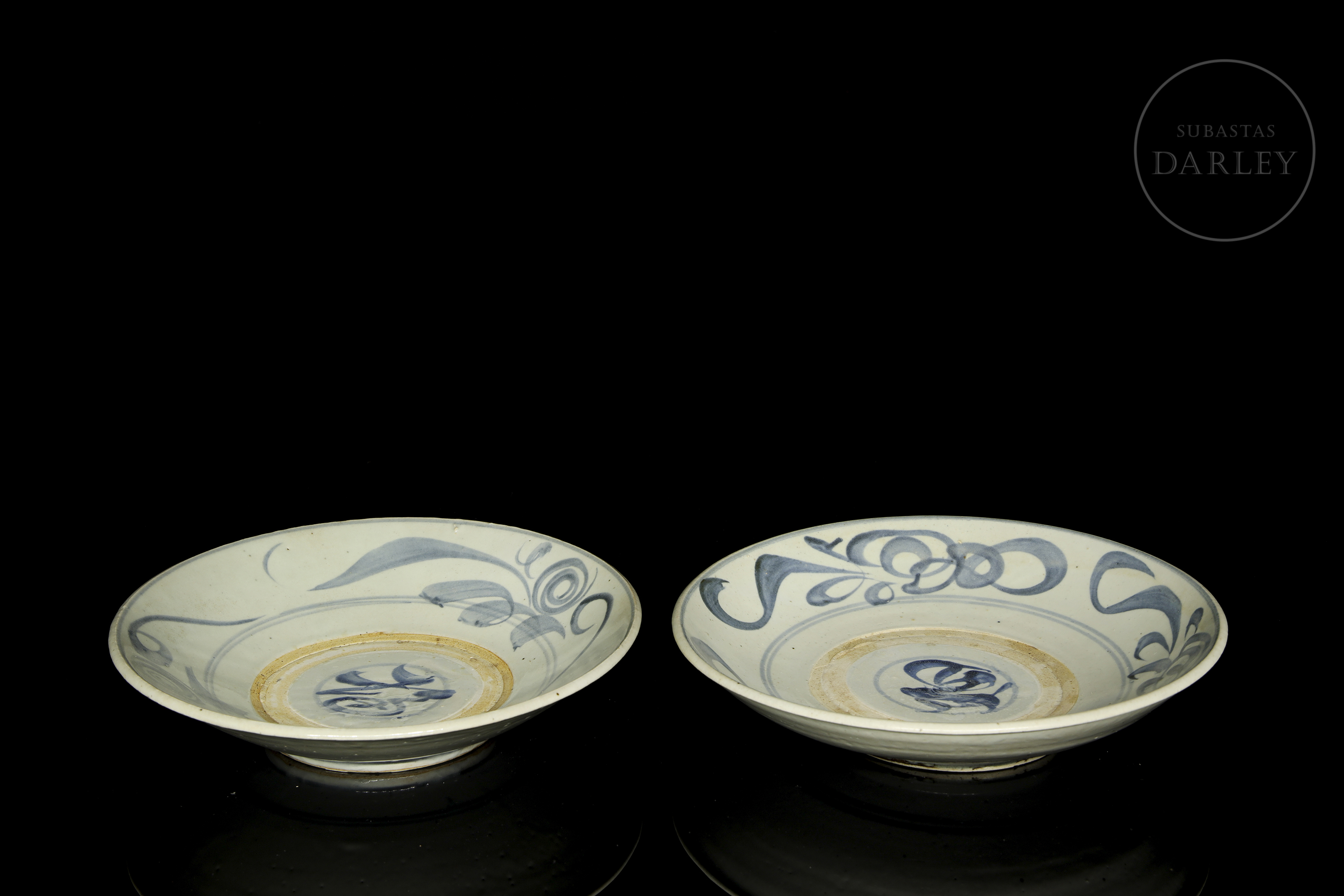 Pair of large glazed ceramic bowls with a white background and blue decorations. They have a circular body and slightly flared walls, resting on a small ring foot. They are decorated with a stylised line motif. The base features a double circle in blue. Ming dynasty (1368-1644).
