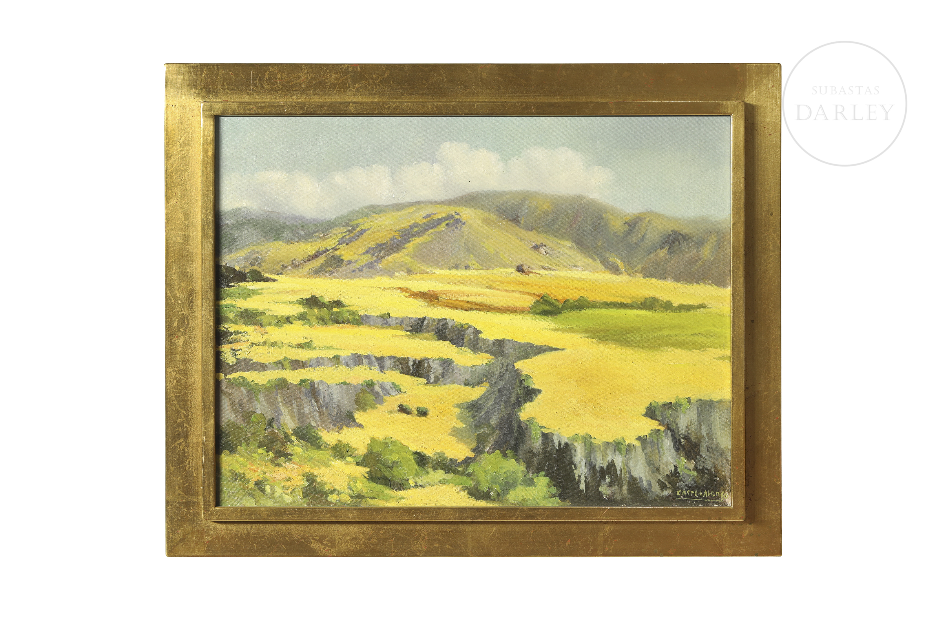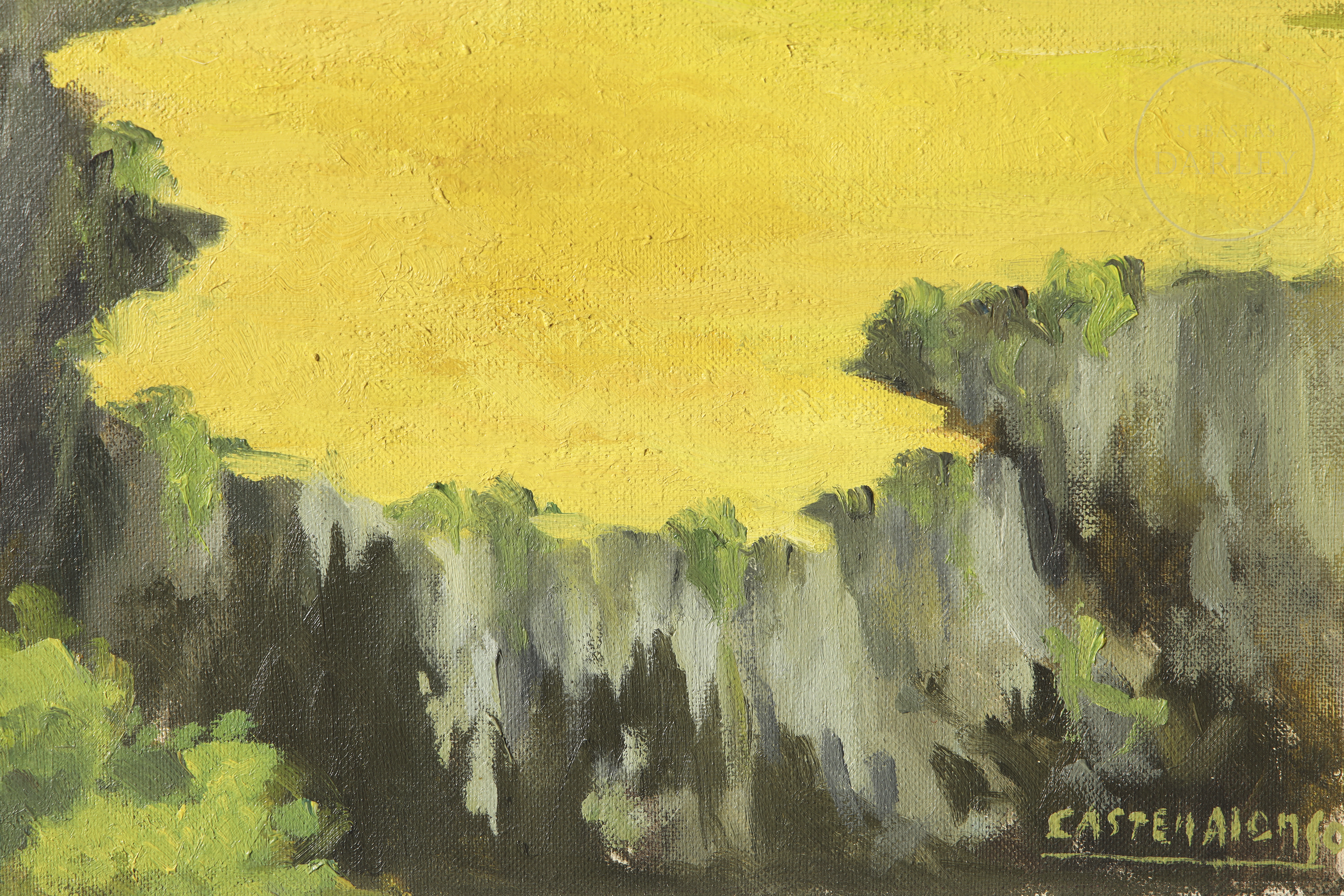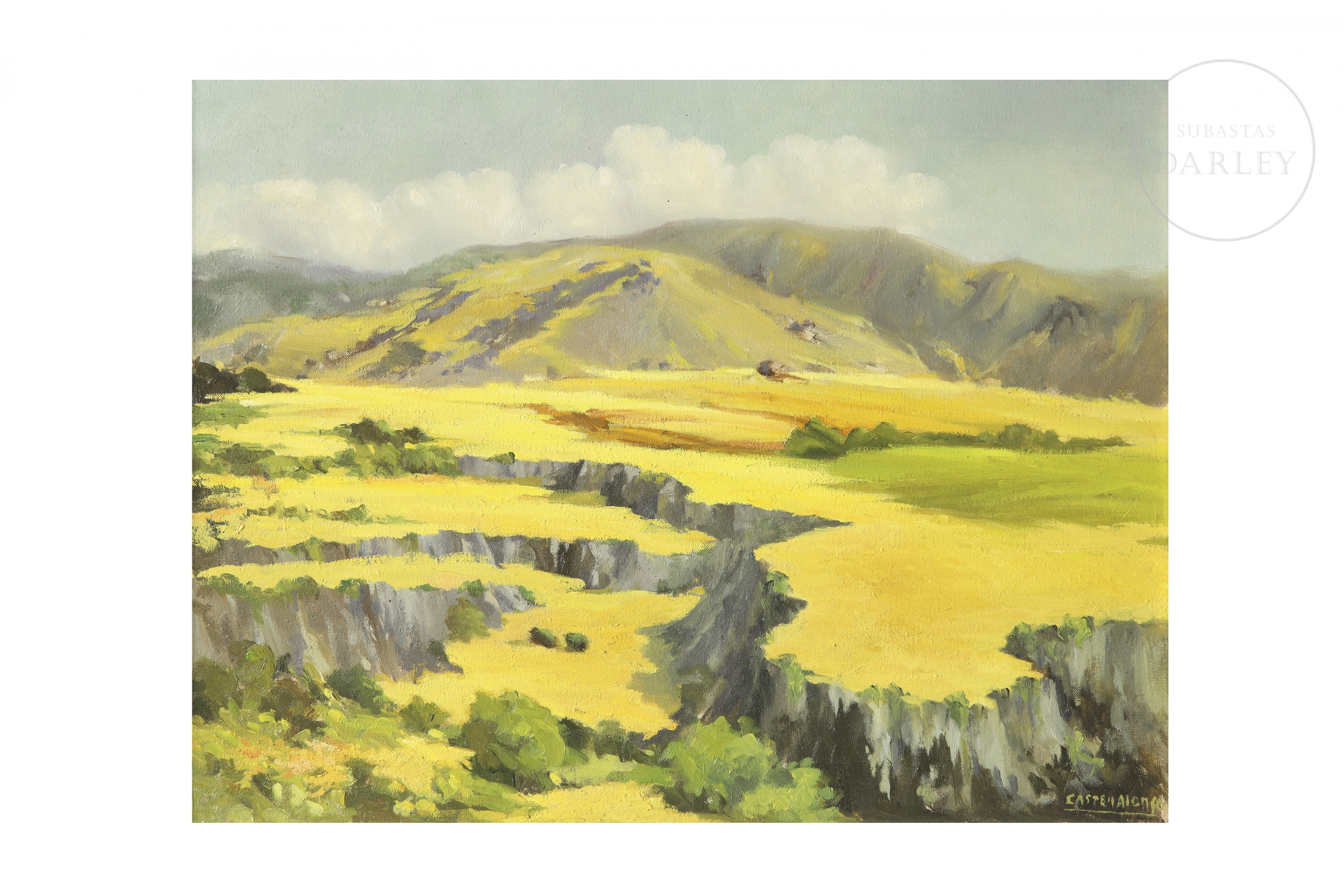 Oil on canvas. Mountain landscape with a hill in shades of yellow, painted with loose, impasto brushstrokes. Signed ‘Castell Alonso’ in the lower right corner.