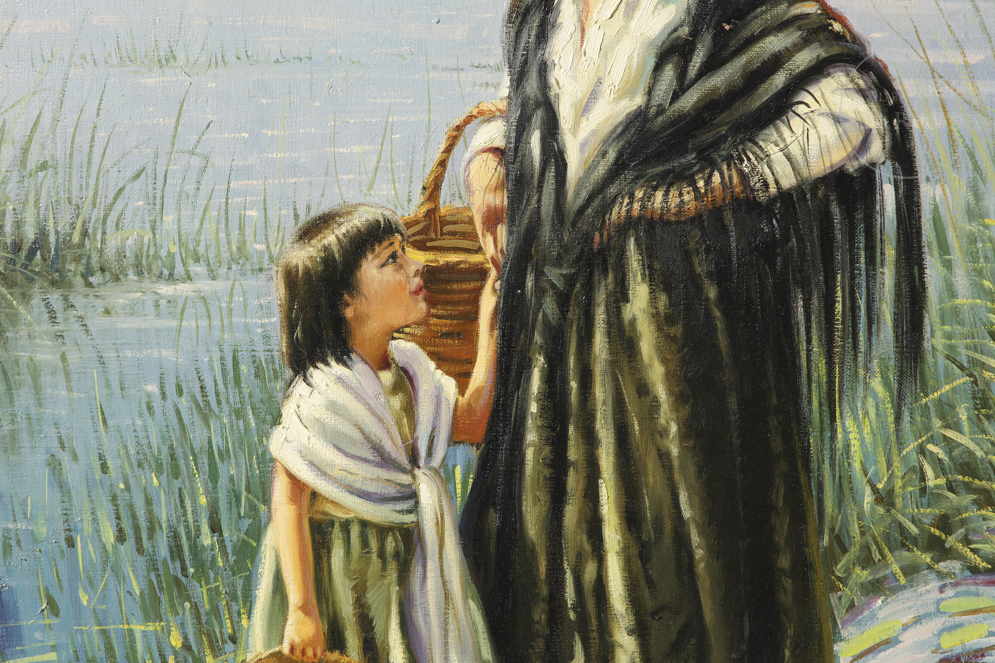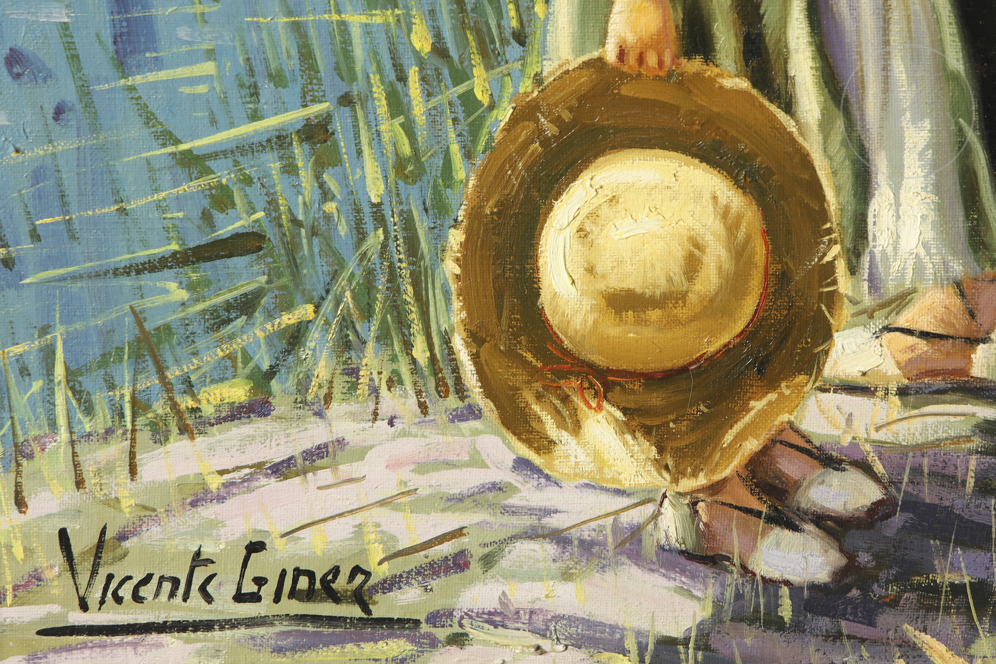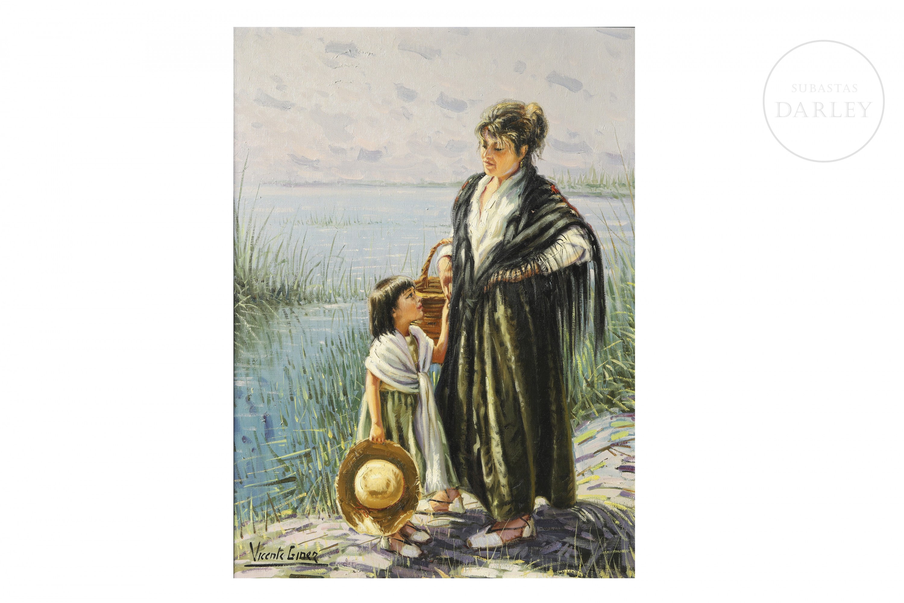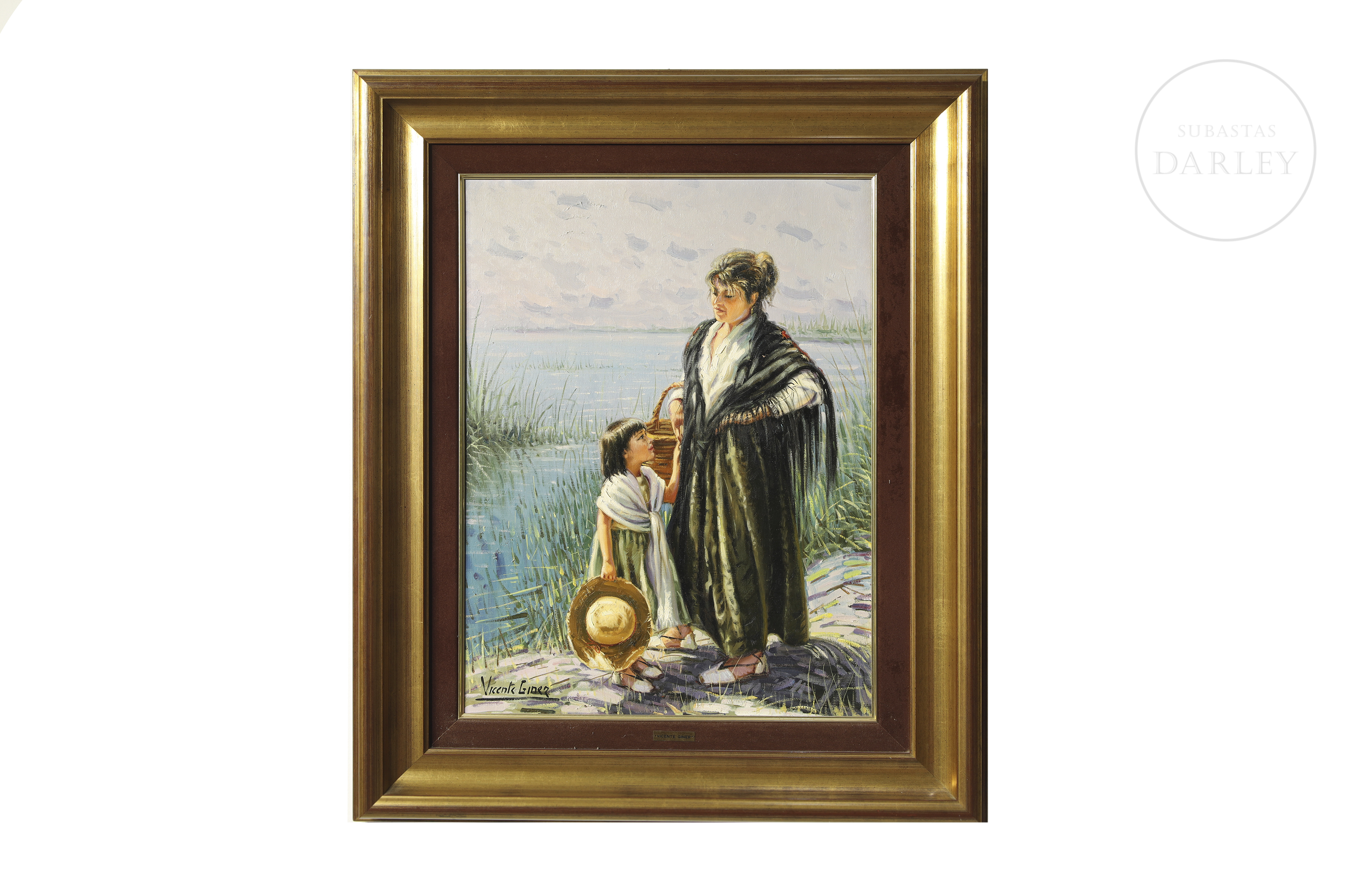 Oil on canvas. A traditional scene depicting a mother wearing a shawl and a girl wearing a straw hat by the water at Albufera. Signed ‘Vicente Giner’ in the lower right corner.