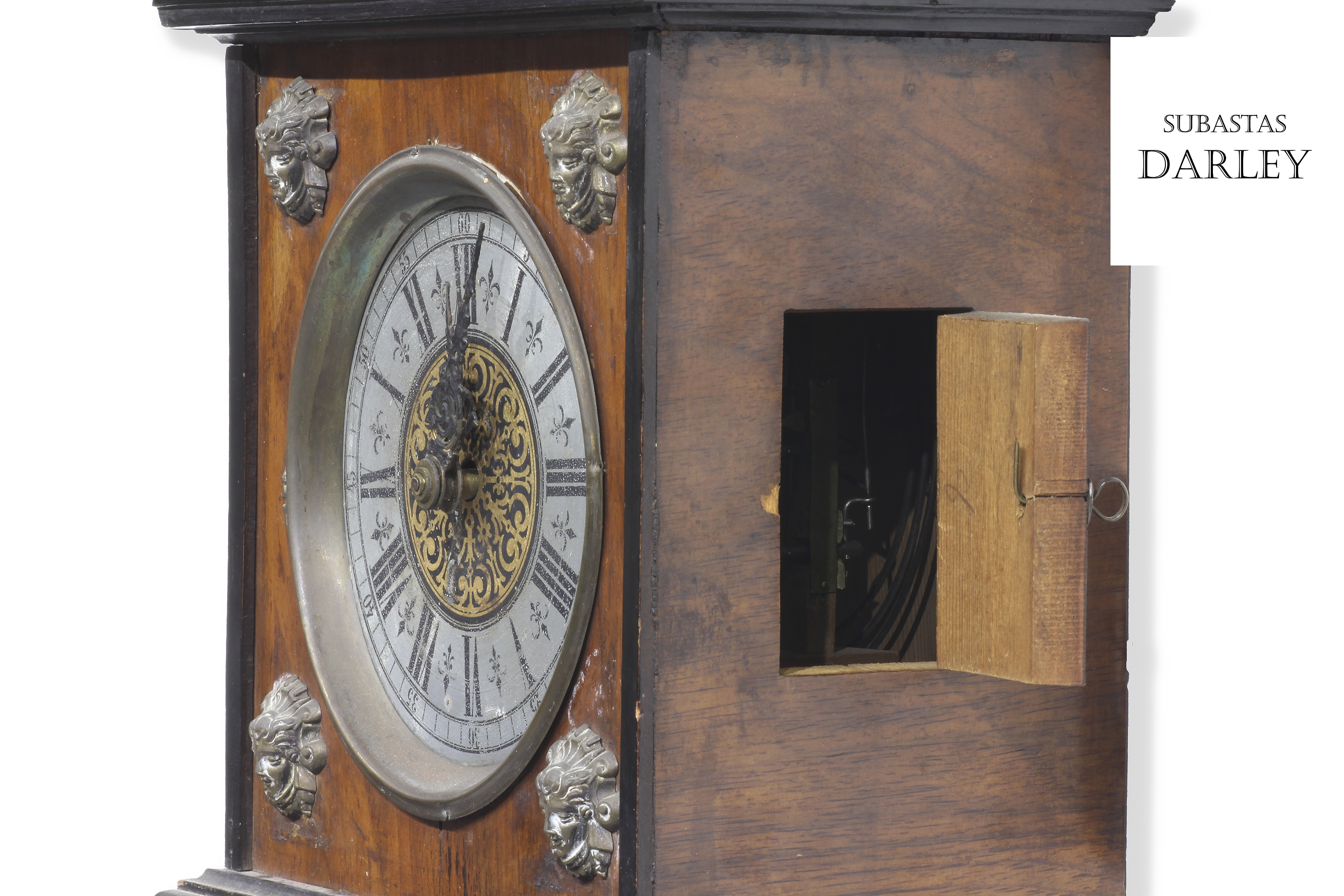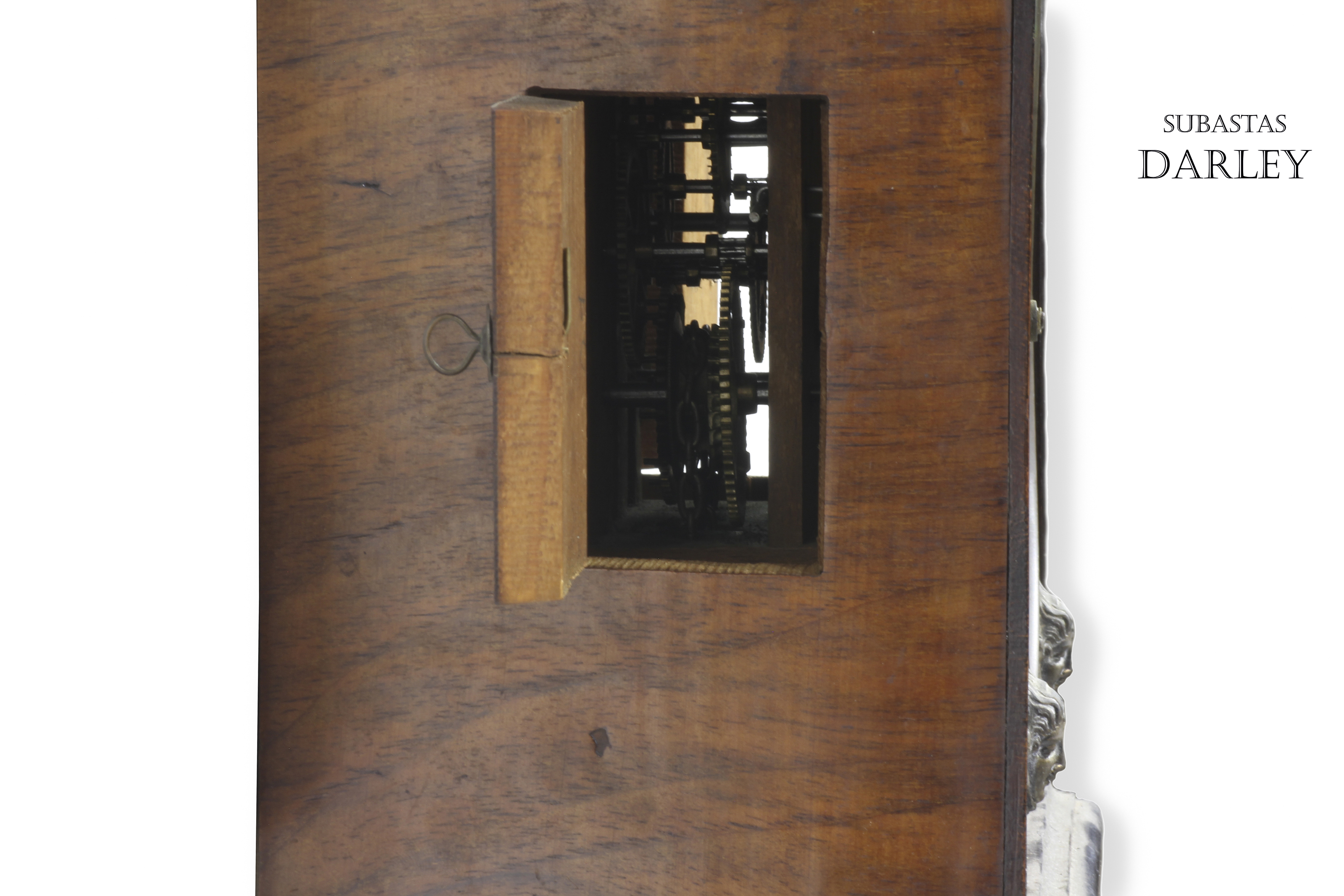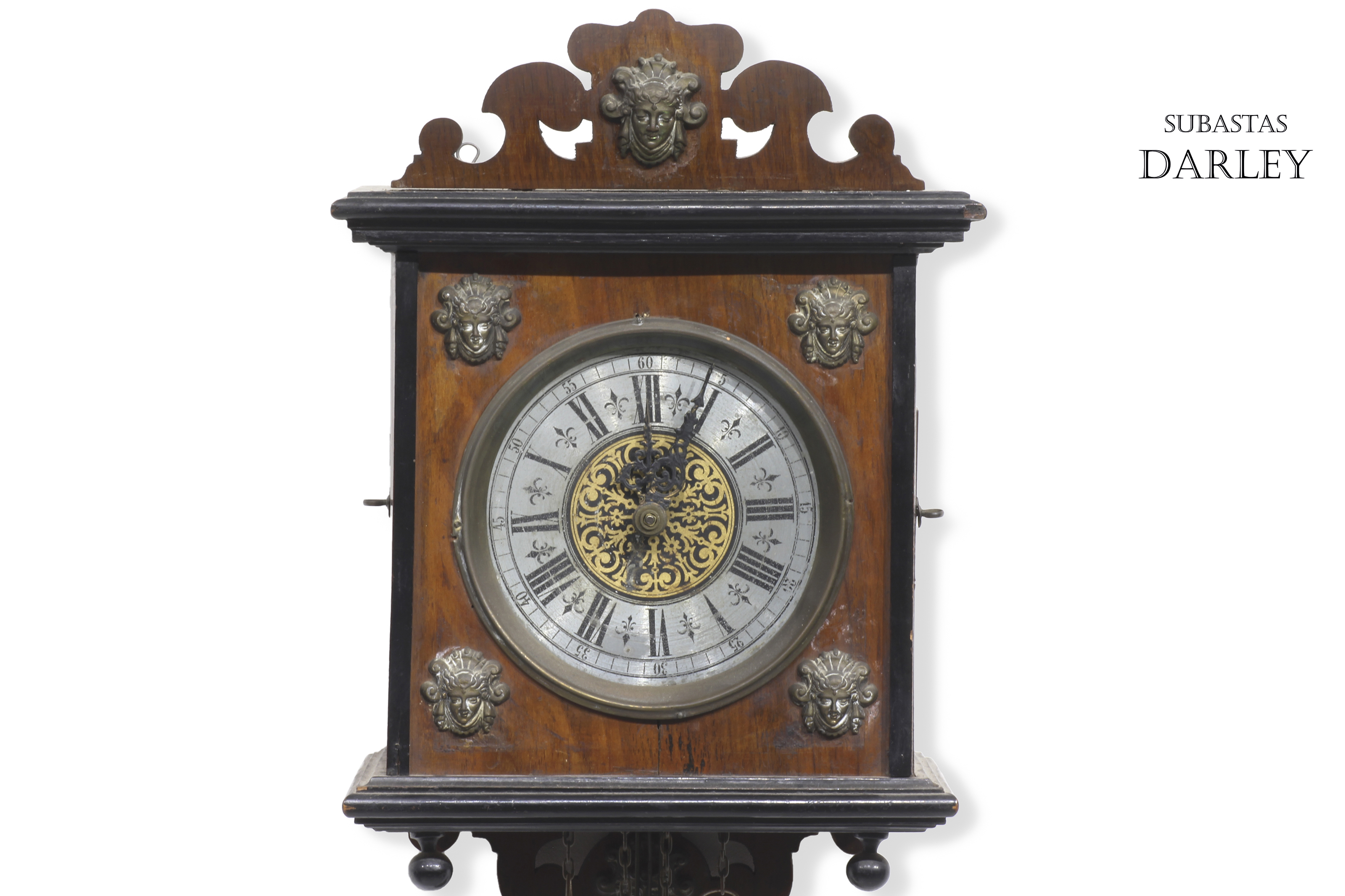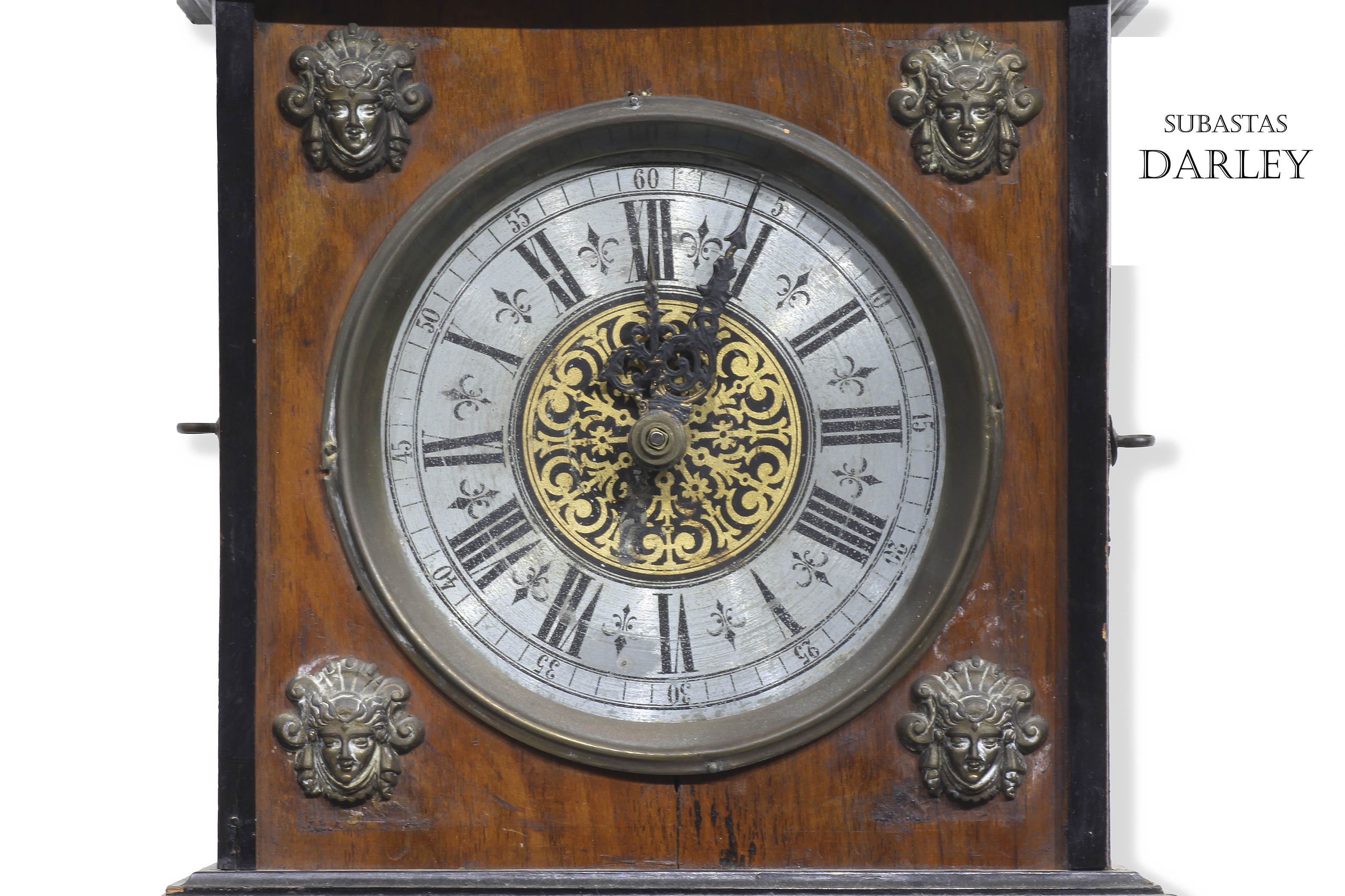 Clock in mahogany case, ebonized moldings and bronze masks inlaid on the front and the top, which is cut profile. The dial shows Latin numerals and is made of polychrome metal. Both hands are shown and inside a "Musterschutz" mechanism with illegible reference number, that was indicated on a label on the back. It shows wear and the mechanism needs adjustment.