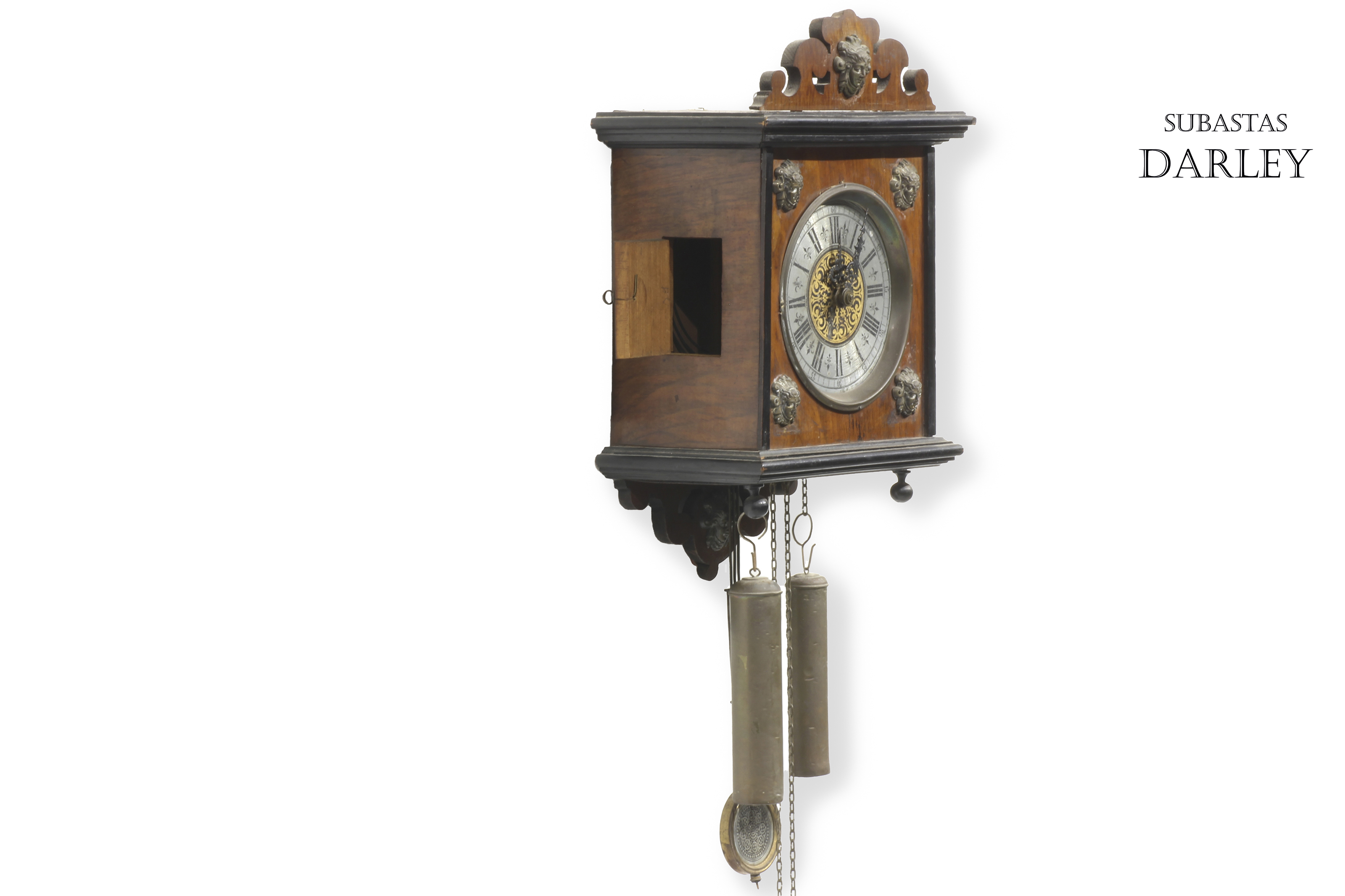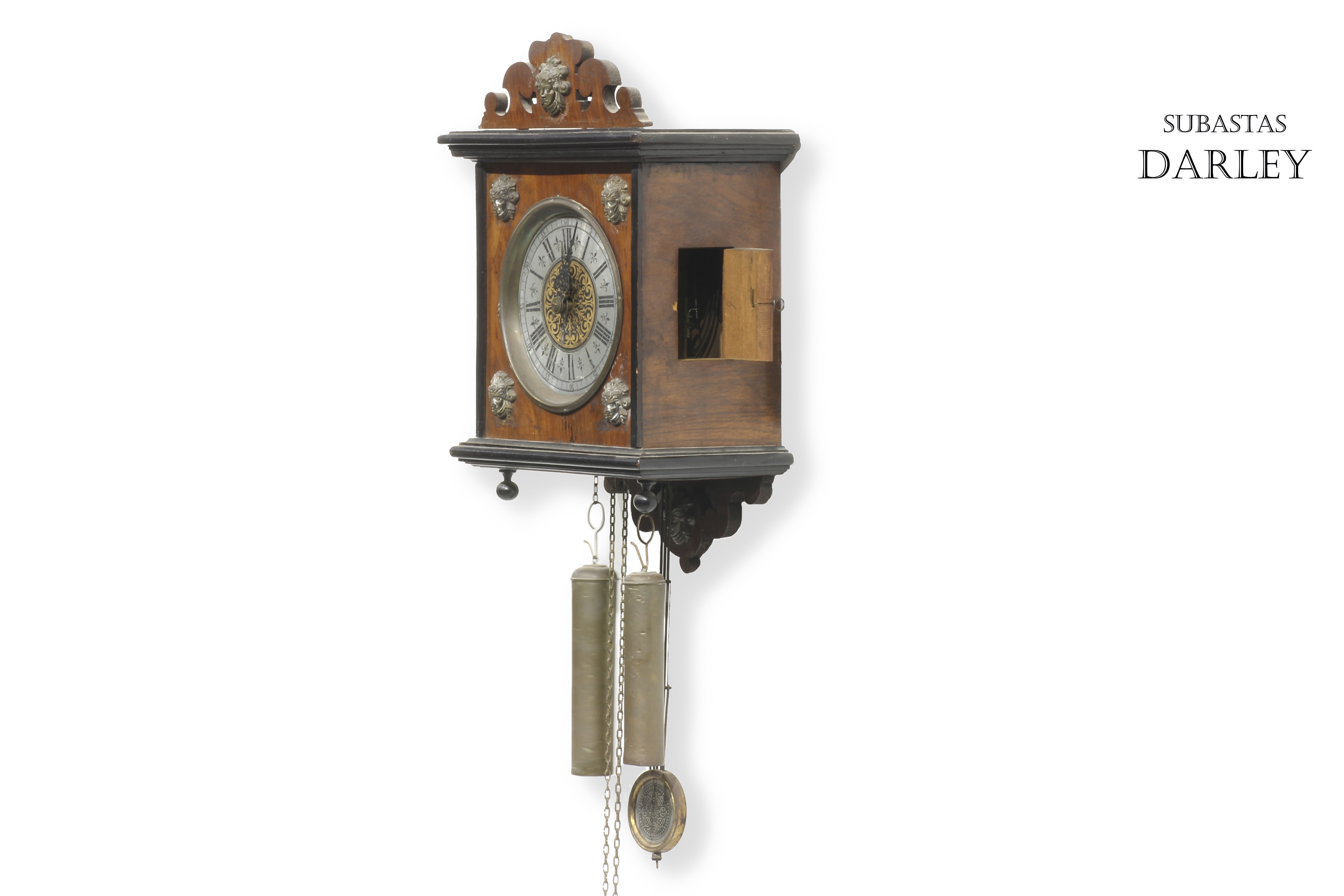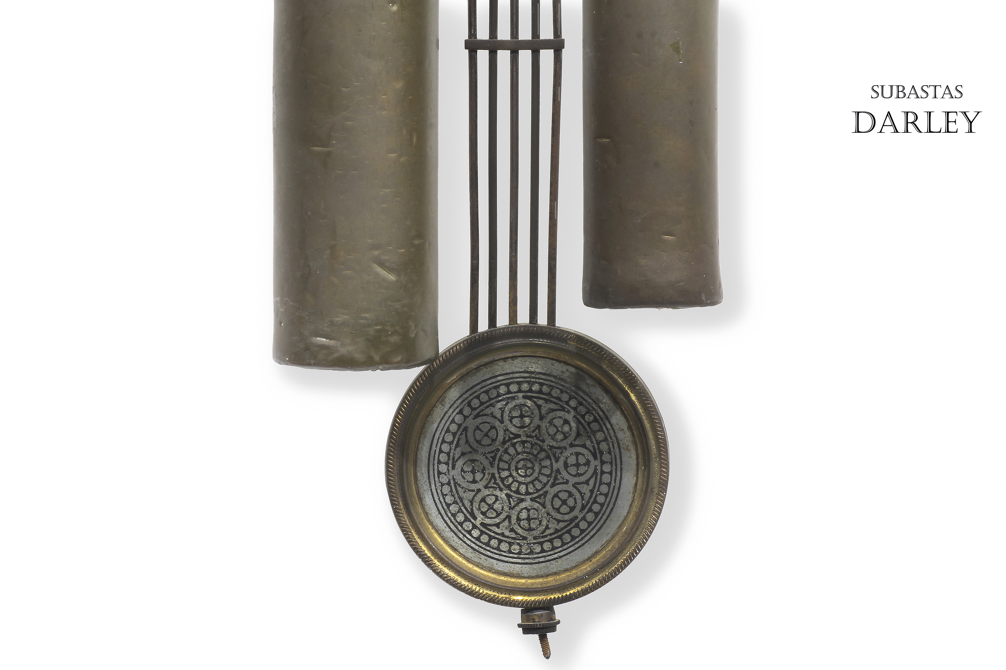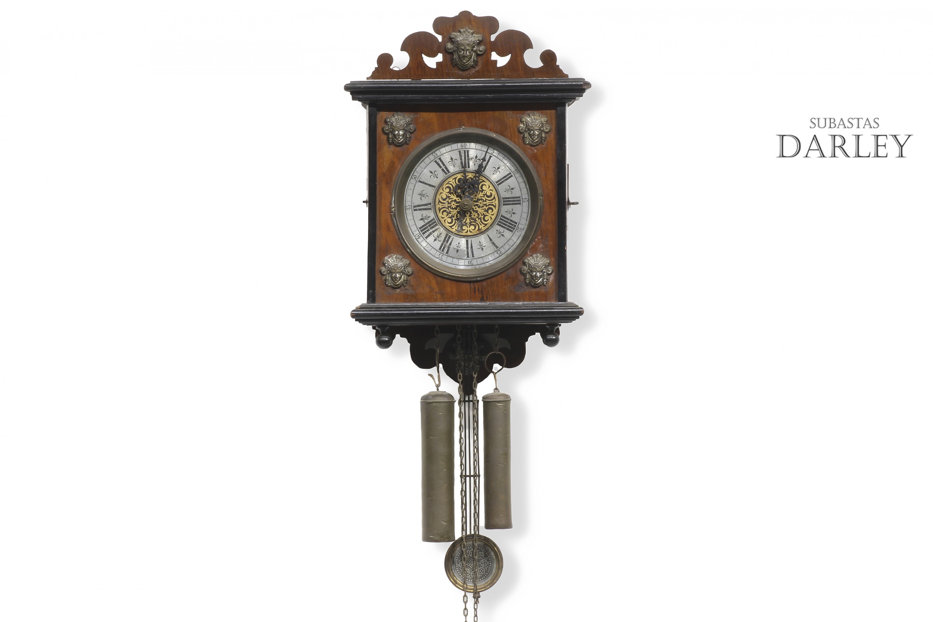 Clock in mahogany case, ebonized moldings and bronze masks inlaid on the front and the top, which is cut profile. The dial shows Latin numerals and is made of polychrome metal. Both hands are shown and inside a "Musterschutz" mechanism with illegible reference number, that was indicated on a label on the back. It shows wear and the mechanism needs adjustment.