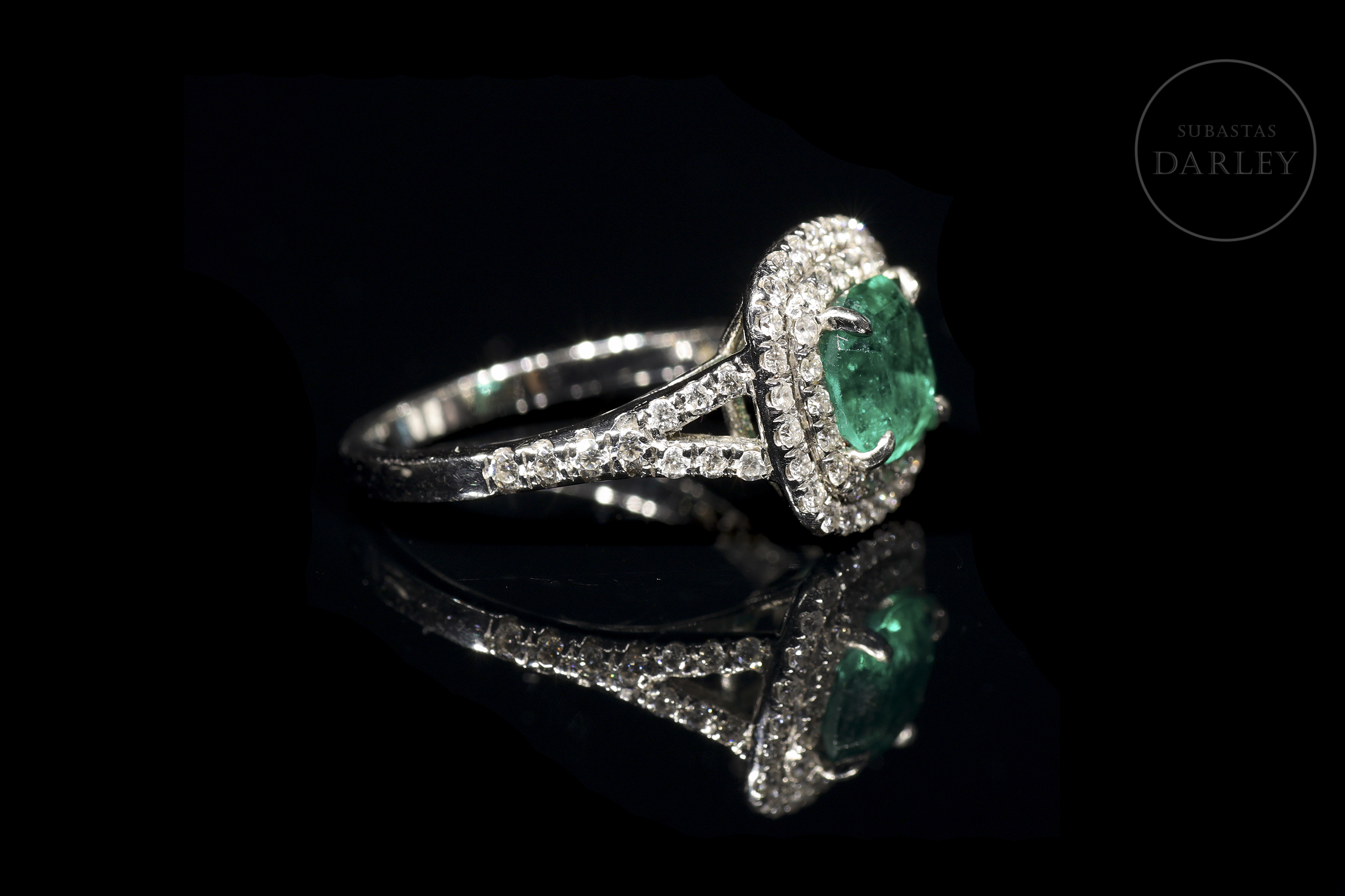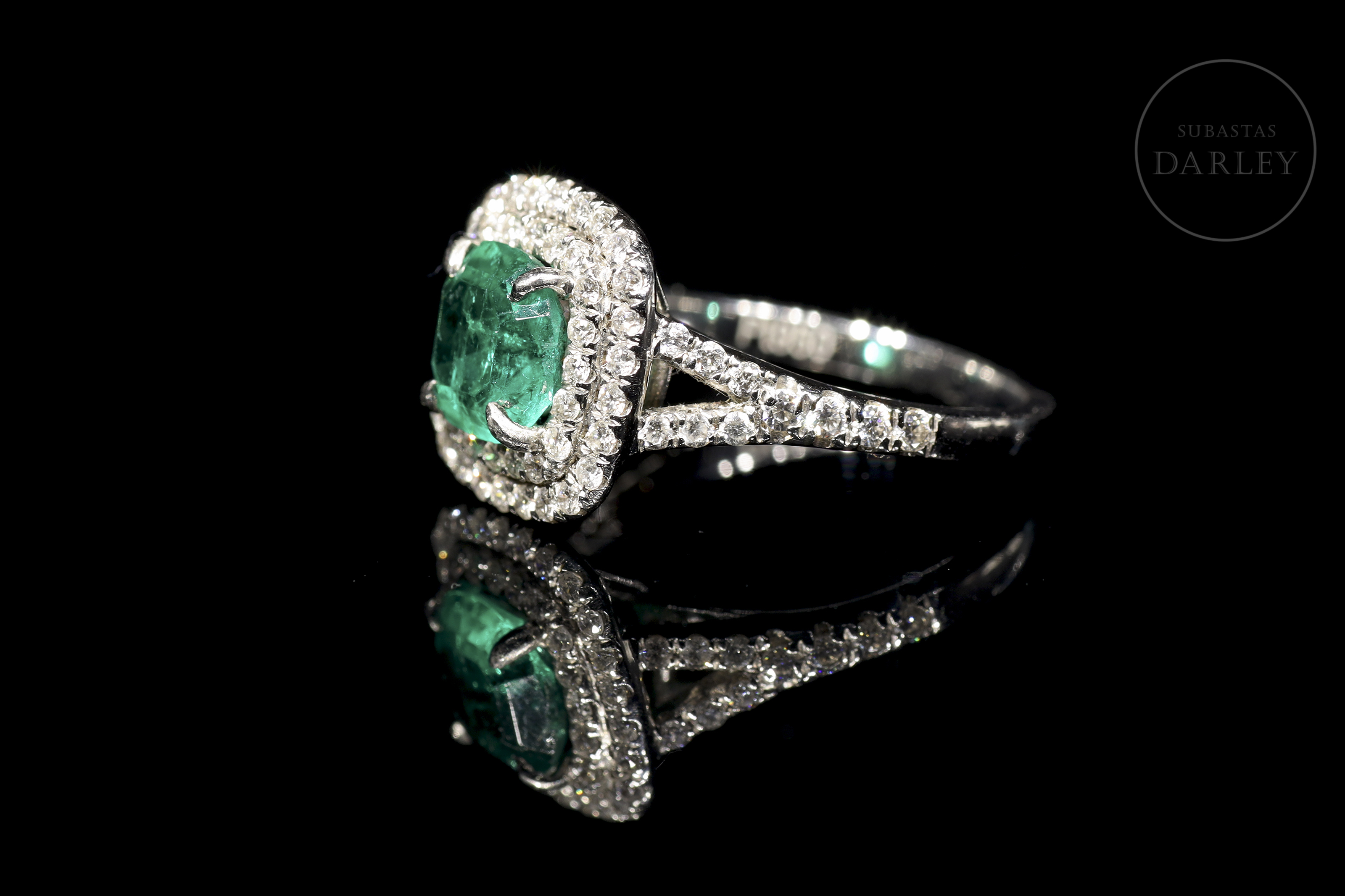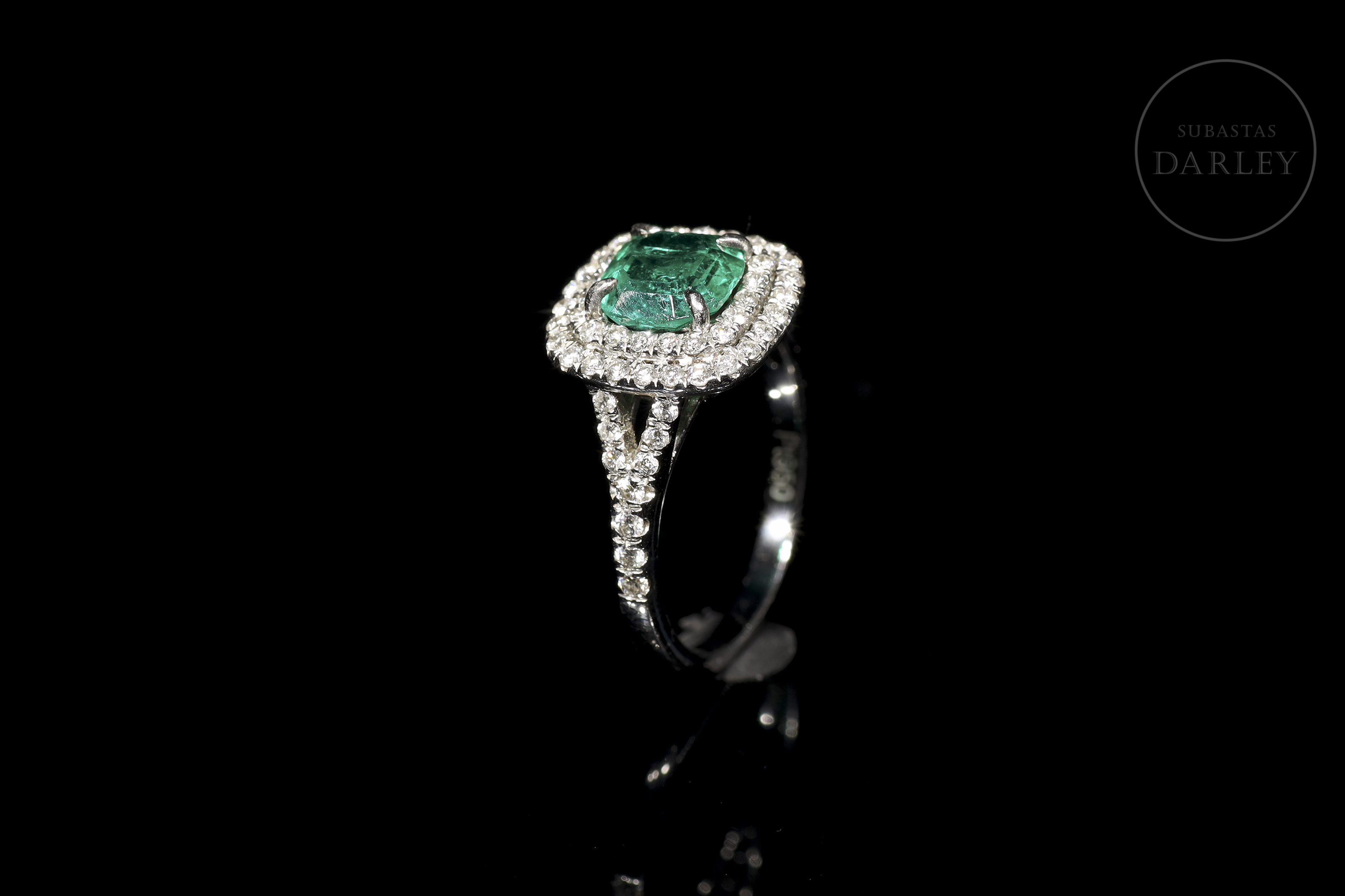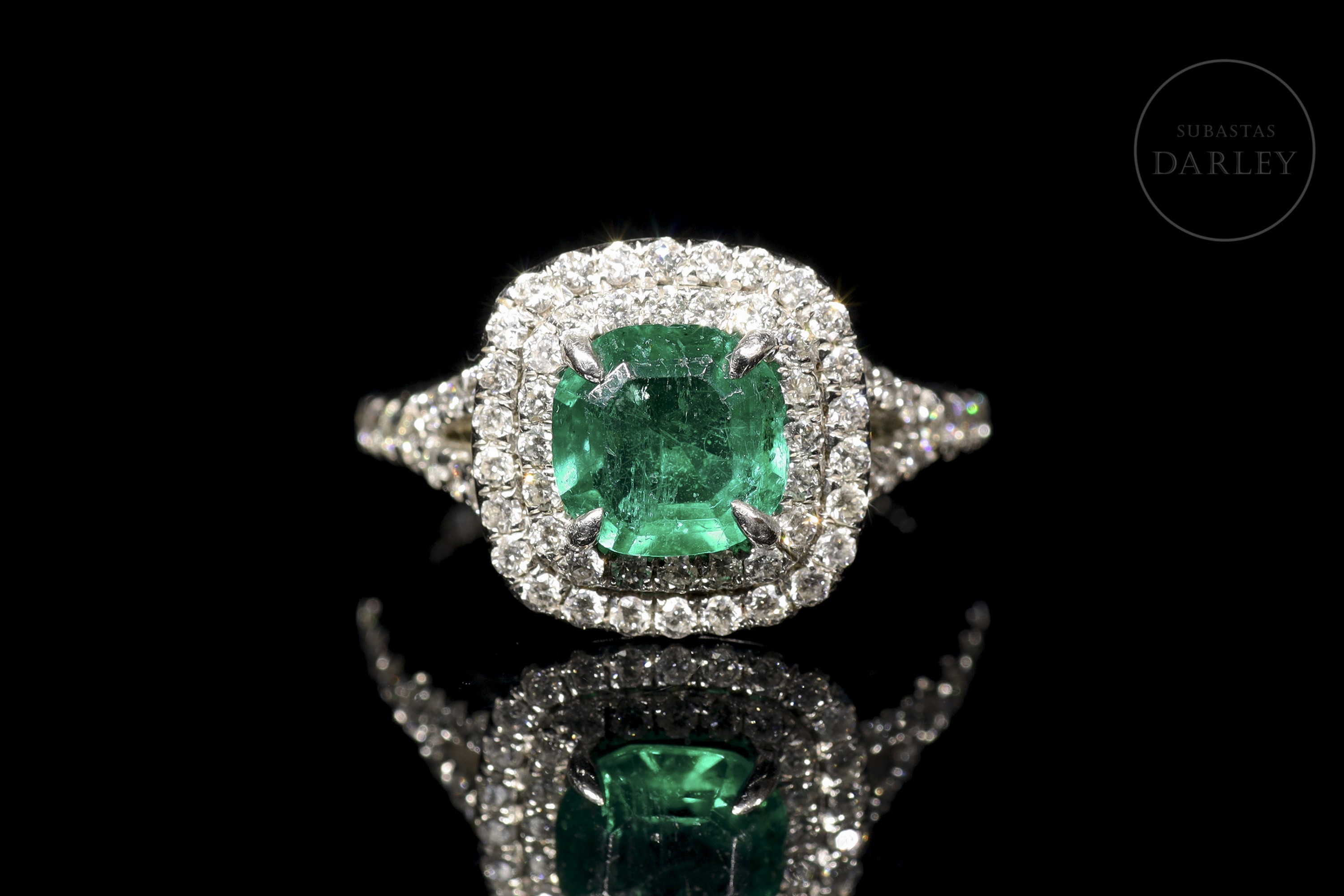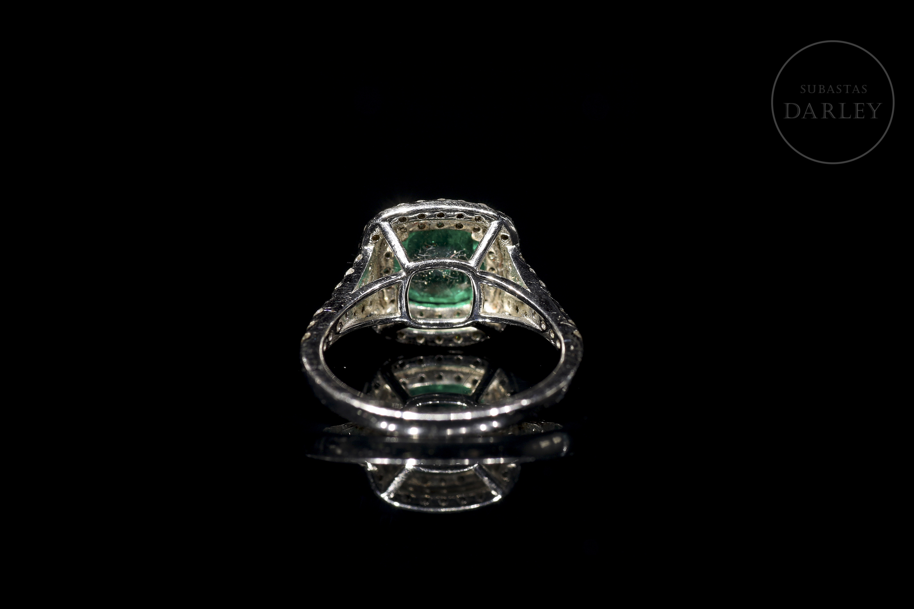 18kt white gold ring with two brilliant-cut diamonds surrounding the central stone, composed of an intense green cushion-cut emerald with high transparency. In four-claw setting, Y-arm, also set with diamonds.