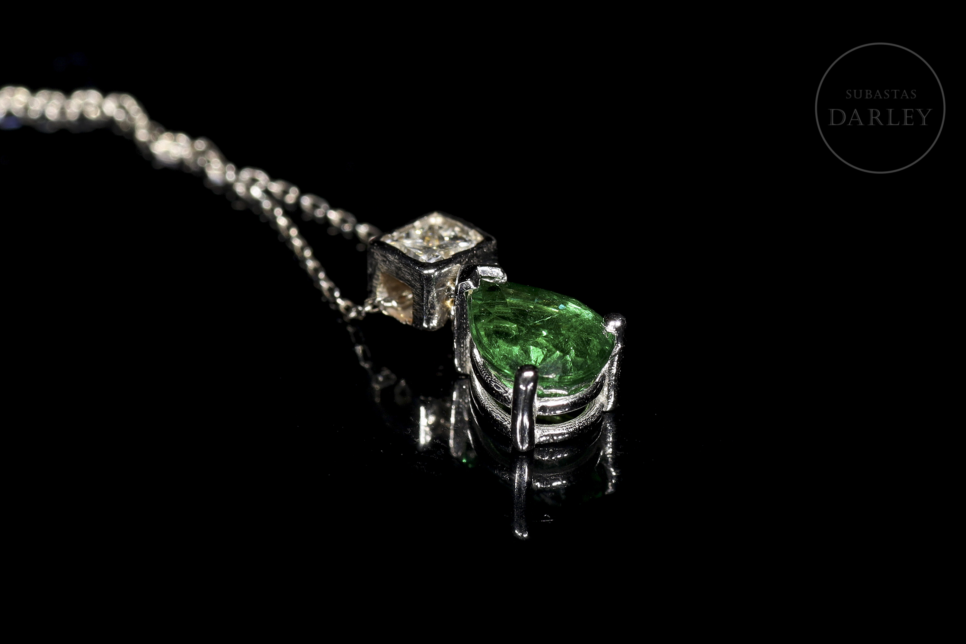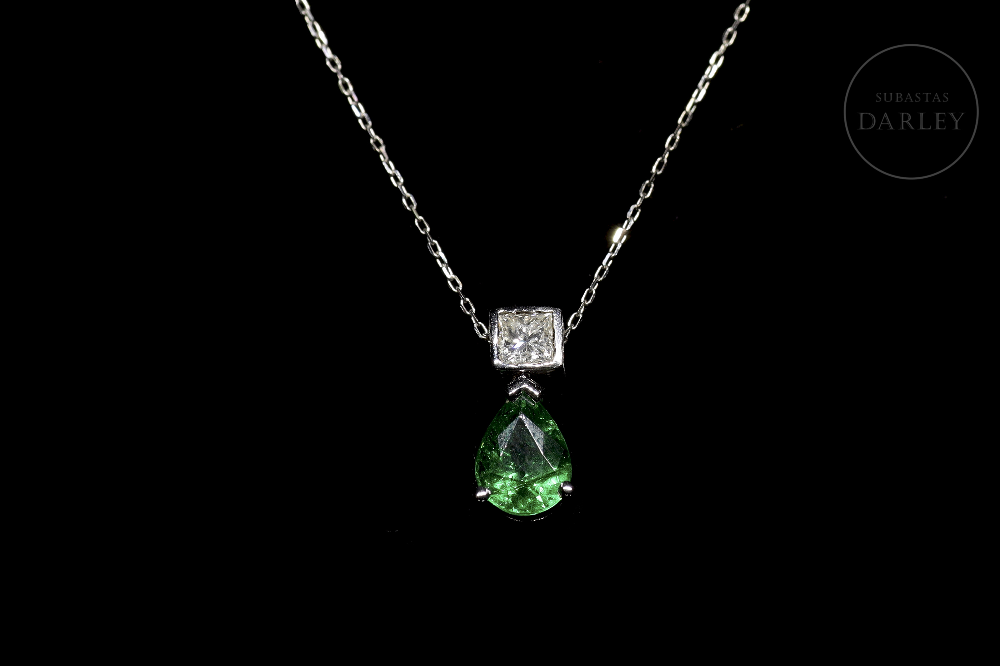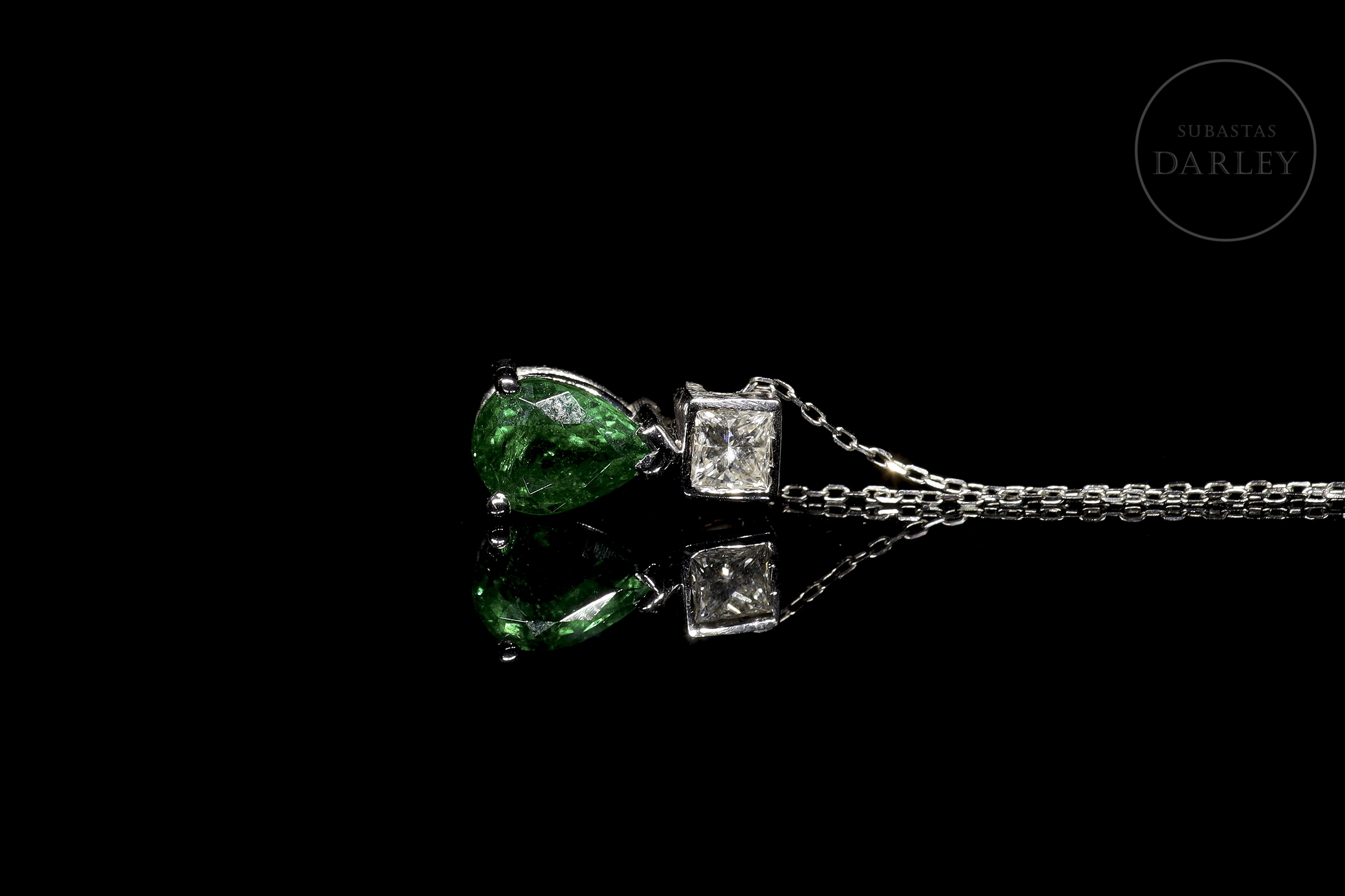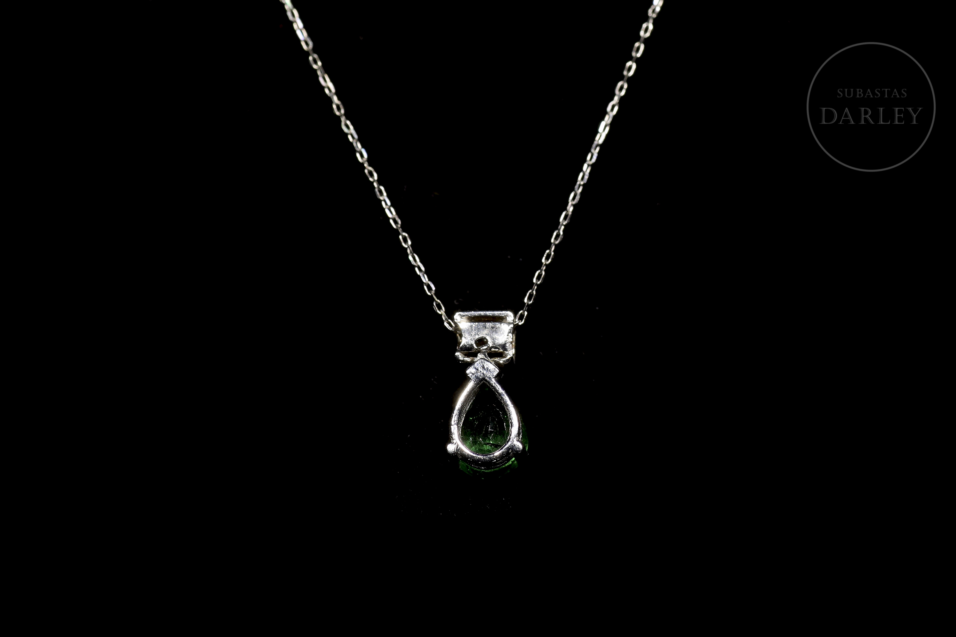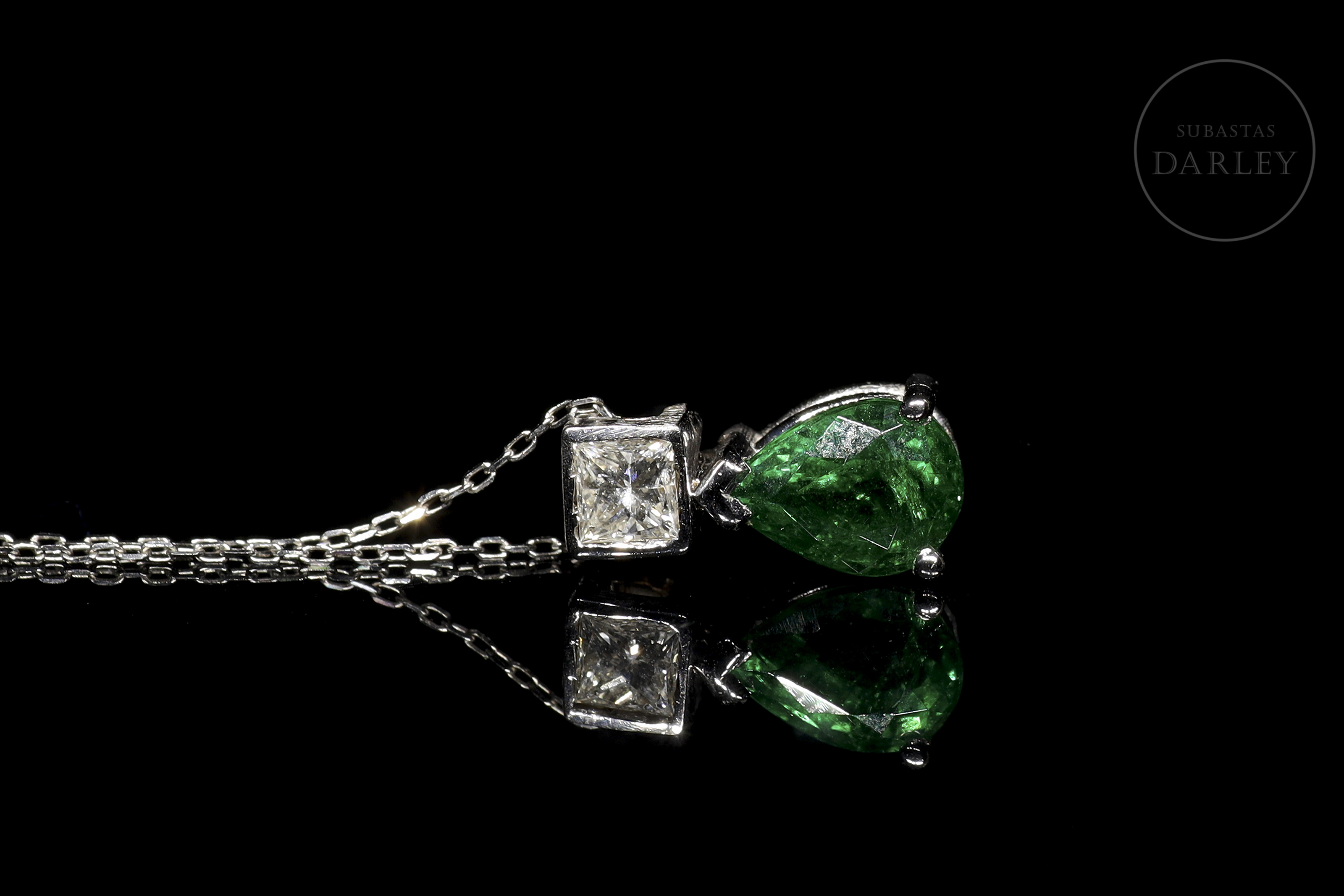 18kt white gold chain and pendant with a teardrop-cut tsavorite, also called green garnet, accompanied by a princess-cut diamond.