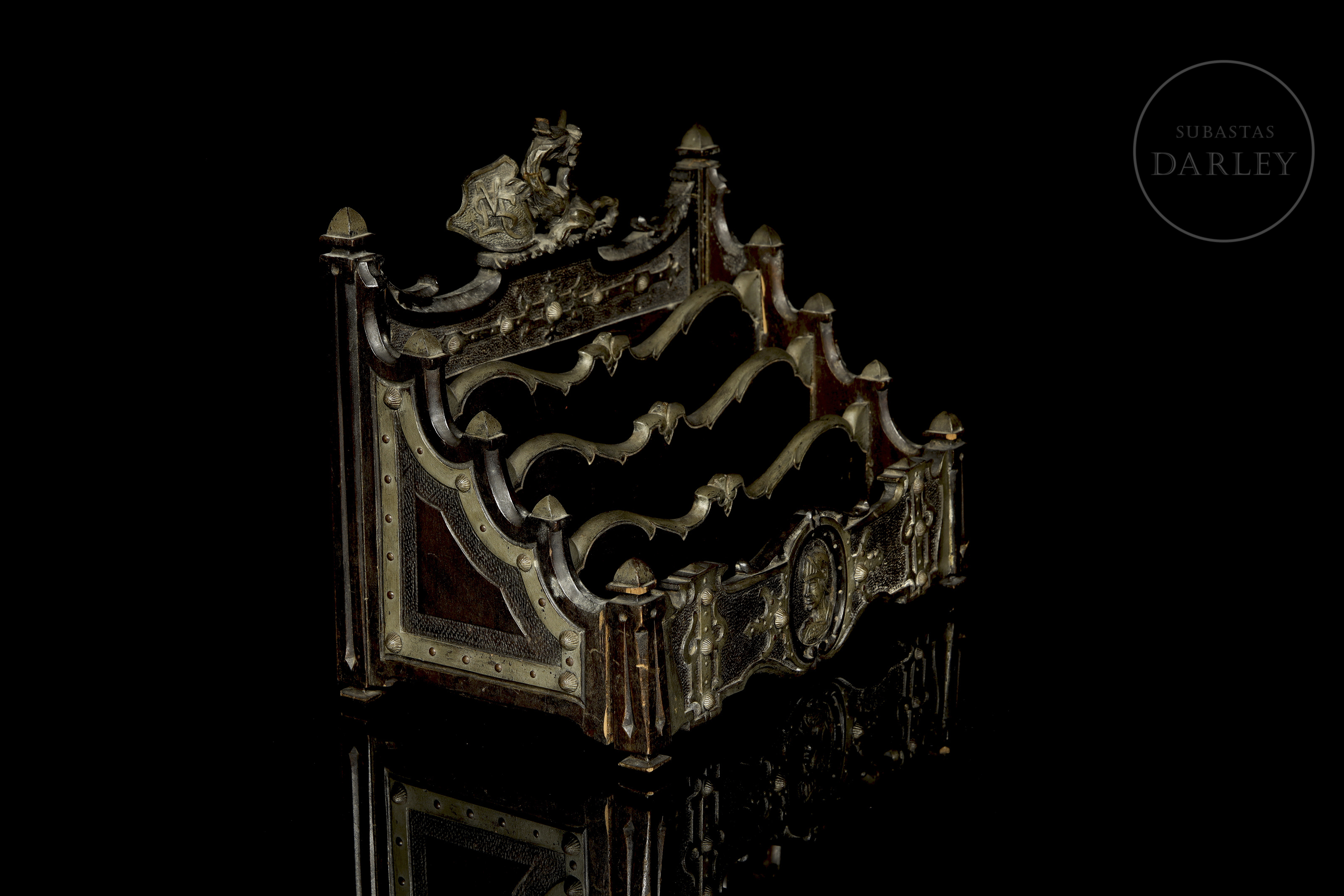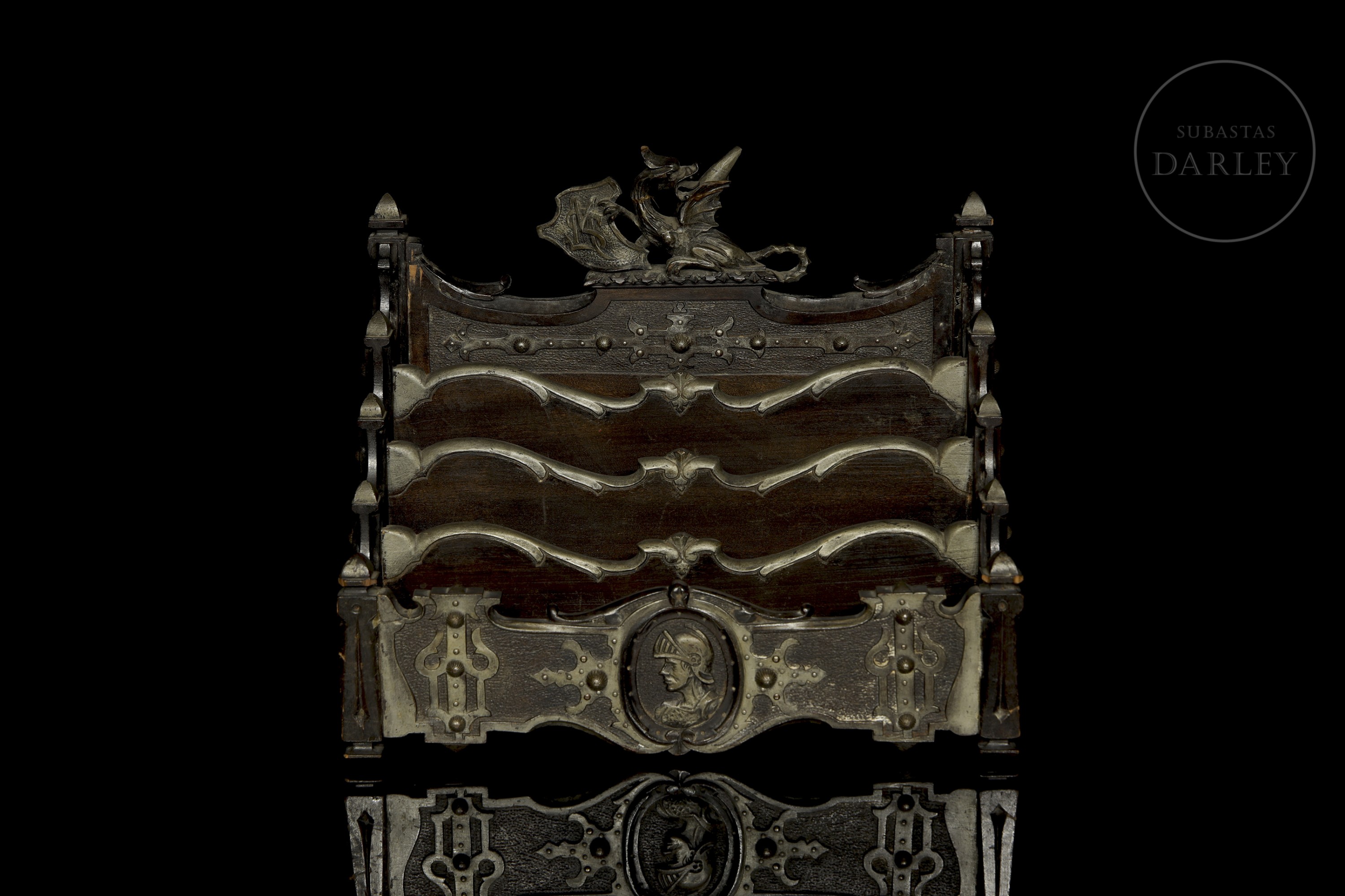 Ornamental letter organiser or holder, made of dark wood with decorative metal appliqués. It has three compartments or slots designed for sorting, and the lower centre section features a medallion depicting the profile of a warrior or historical figure.