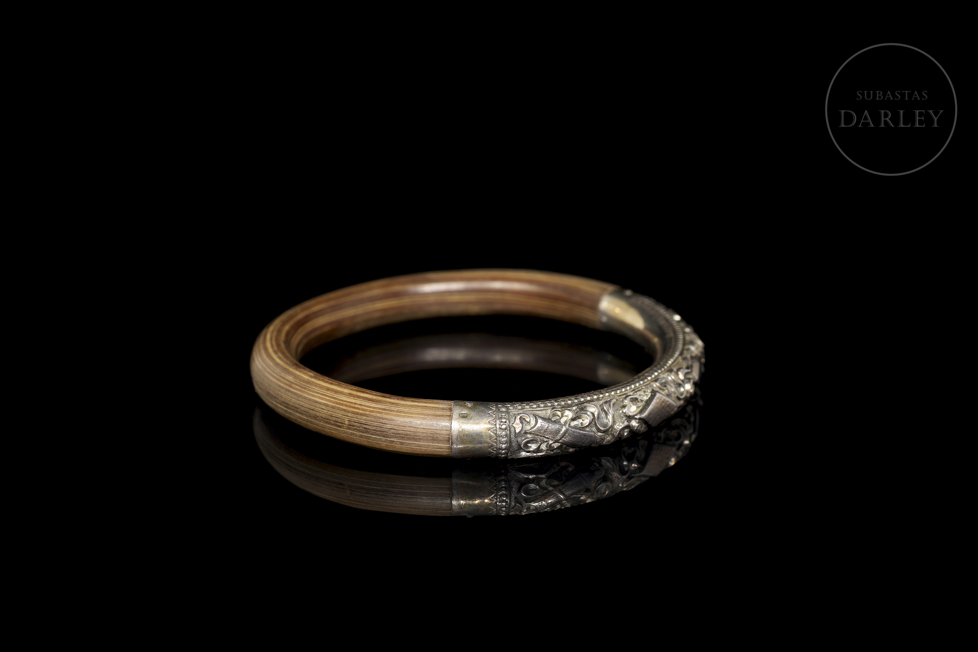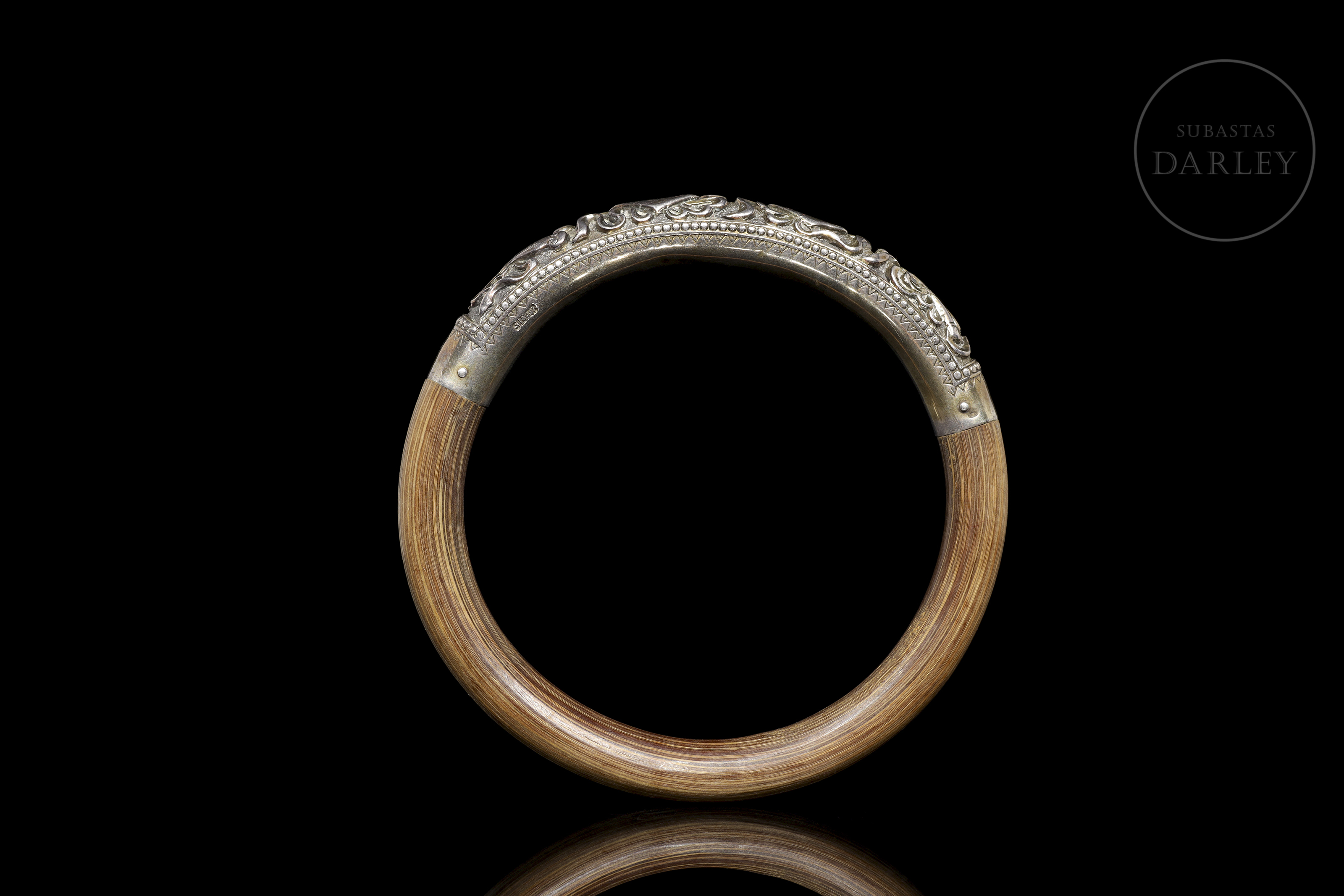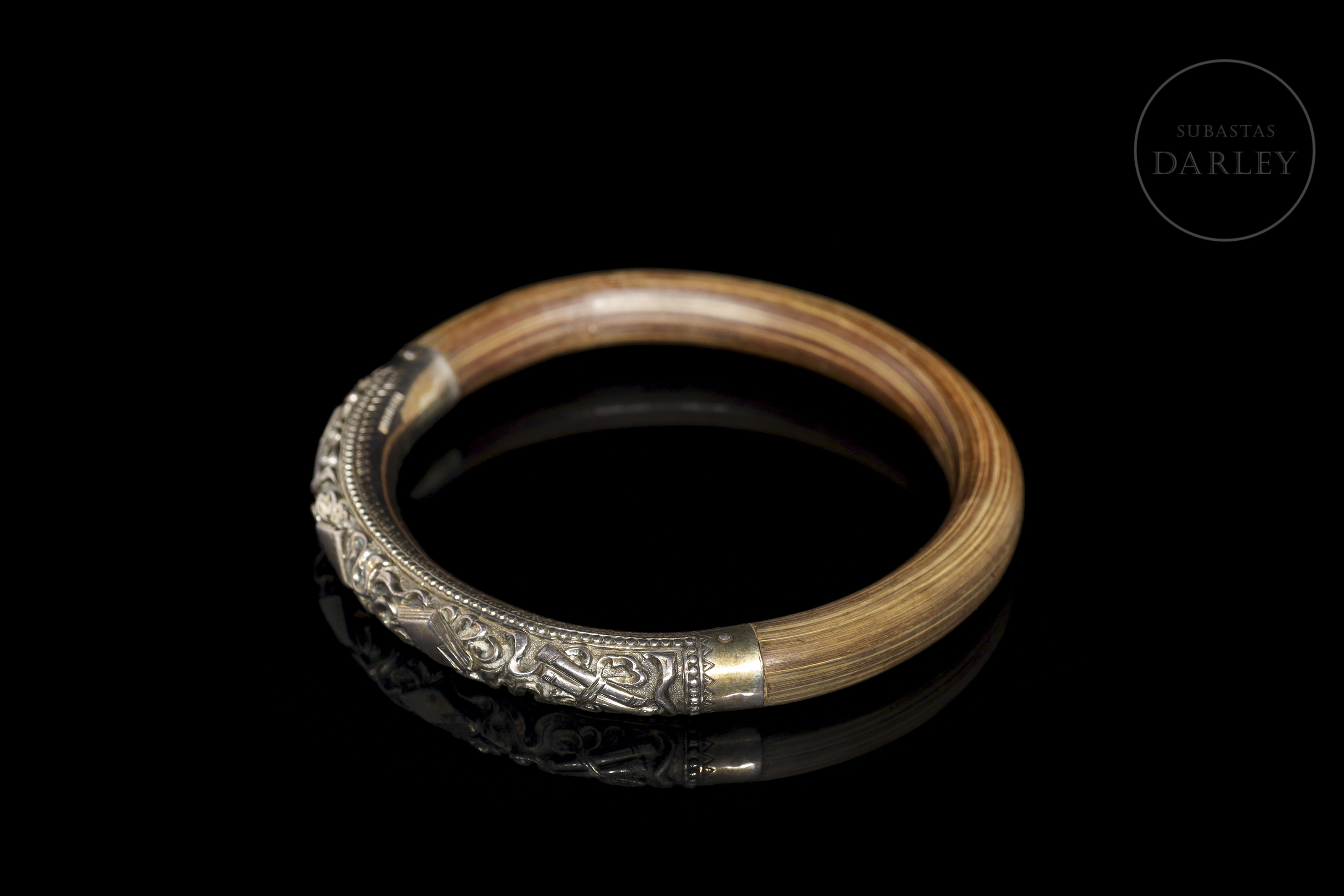 Polished wooden bracelet in a warm brown tone, partially decorated with embossed silver appliqués depicting auspicious geometric and plant motifs.