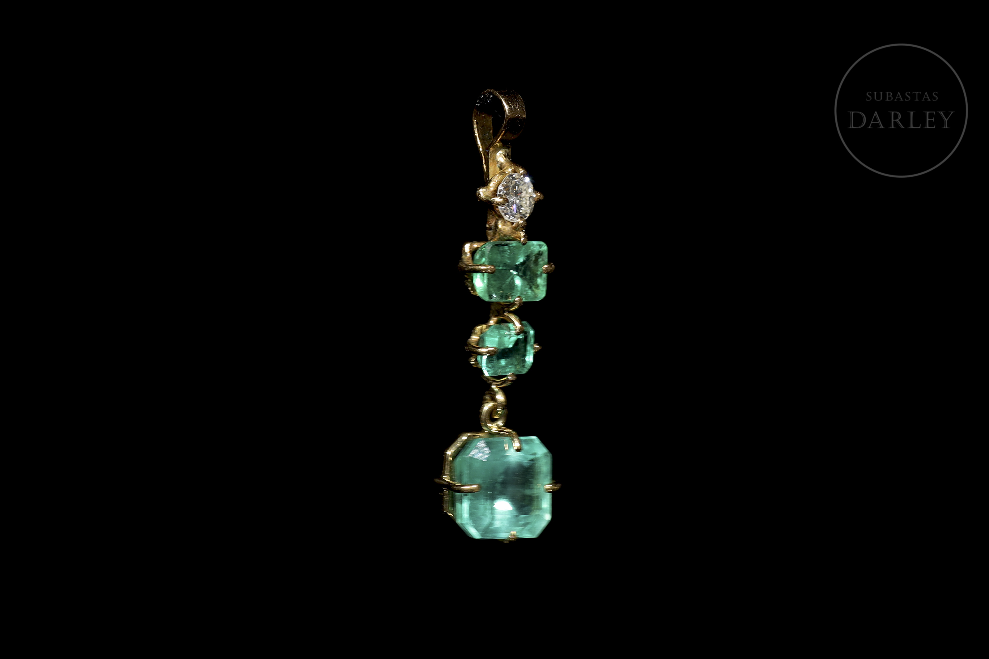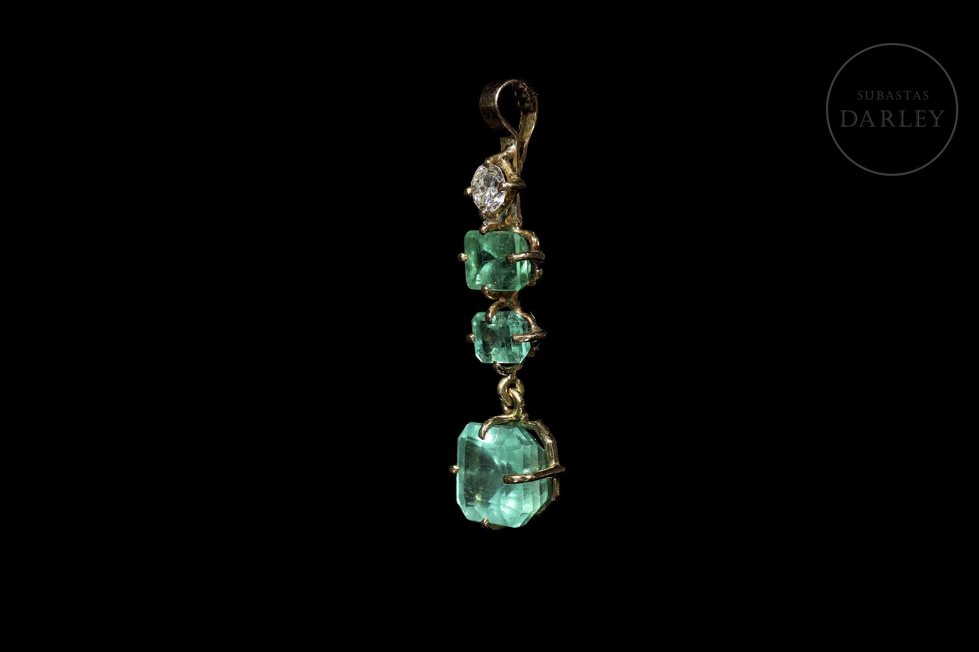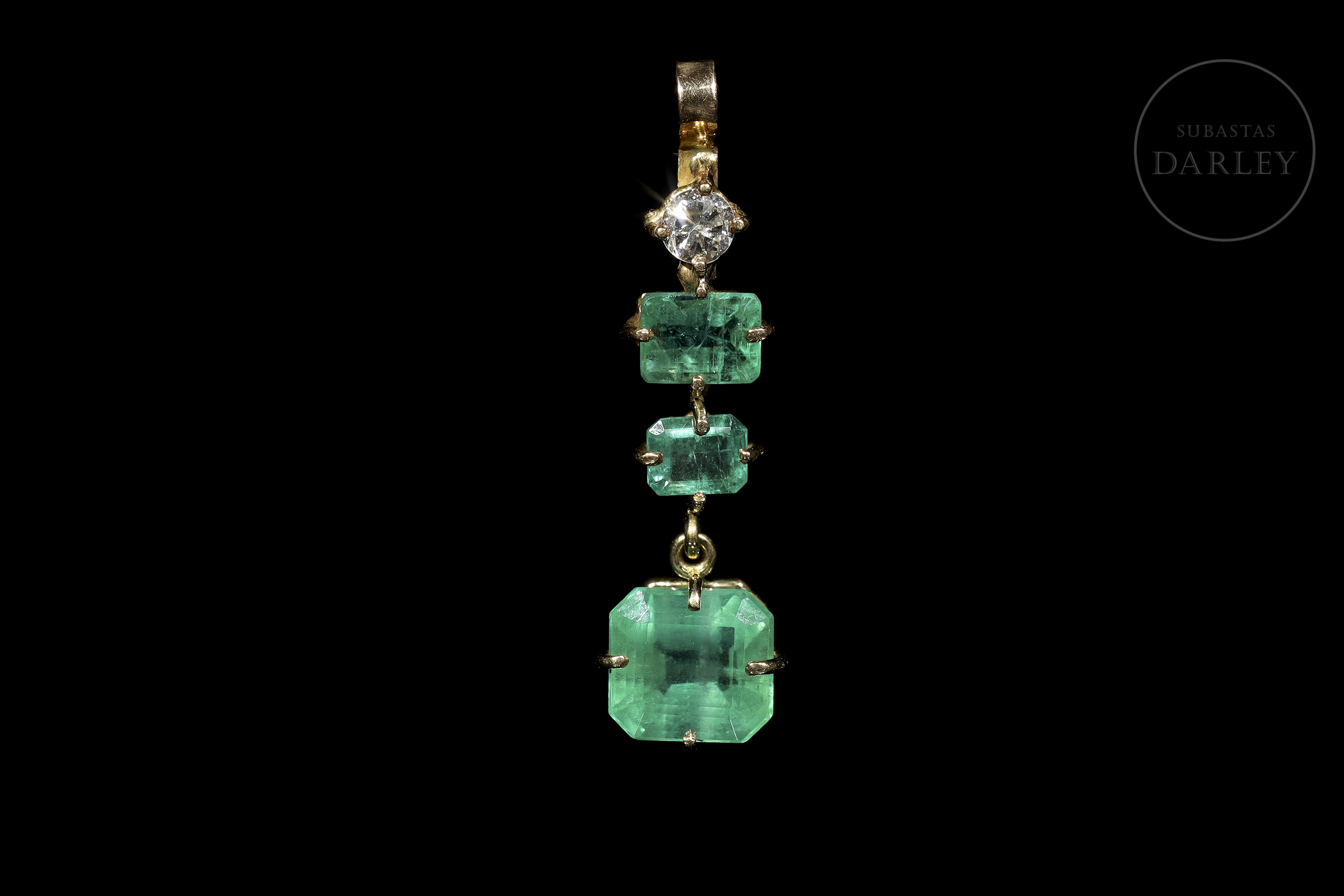 18kt yellow gold pendant with a brilliant cut diamond on the top and three emeralds of different sizes, the last one in cushion cut.