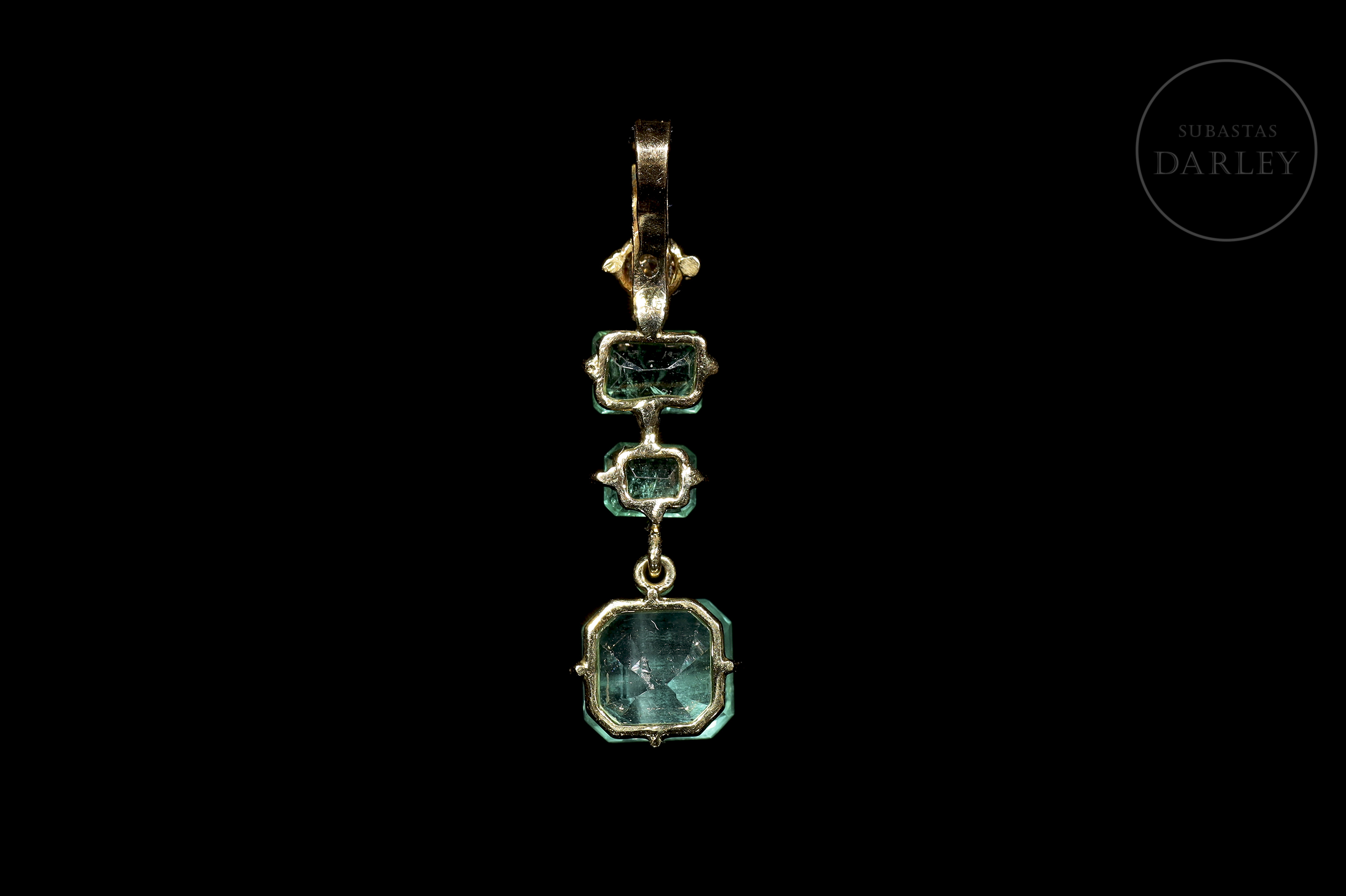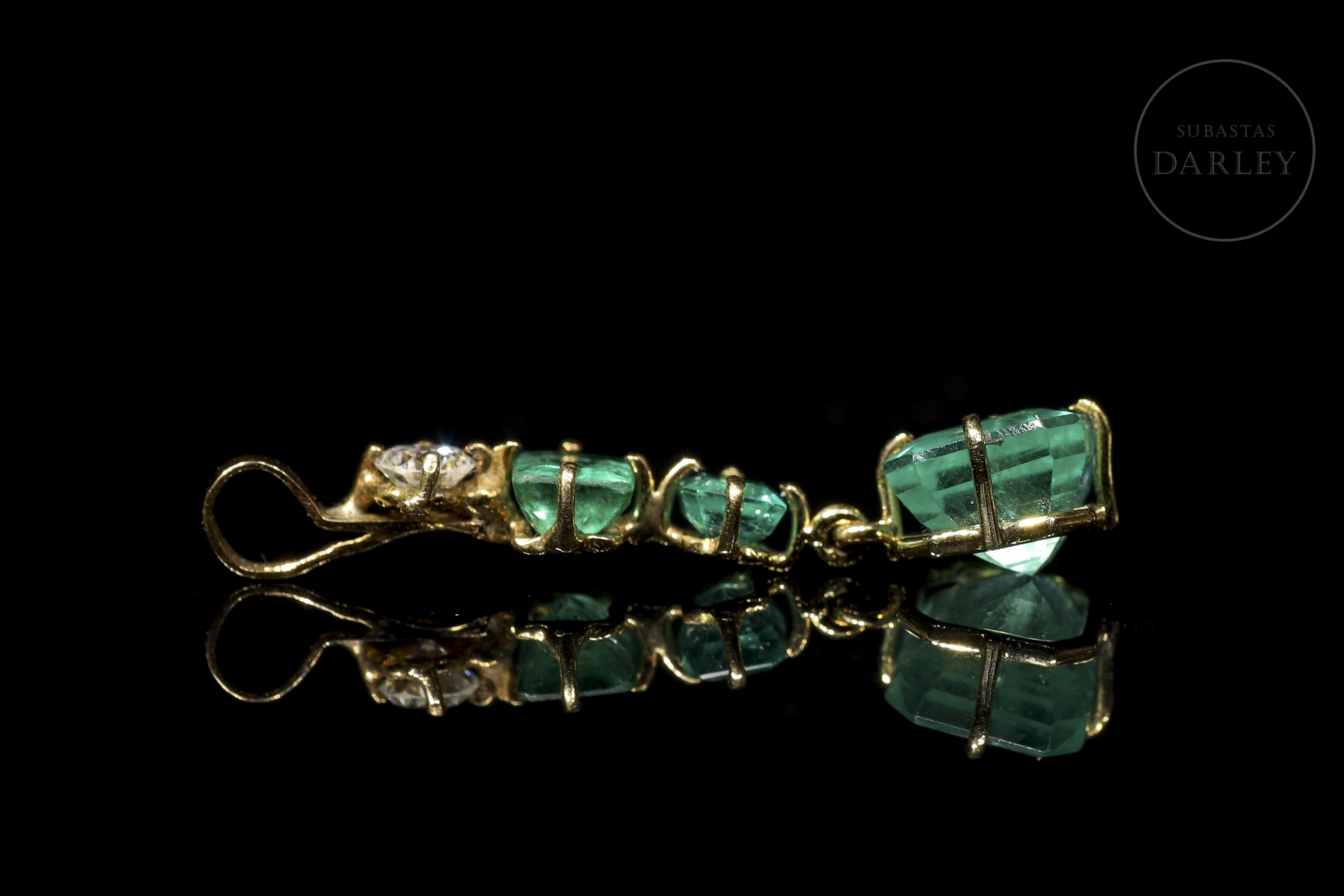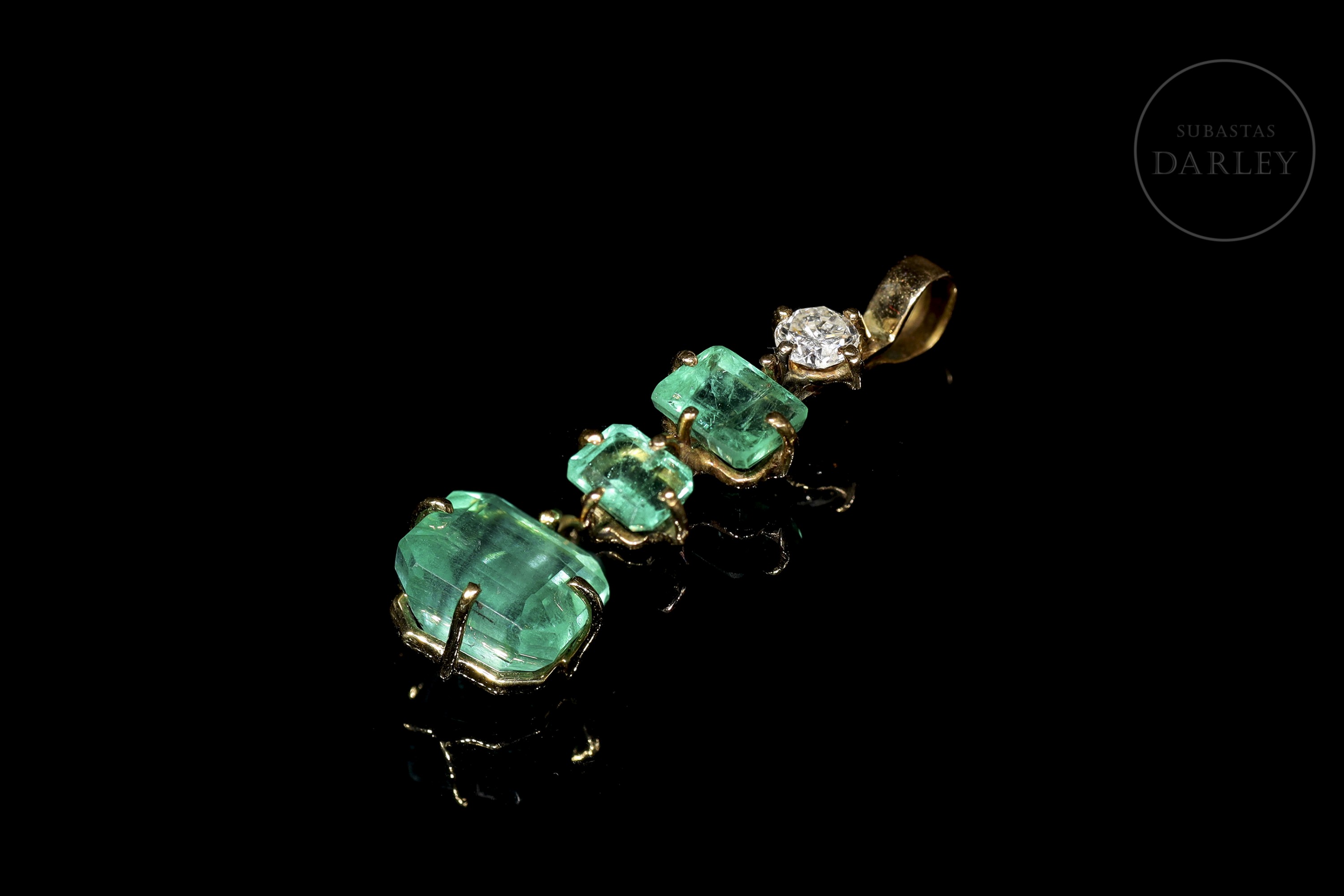 18kt yellow gold pendant with a brilliant cut diamond on the top and three emeralds of different sizes, the last one in cushion cut.
