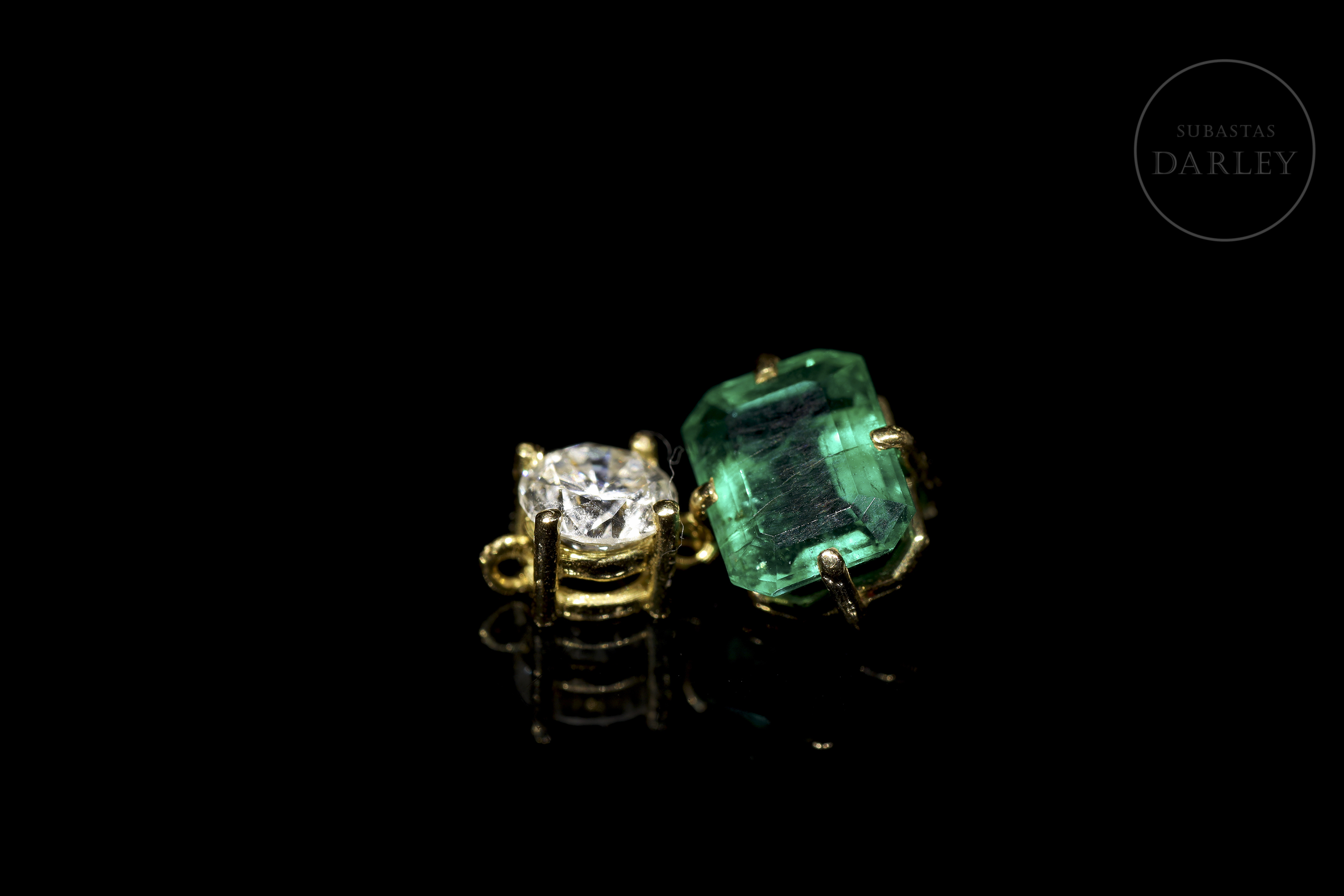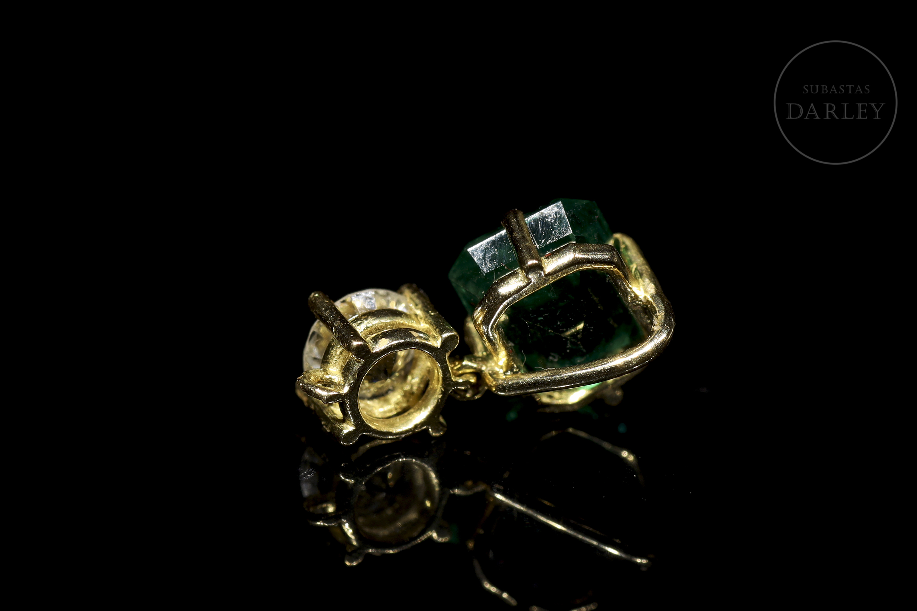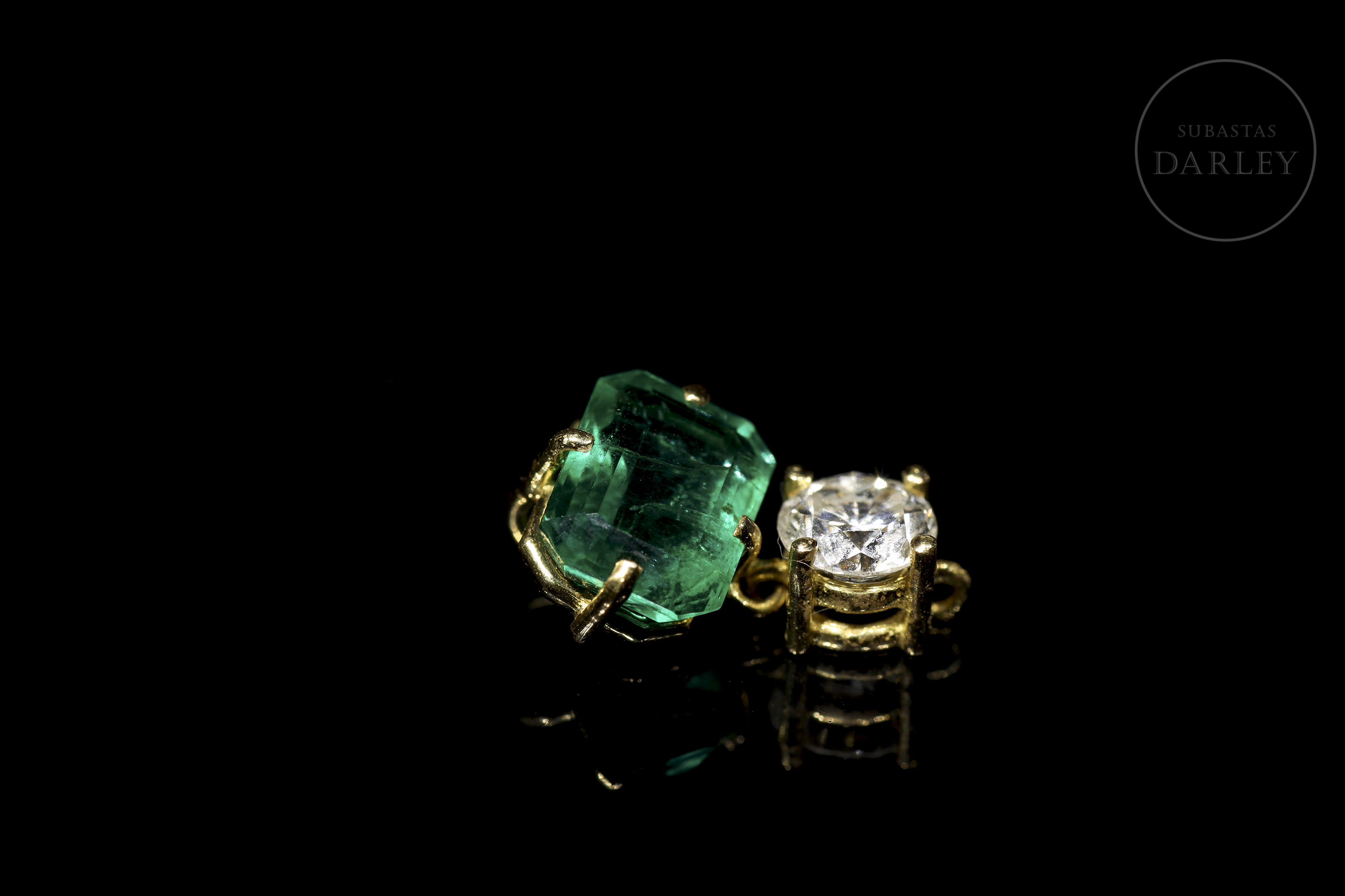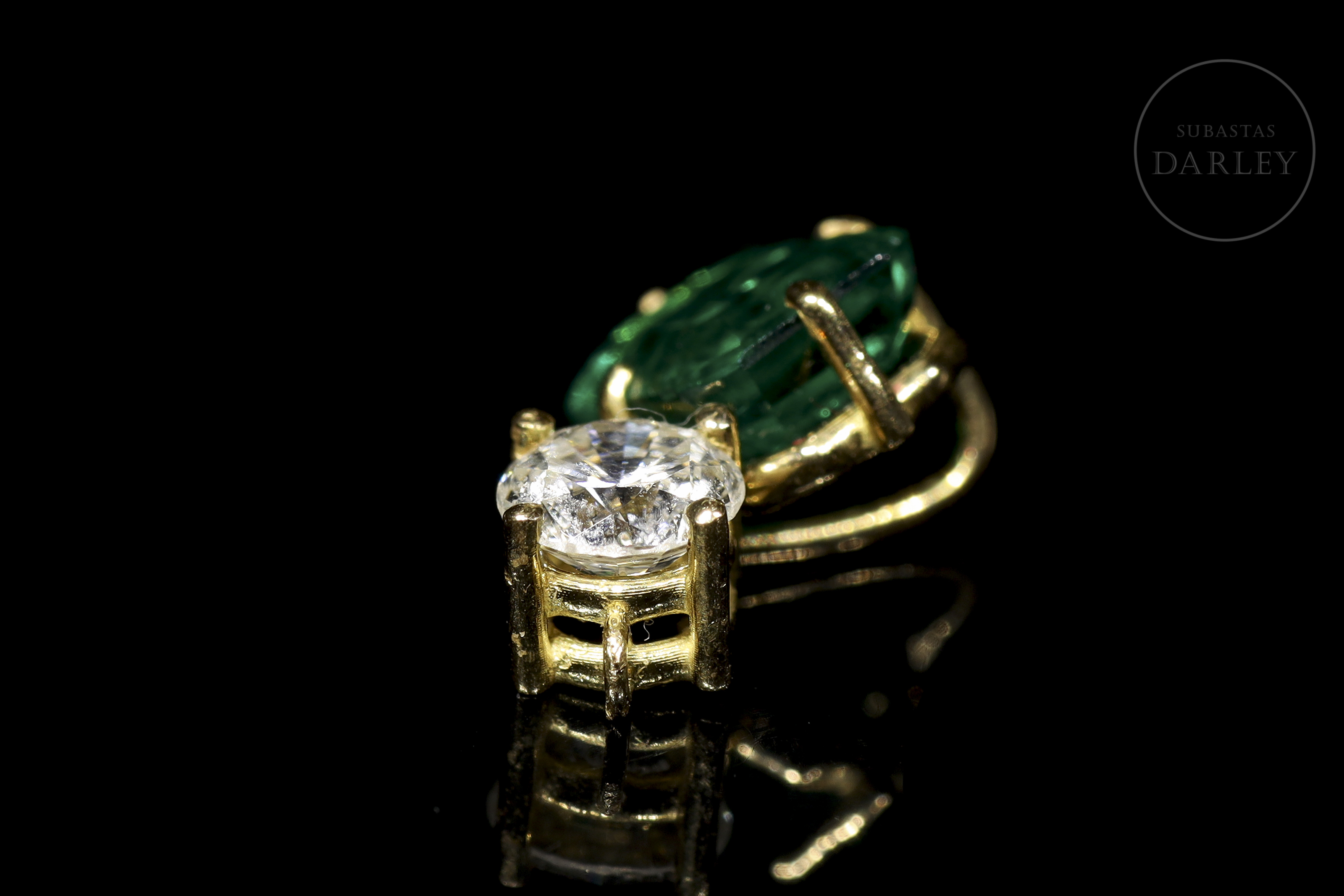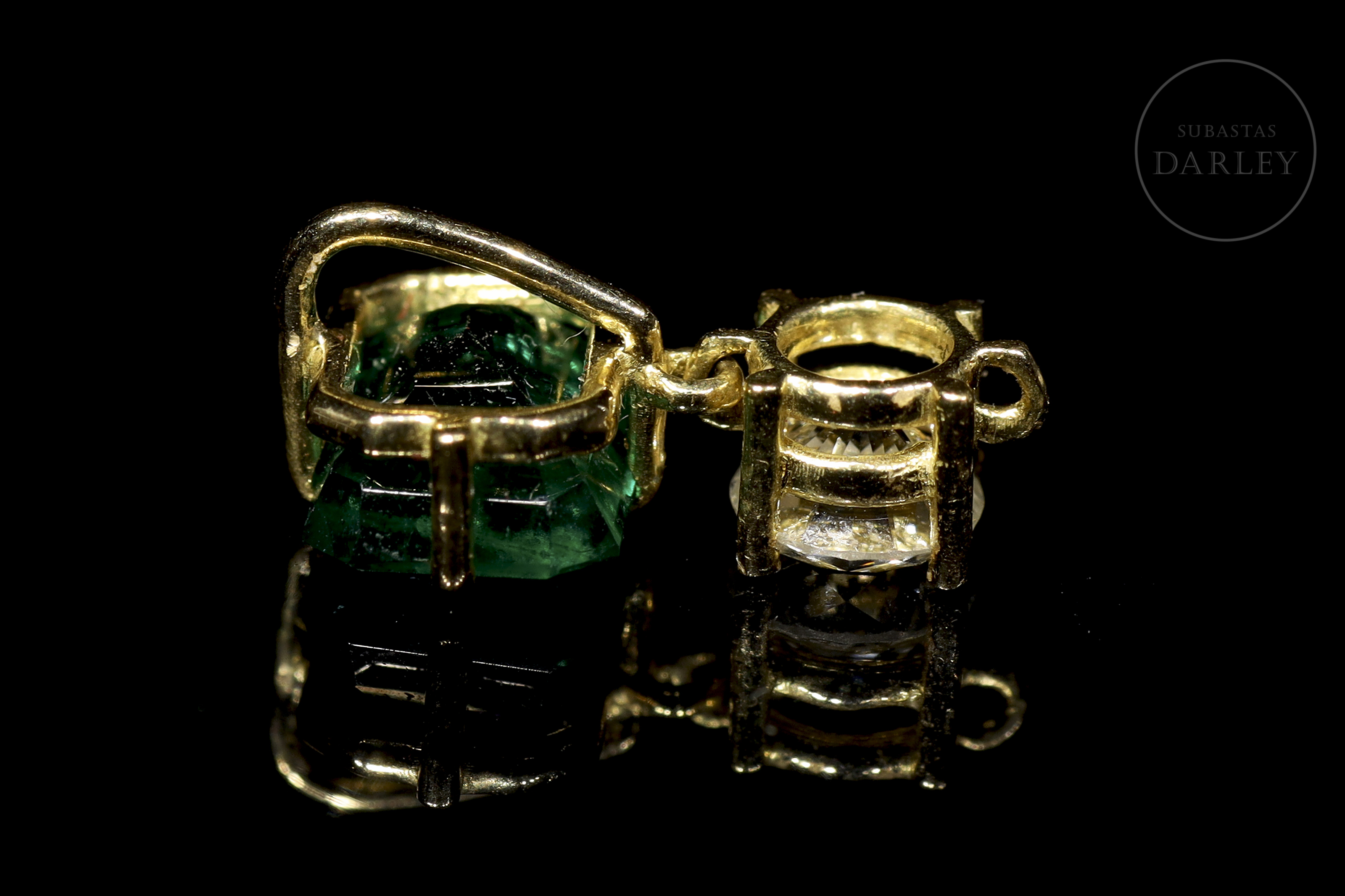 18kt yellow gold pendant with a brilliant cut diamond weighing 0.32 cts, an emerald cut emerald weighing 1 cts (approx), intense green colour and with high transparency.