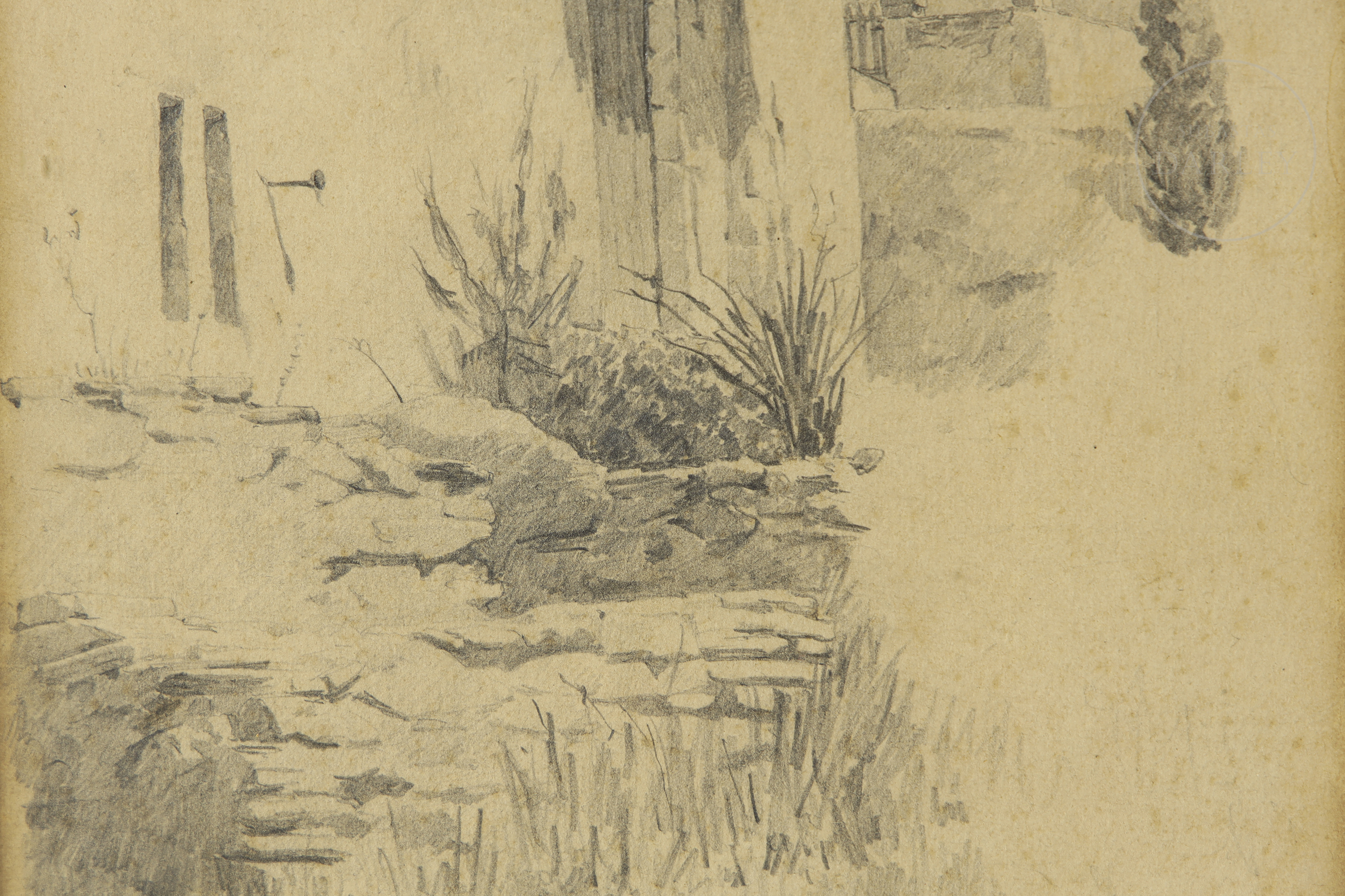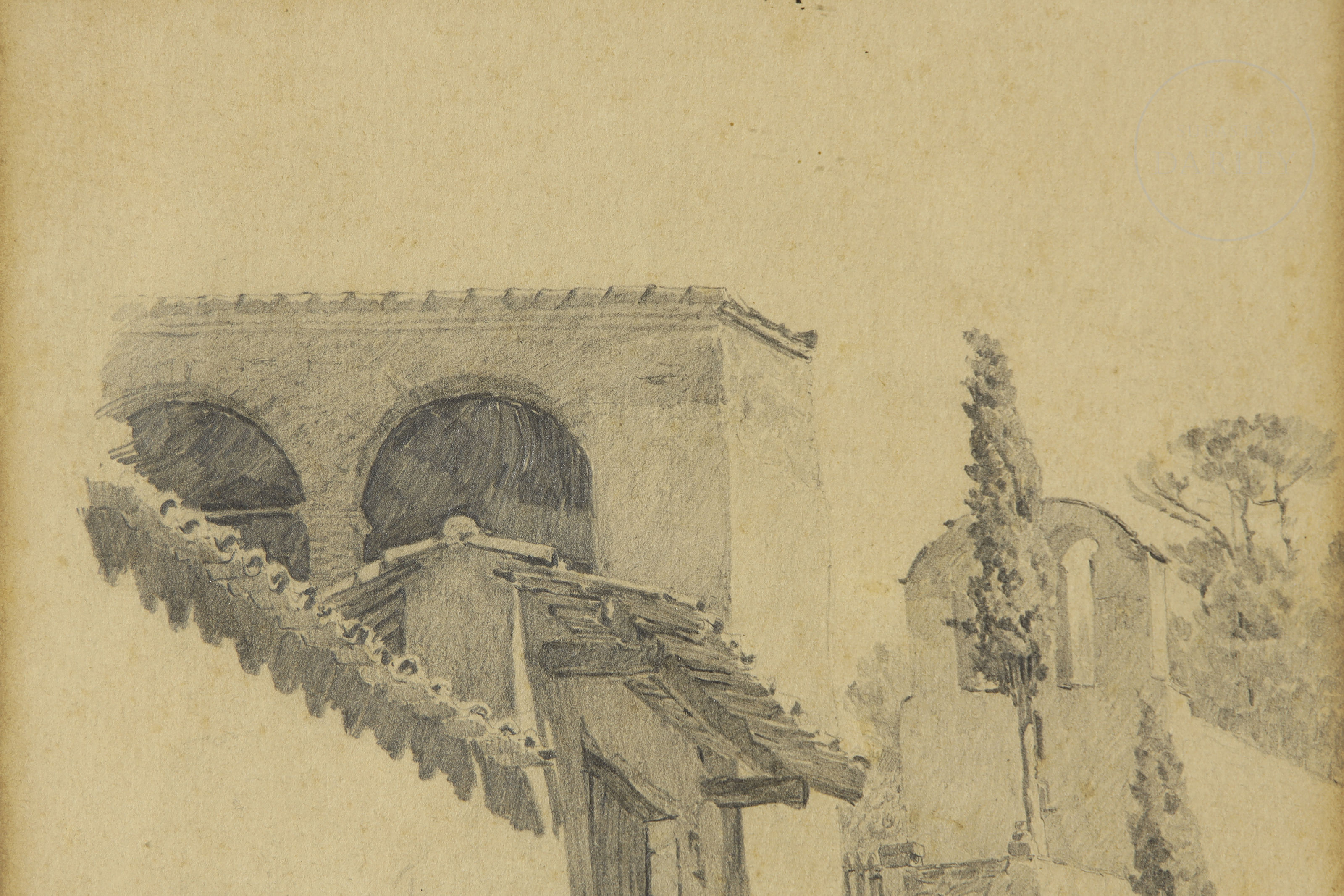 Dibujo a lápiz sobre papel. Apunte del natural que representa una fachada de arquitectura tradicional en un entorno rural con vegetación. Firmado "A. Rico" en el ángulo inferior izquierdo.
