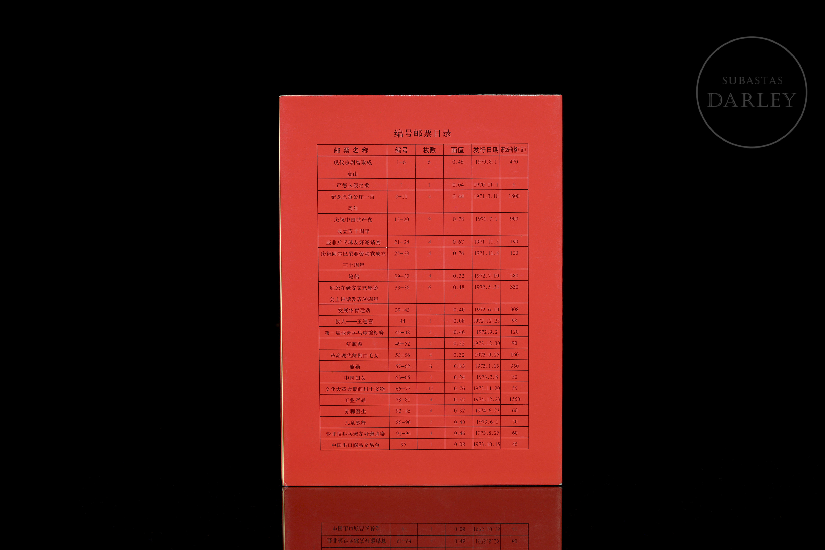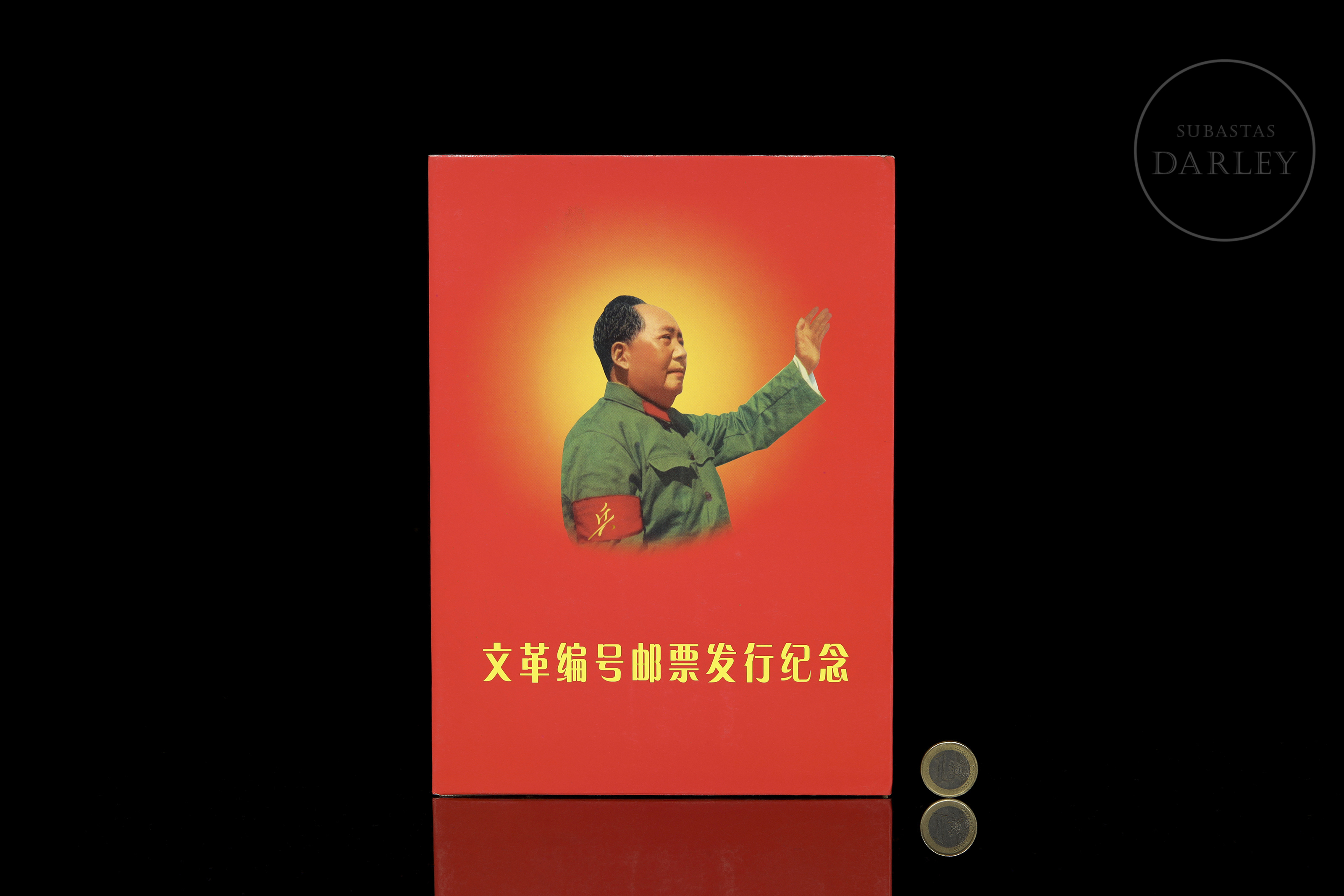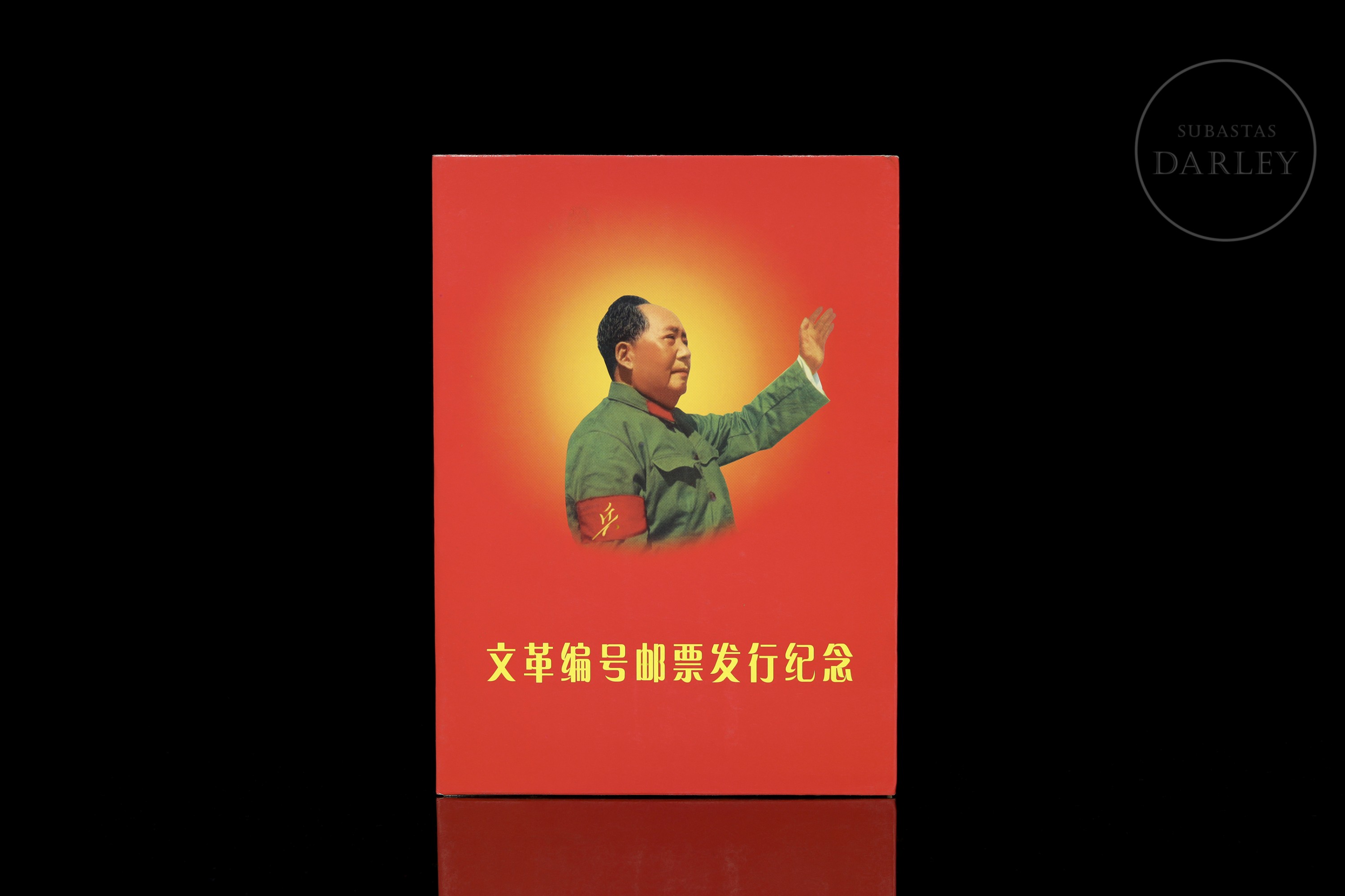 Álbum de filatelia, diseñado para albergar los 95 sellos postales que se emitieron sin numeración oficial de catálogo entre 1970 y 1973. E álbum, titulado como "文革编号邮票发行纪念", muestra en la cara delantera un icónico retrato de Mao Zedong.
