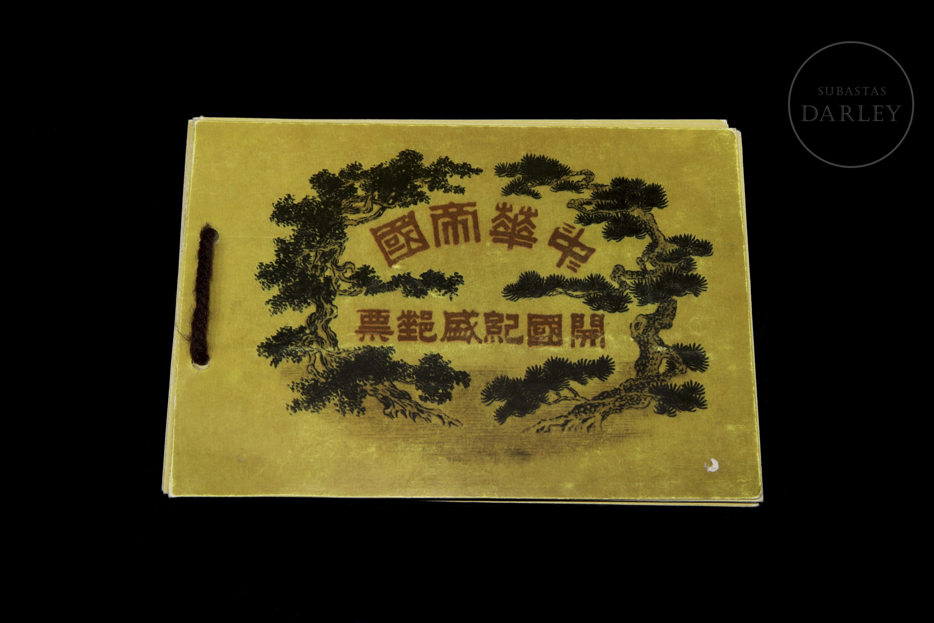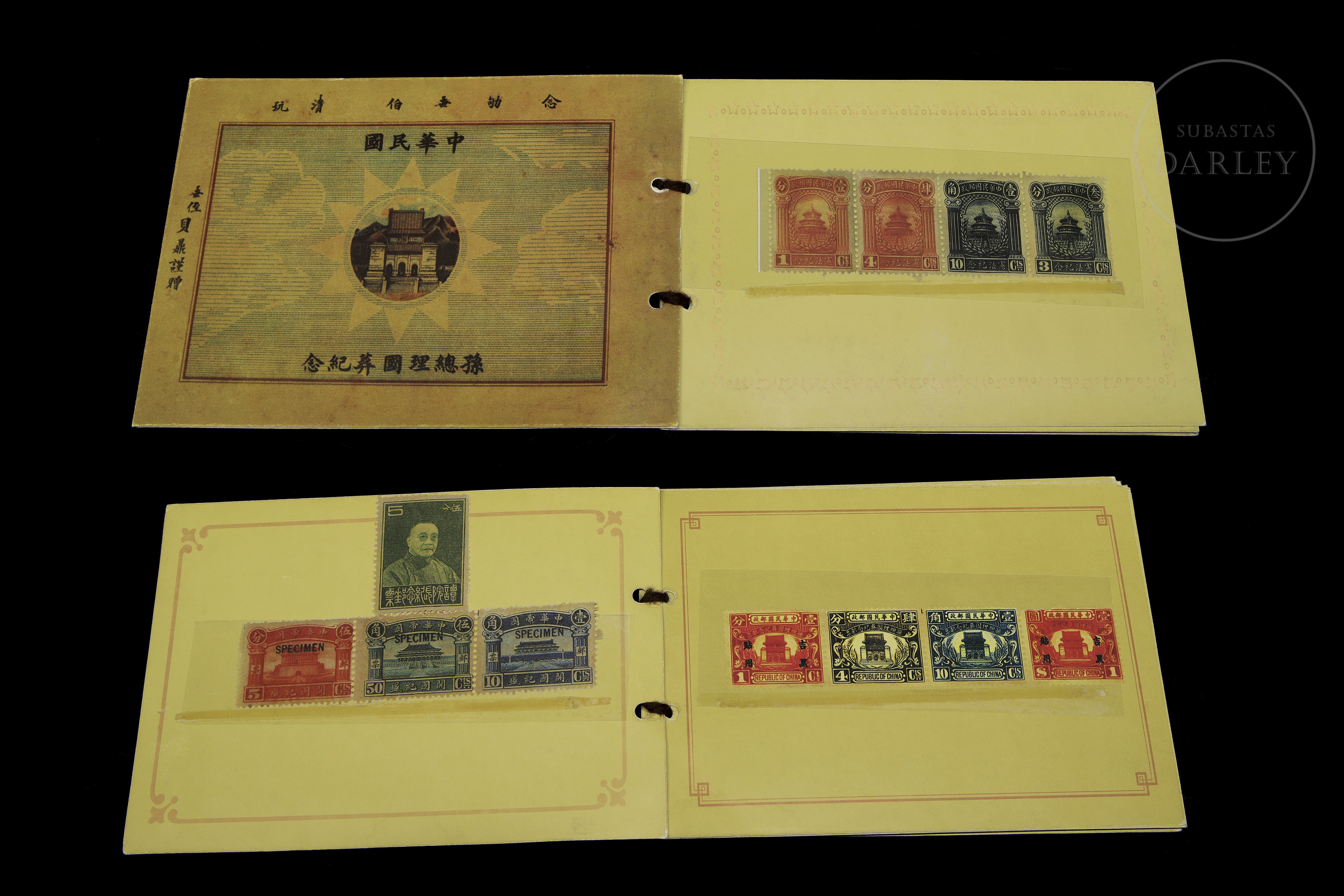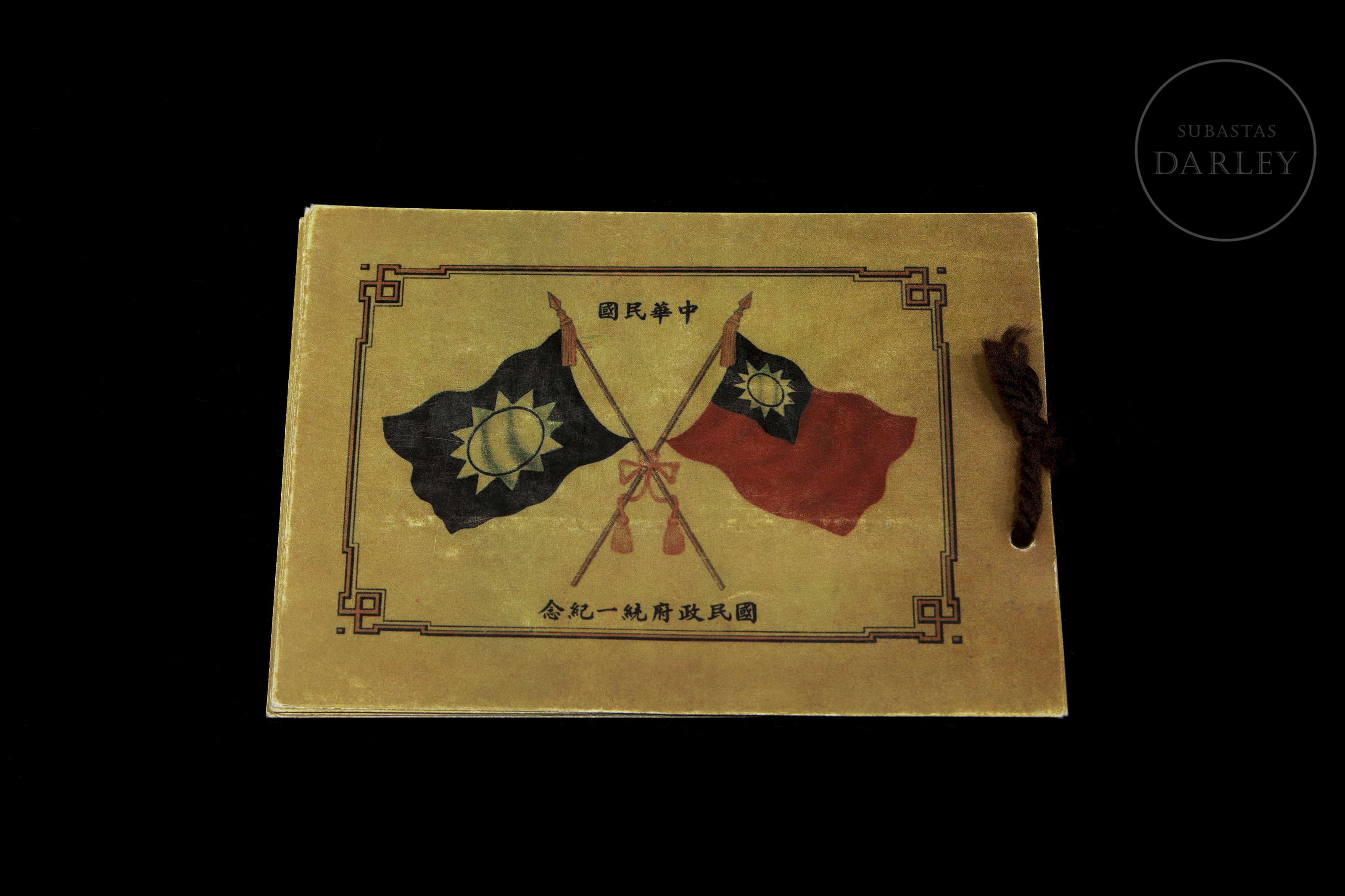 Álbum filatélico apaisado, siguiendo el estilo de un álbum de pinturas. Presenta una encuadernación tradicional asiática de hilo visto, con las banderas del Kuomintang y de la República de China en la portada y dos frondosos árboles en el reverso. El interior se compone de páginas de papel que albergan sellos postales de múltiples colores y tamaños conmemorativos de la Unificación Nacional, algunos de ellos sobremarcados como "SPECIMEN".