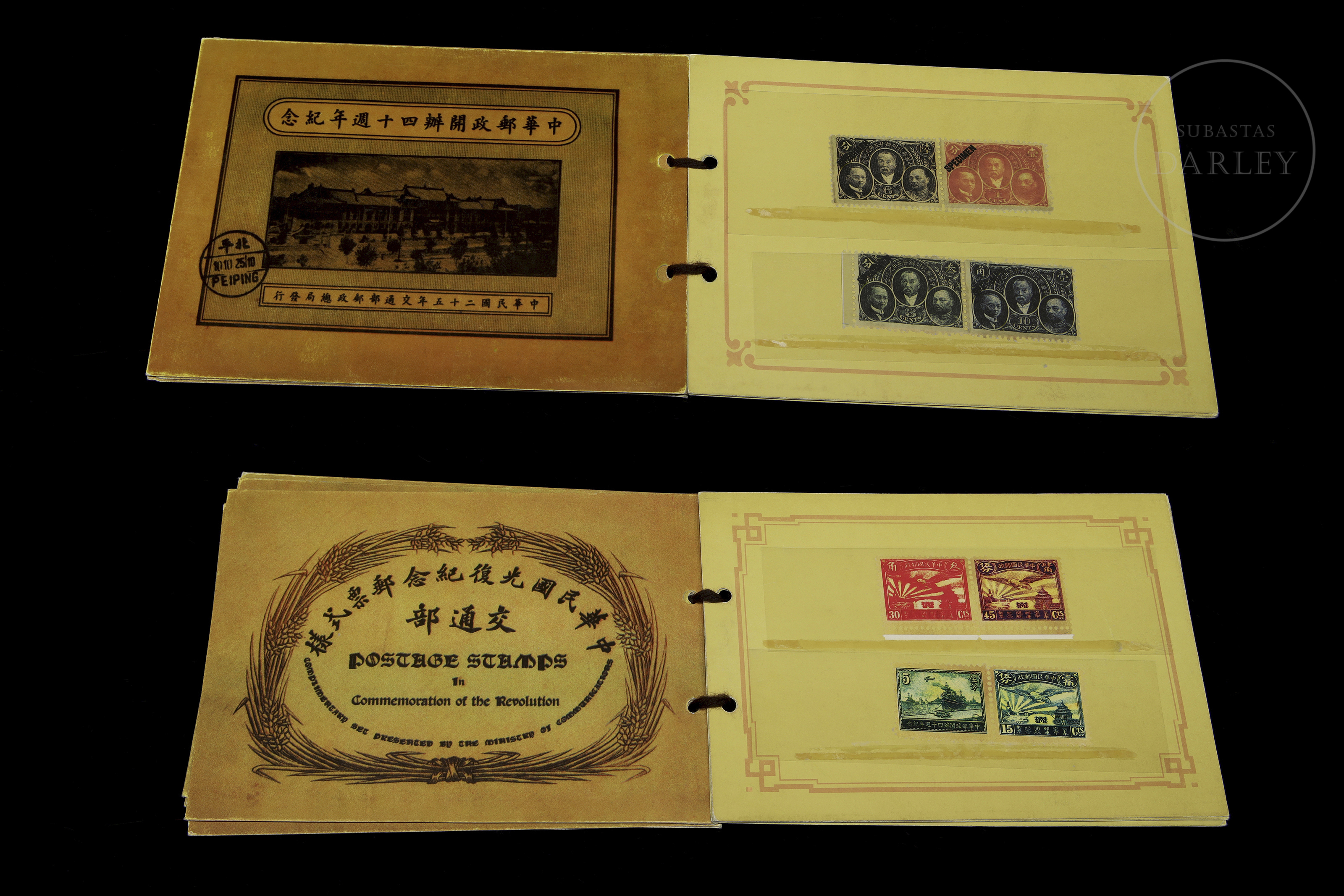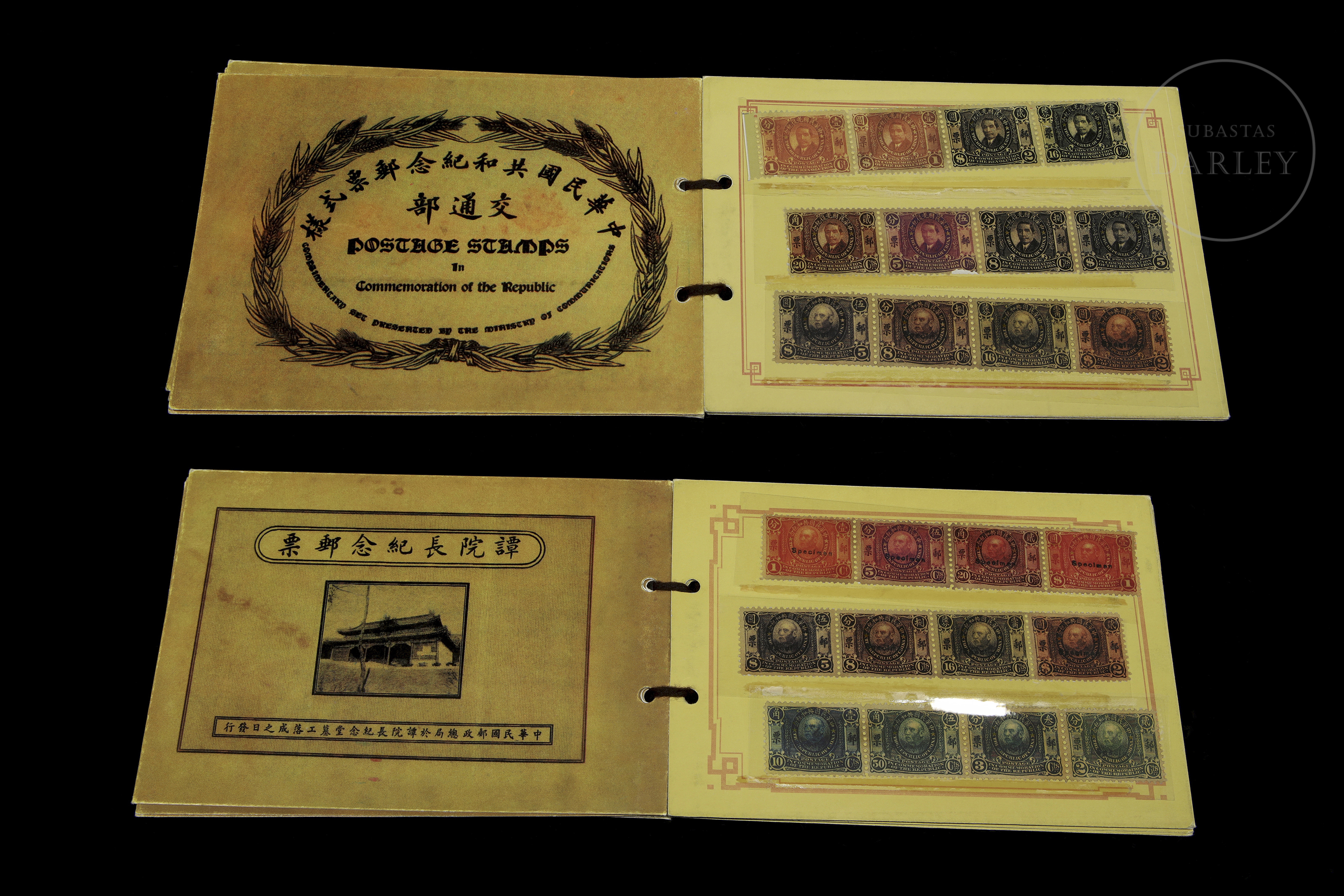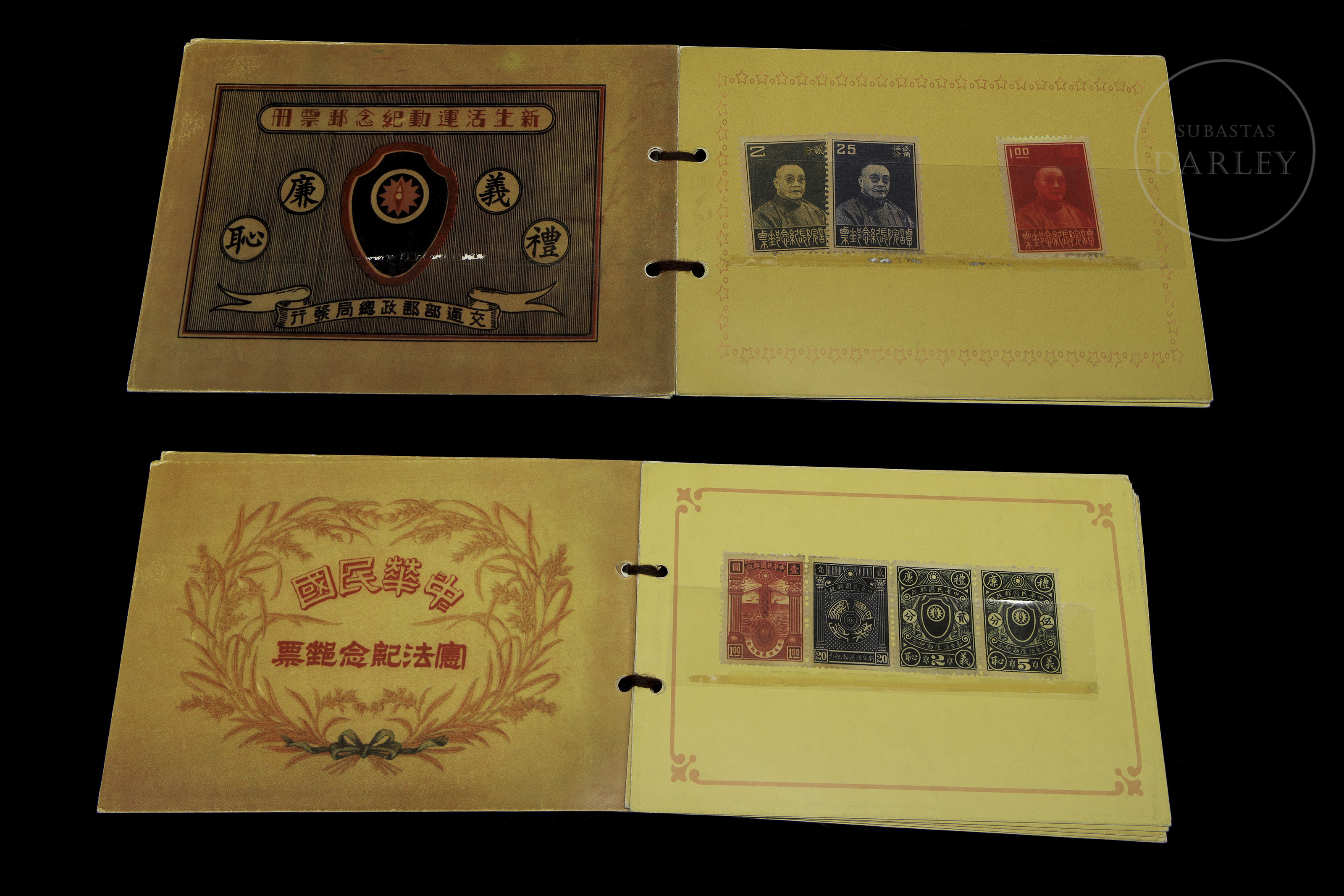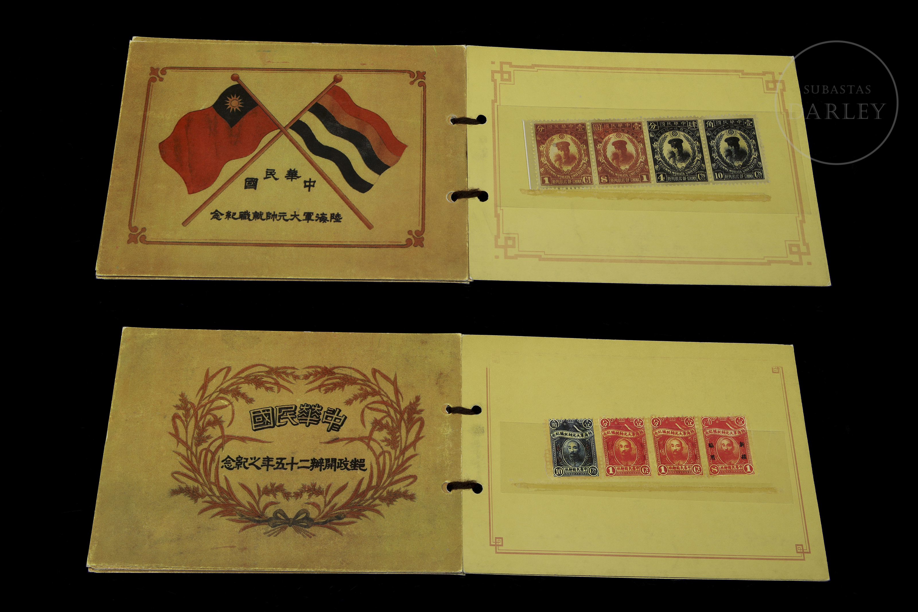 Álbum filatélico apaisado, siguiendo el estilo de un álbum de pinturas. Presenta una encuadernación tradicional asiática de hilo visto, con las banderas del Kuomintang y de la República de China en la portada y dos frondosos árboles en el reverso. El interior se compone de páginas de papel que albergan sellos postales de múltiples colores y tamaños conmemorativos de la Unificación Nacional, algunos de ellos sobremarcados como "SPECIMEN".