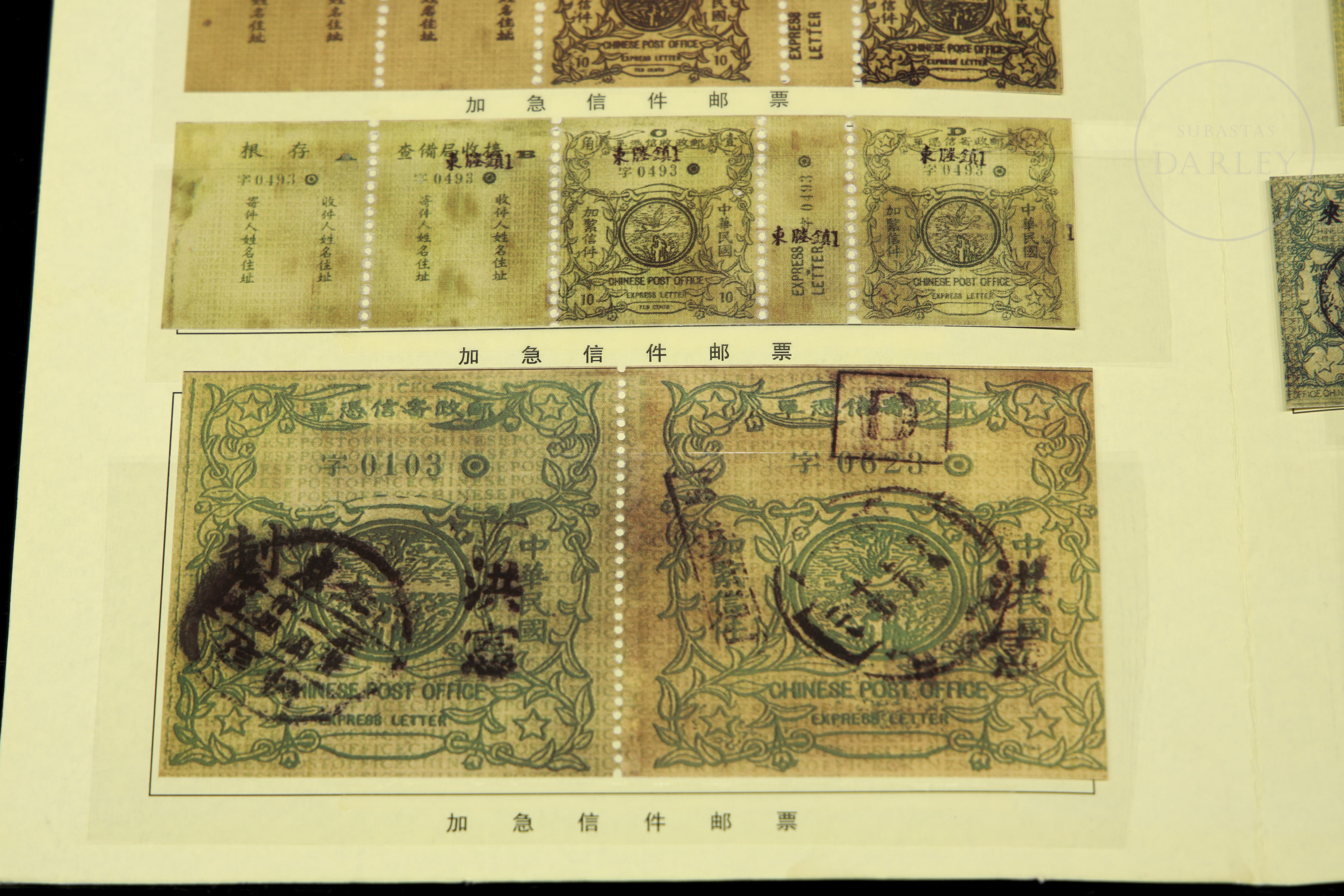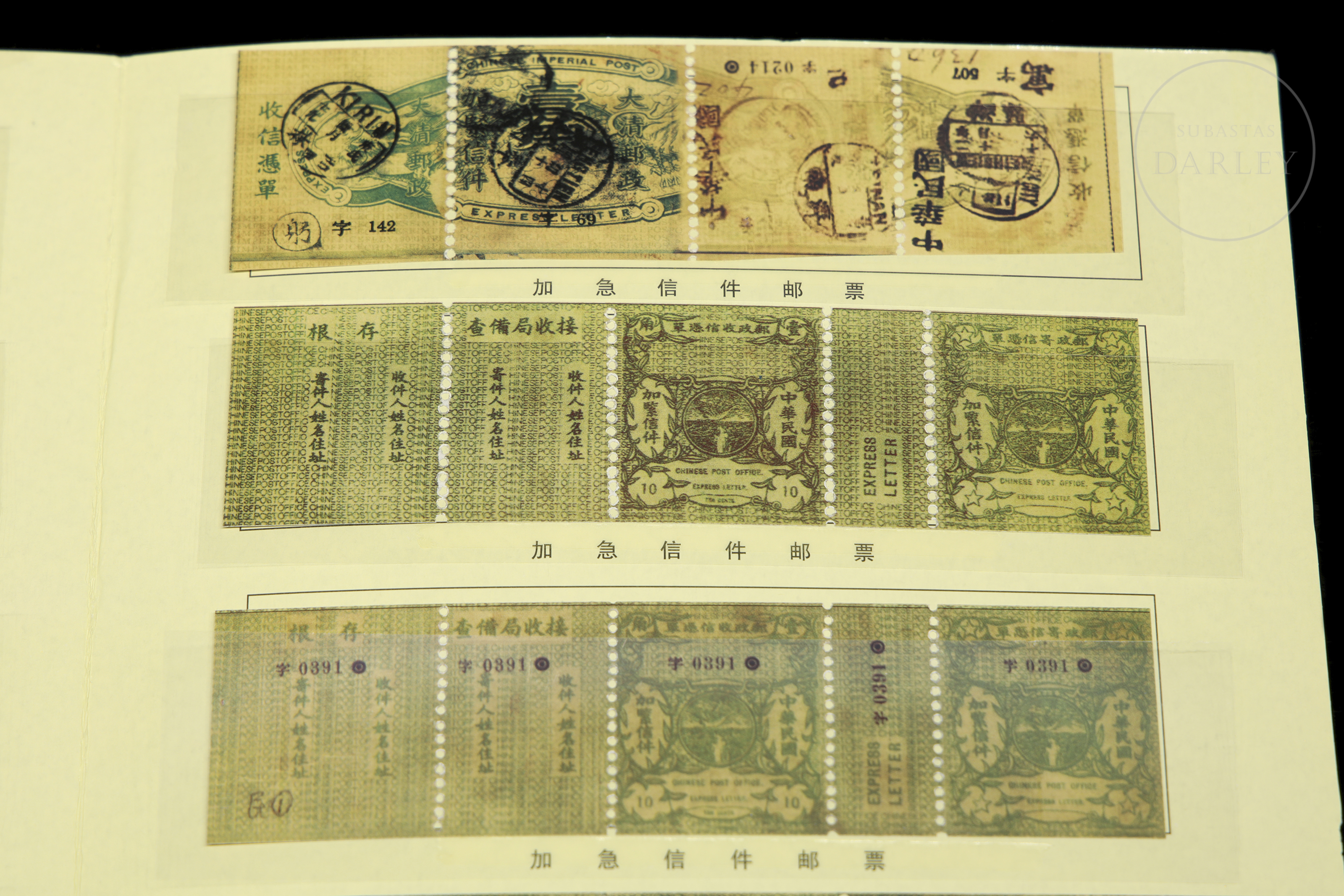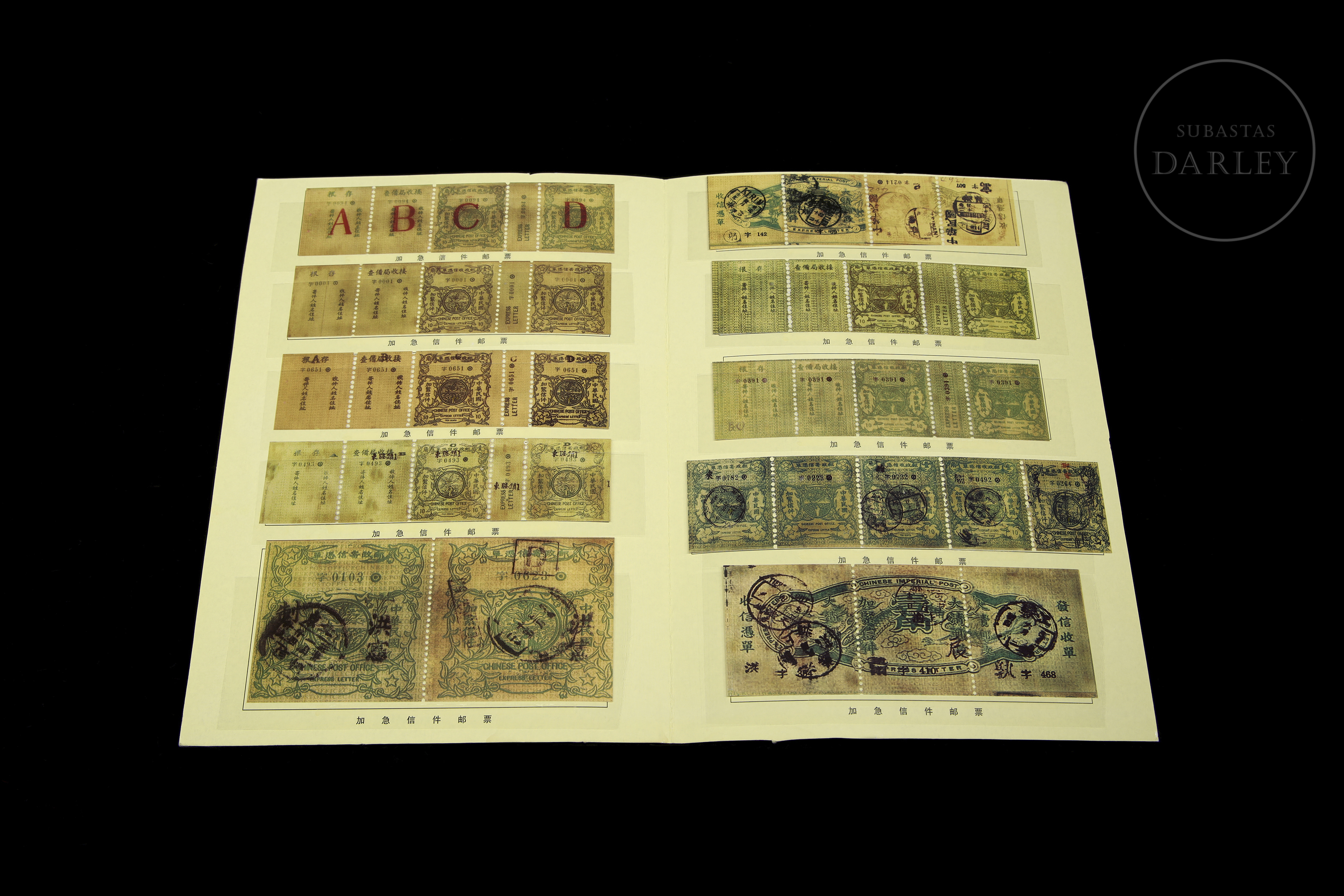 Álbum de coleccionista que presenta un total de 44 sellos que se utilizaron para servicios de correo urgente durante la era de la República de China, emitidos por la Administración Postal China, un servicio que se suspendió alrededor de 1916.