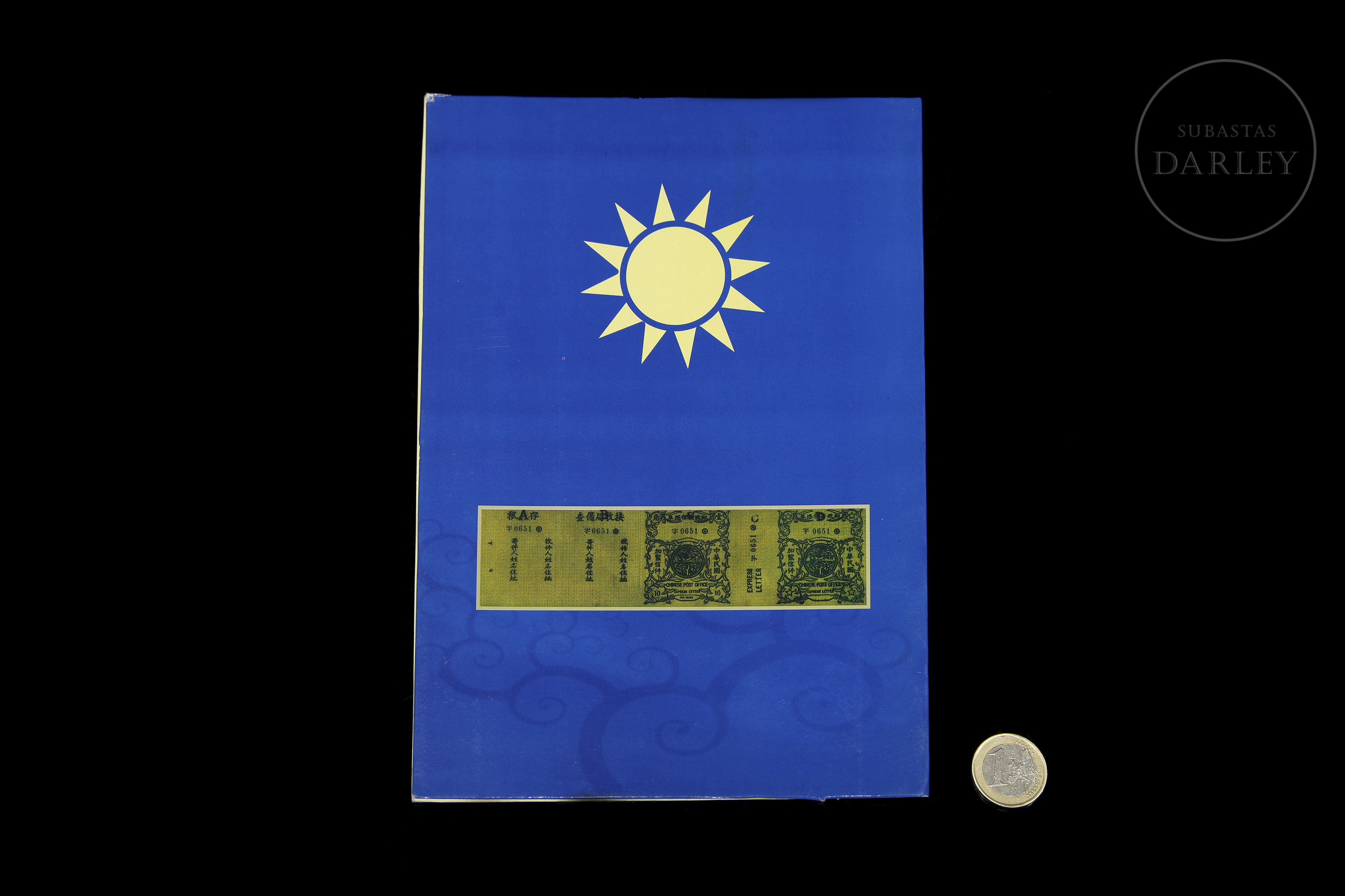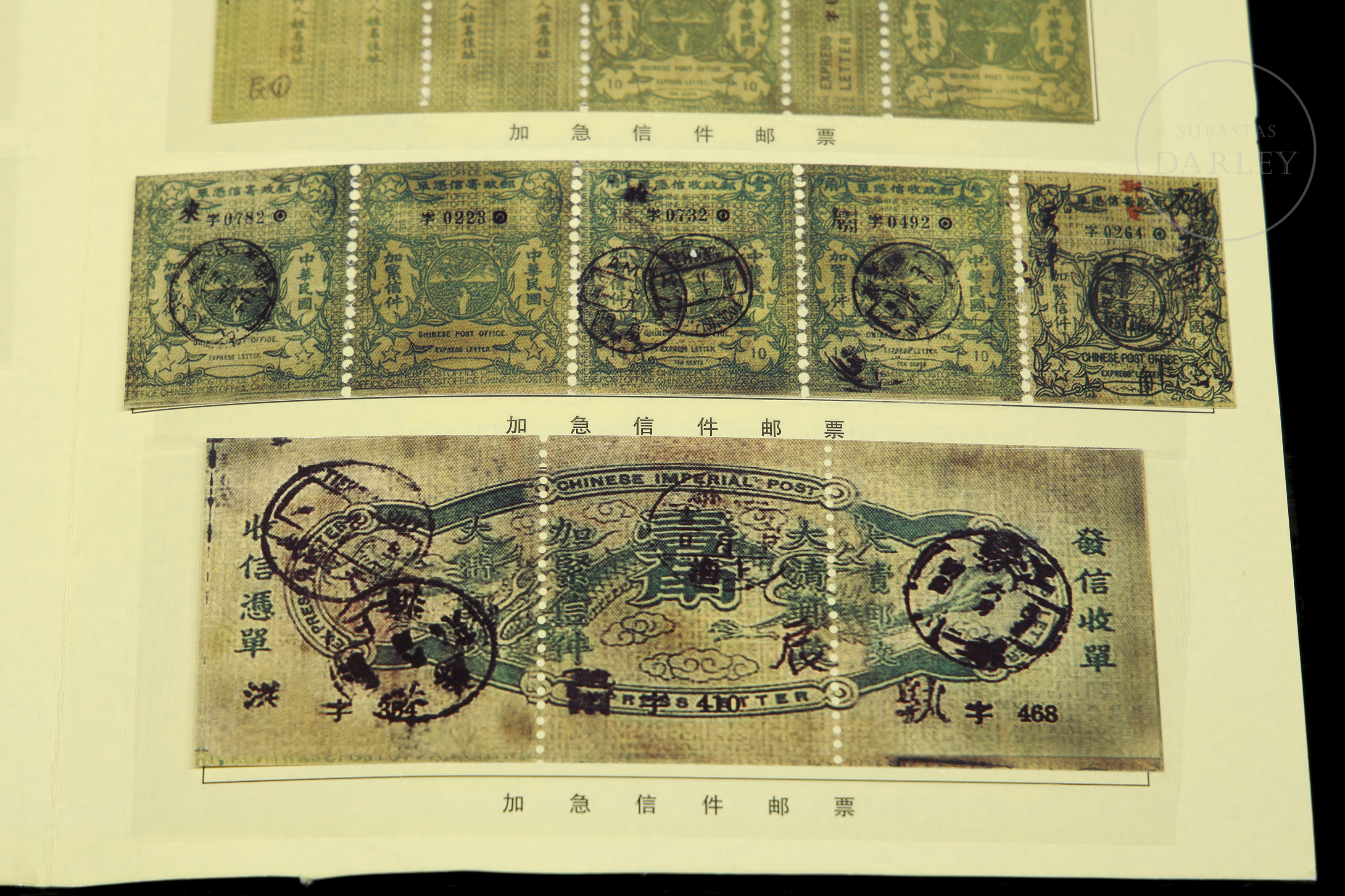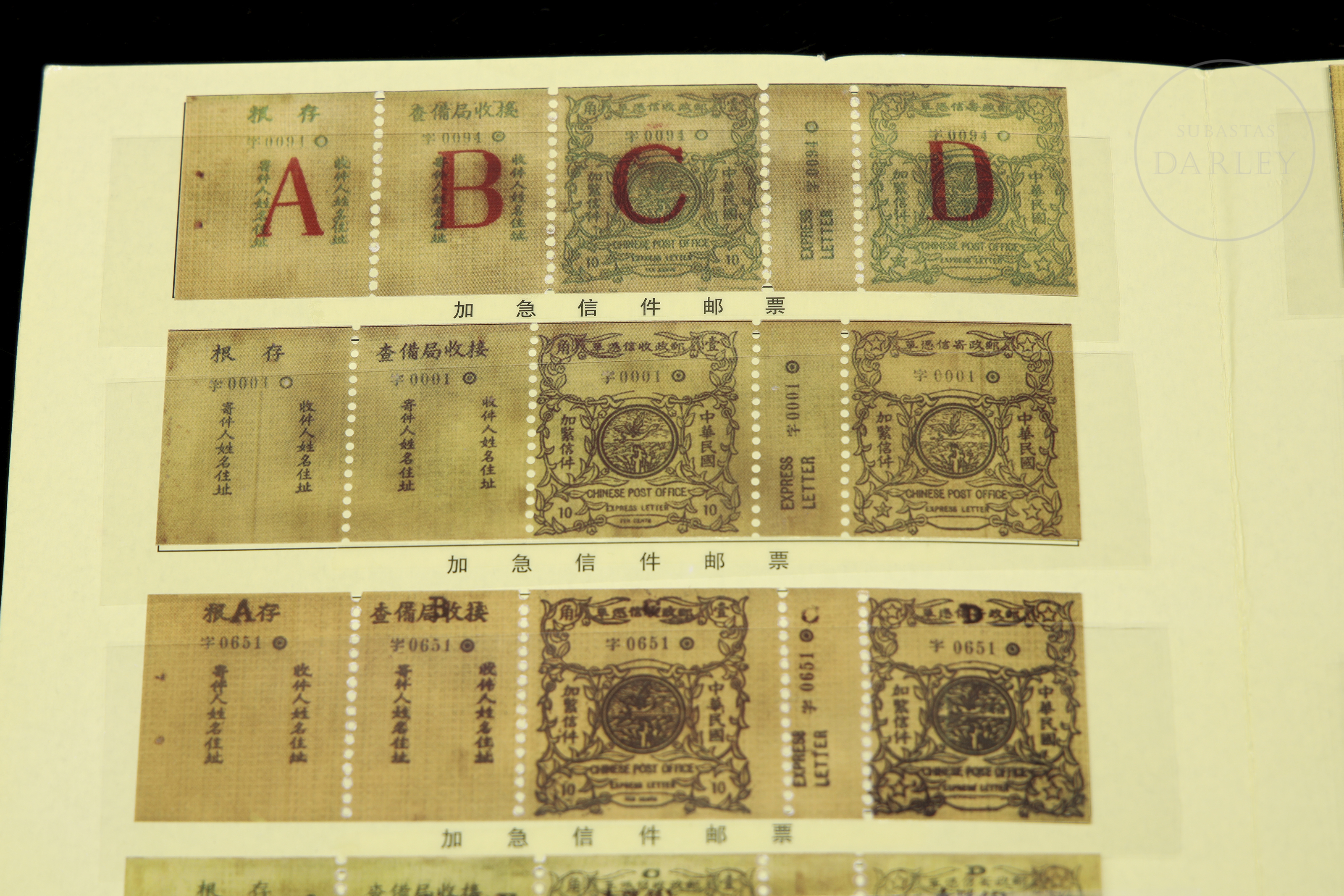 Álbum de coleccionista que presenta un total de 44 sellos que se utilizaron para servicios de correo urgente durante la era de la República de China, emitidos por la Administración Postal China, un servicio que se suspendió alrededor de 1916.