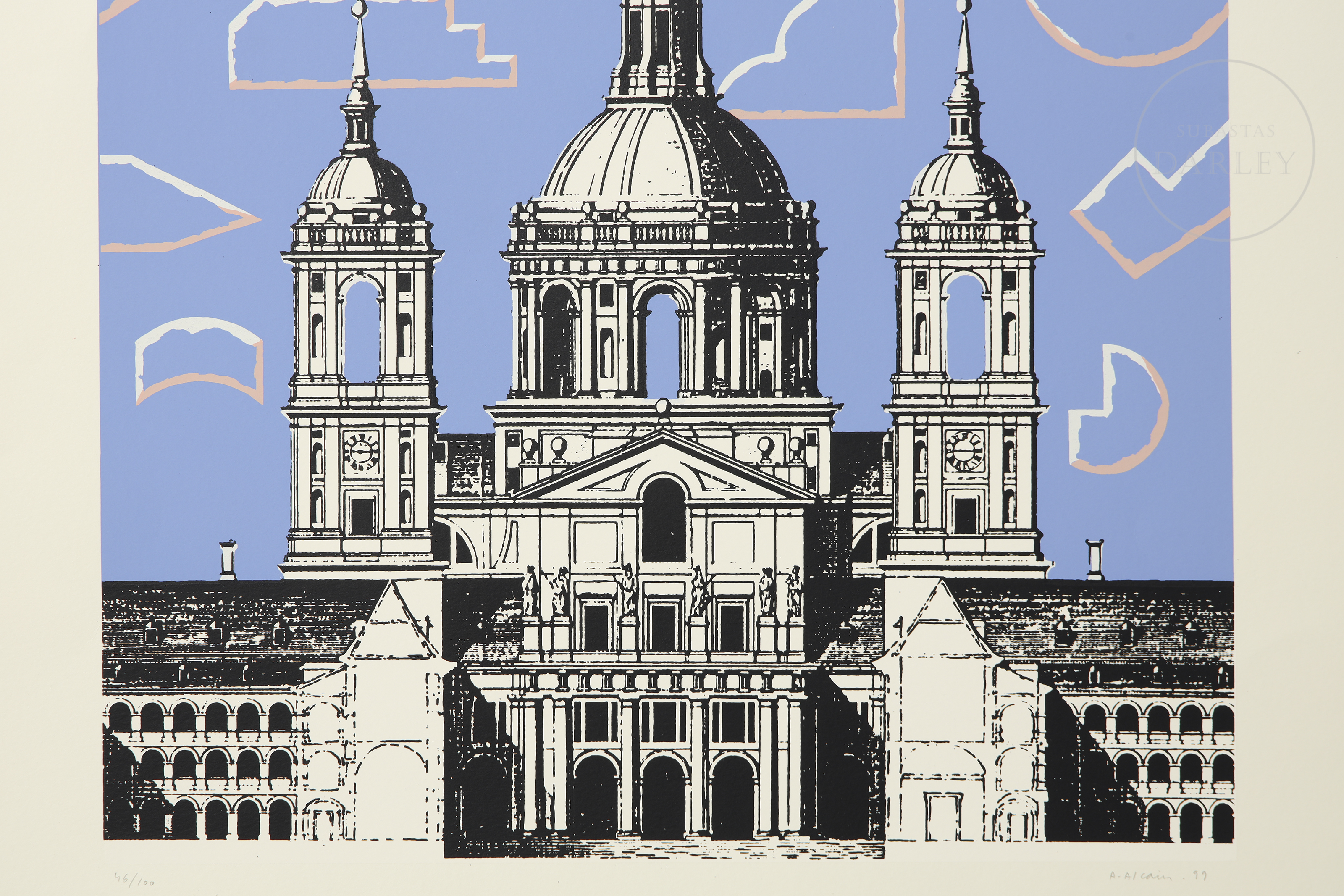 Serigrafía sobre papel. Representación de la fachada principal del Monasterio de El Escorial, enmarcada en un cielo con nubes reinterpretadas mediante formas geométricas. Firmado y fechado "A. Alcain.99" en la esquina inferior derecha y numerado a lápiz "46/100" en la esquina inferior izquierda. Presenta marca de agua.