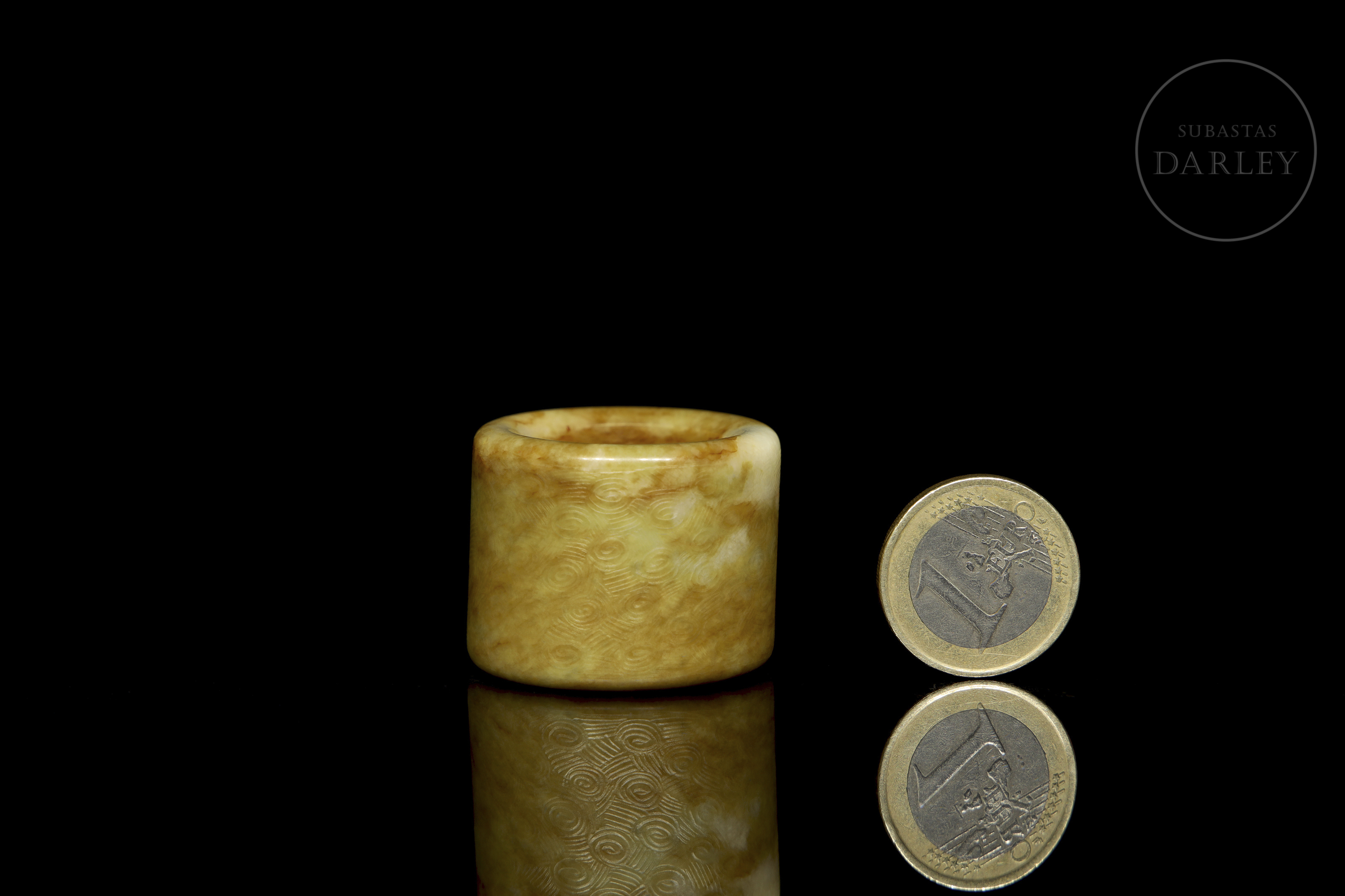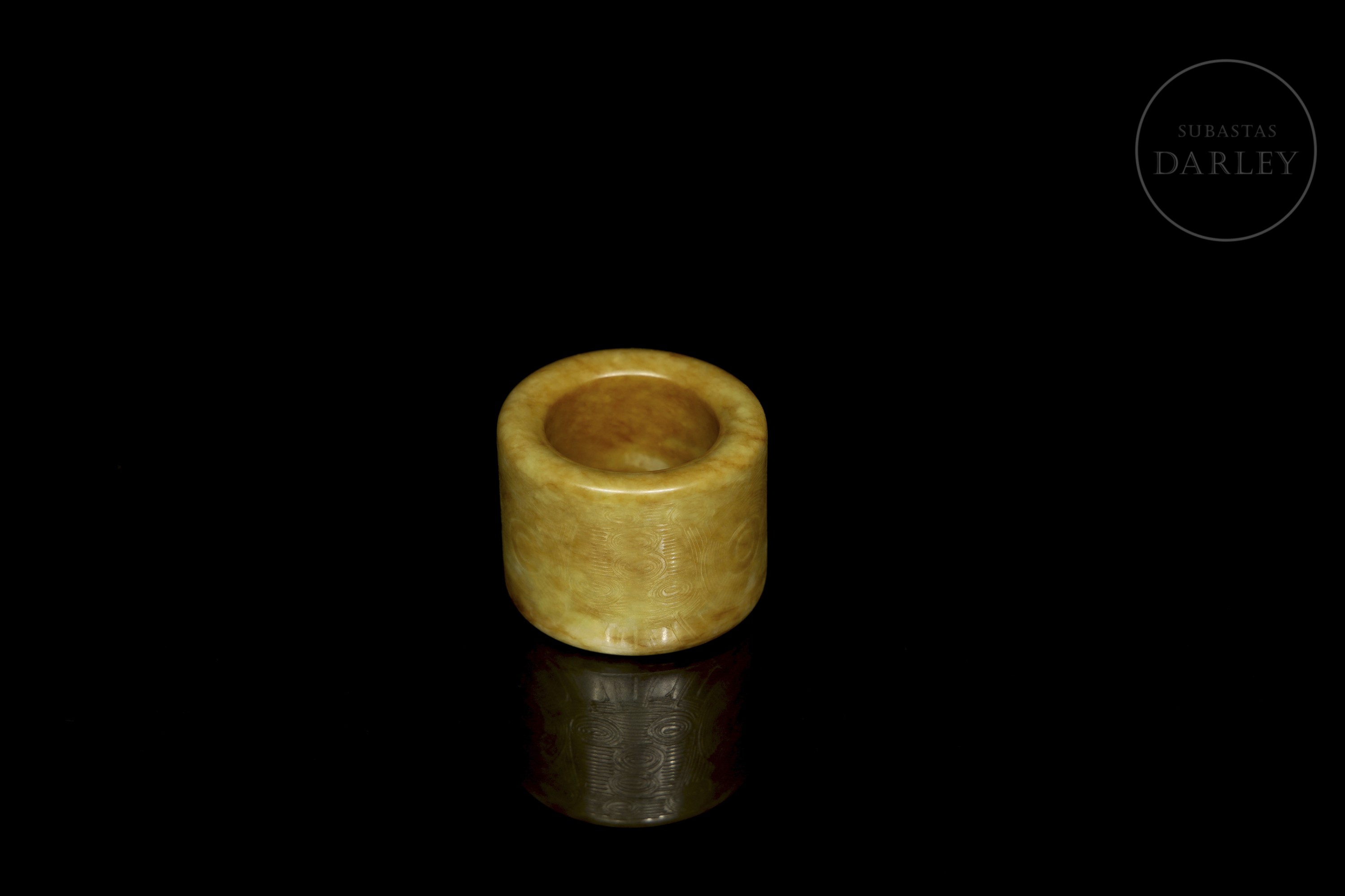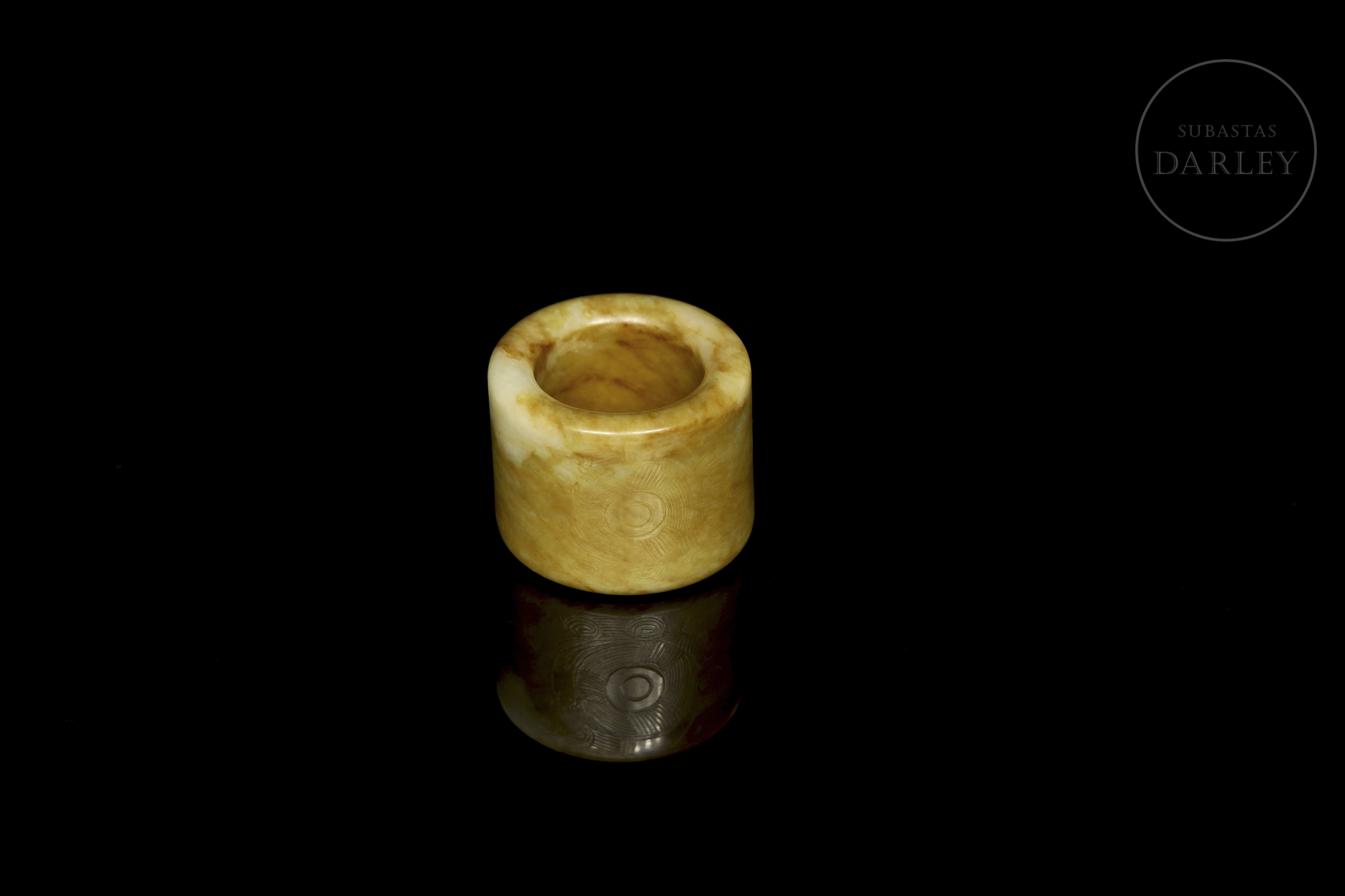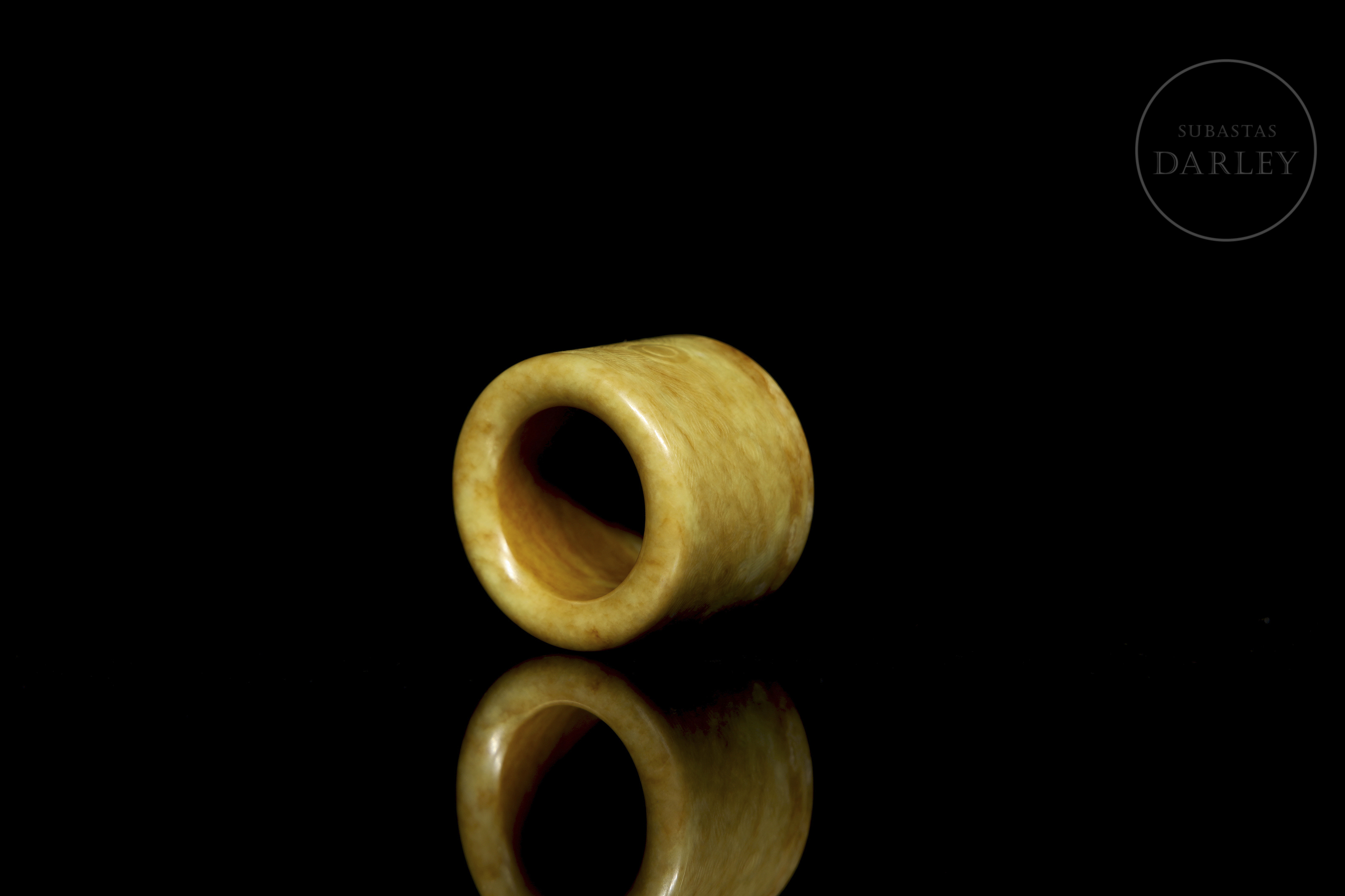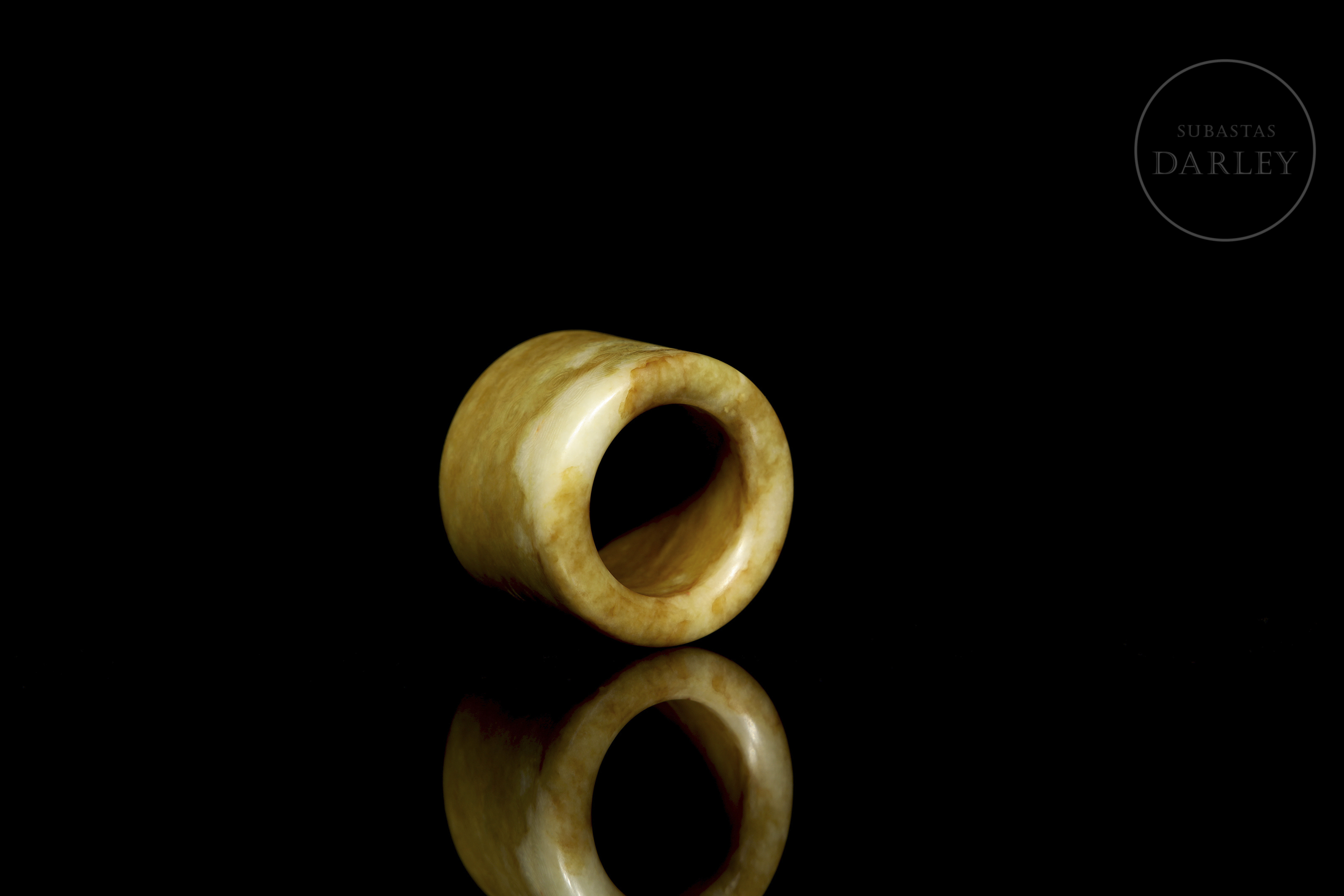 Anillo de arquero de jade, de forma tubular, con el borde superior biselado. La pieza presenta una intensa alteración natural, adquiriendo un color crema y ocre de acabado opaco. La superficie se encuentra adornada con máscaras zoomorfas incisas. Cultura Liangzhu (c. 3300-2300 a.C.).