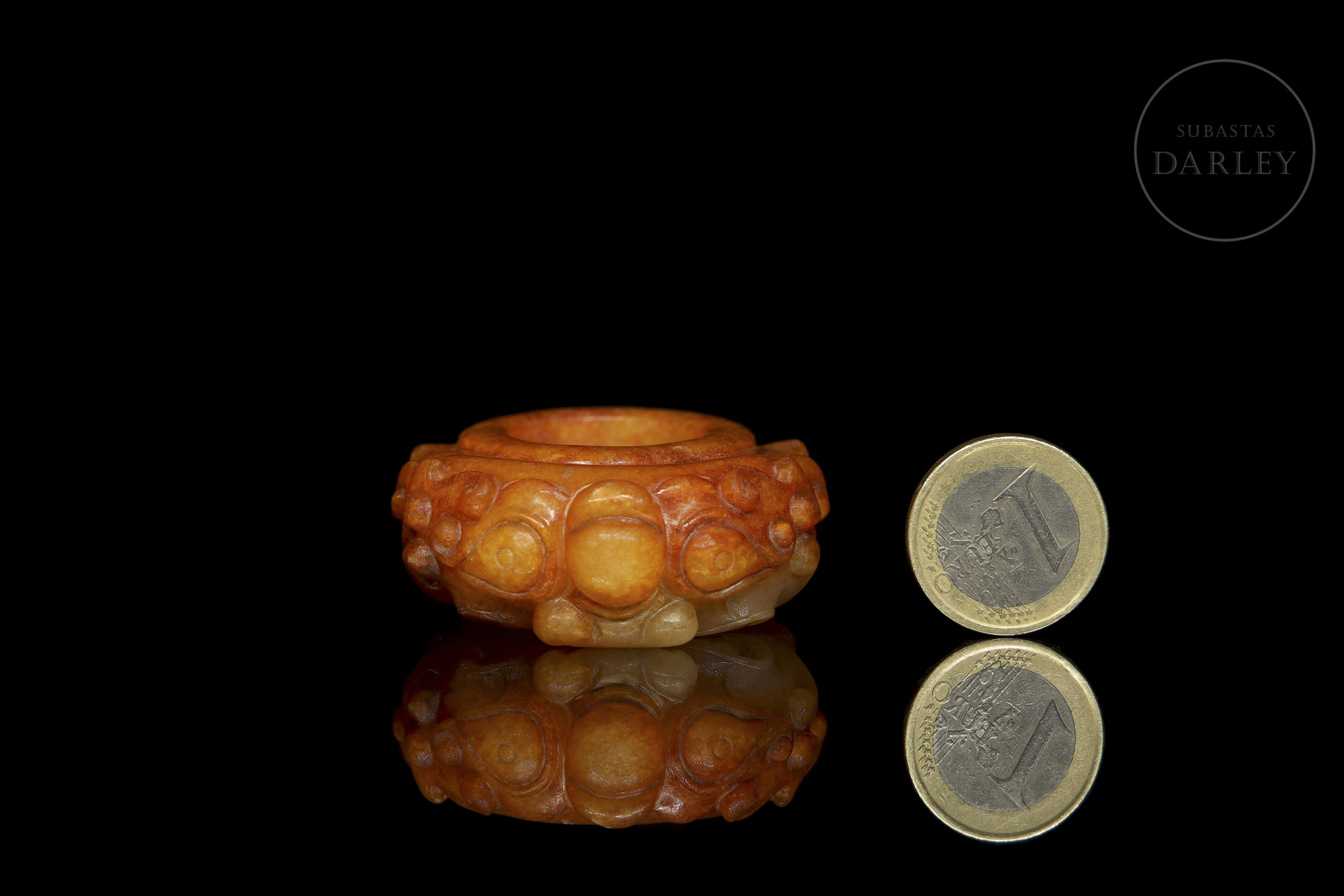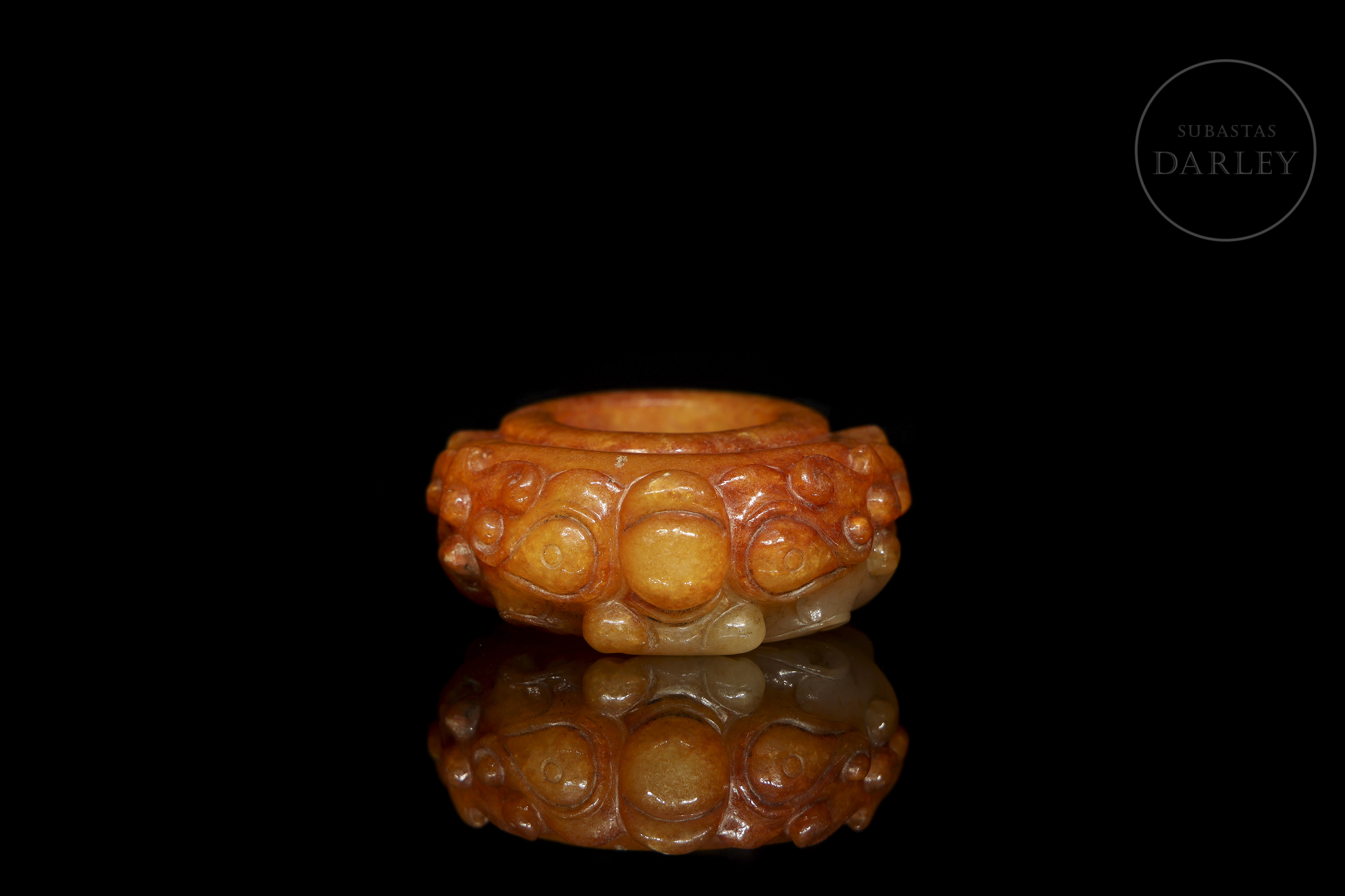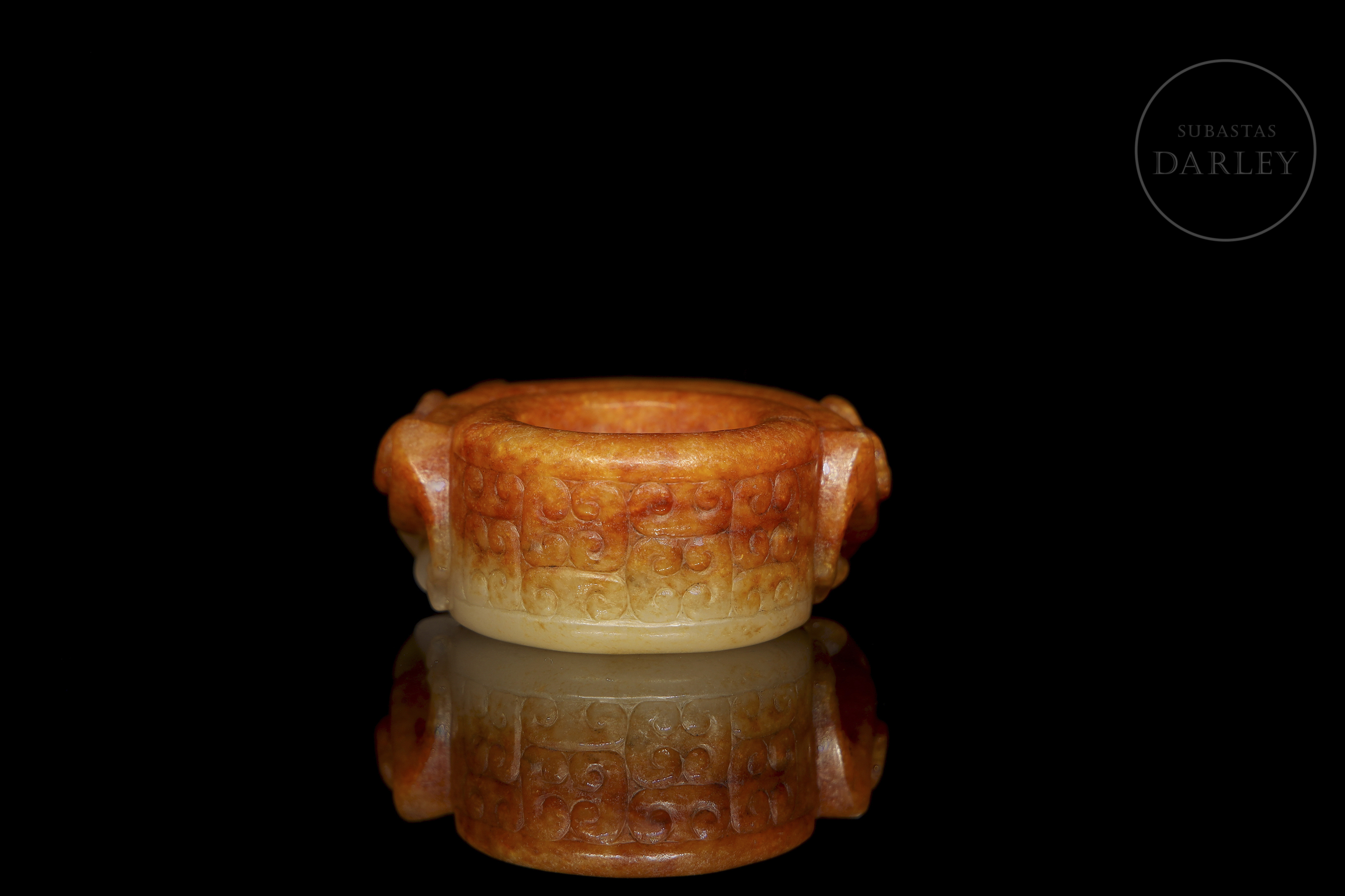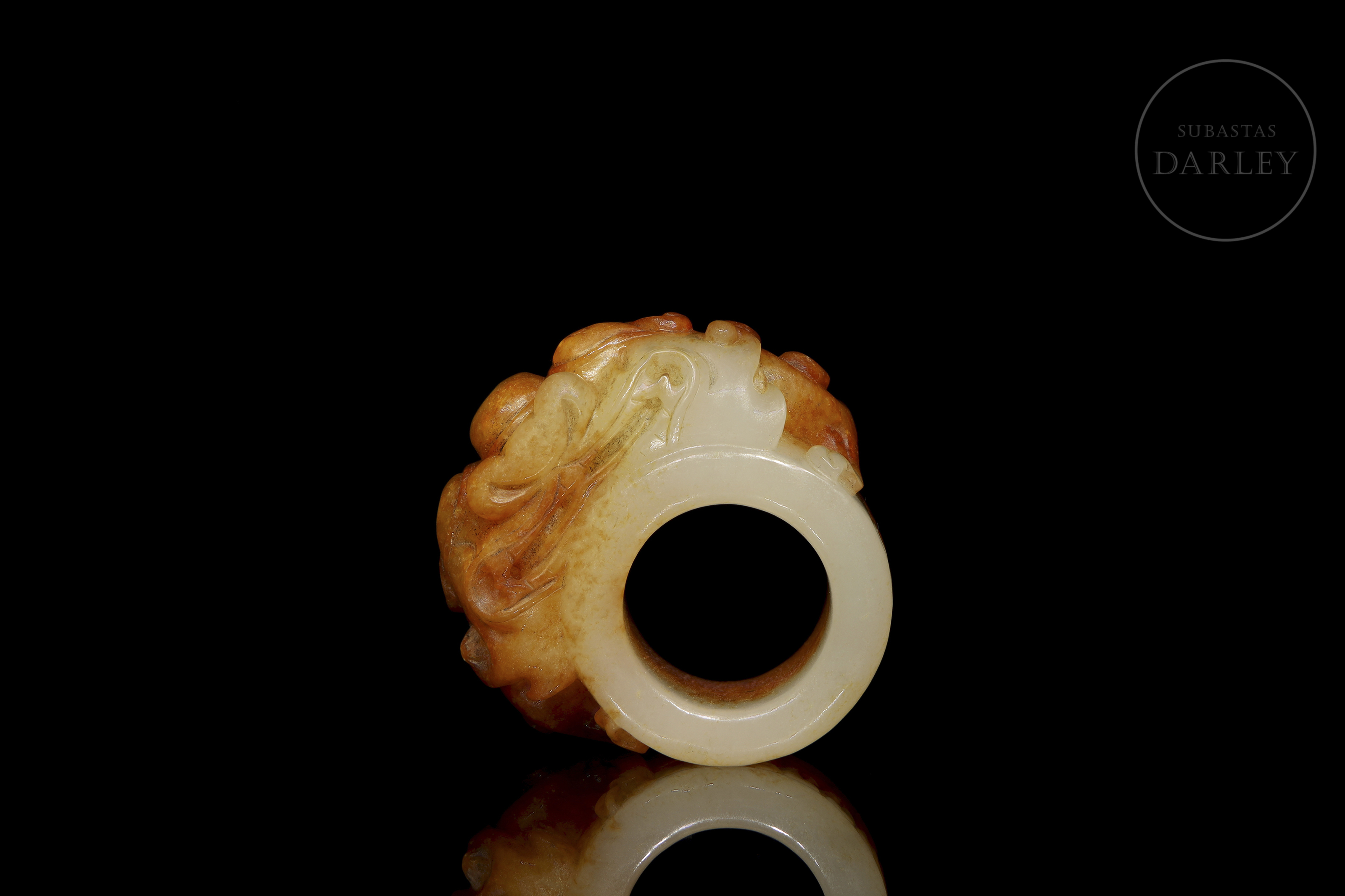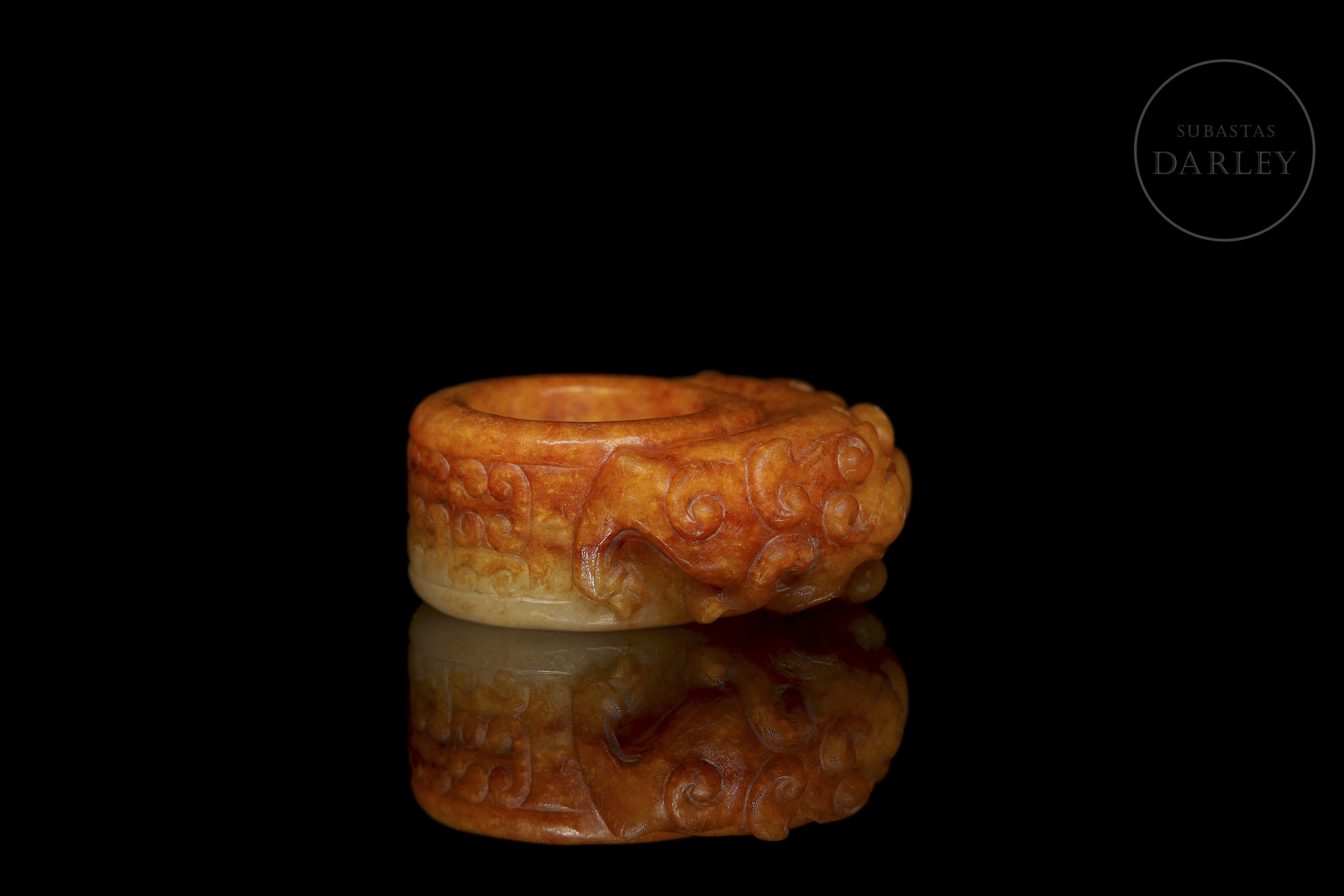 Anillo de jade blanco con una profusa pátina de color ocre rojizo y marrón ferruginoso. La pieza presenta un formato circular con una talla frontal en altorrelieve que representa a una bestia mitológica de expresión feroz, de grandes ojos almendrados, nariz ancha y volutas en relieve que conforman la textura del cuerpo. Con marcas de erosión natural por antigüedad. Dinastía Han (206 a.C. – 220 d.C.) o posterior.