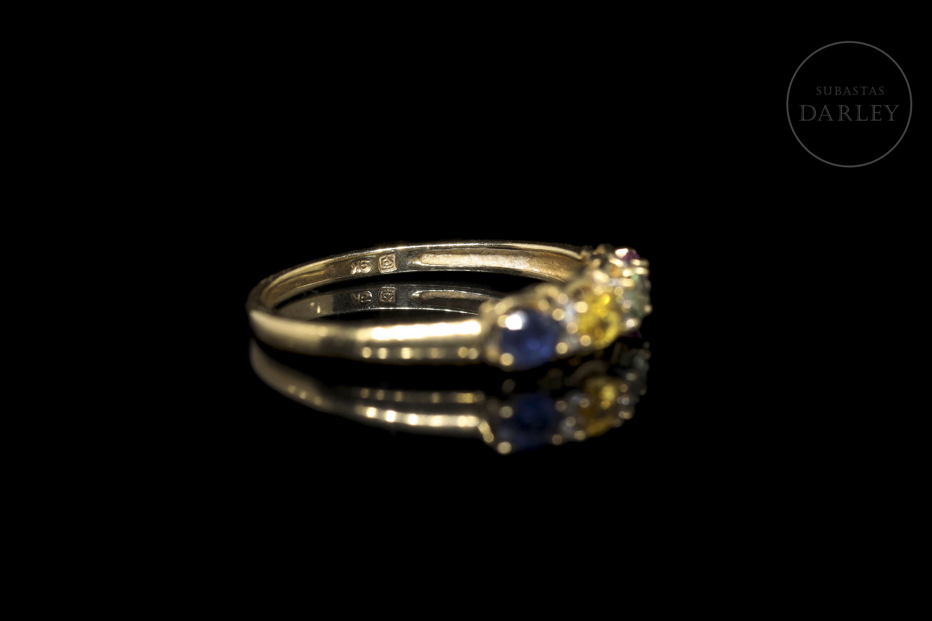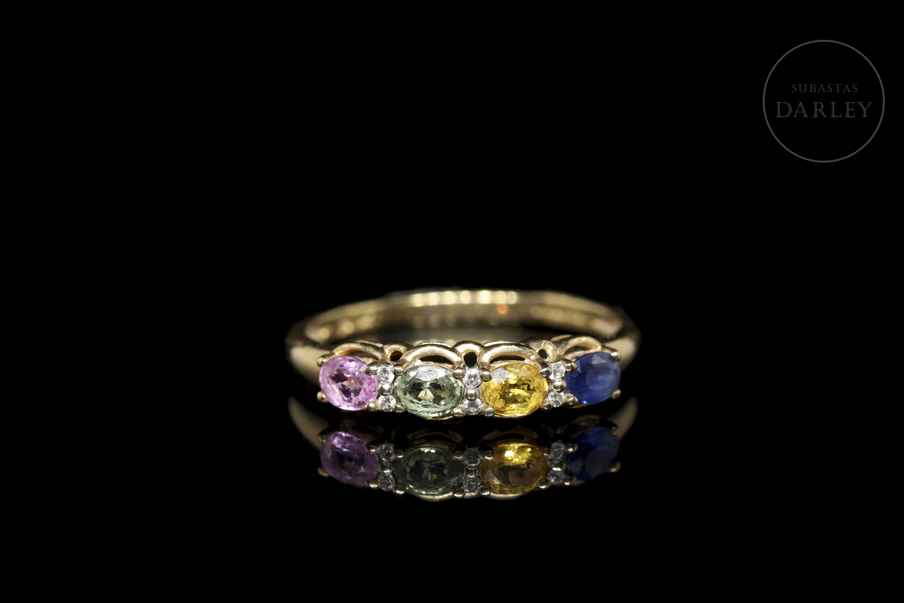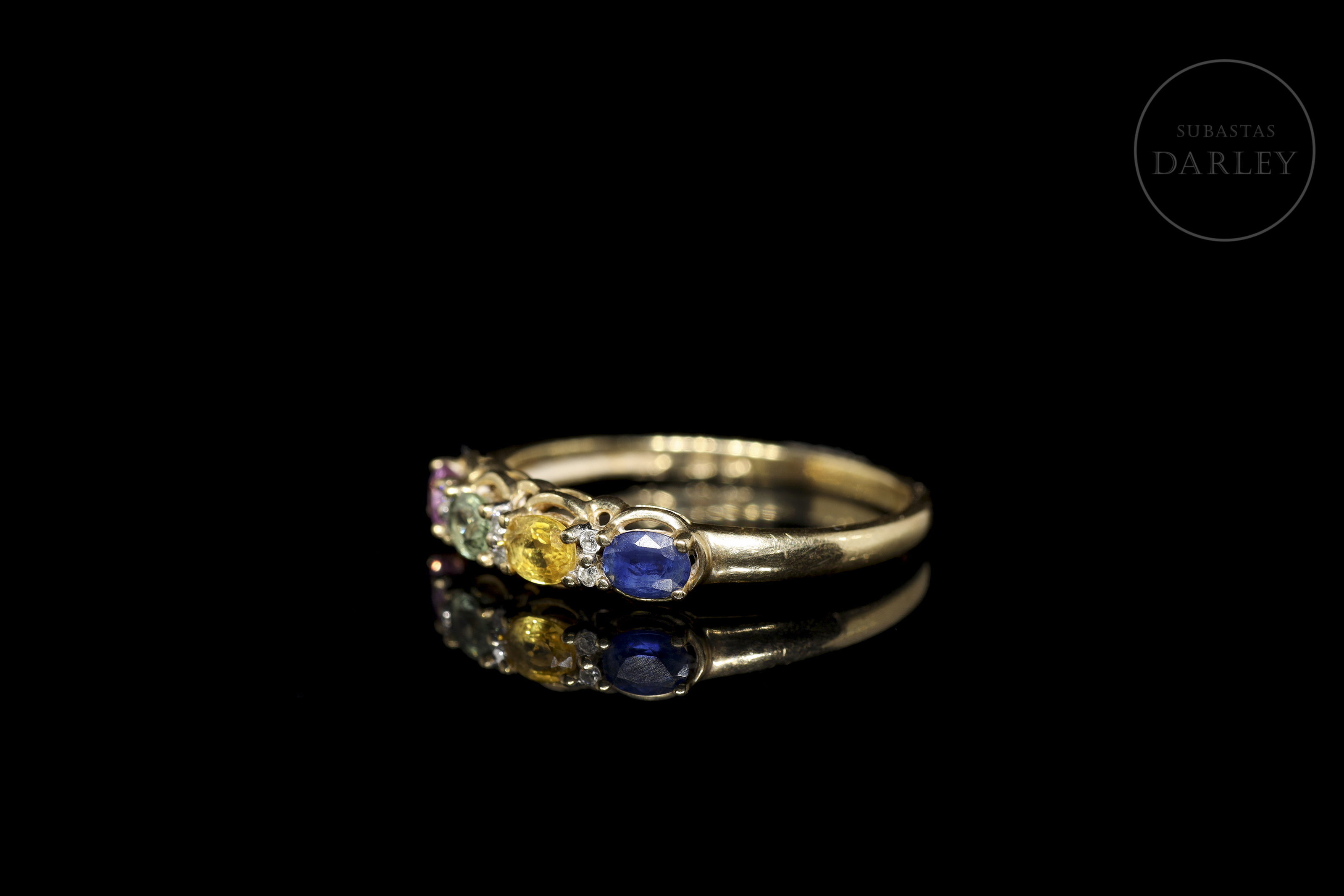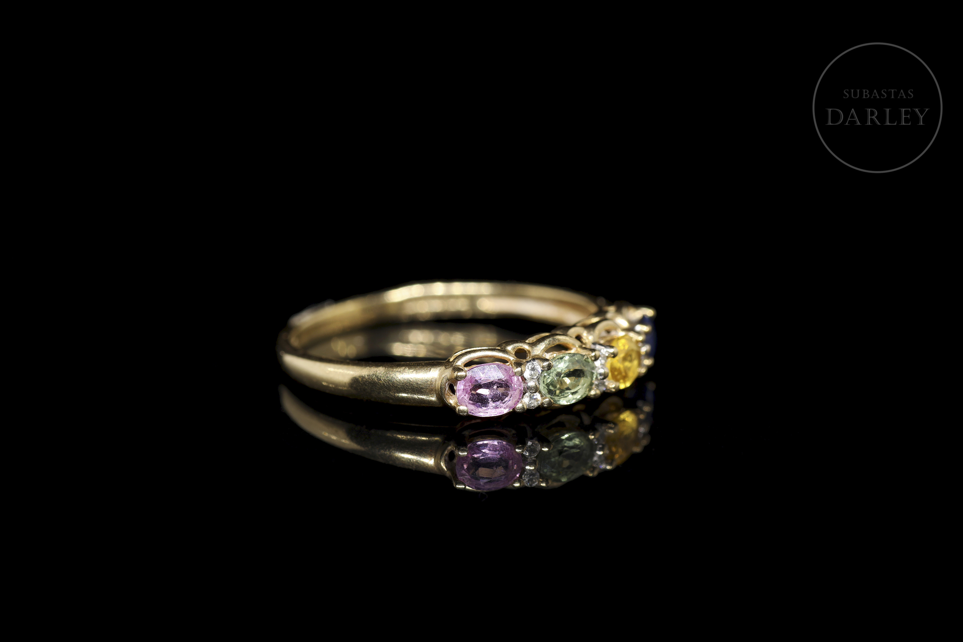Anillo realizado en oro amarillo de 9 kt, decorado en el frente con cuatro gemas ovales de distintos colores, intercaladas con seis pequeños diamantes talla brillante dispuestos verticalmente.