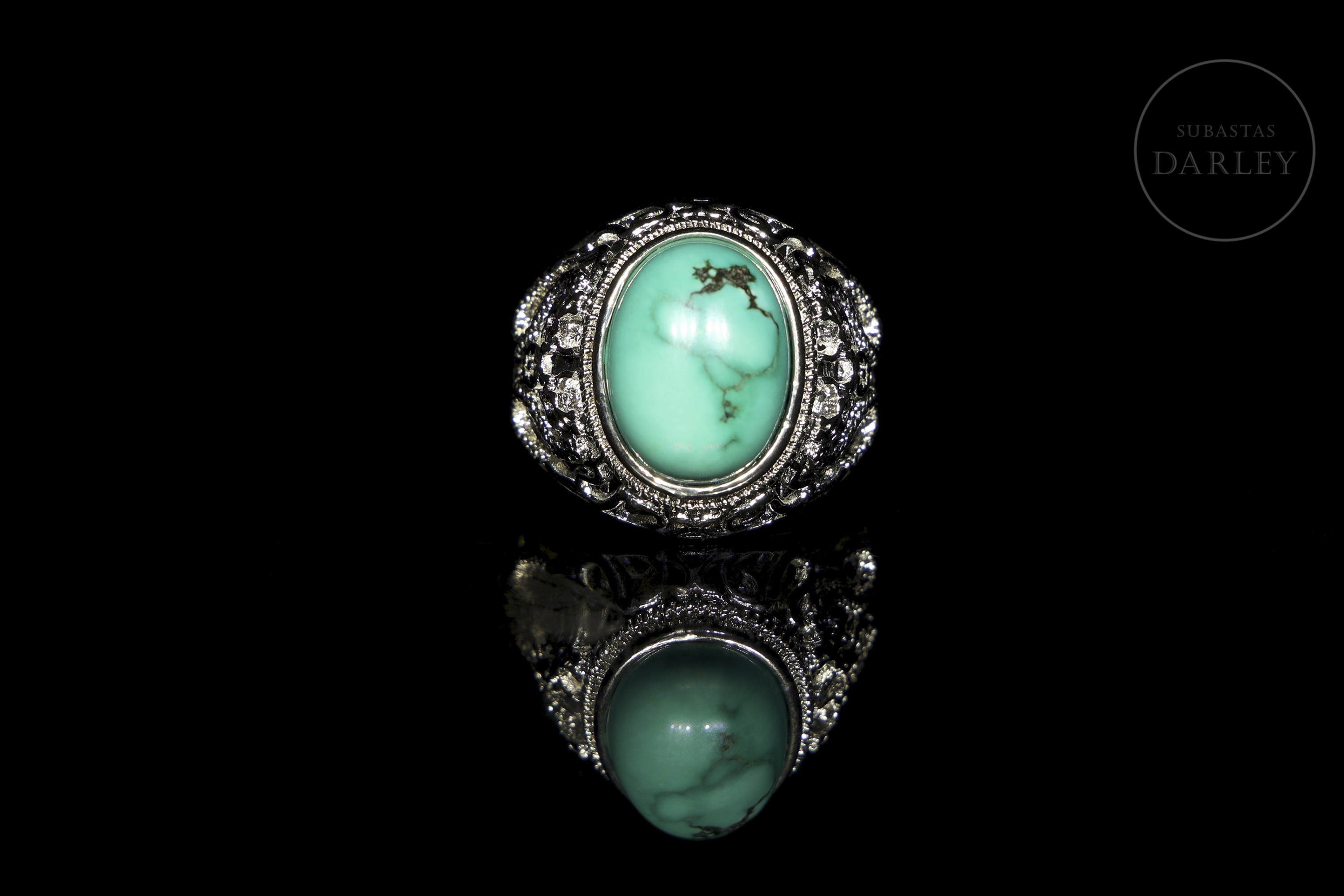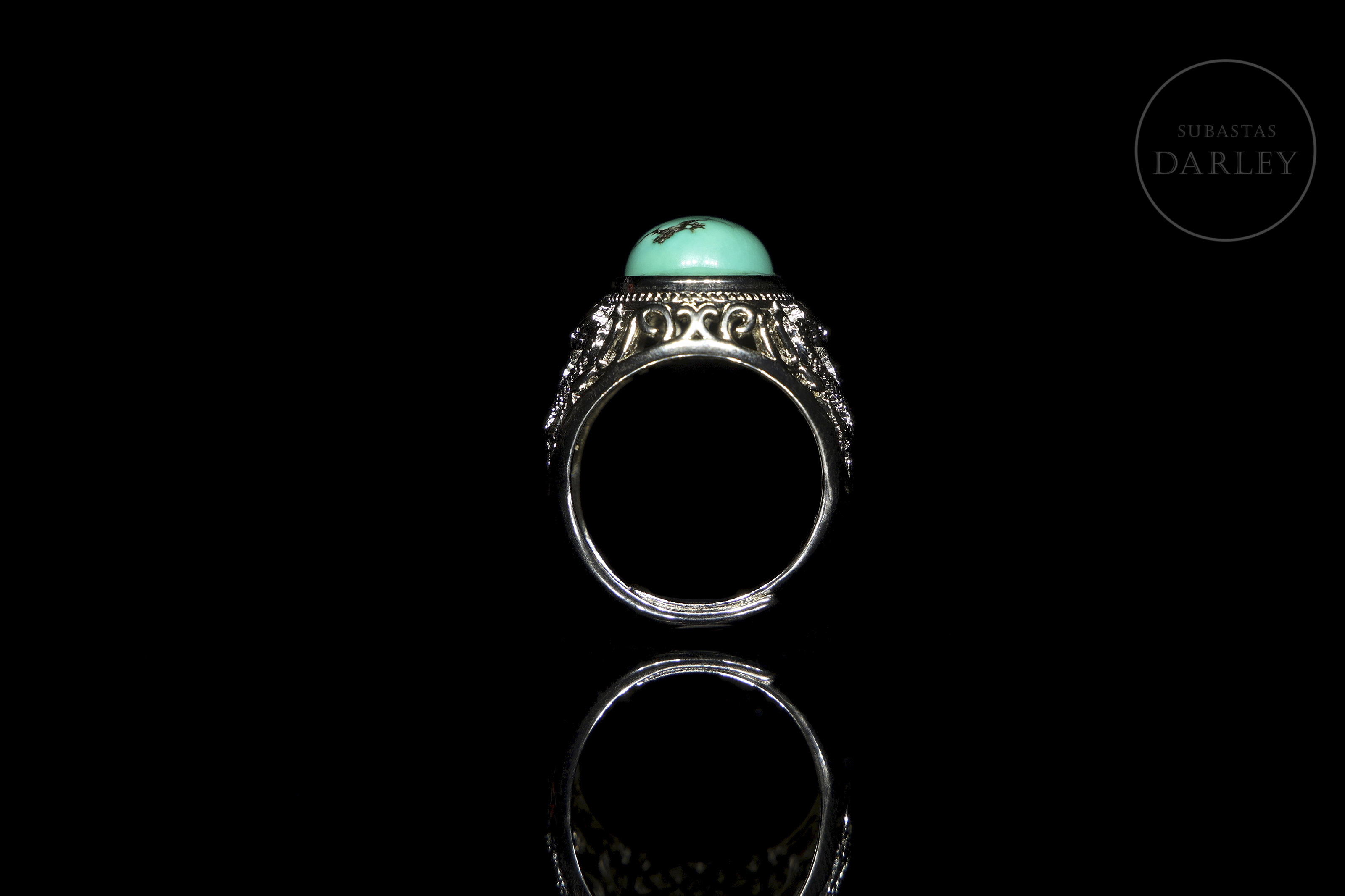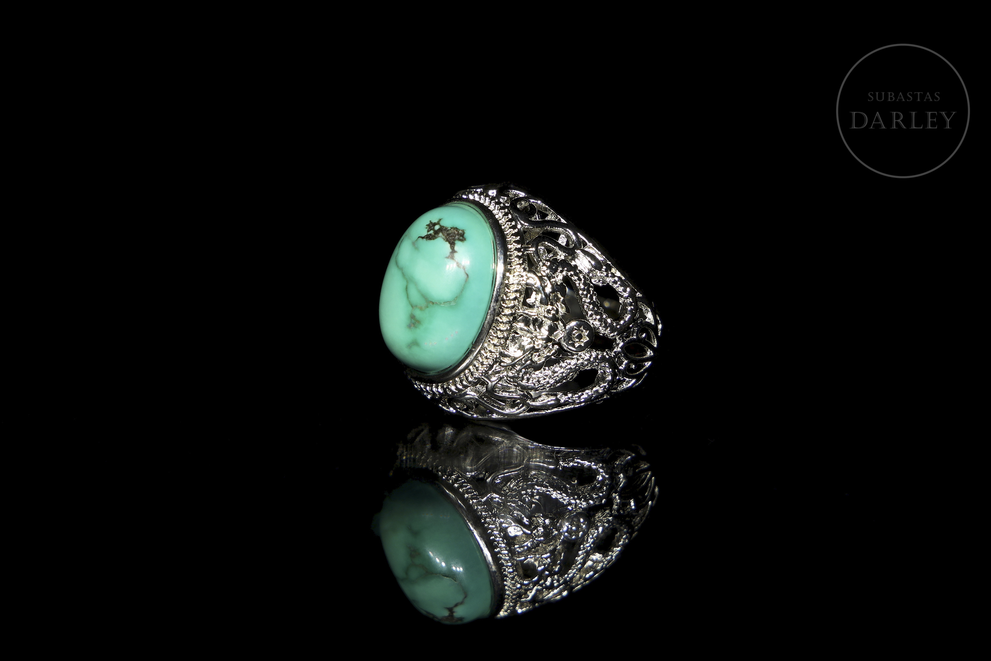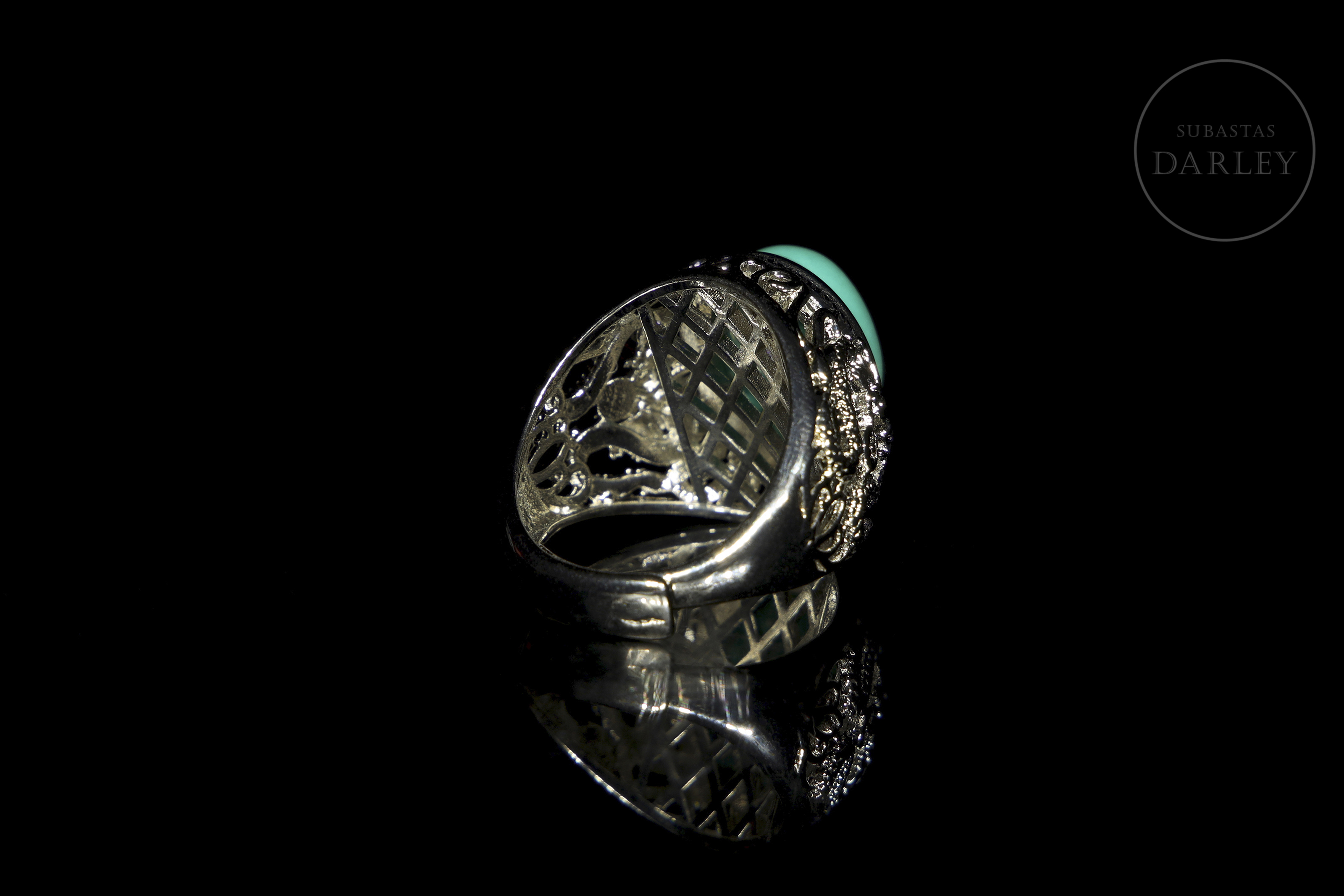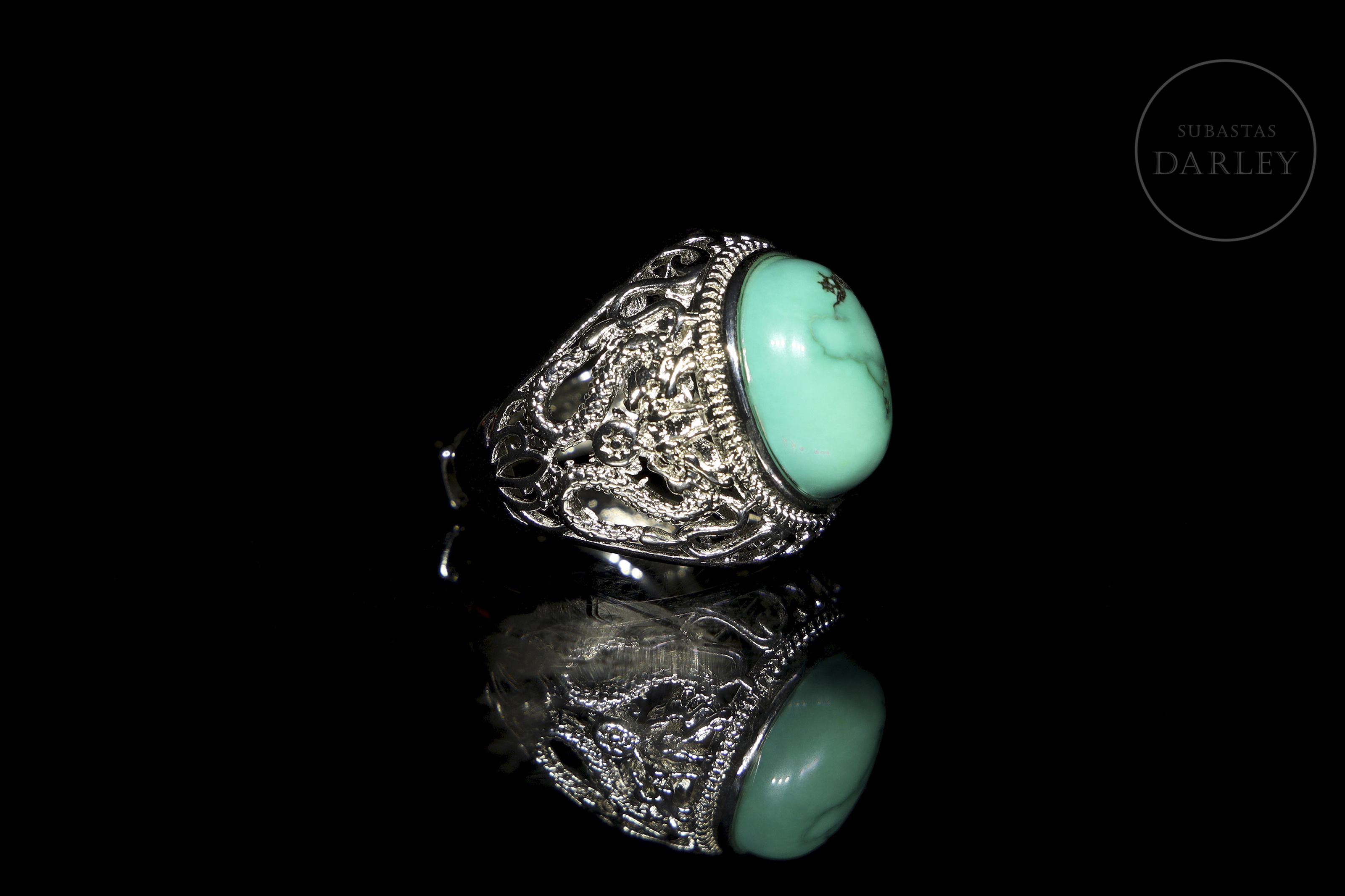 Anillo de plata repujada, de hombros anchos en definición, adornada con detalles de dragones y volutas. Coronado por una turquesa en cabujón engastada.