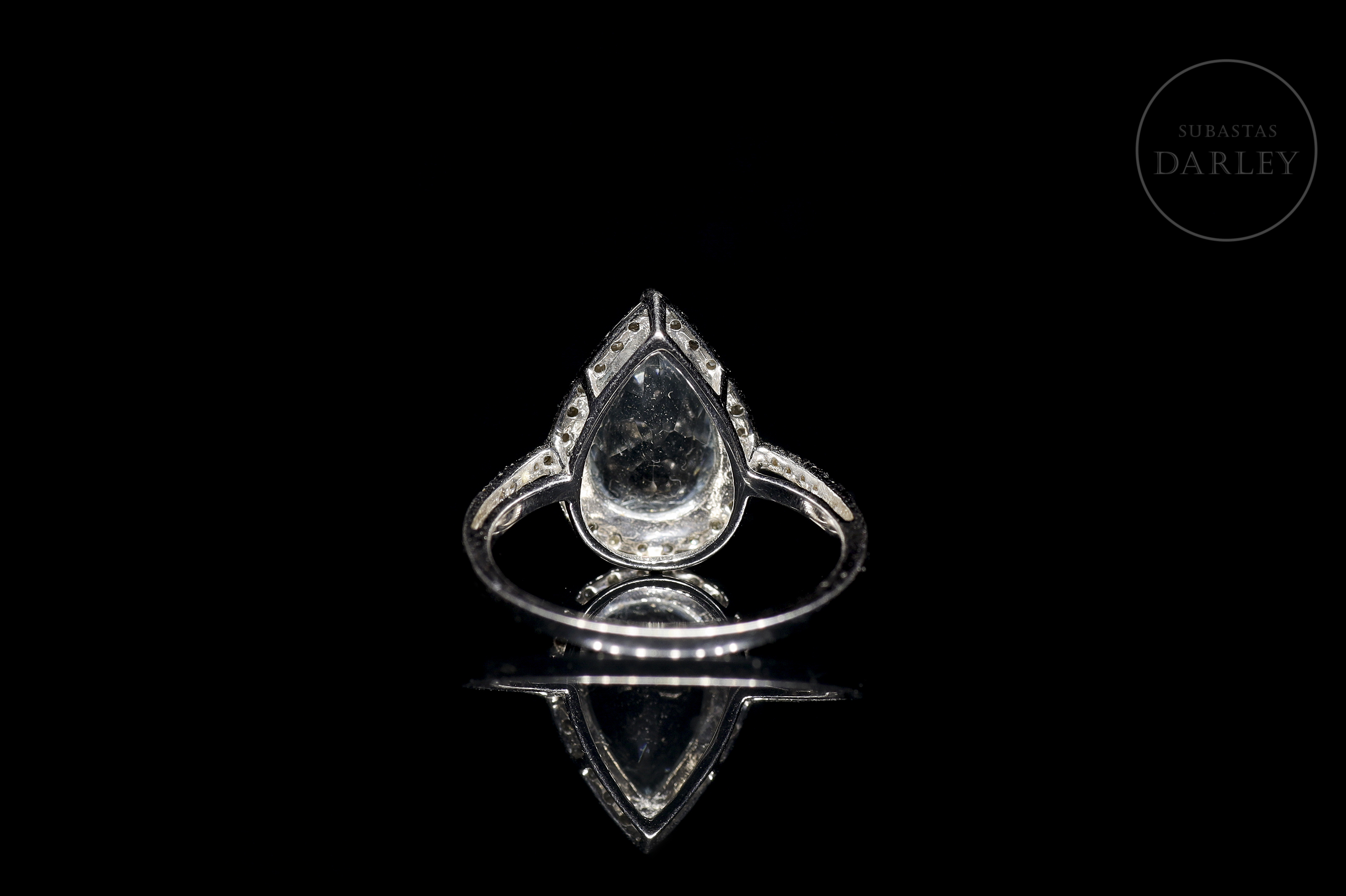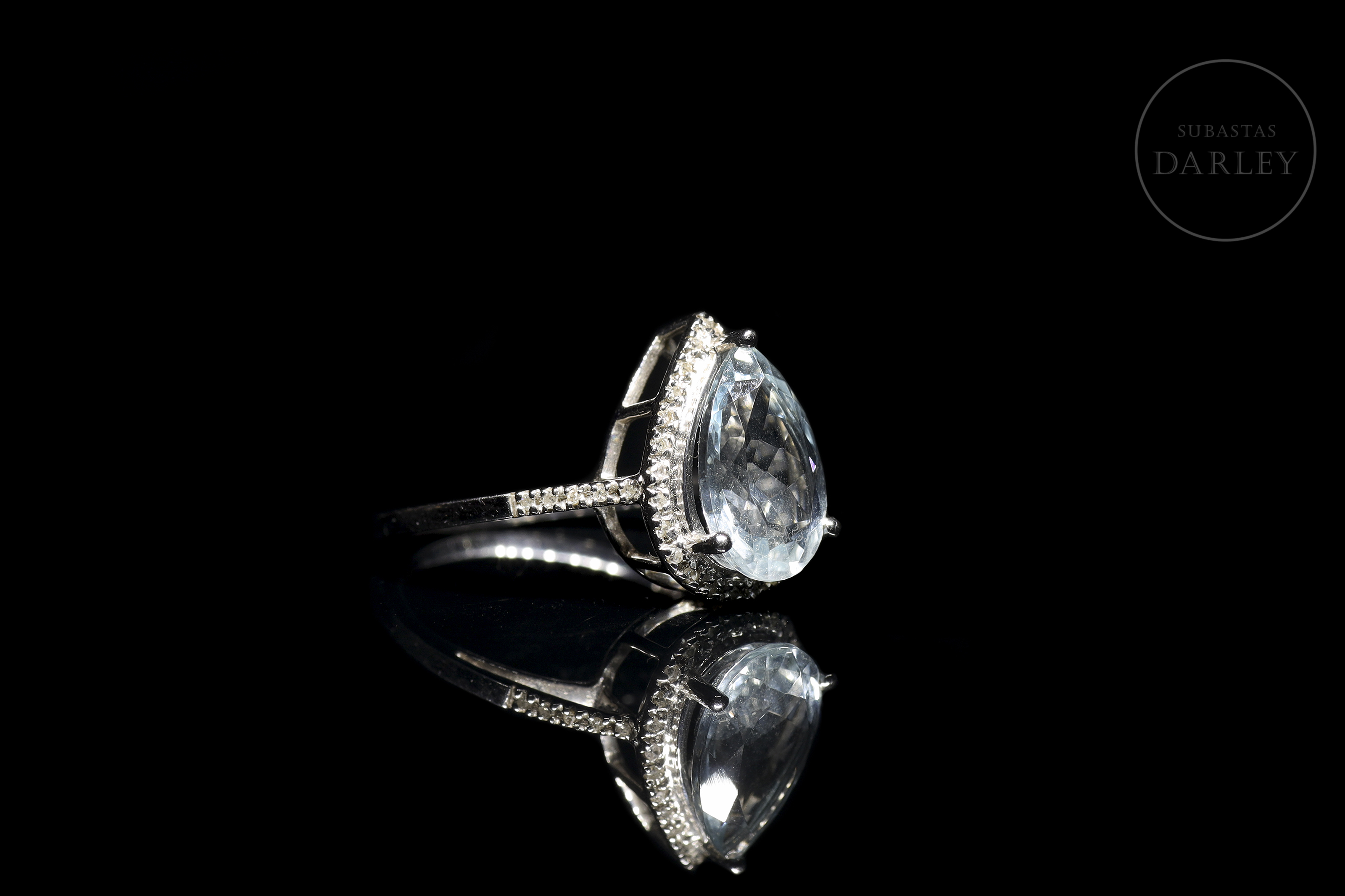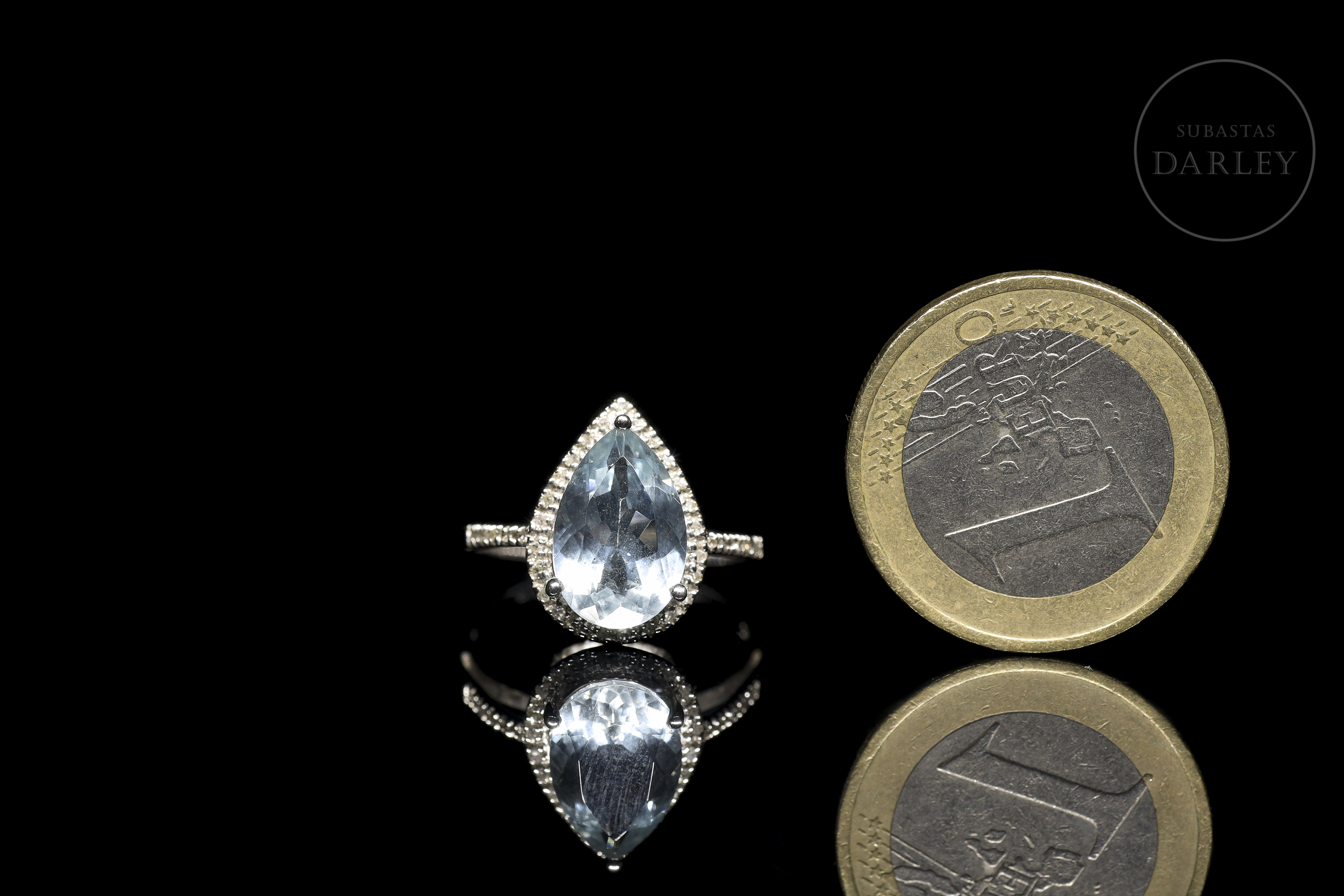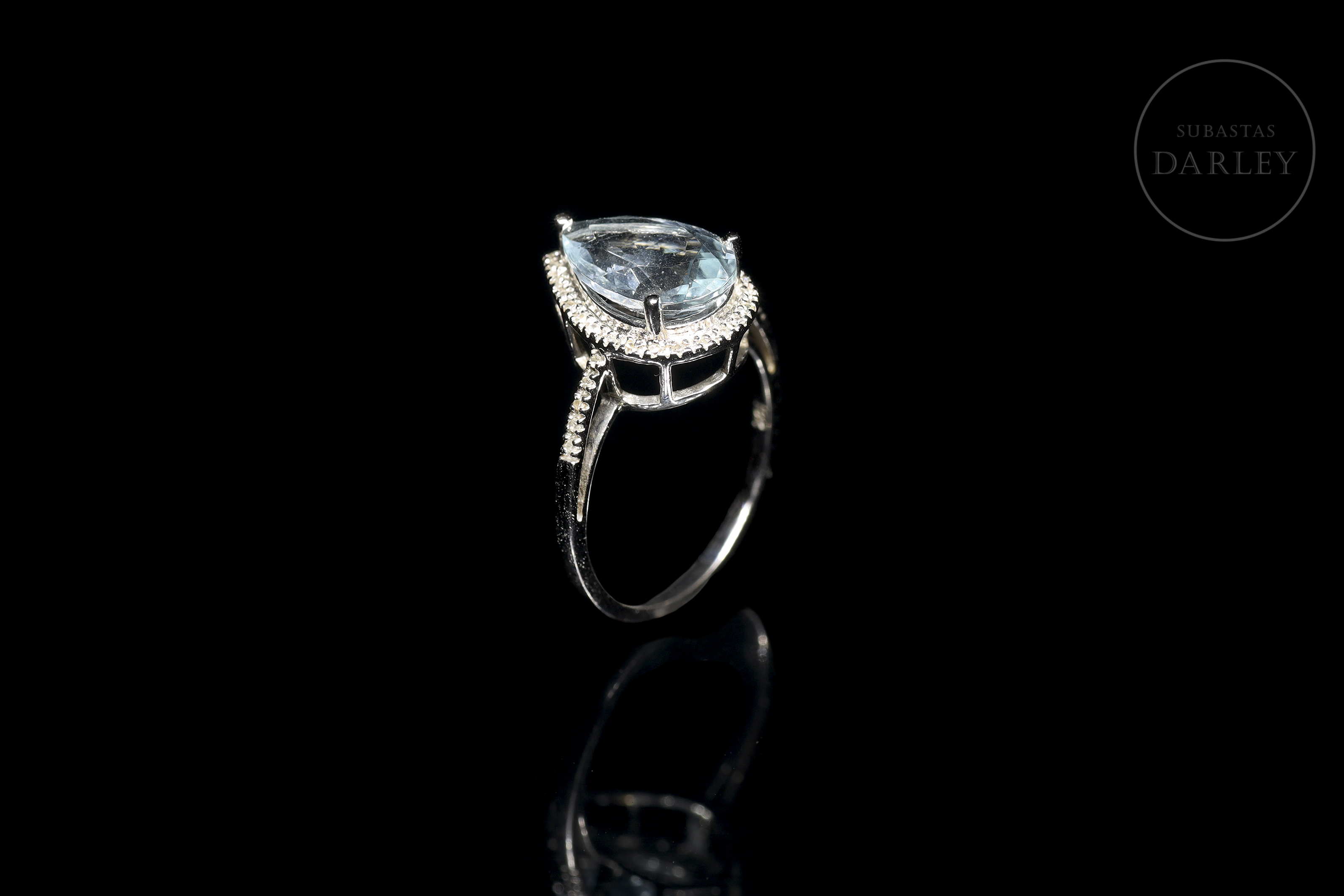 Montura de oro blanco de 18 kt con aguamarina central en color azul claro y talla pera facetada, con un peso total de 2,60 ct, que se engarza mediante tres garras rectas. Adornado por un total de 35 diamantes, talla brillante.