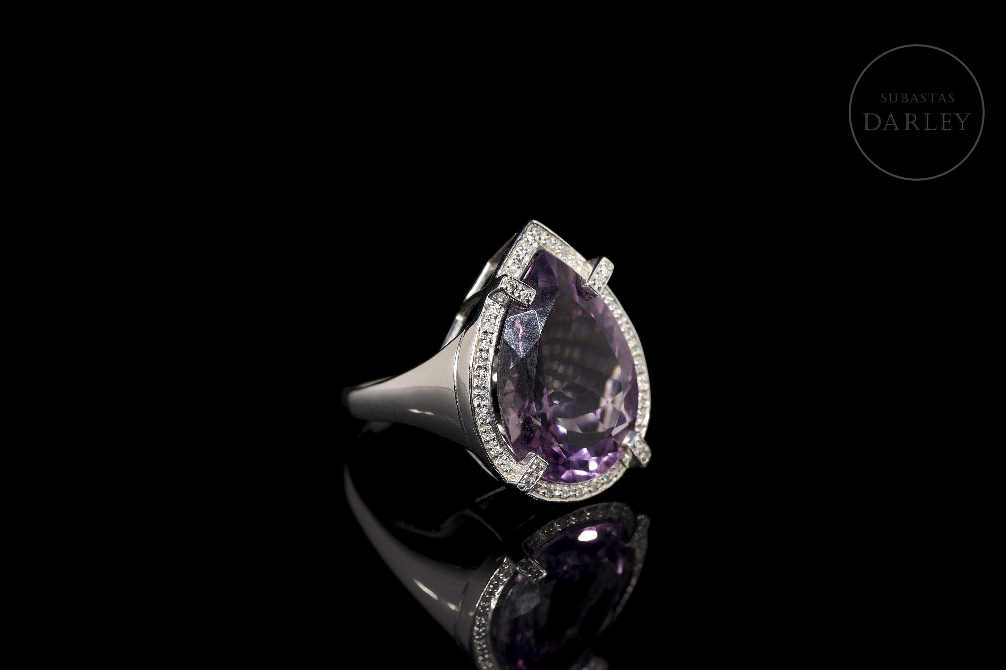 Sortija de brazo plano y anchos hombros presidida por una amatista en talla pera facetada y color morado oscuro, peso aproximado de 12,50 ct. Se remata con un bisel, decorado con 42 diamantes de talla brillante y engarzados en garra, del que surgen cuatro garras con forma de abrazadera.