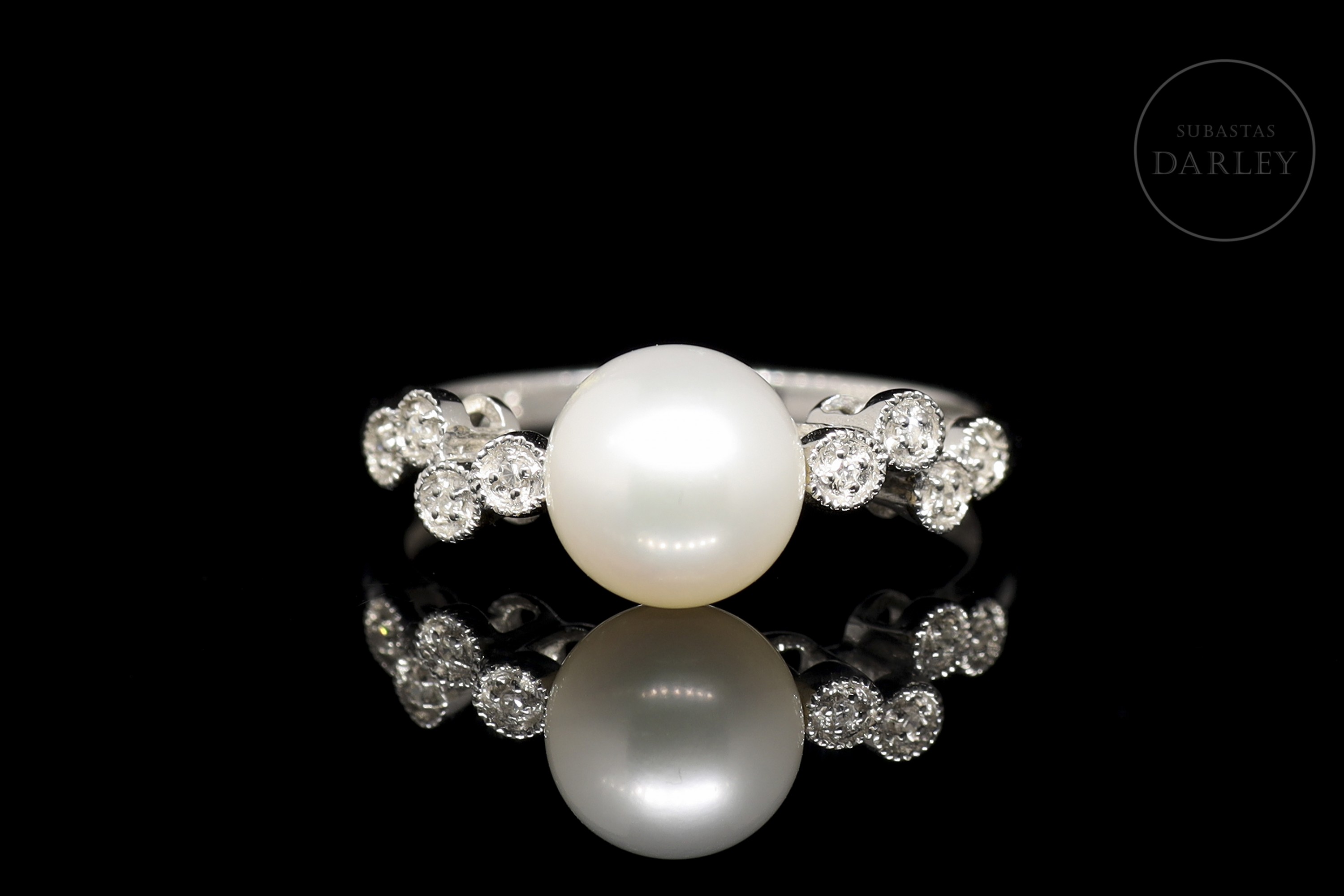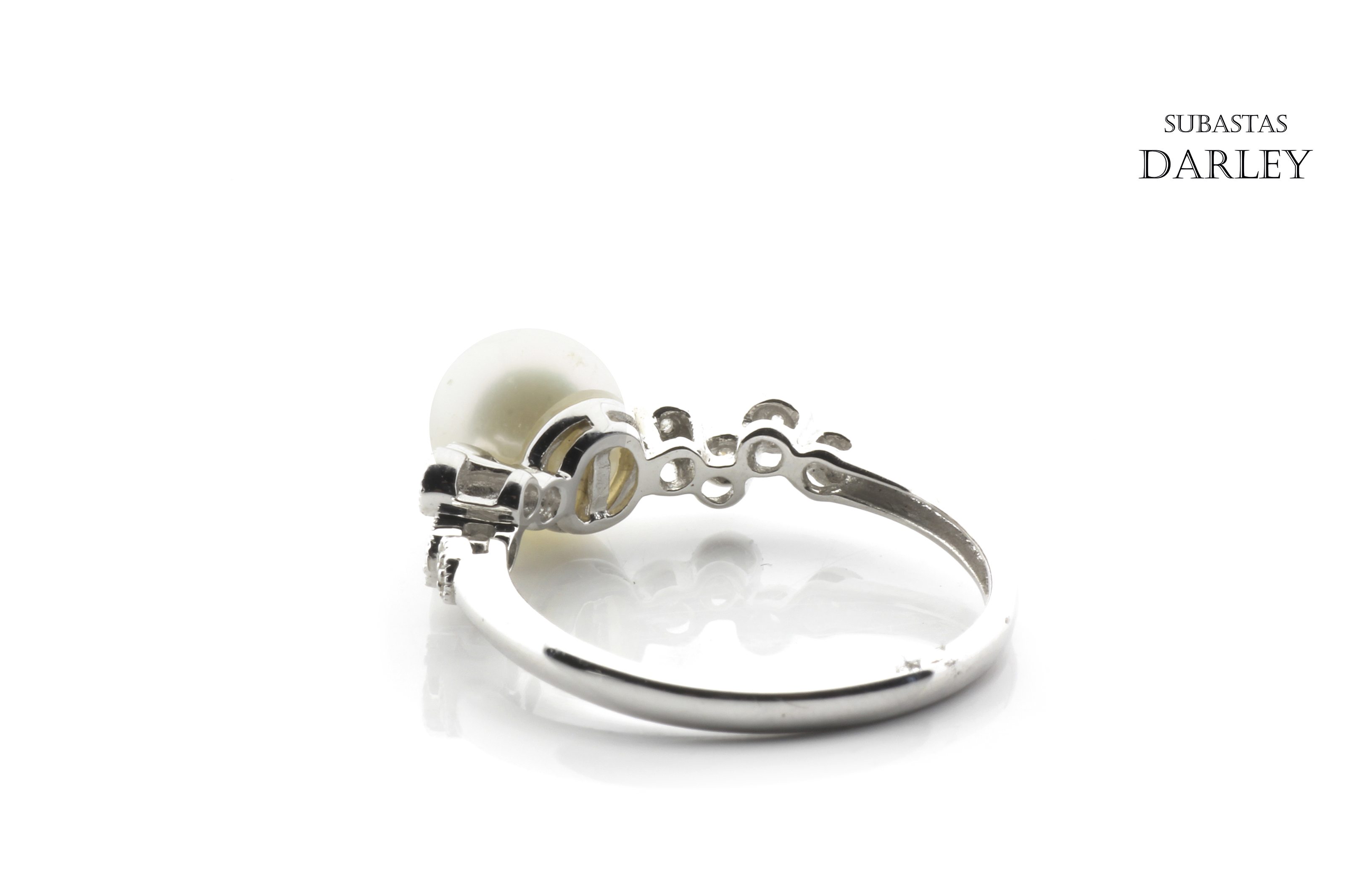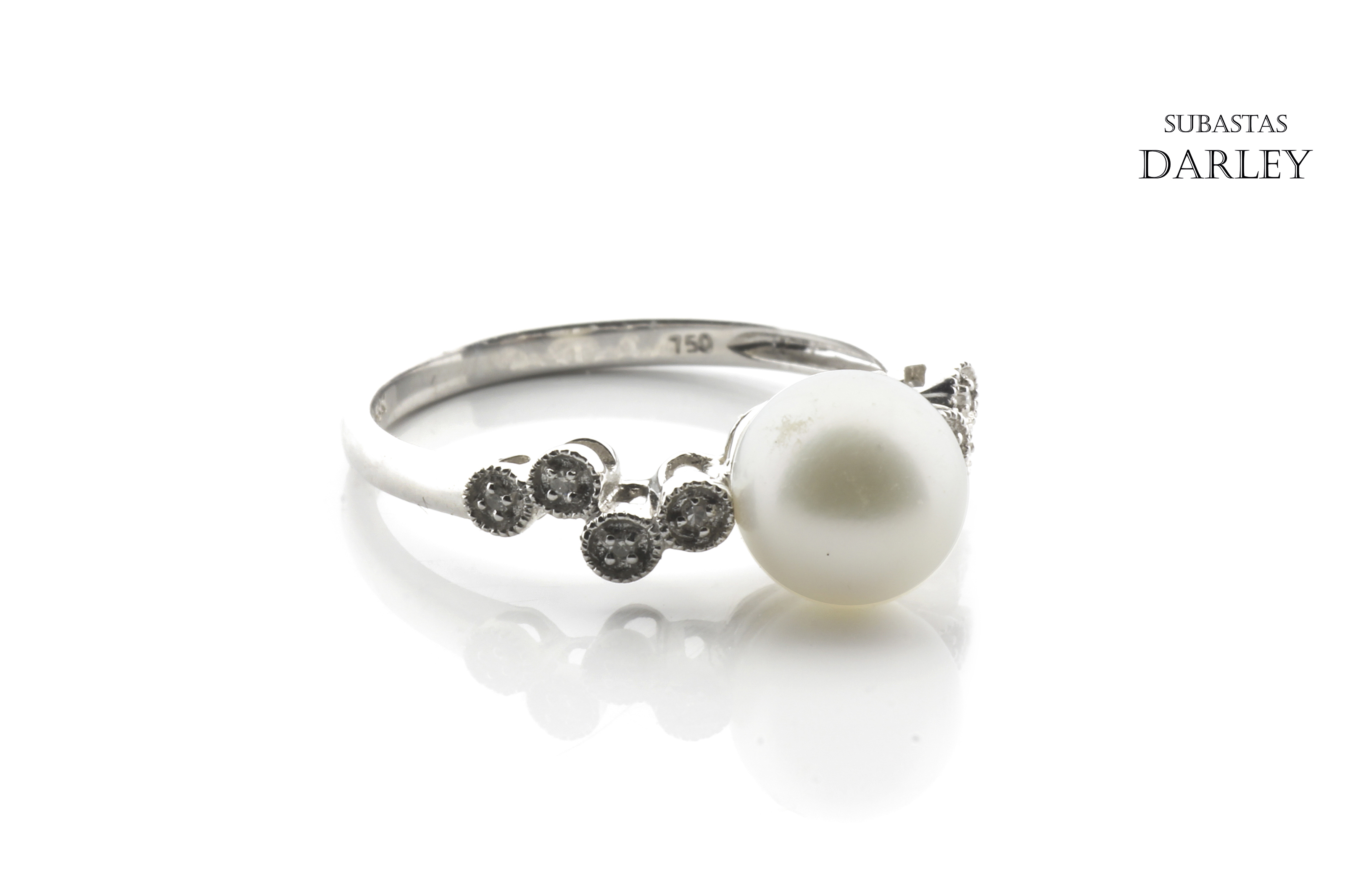 Anillo de oro blanco de 18k presidido por una perla esférica cultivada central de aproximadamente 8 mm; enmarcada por 8 diamantes talla brillante.