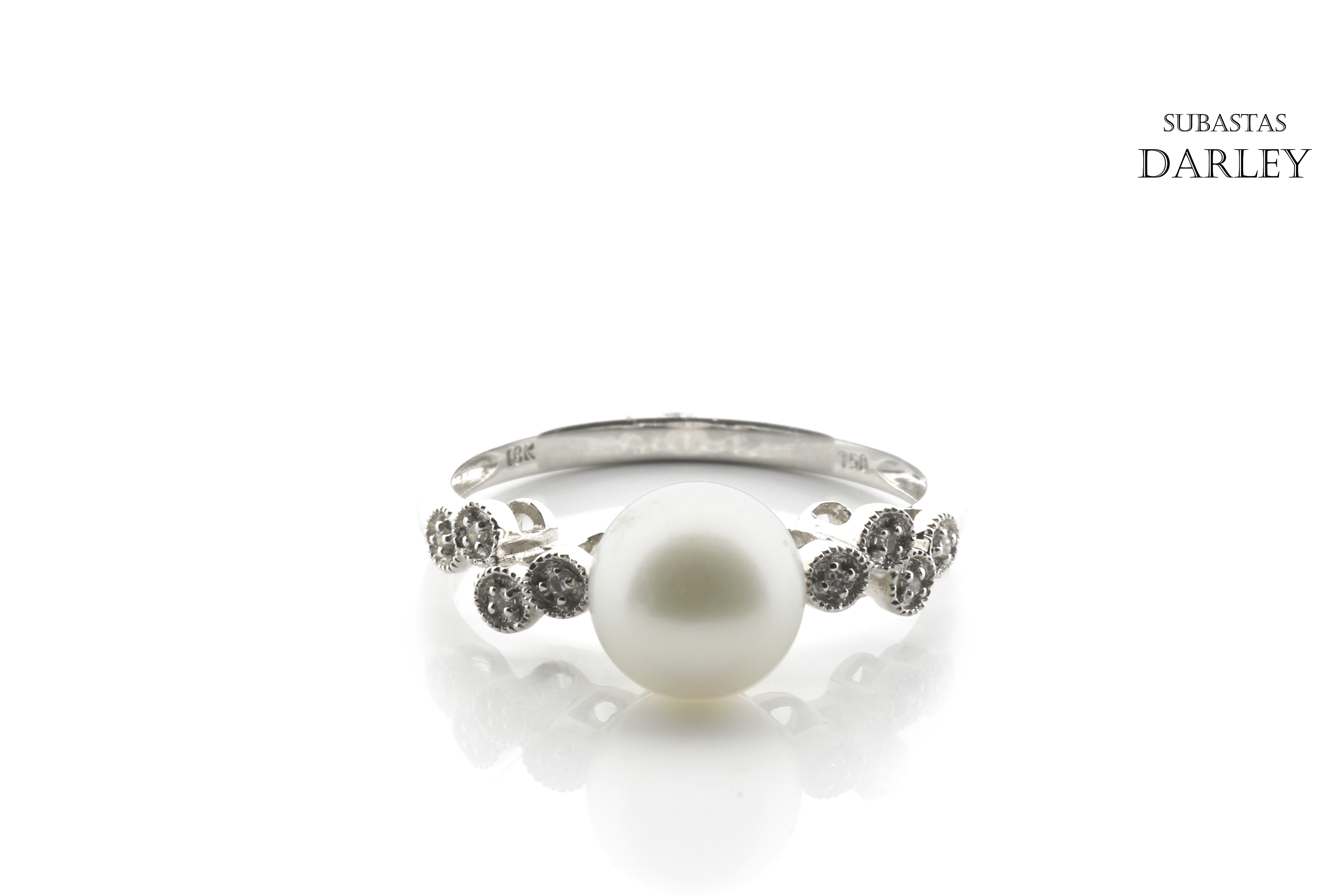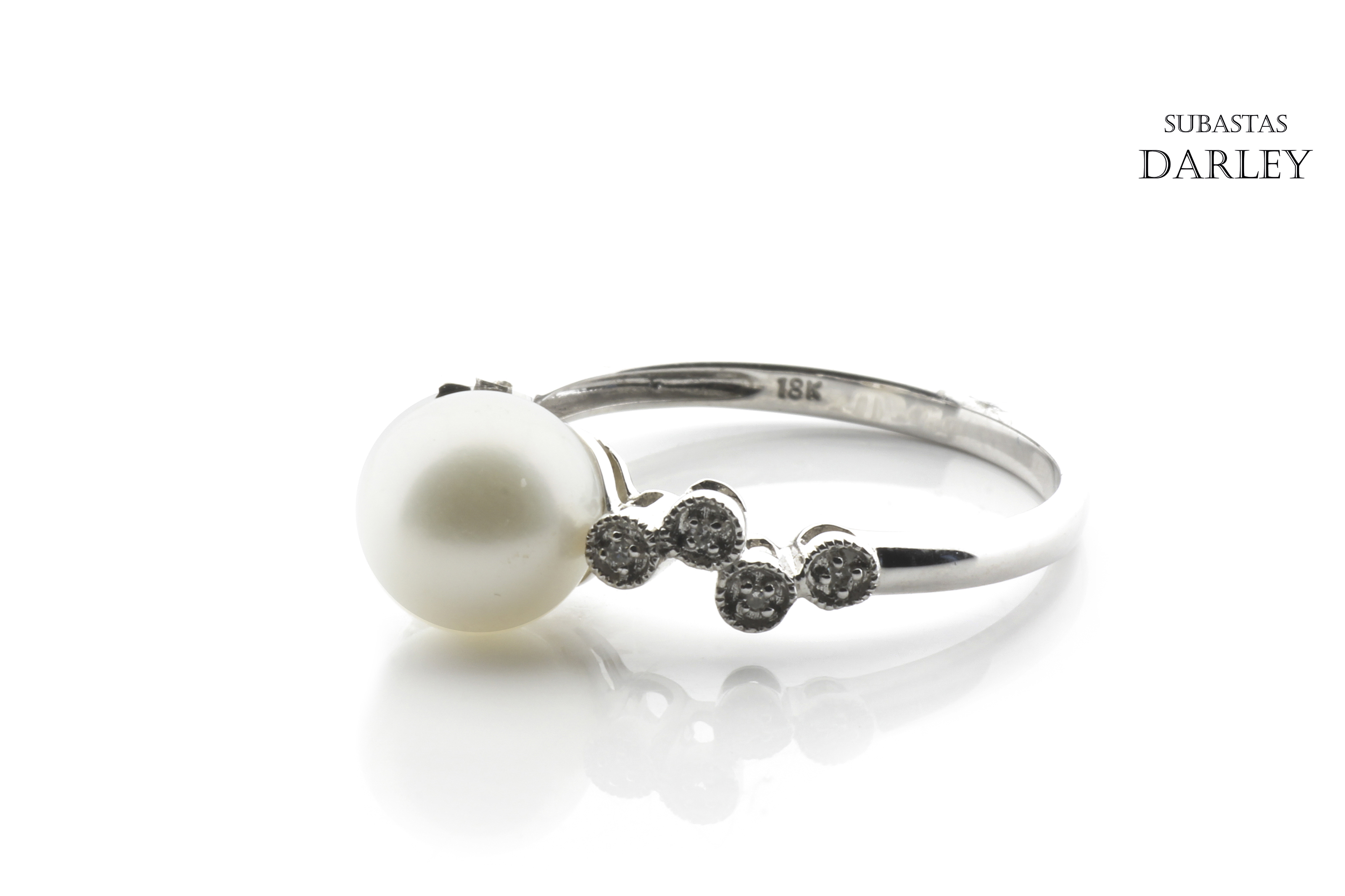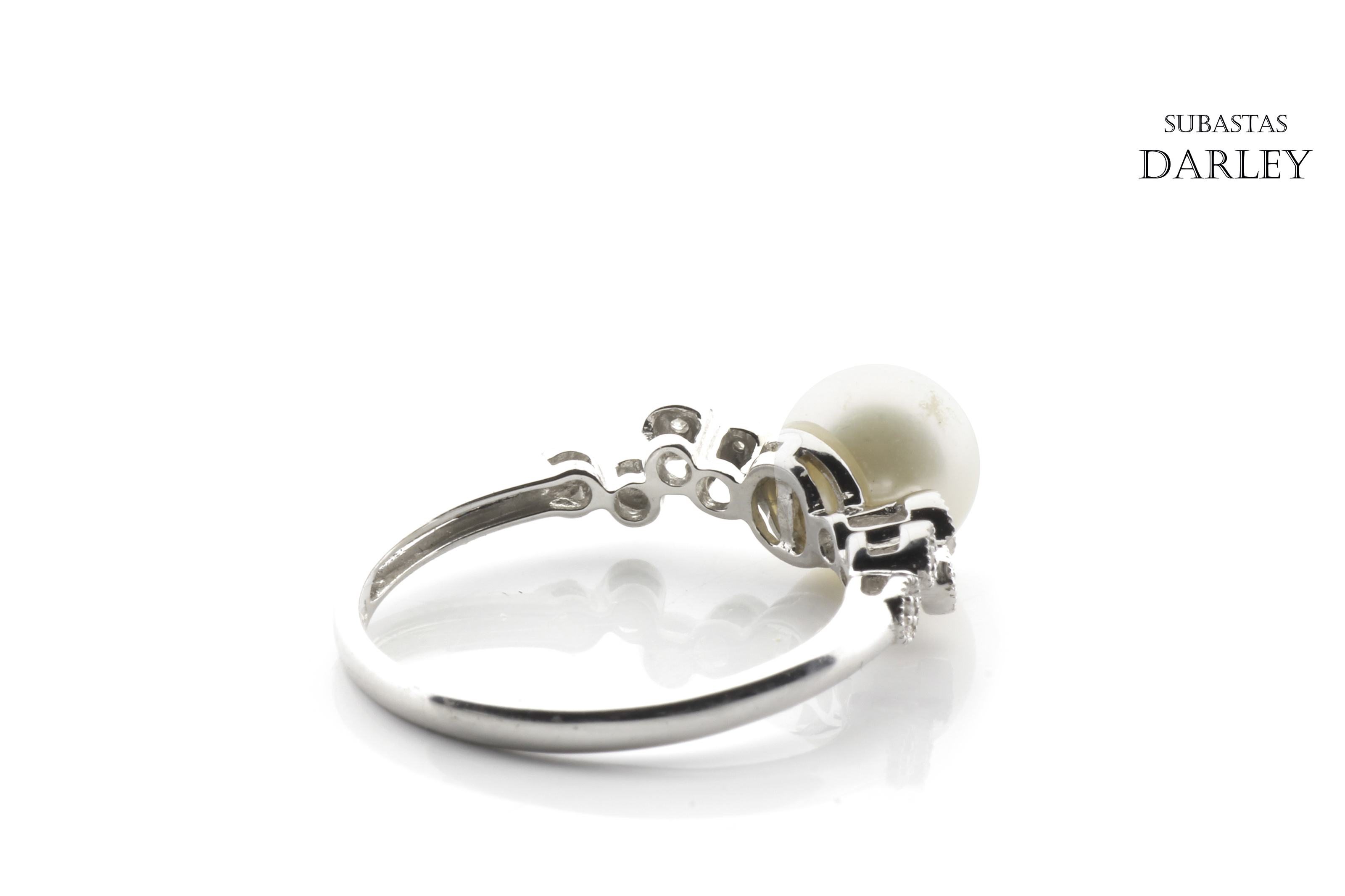 Anillo de oro blanco de 18k presidido por una perla esférica cultivada central de aproximadamente 8 mm; enmarcada por 8 diamantes talla brillante.