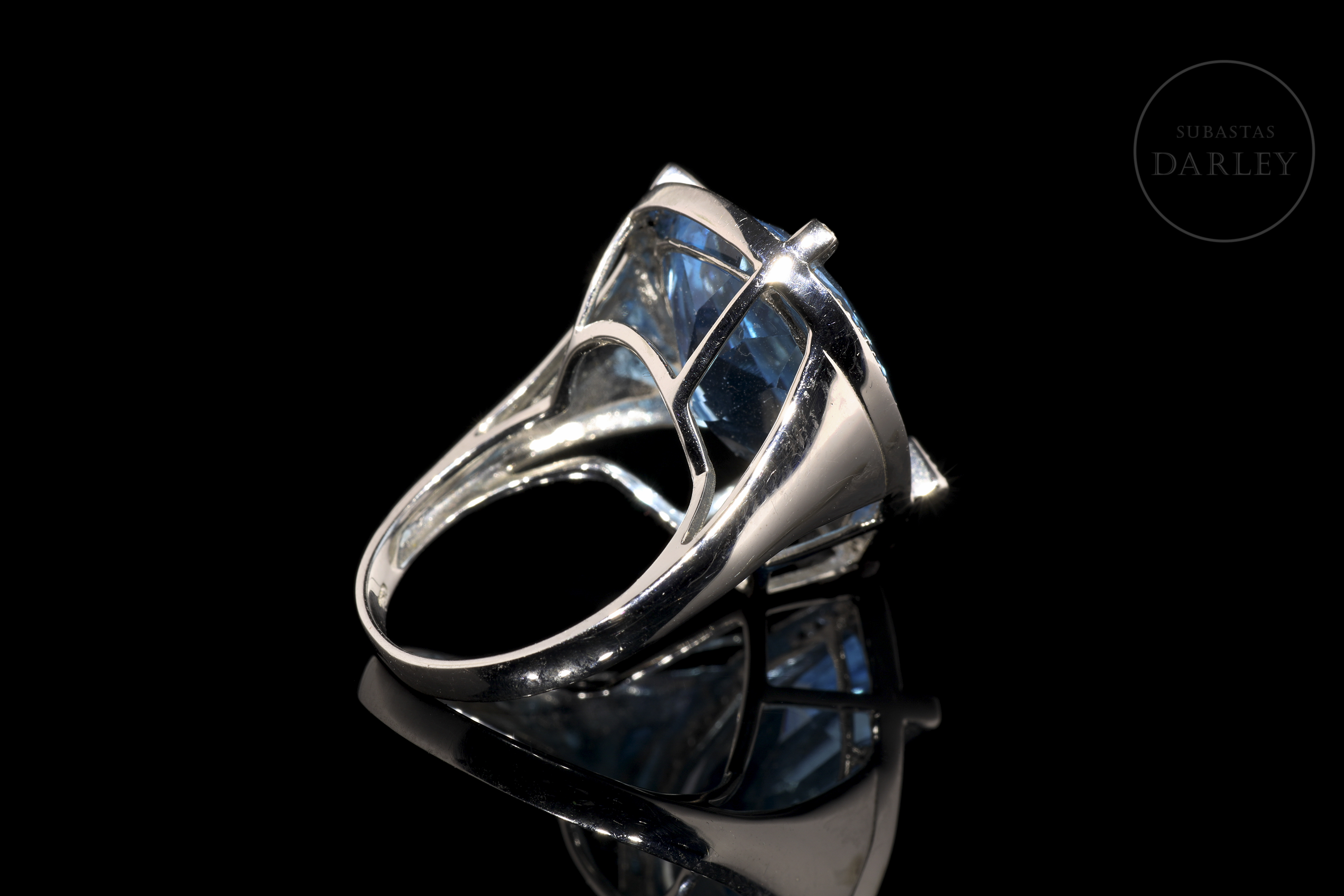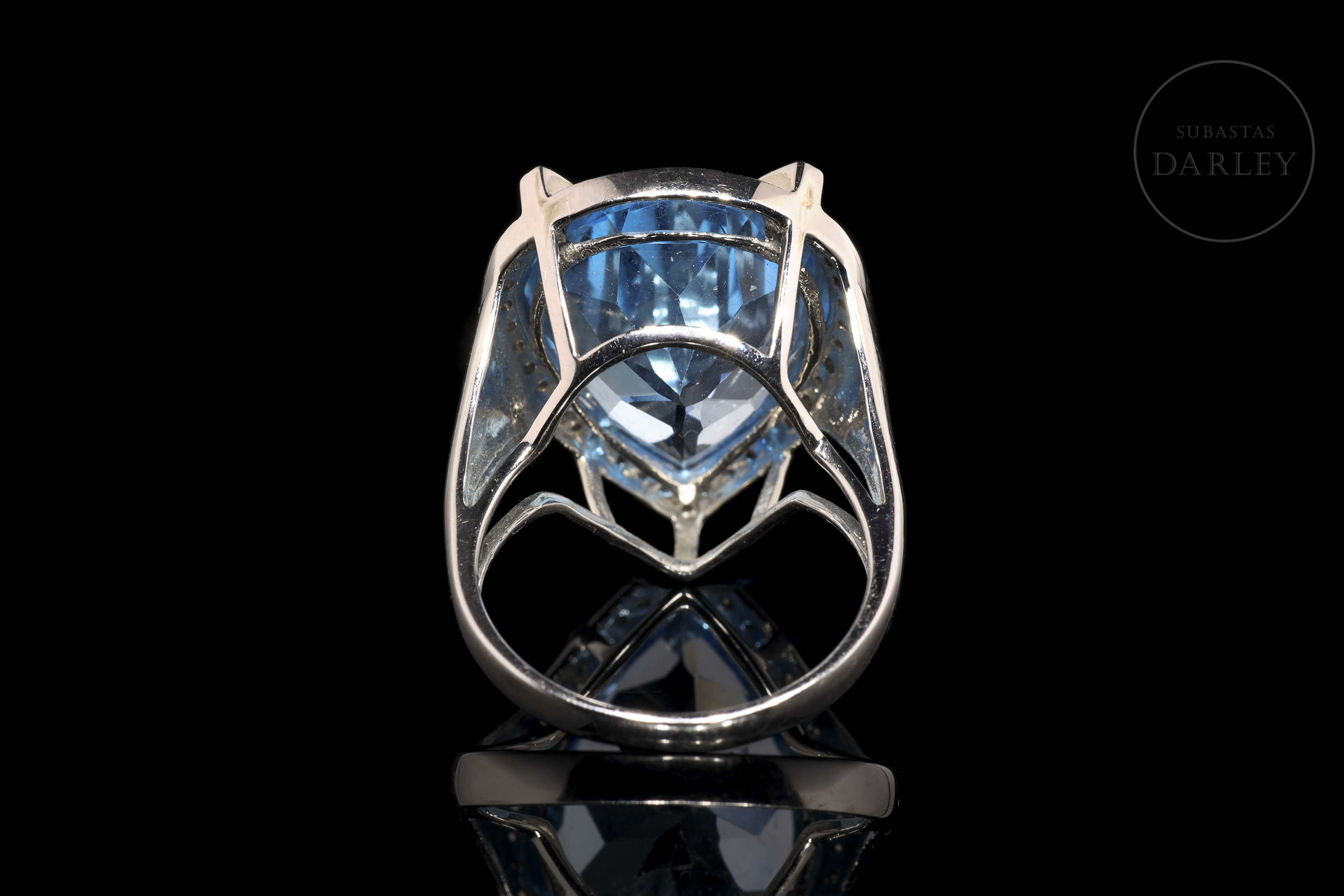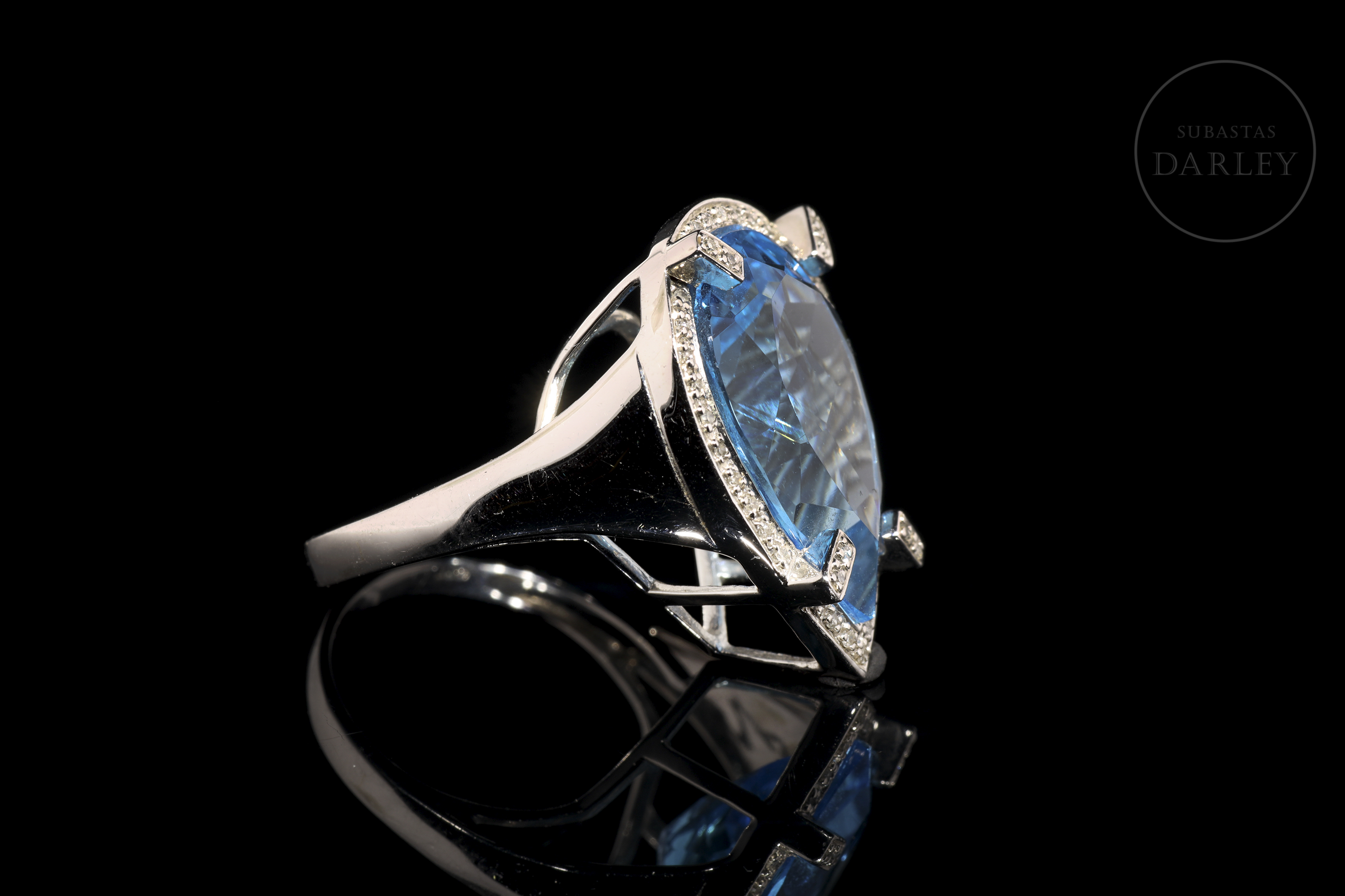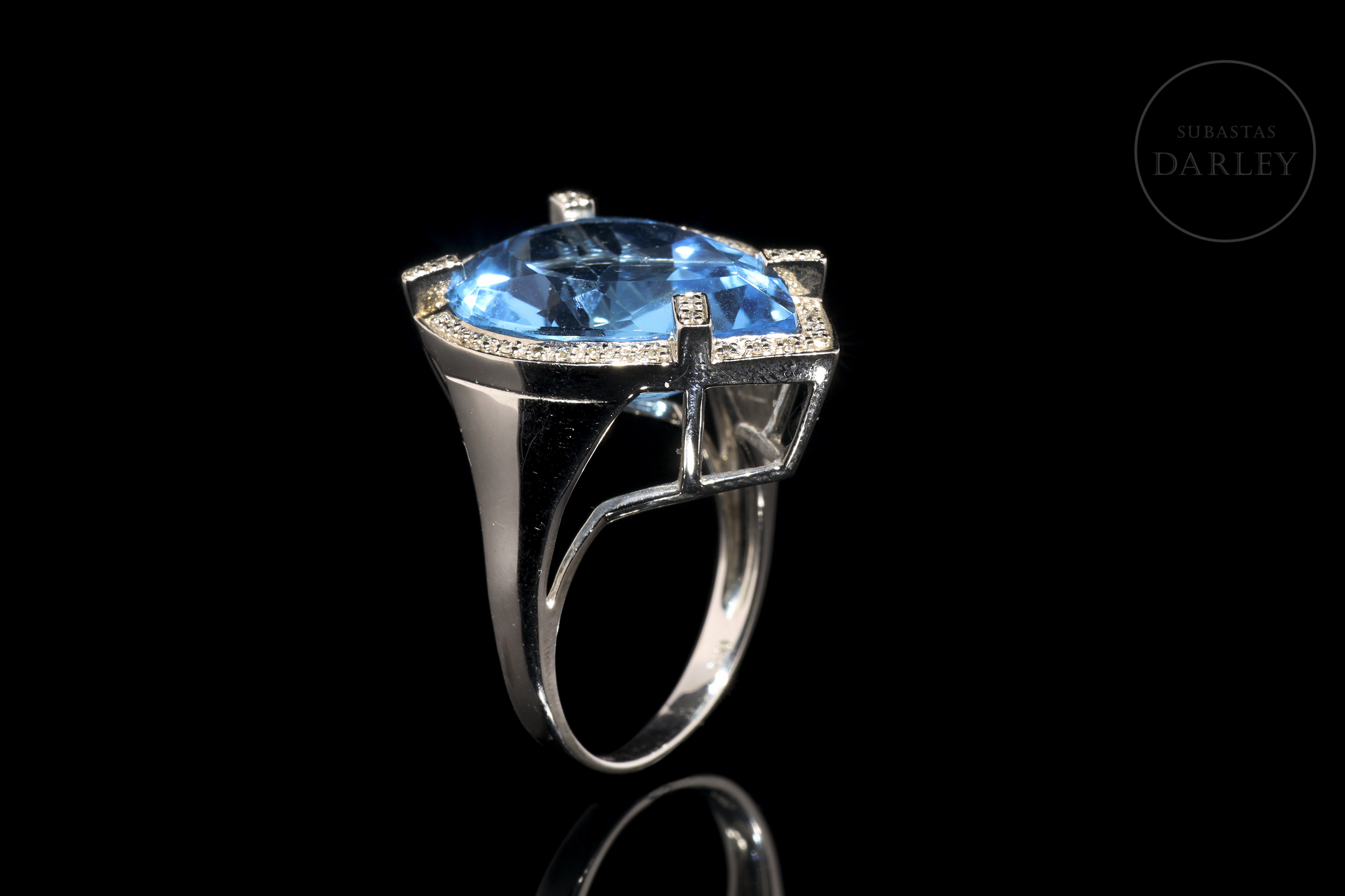 Preside el frontis un topacio en color azul intenso, talla pera facetada de 17,27 ct de peso. La enmarca un bisel sobre el que se colocan cuatro garras rectangulares, forrándose toda la estructura con un total de 42 diamantes, talla brillante, con un peso total de 0,14 cts. Apoya en alta galería que descansa sobre unos anchos hombros en definición.
