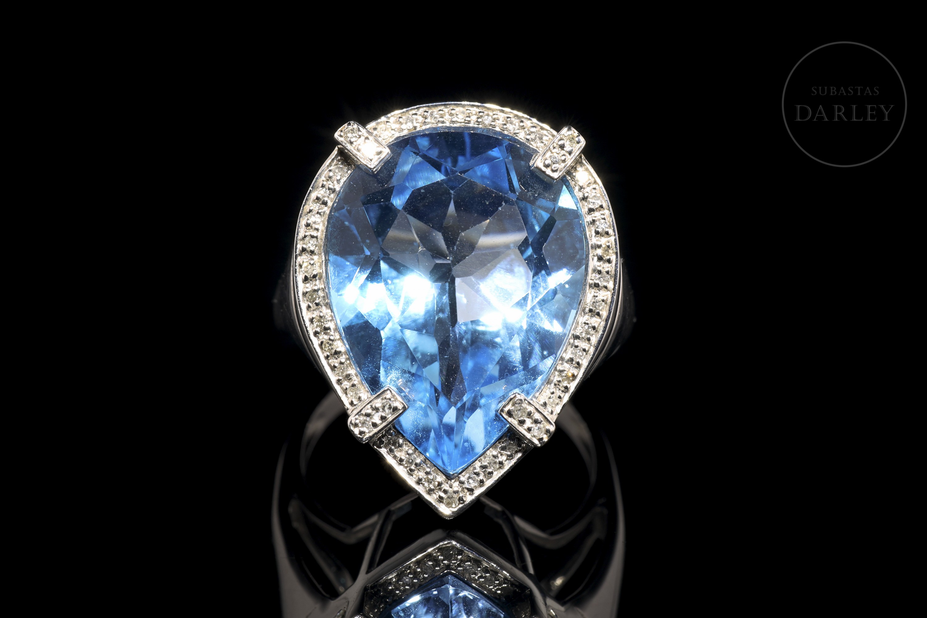 Preside el frontis un topacio en color azul intenso, talla pera facetada de 17,27 ct de peso. La enmarca un bisel sobre el que se colocan cuatro garras rectangulares, forrándose toda la estructura con un total de 42 diamantes, talla brillante, con un peso total de 0,14 cts. Apoya en alta galería que descansa sobre unos anchos hombros en definición.