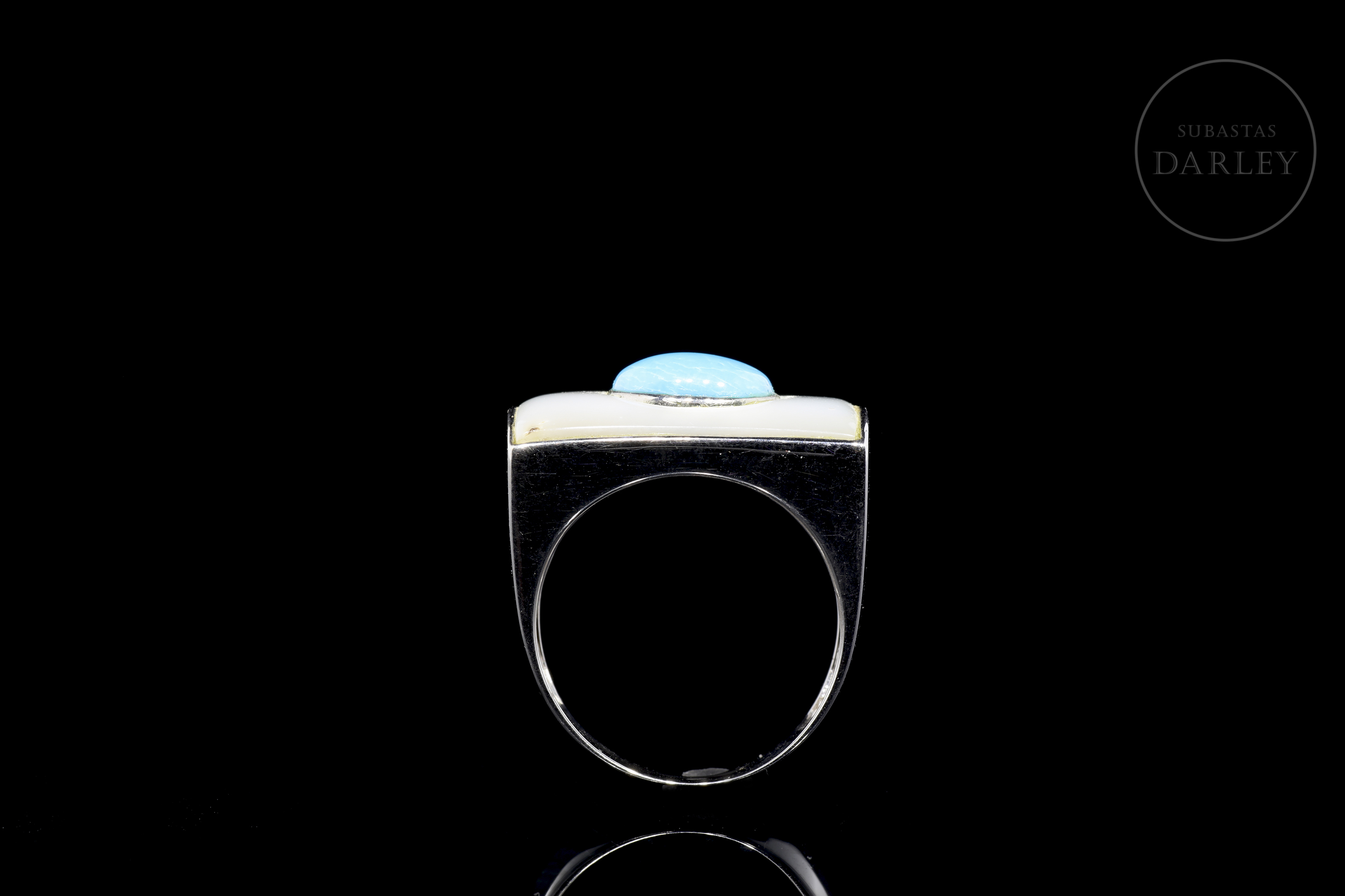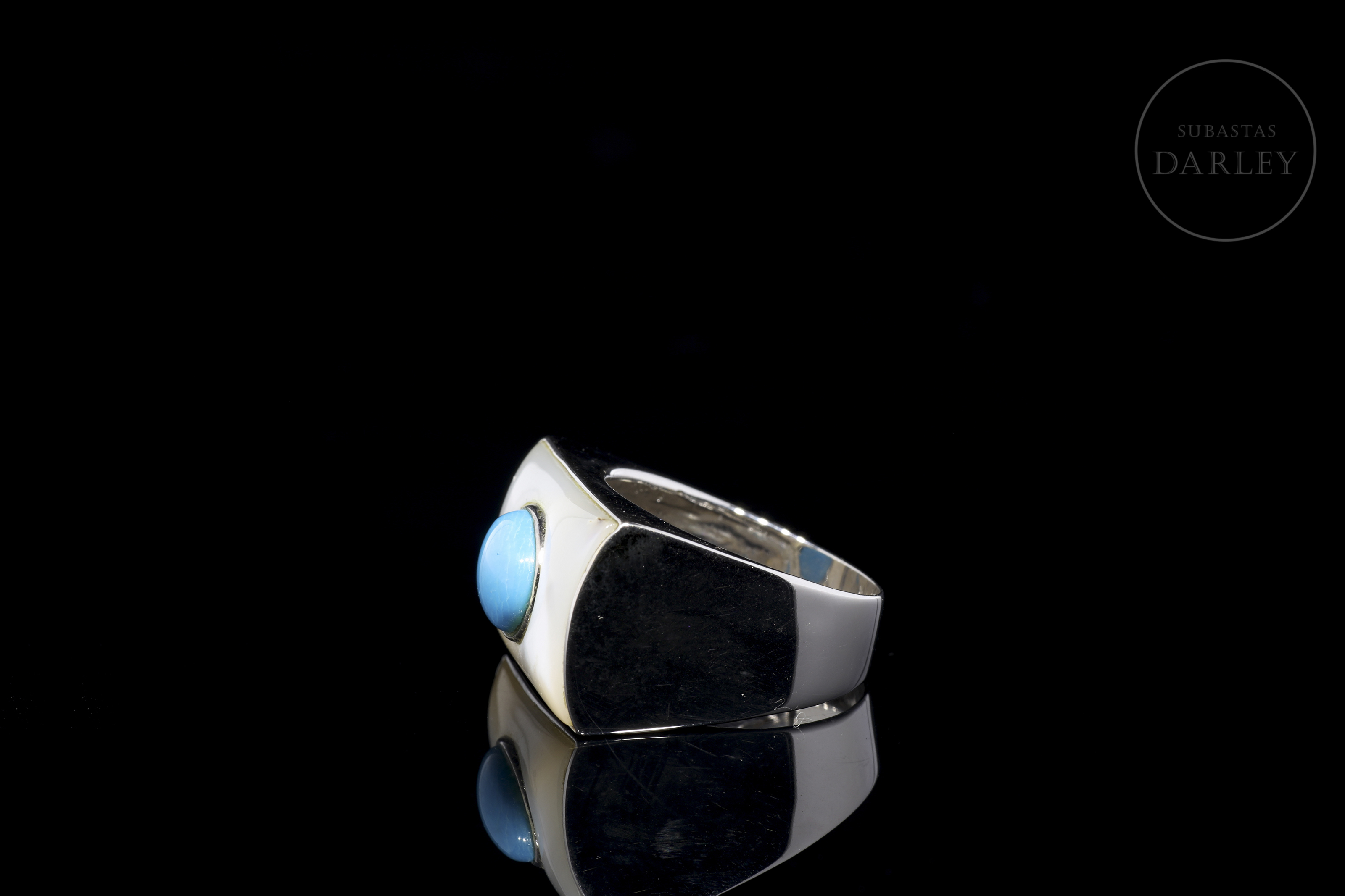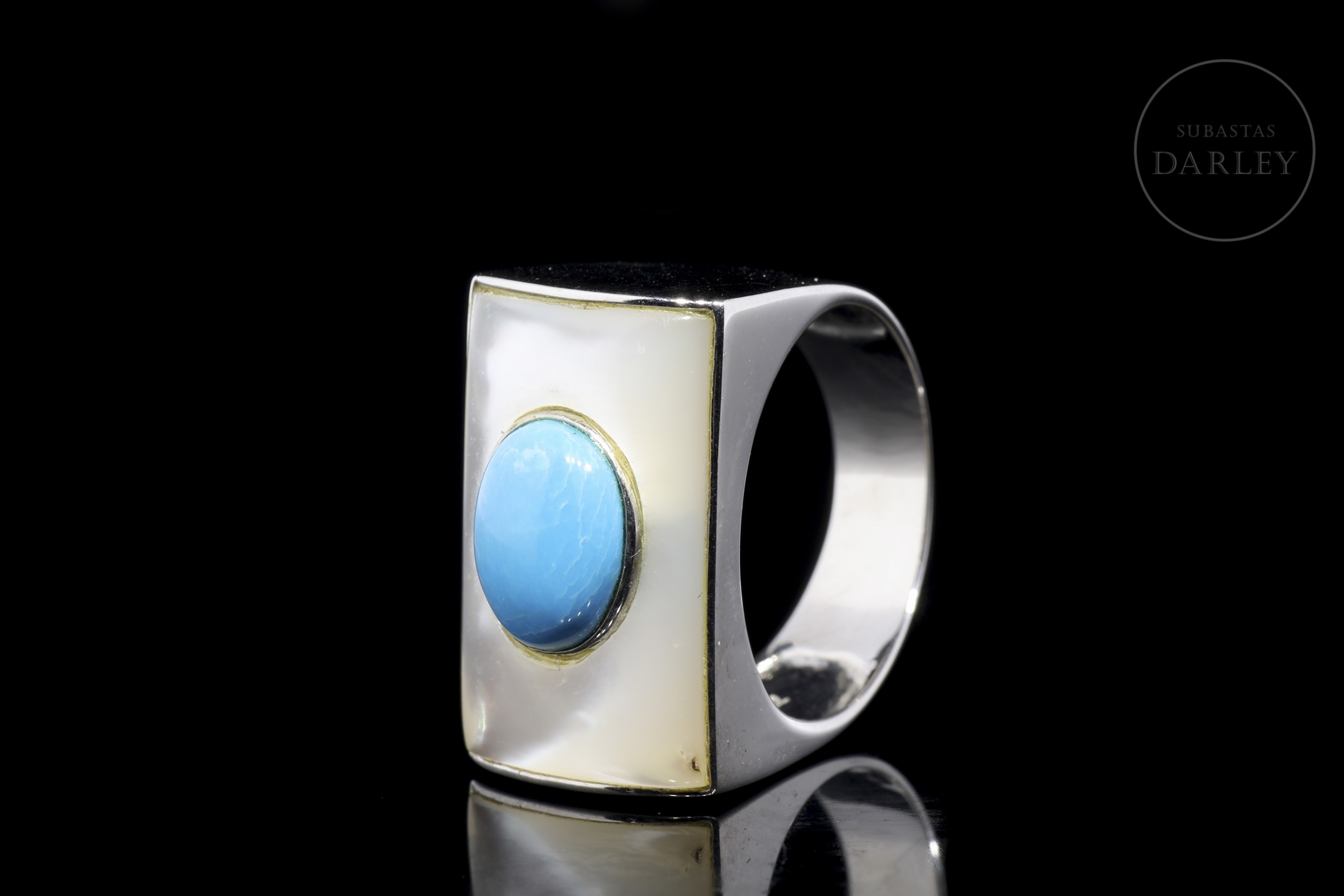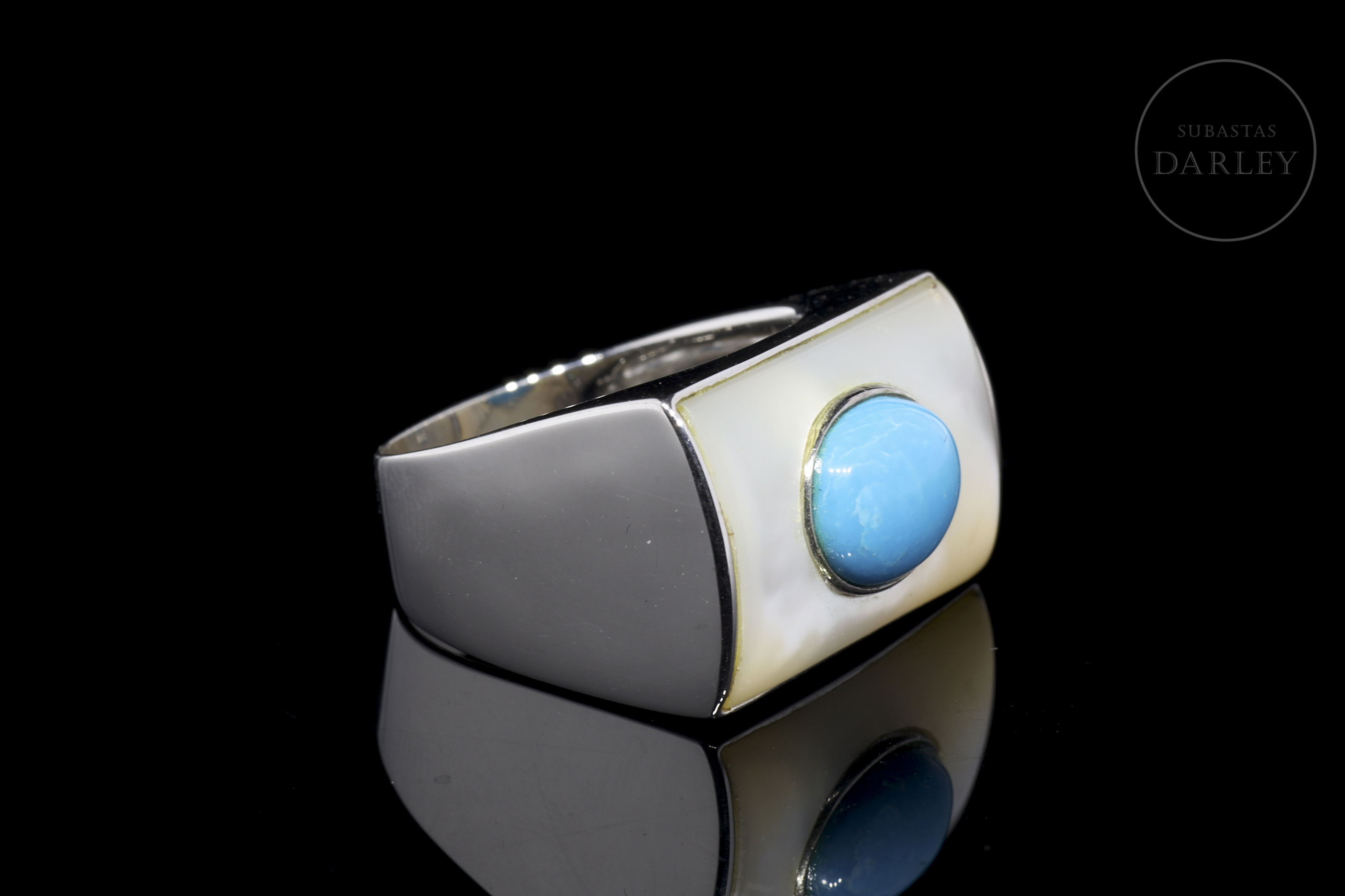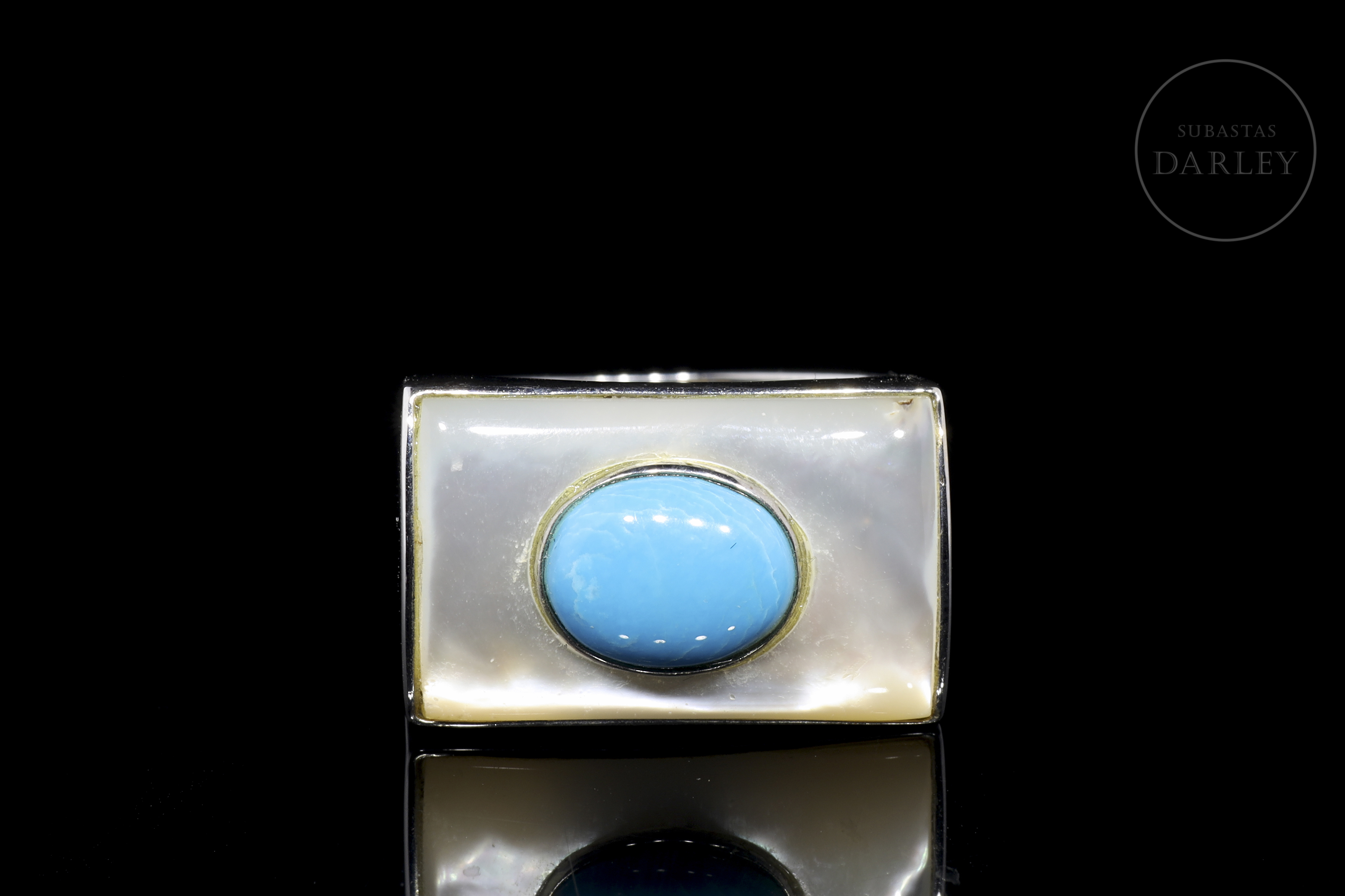 Modelo sello de brazo ancho en definición y frontal rectangular, decorado con una madreperla natural, que encierra en su centro una turquesa ovalada rodeada por un fino bisel en brillo.