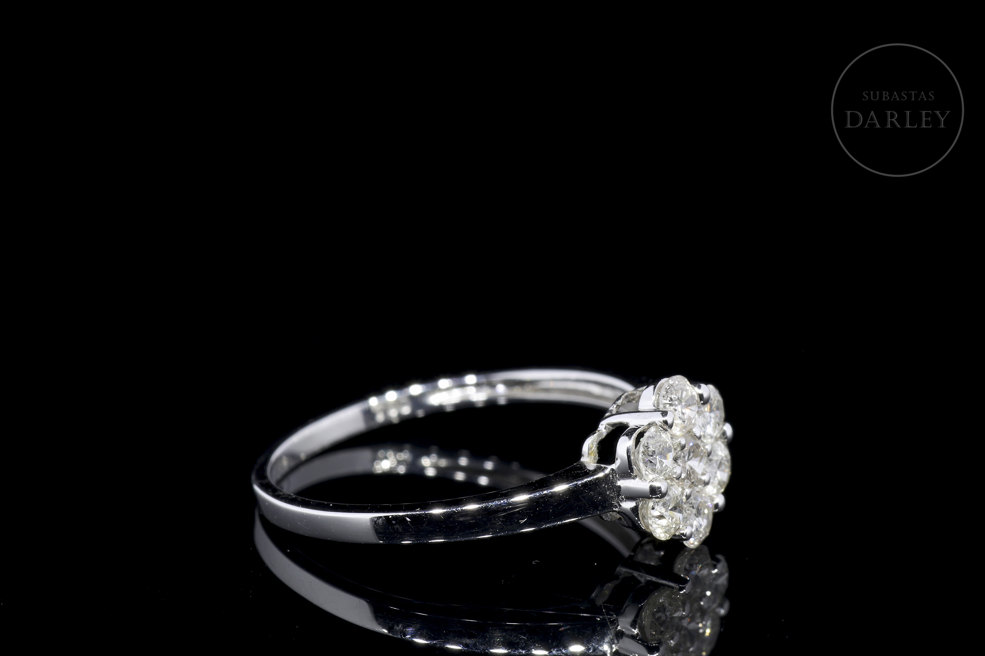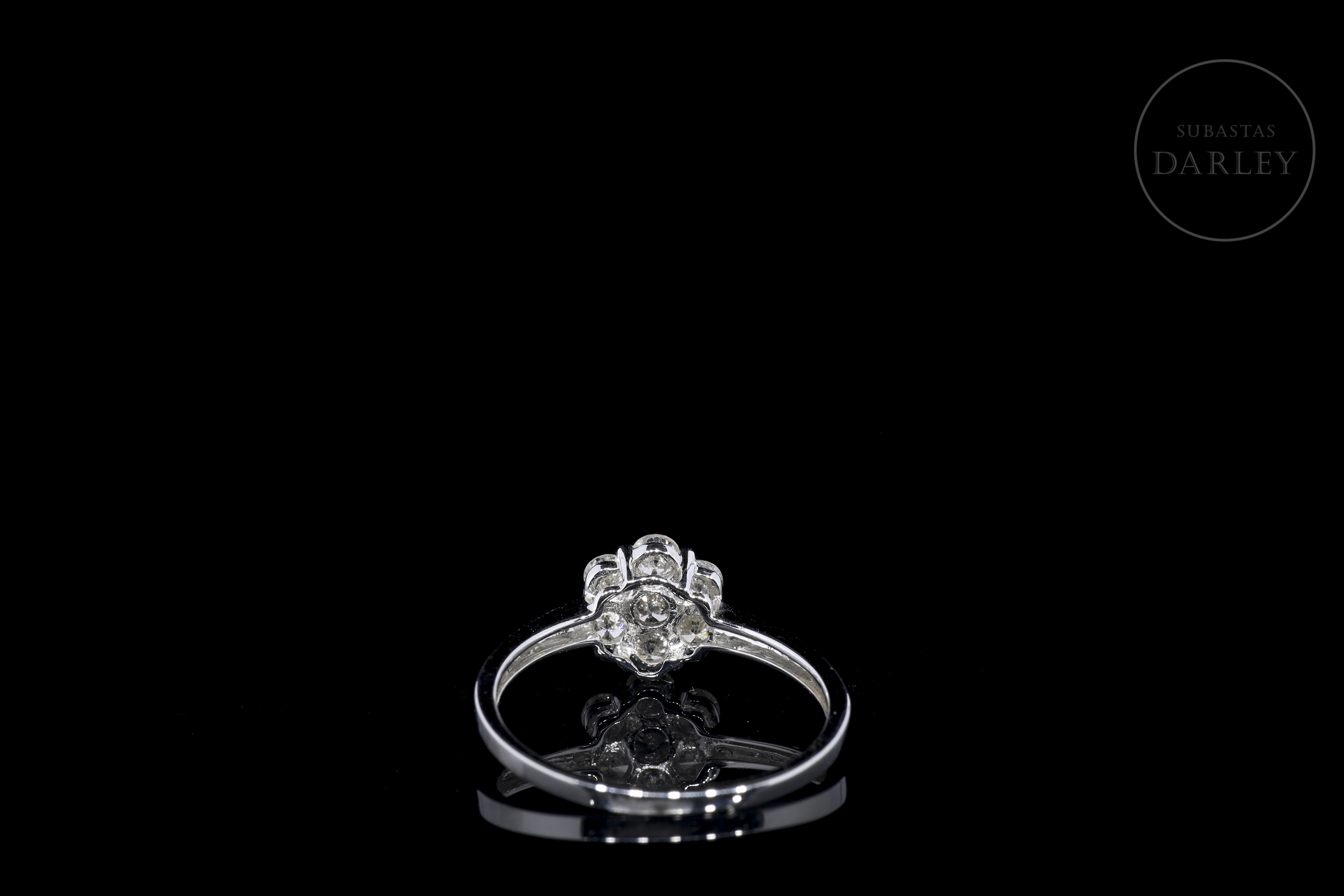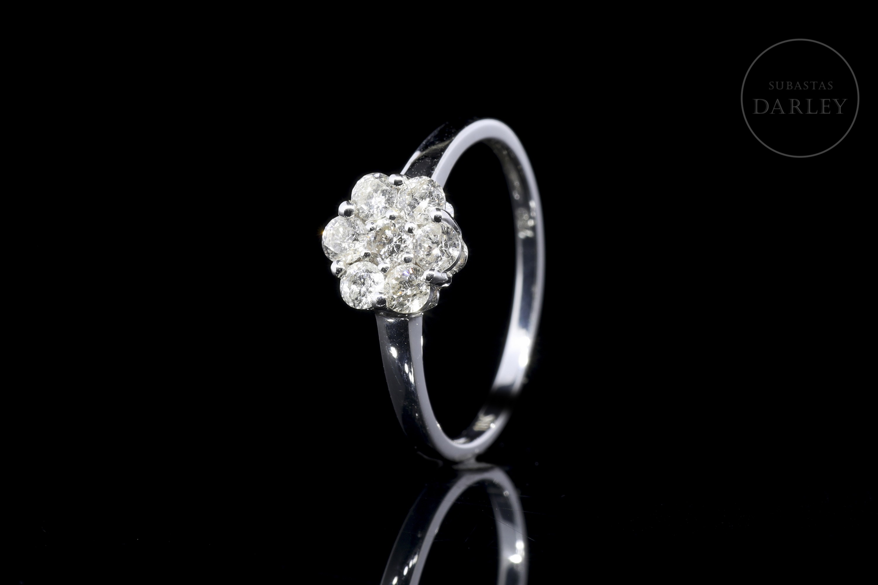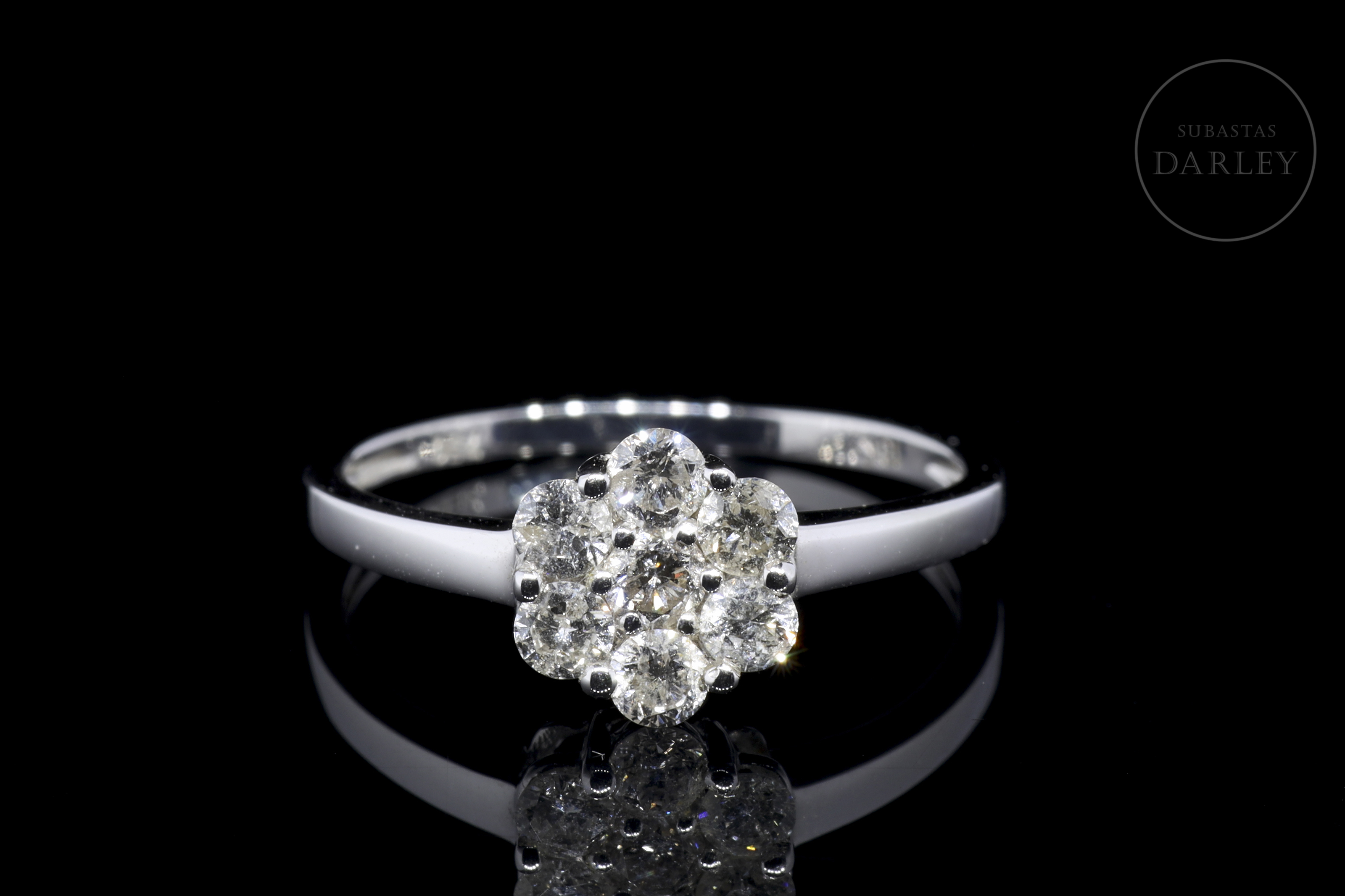 Anillo en oro blanco de 18k y diamantes. Modelo clásico de rosetón diseñado con 7 diamantes iguales, talla brillante, engarzados en garras compartidas y con un peso total de 0,50 ct, que conforman la imagen de una flor.
