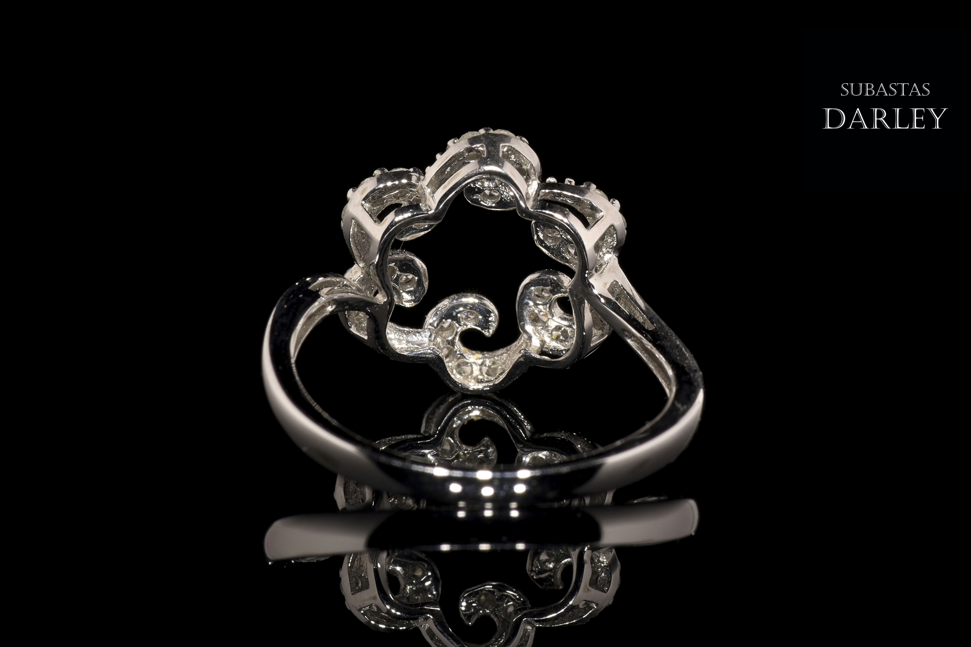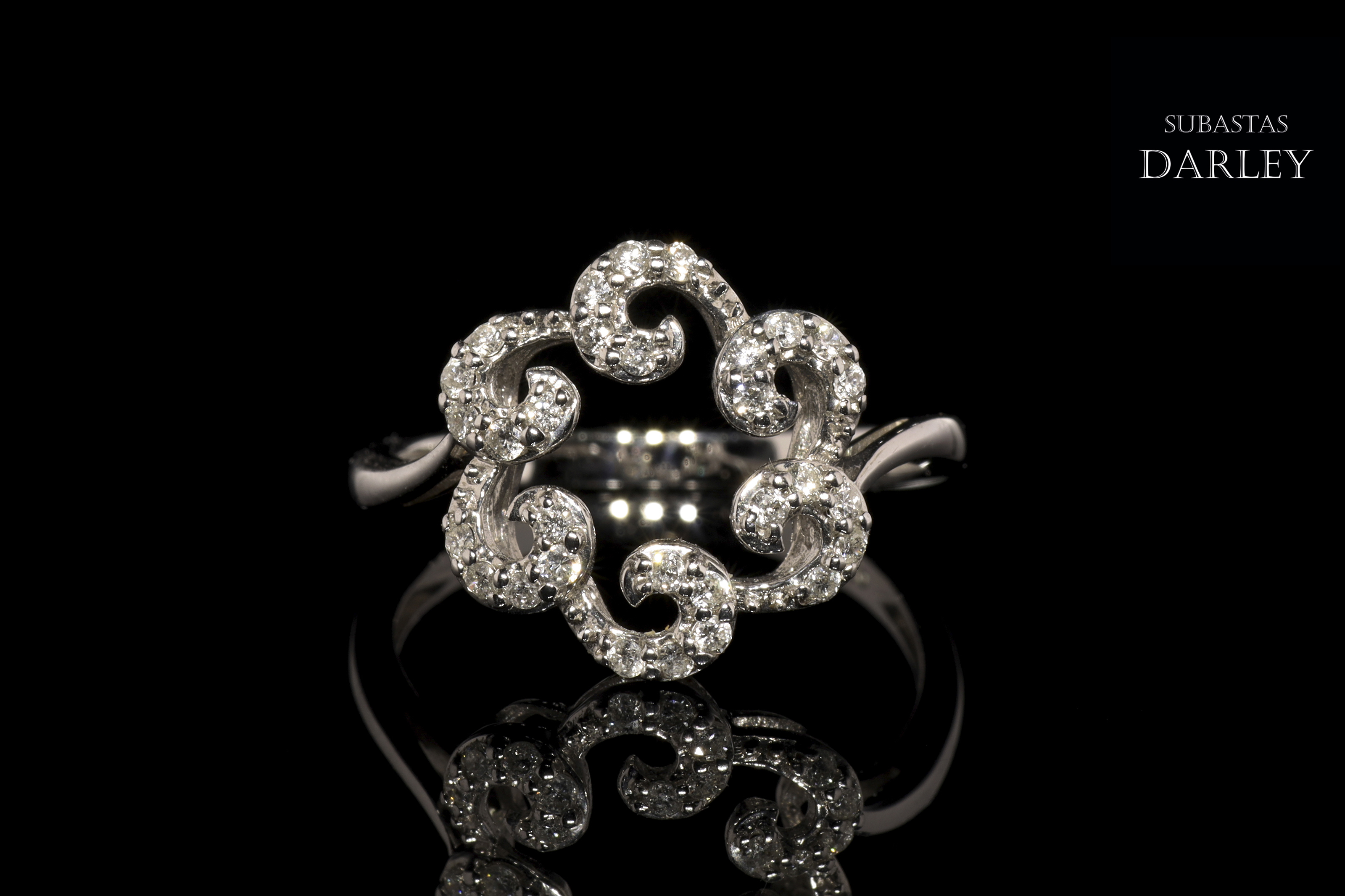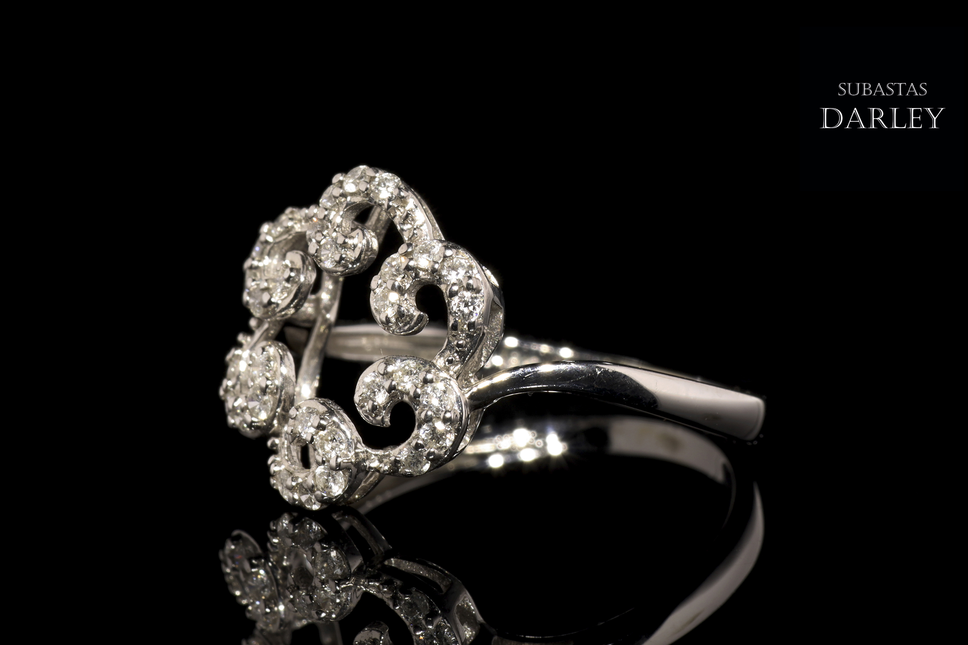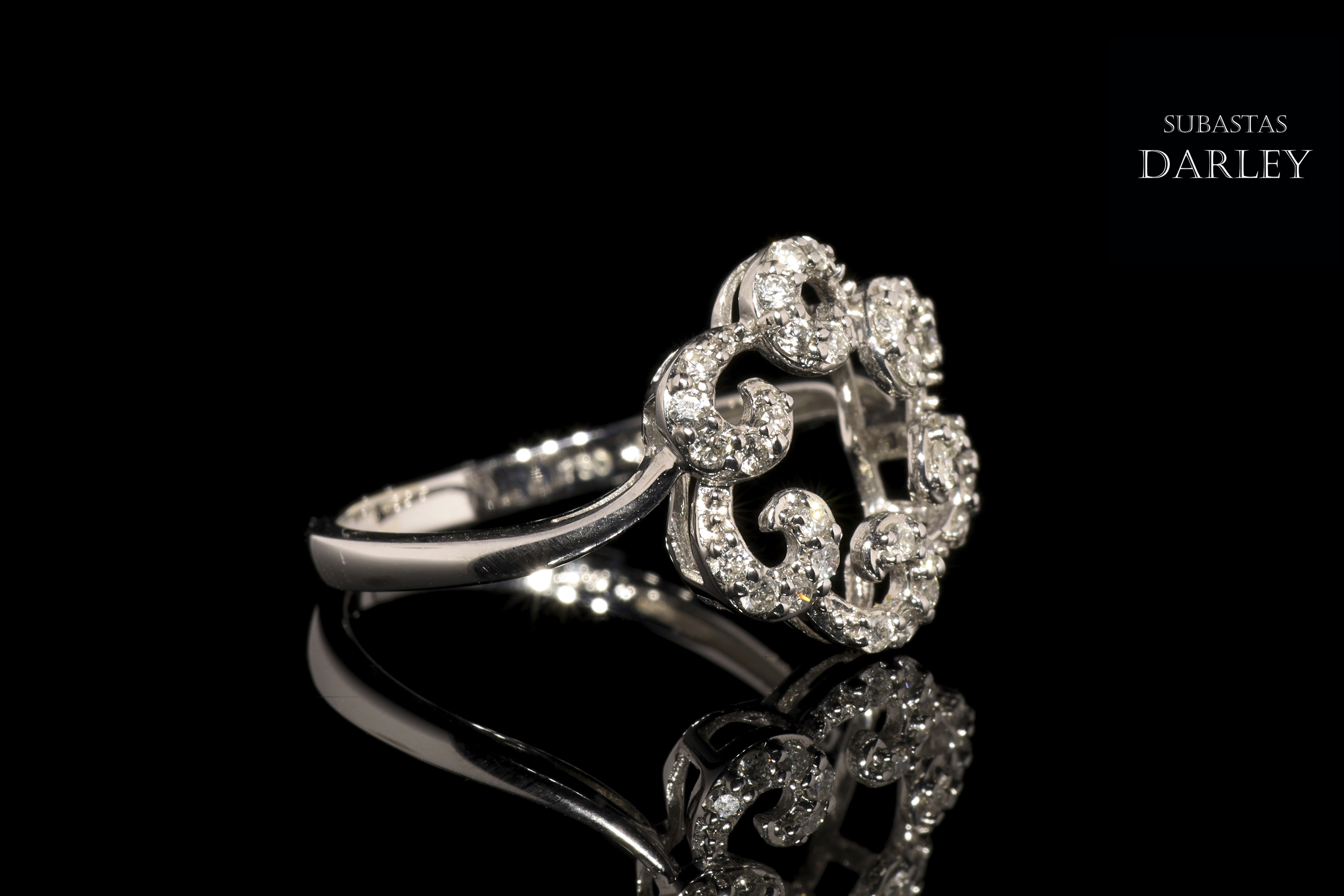 Anillo en oro blanco de 18k y diamantes, adornado con seis roleos, similares a una ola, que conforman lo que parece una flor. El frente se encuentra cubierto por un total de 30 diamantes de talla brillante, engarzados en garra, con un peso total de 0,28 ct.