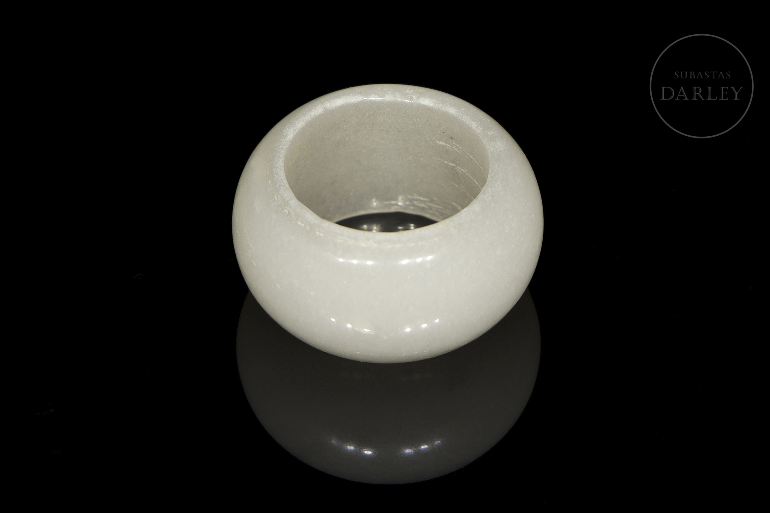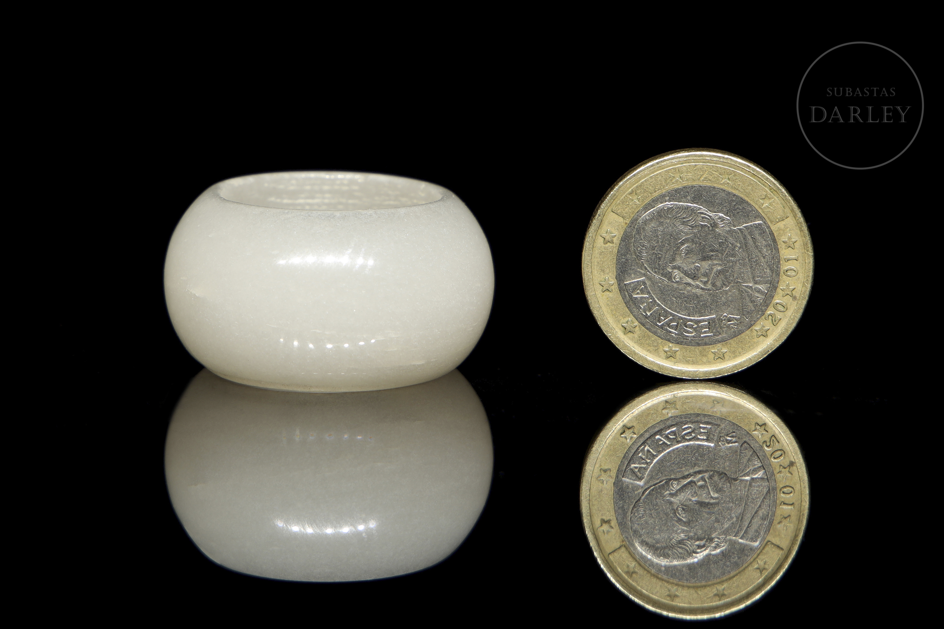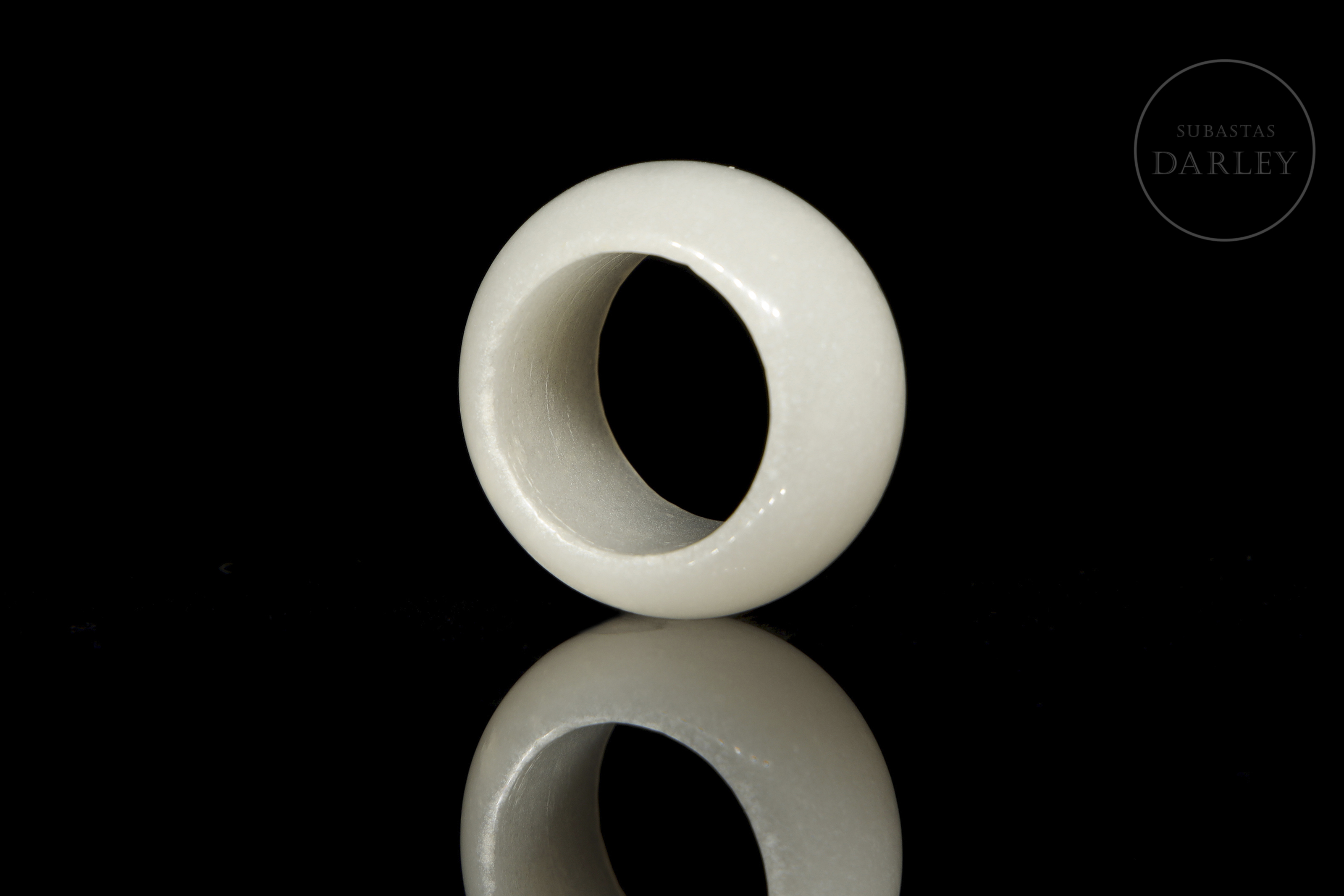 Anillo tallado en jade de tonalidad blanca uniforme, de forma ligeramente abombada y bordes suavemente redondeados. Las superficies, pulidas, realzan la delicadeza de la piedra.