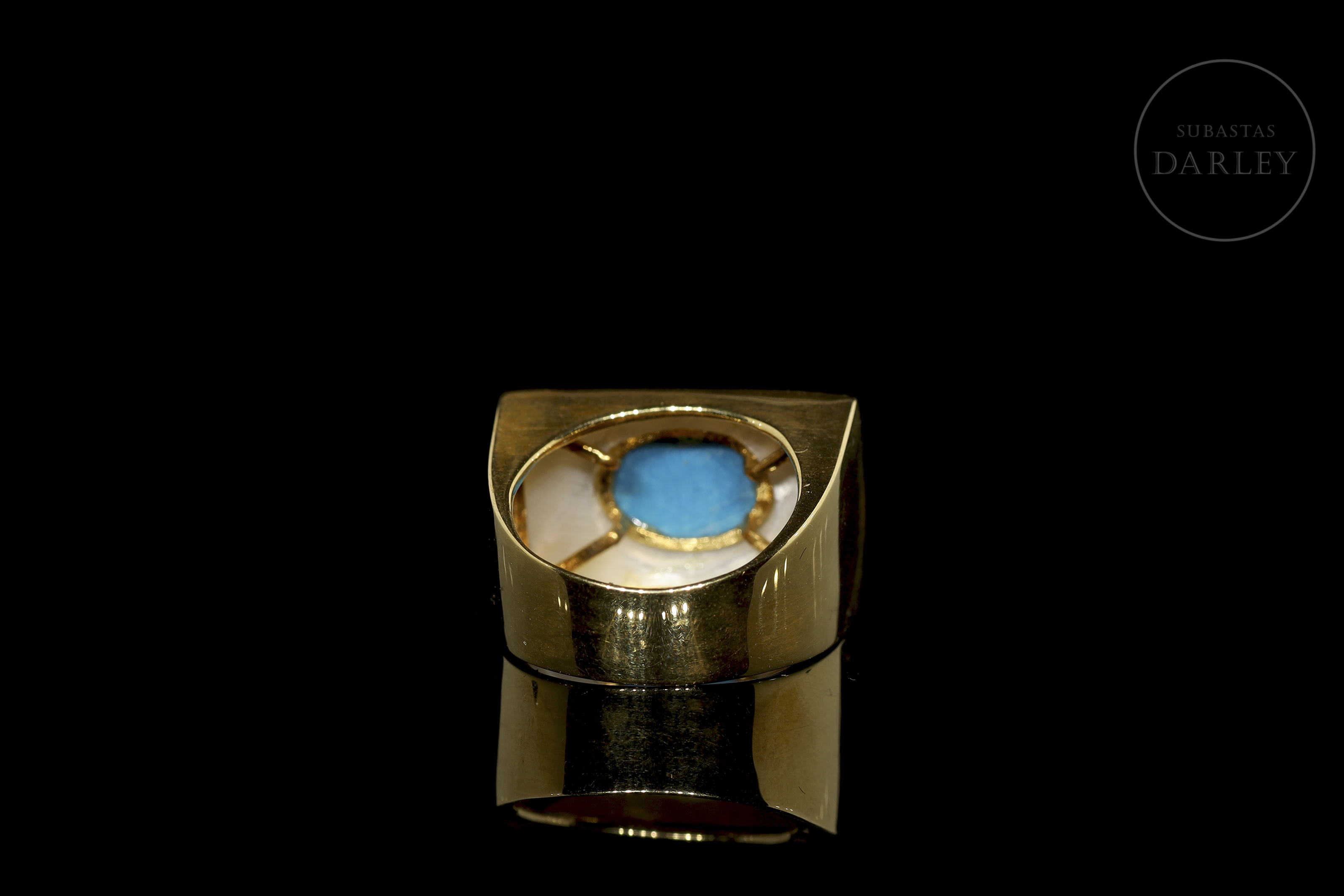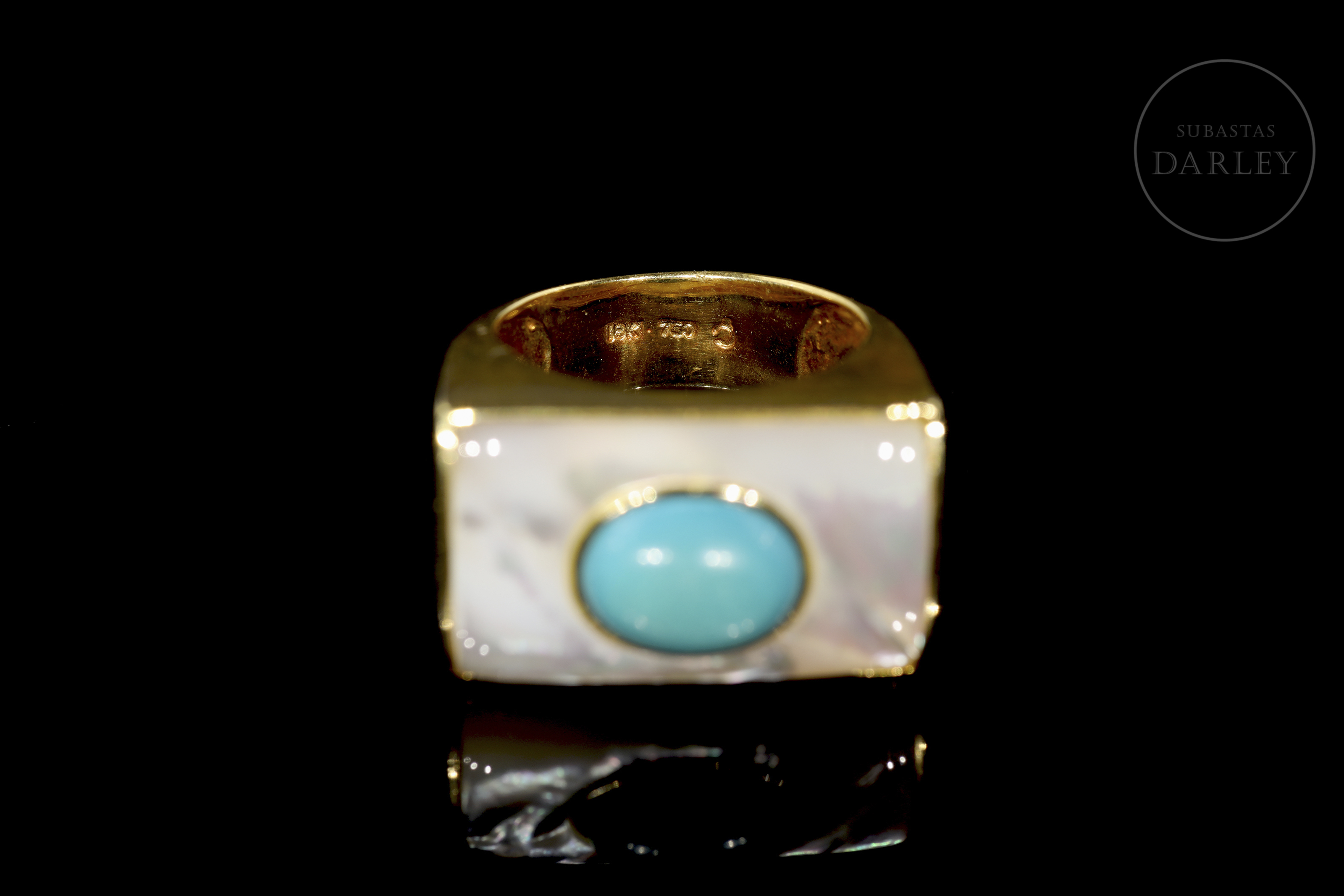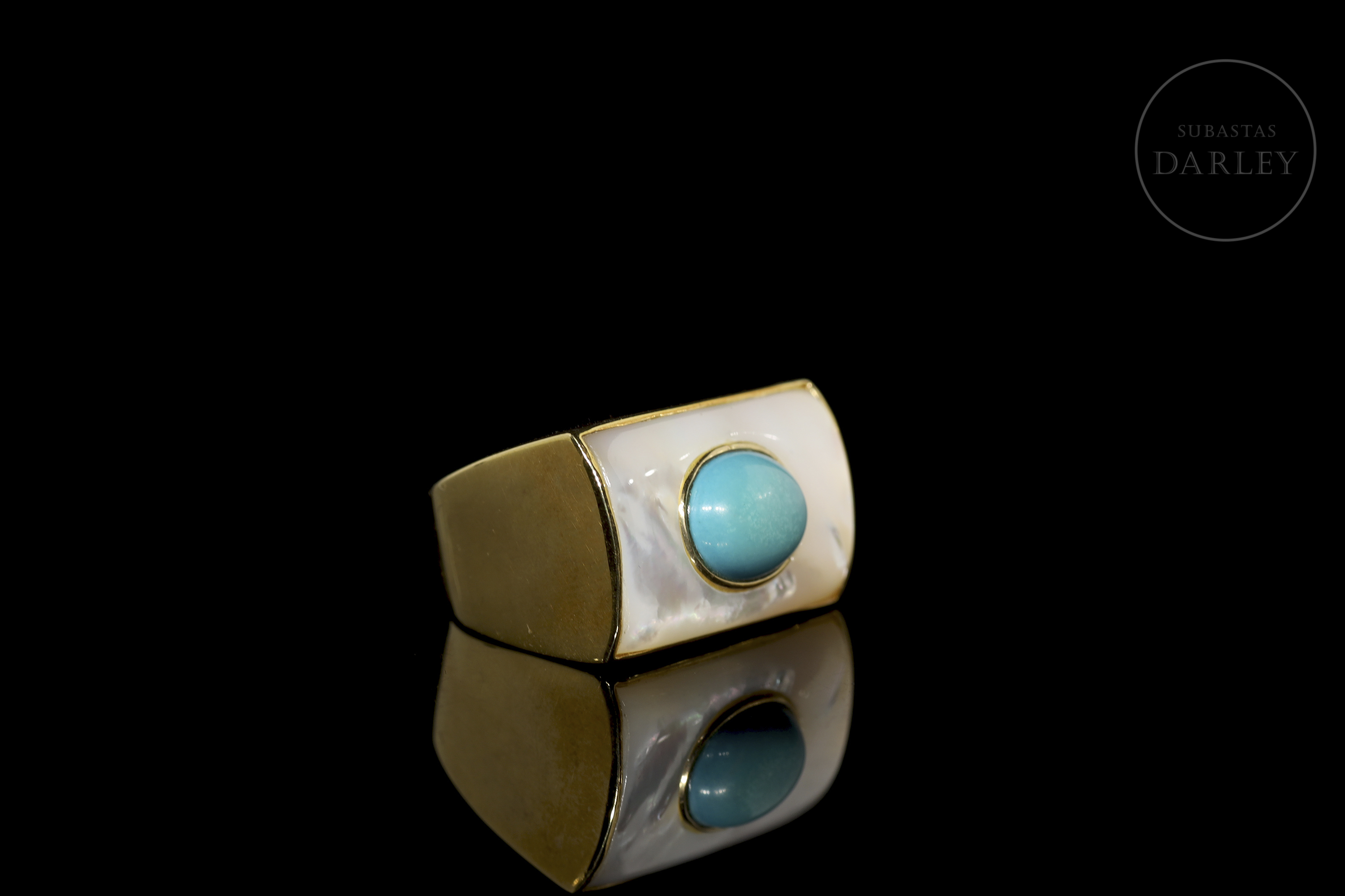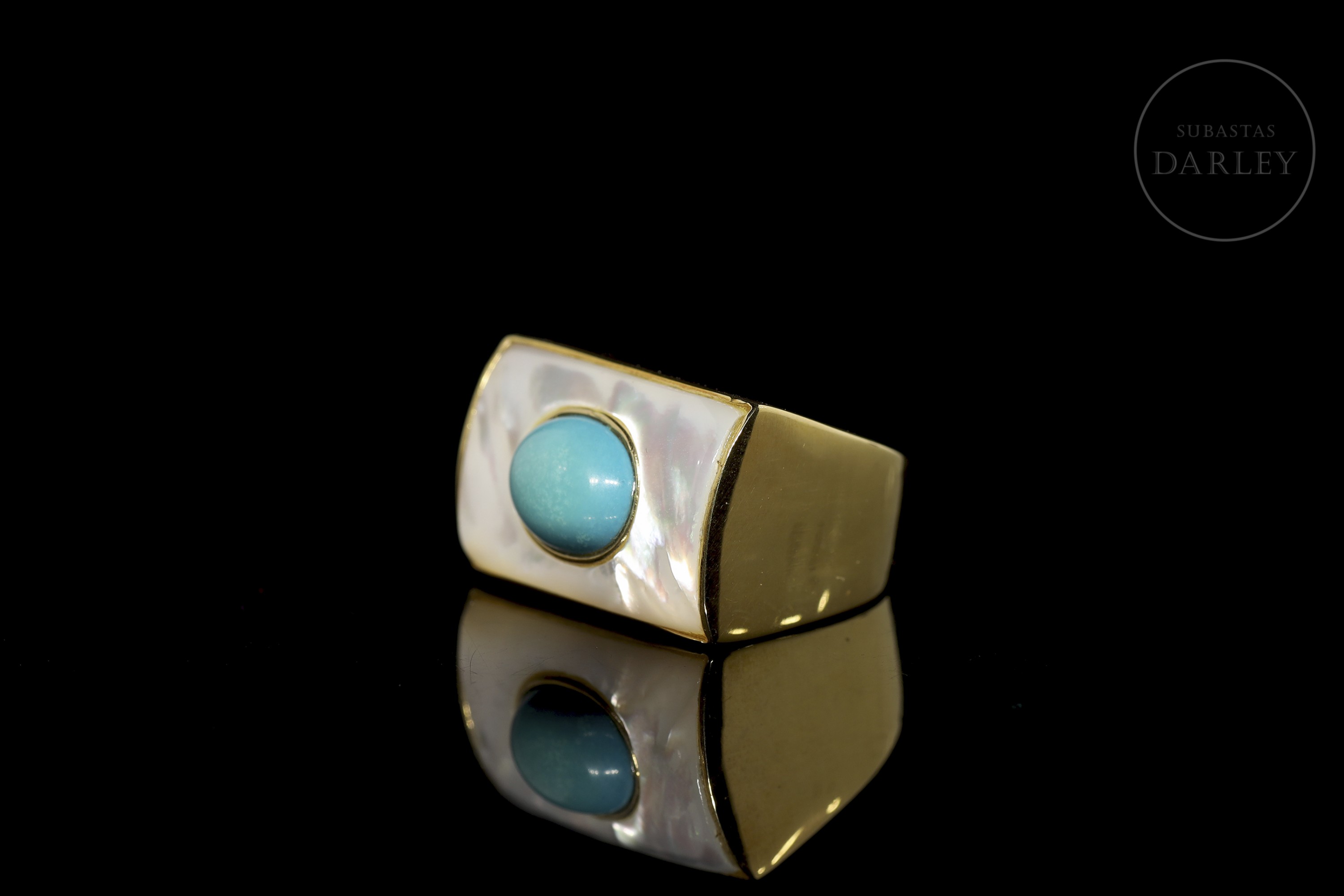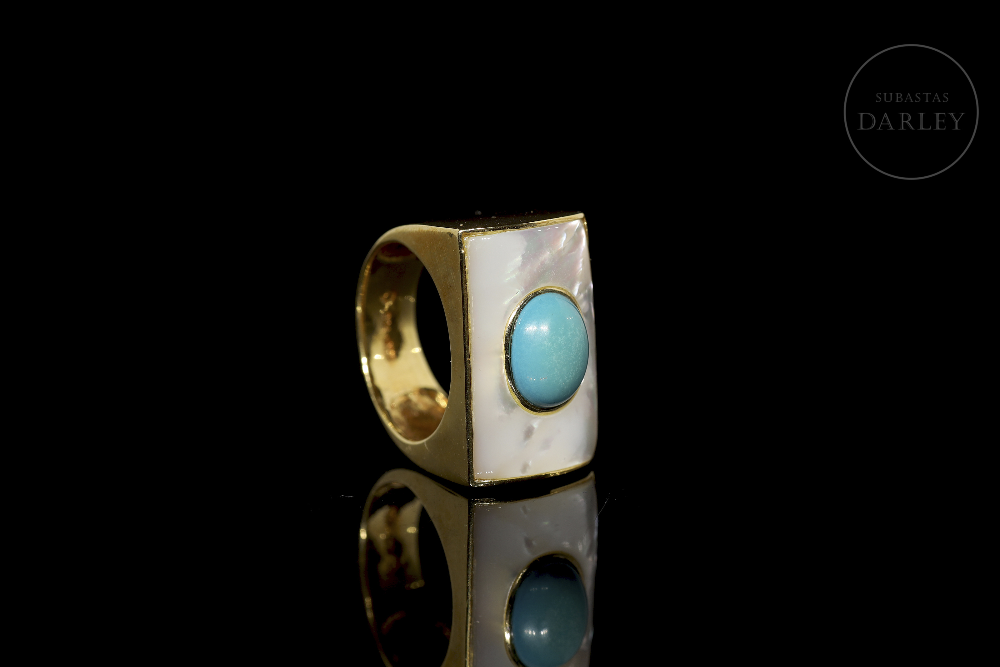 Anillo tipo sello de oro amarillo de 18k, turquesa y nácar