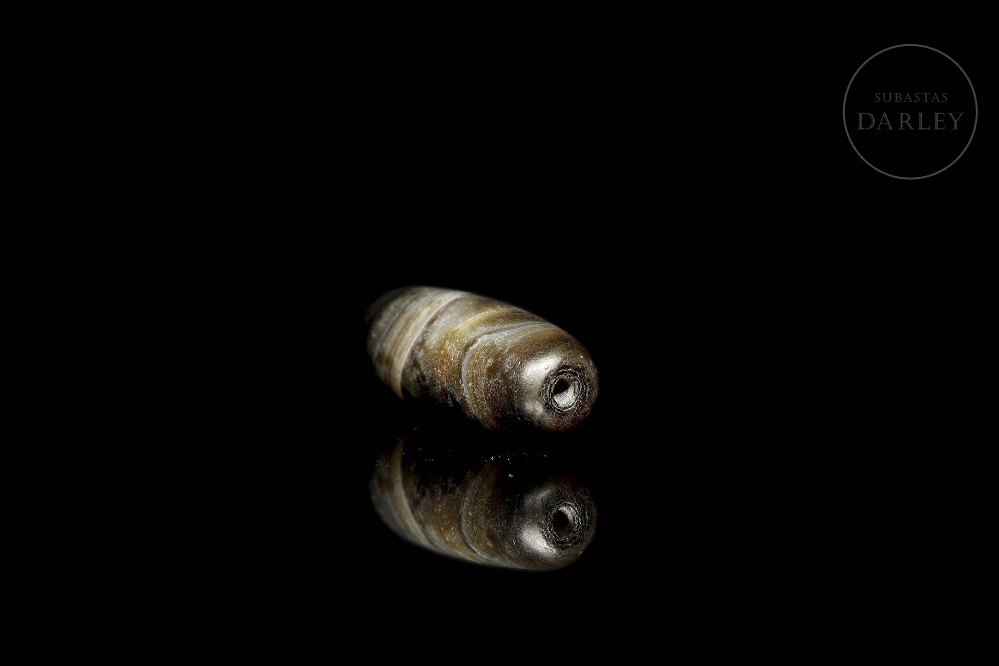 Cuenta Dizi de ágata marrón (千年古珠) con bandas transversales en un suave color crema. La pieza presenta un formato abarrilado, de bordes redondeados y perfil robusto, con una perforación central de ejecución manual para su ensartado. Muestra pátina y desgaste por envejecimiento.