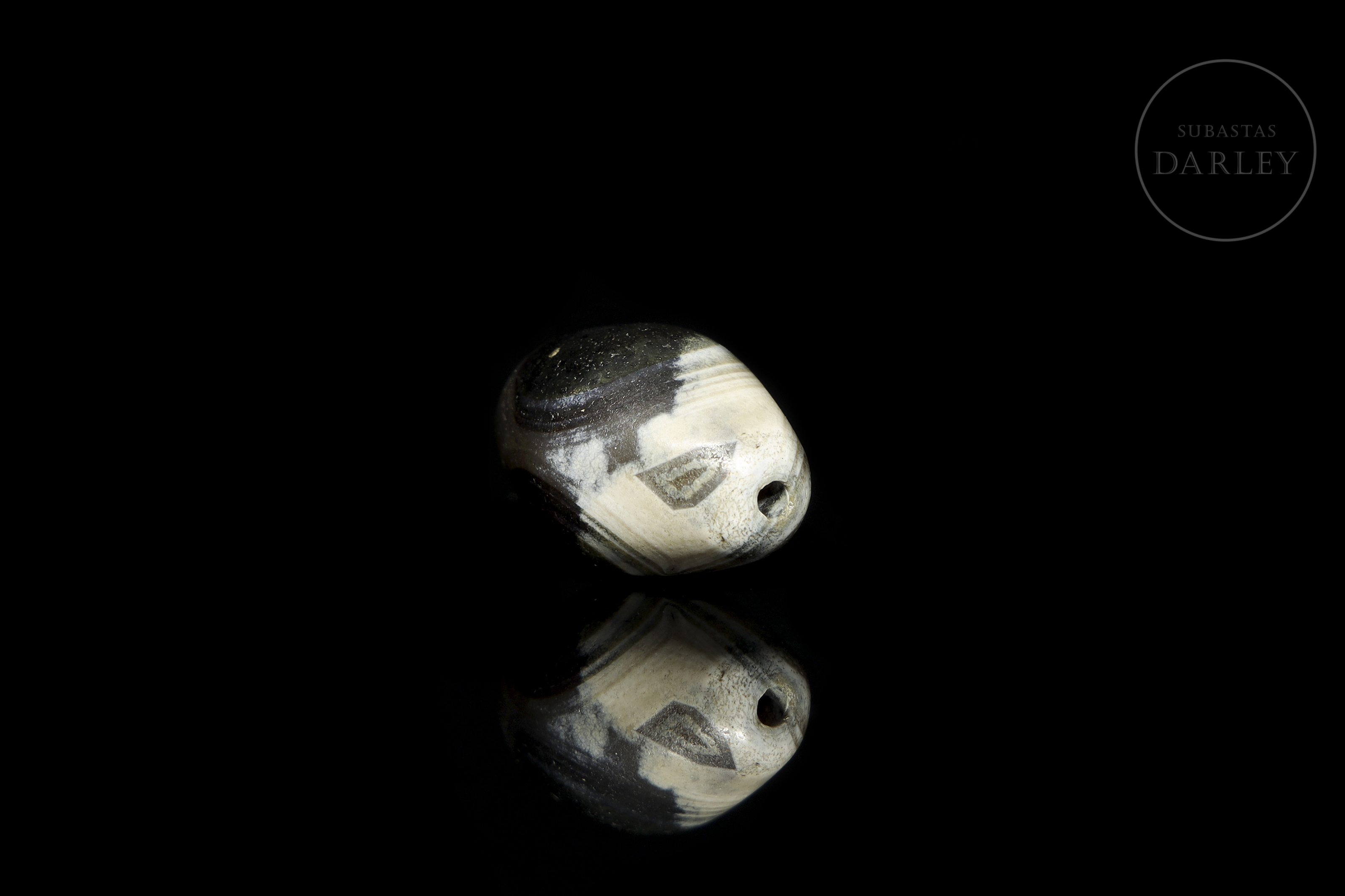 Ágata tallada, de formato cilíndrico corto y redondeado, con el centro marcadamente ensanchado, una perforación longitudinal y extremos romos. La pieza ha sido realizada en ágata de una tonalidad grisácea casi negra con áreas de color blanco, que se distribuyen conformando un diseño de "ojos". La superficie muestra una notable pátina por envejecimiento.